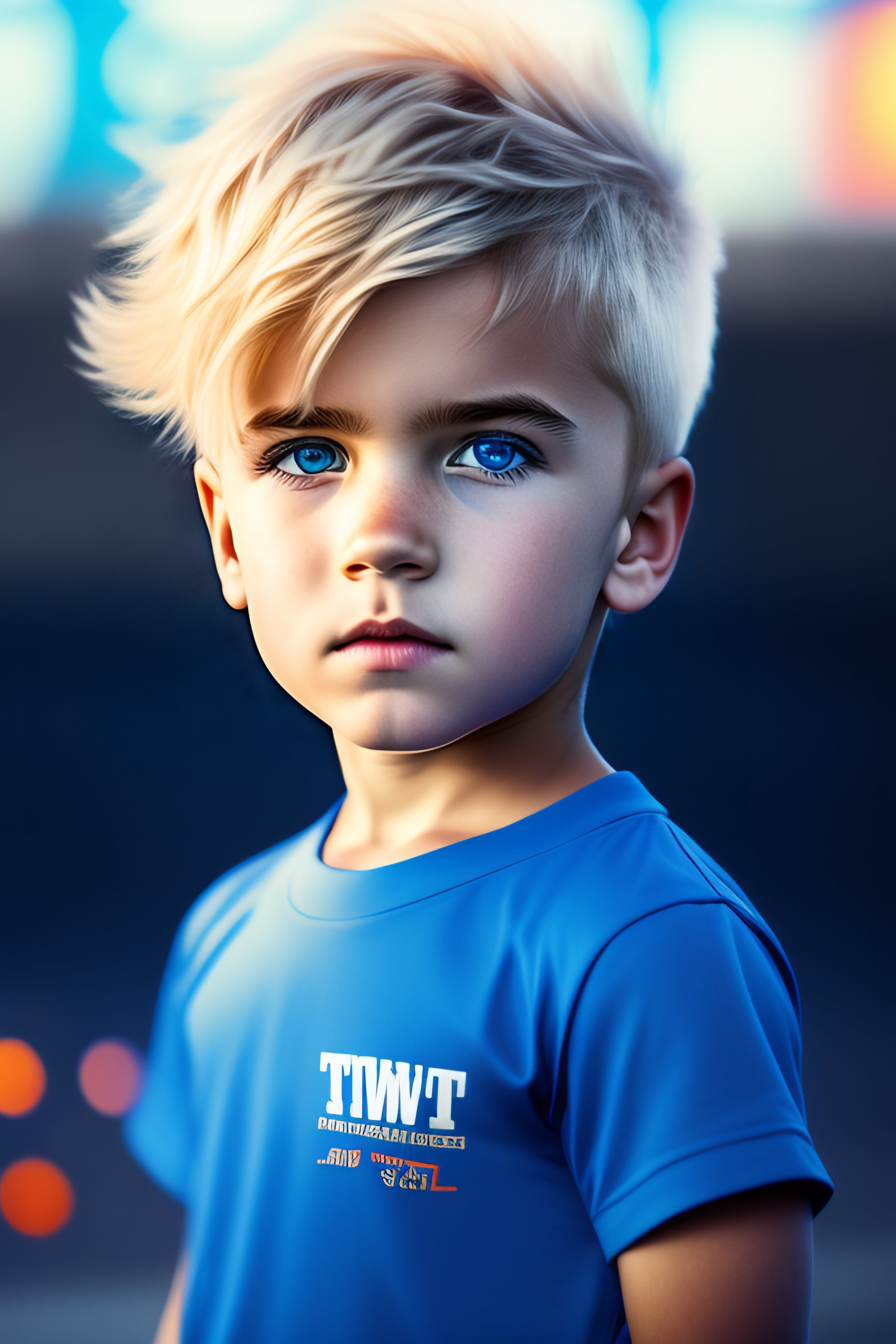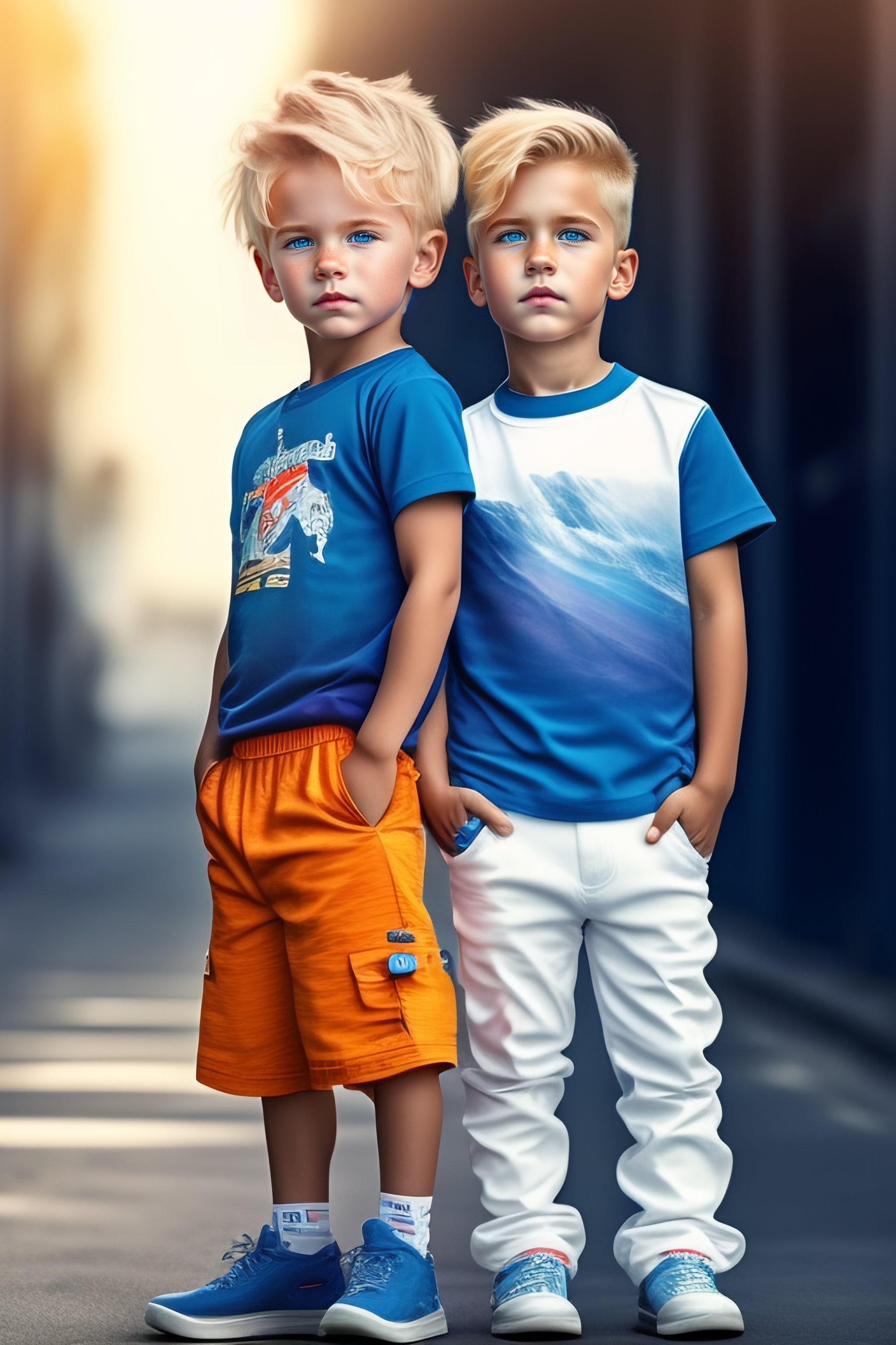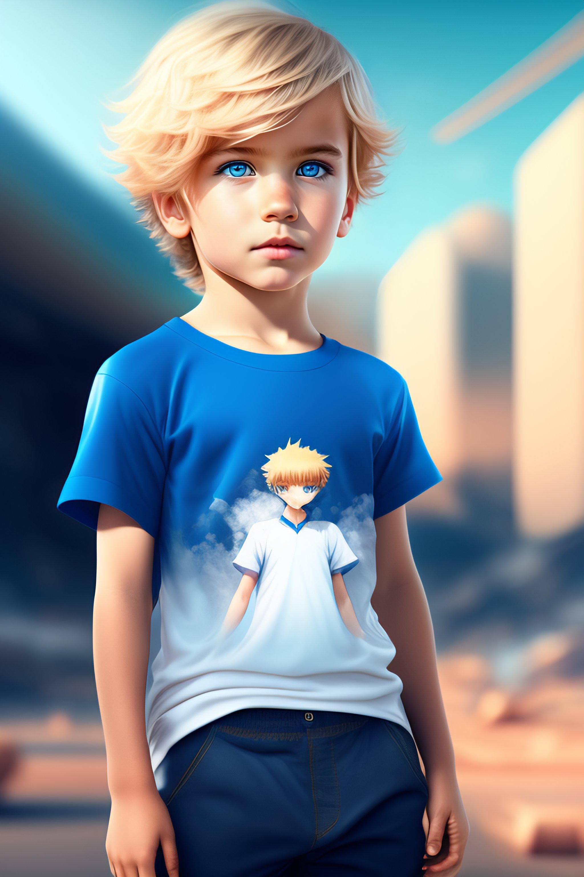 Tow personhalf boy half girl blond with blue eyes a blue t-shirt and white pants anime with a destroyed background