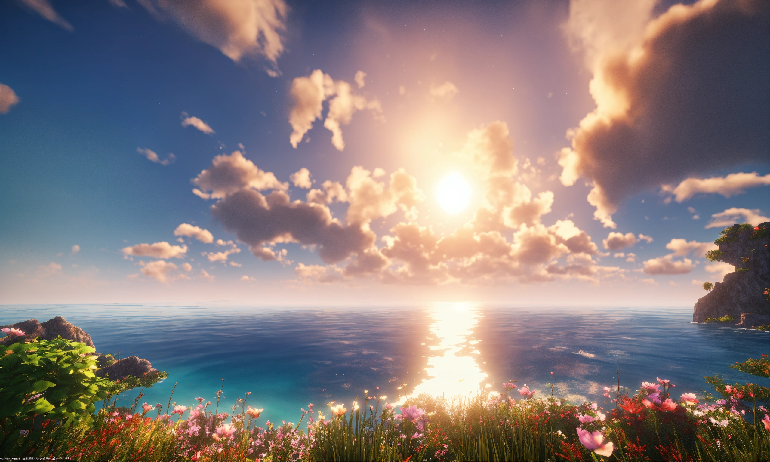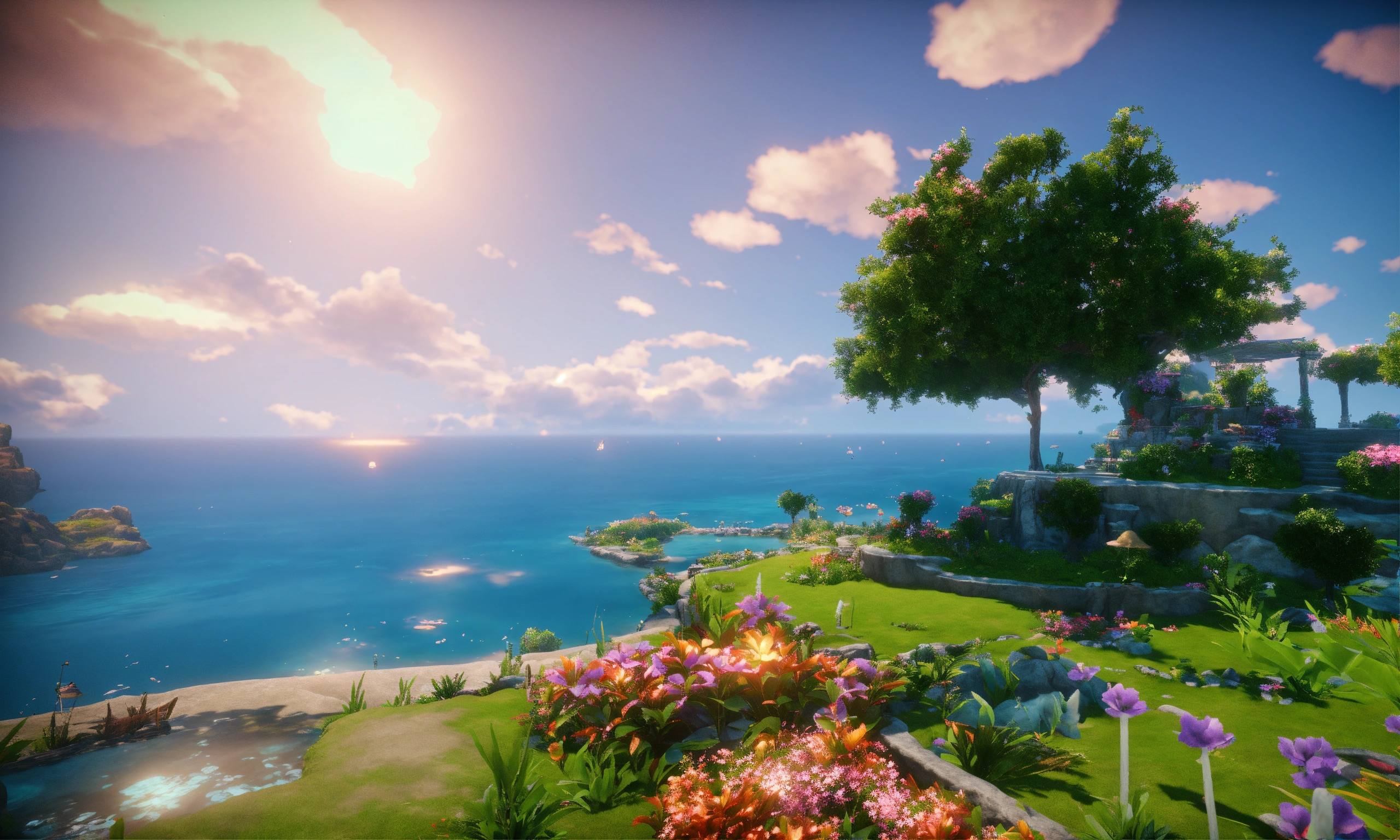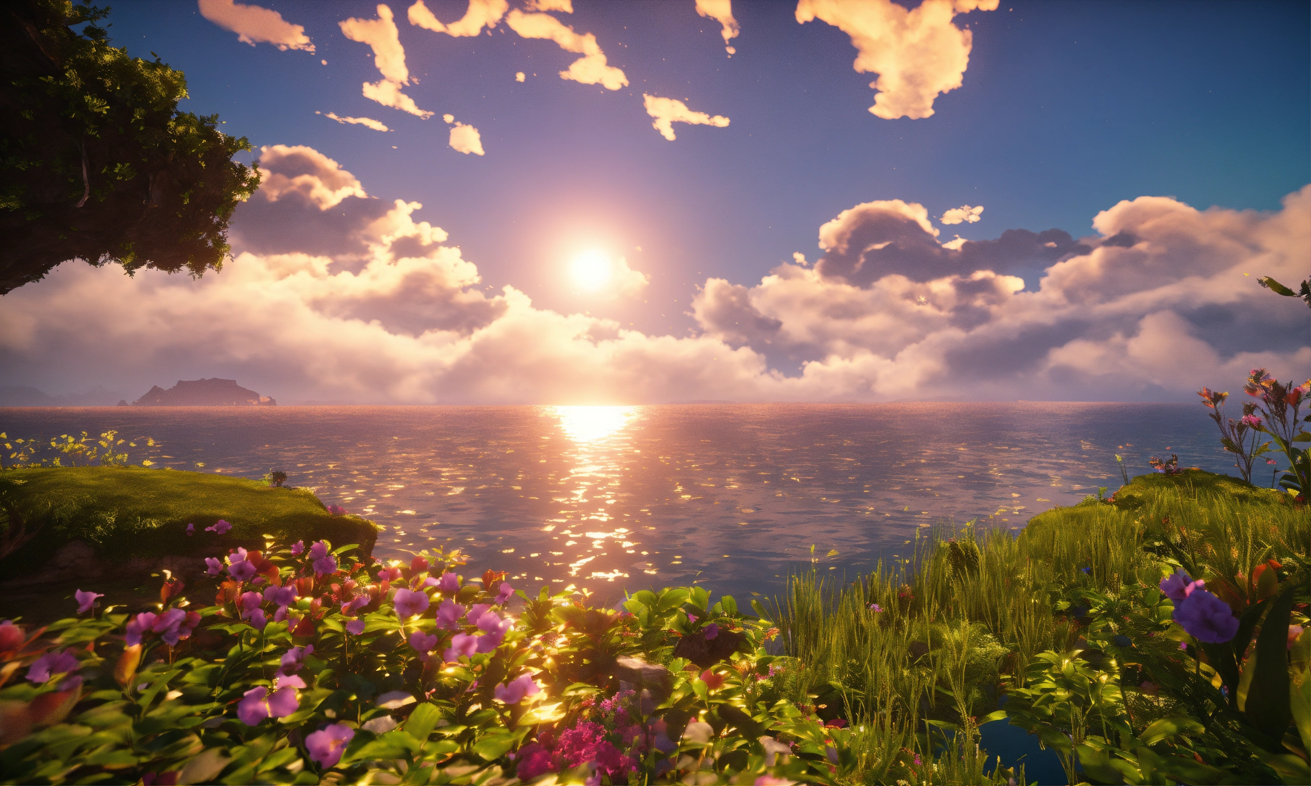 Unreal engine 3d heavenly background with a beautiful sky and ocean garden