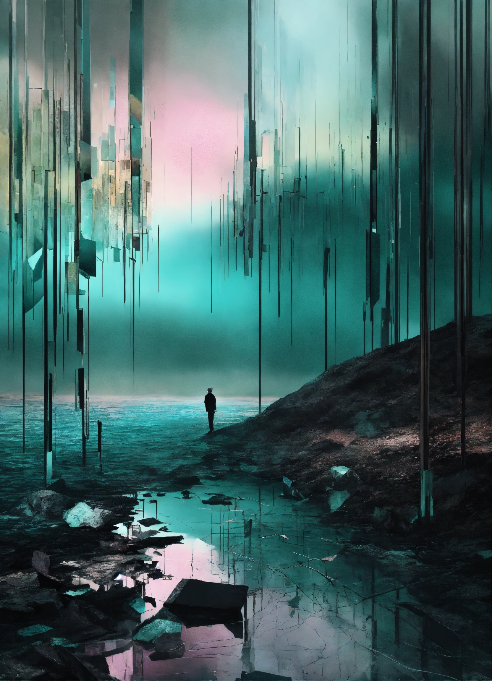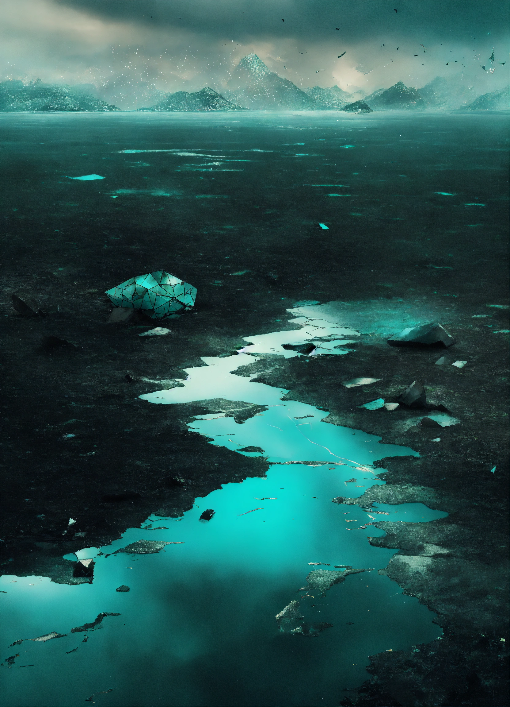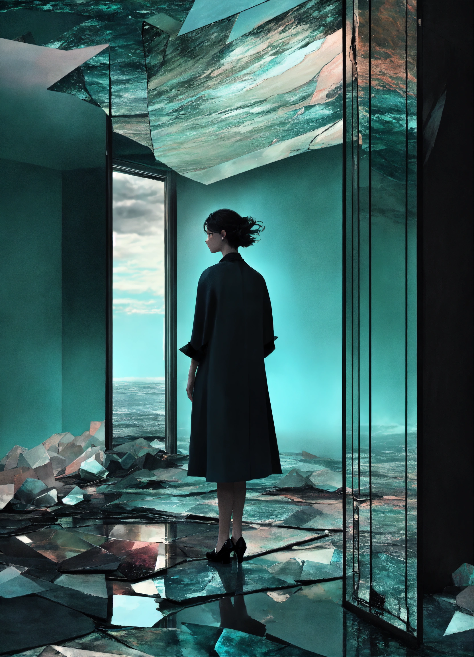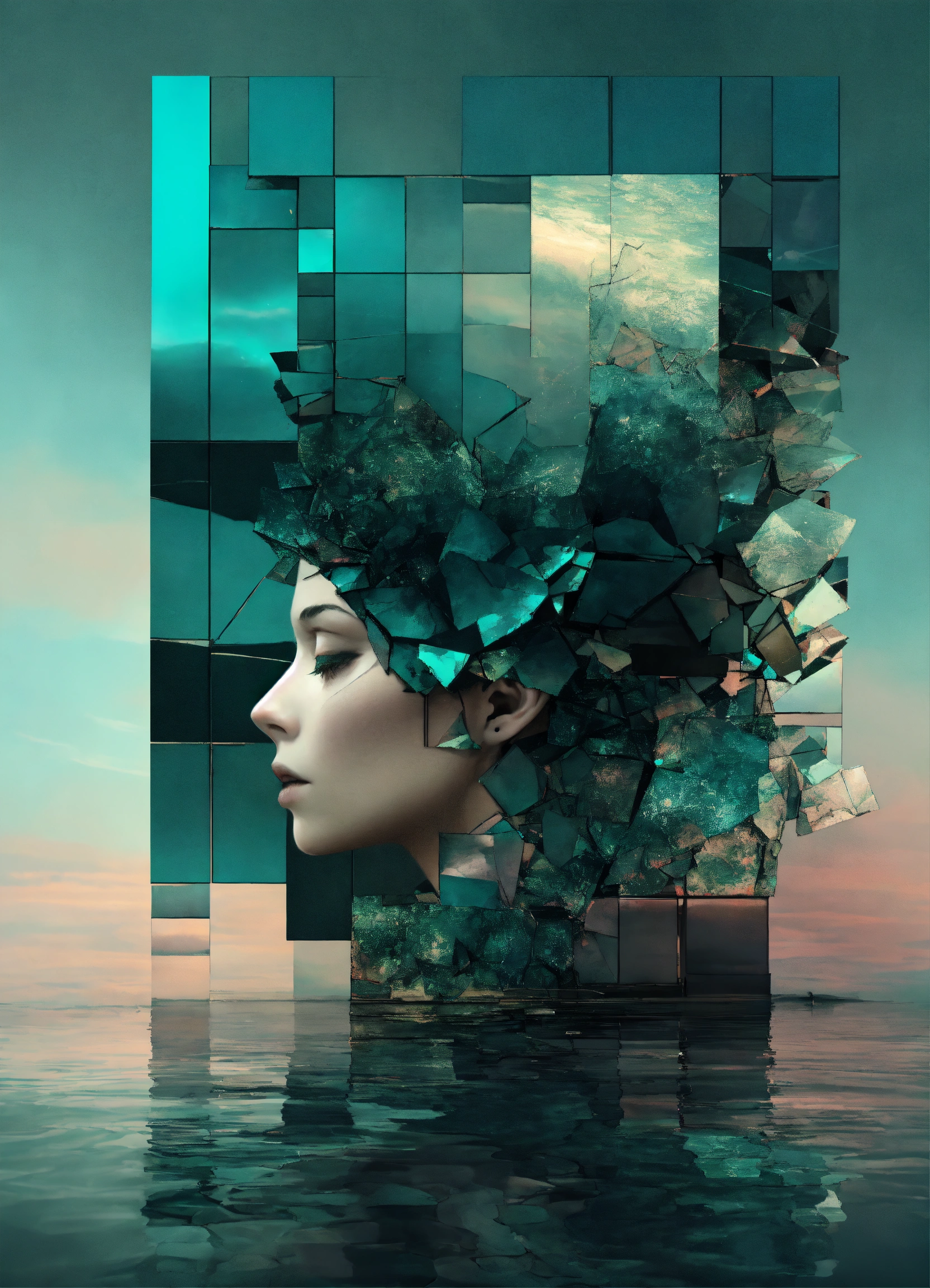 Digital surrealism shattered dreamscape, fragments of forgotten memories, broken reflections in a sea of iridescence, muted pastels juxtaposed with stark monochrome, echoes of silence in the void, black and dark teal