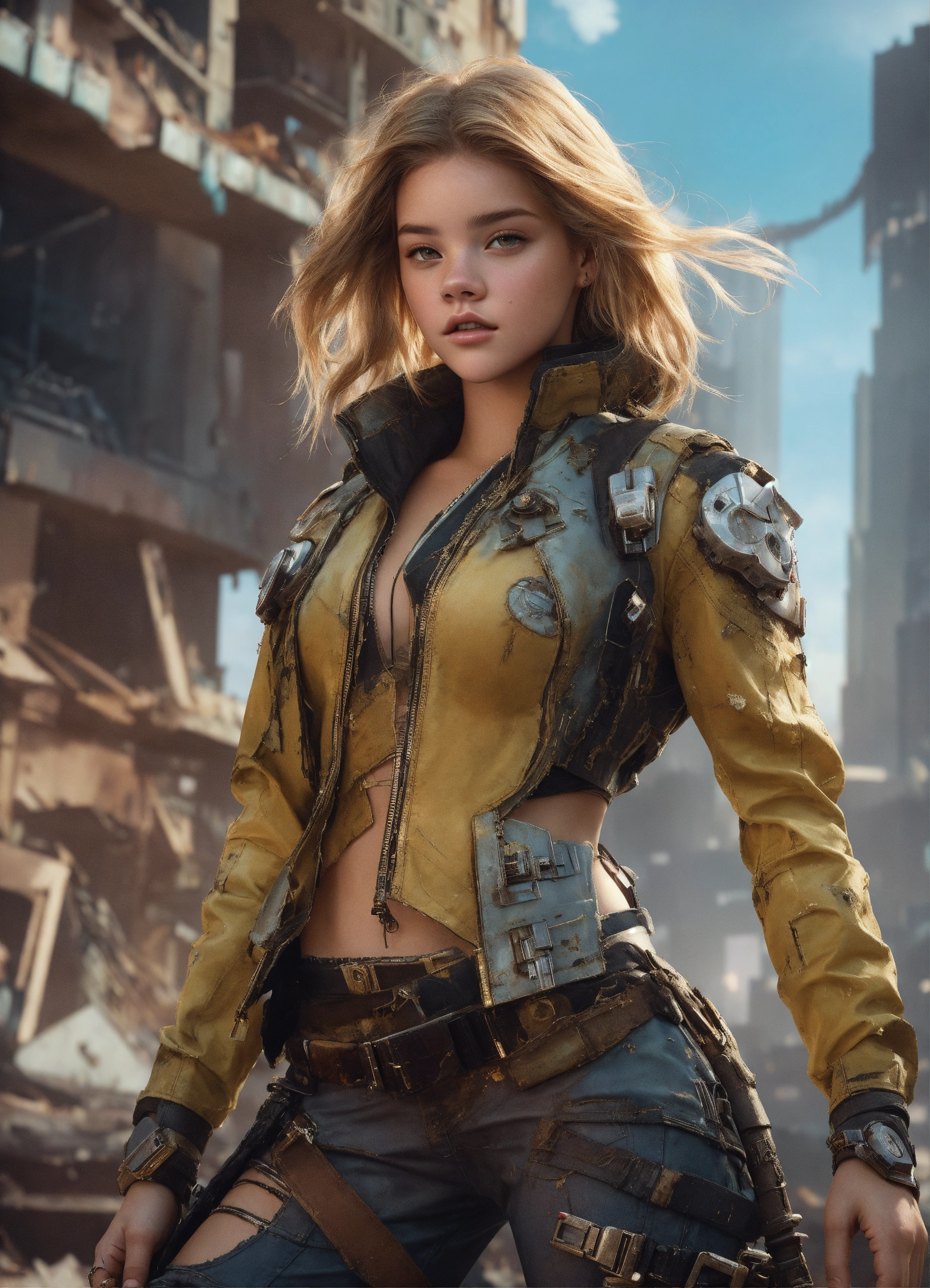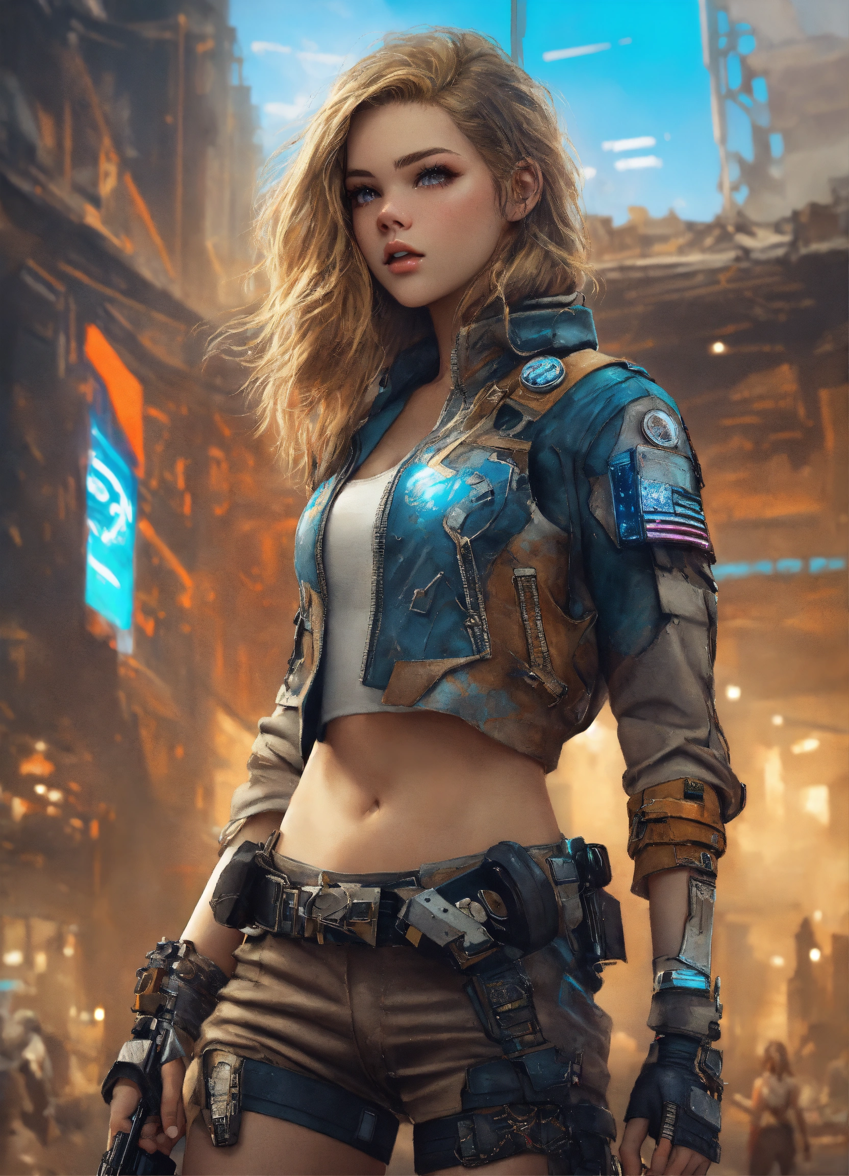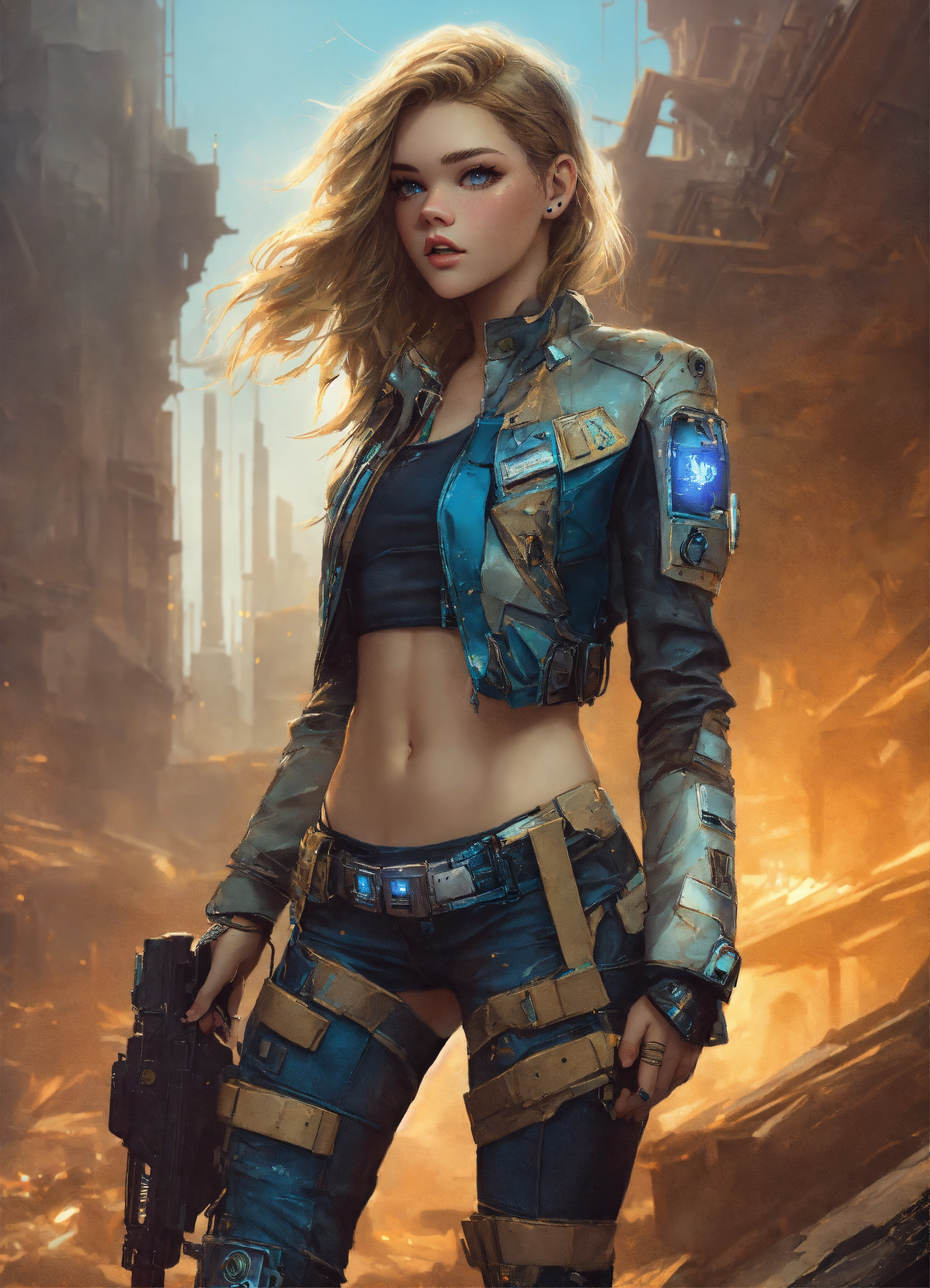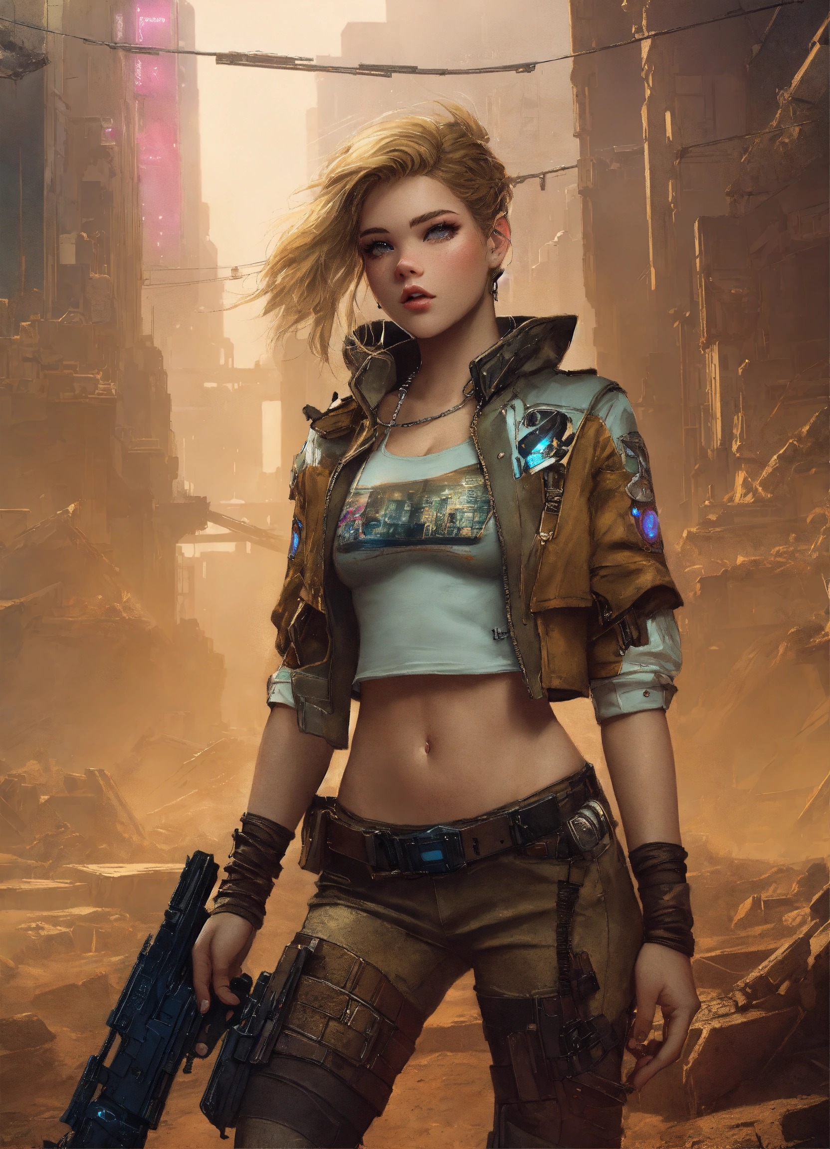 Blonde barbara palvin wearing a tattered space cowgirl outfit. the scene is set in the ruins of a futuristic cyberpunk cityscape, in a cyberpunk dystopia rising above the great plains. the artwork is highly detailed and intricate, this piece is trending on artstation, reference artists for inspiration include artgerm, greg rutkowski, and jiří barbacha