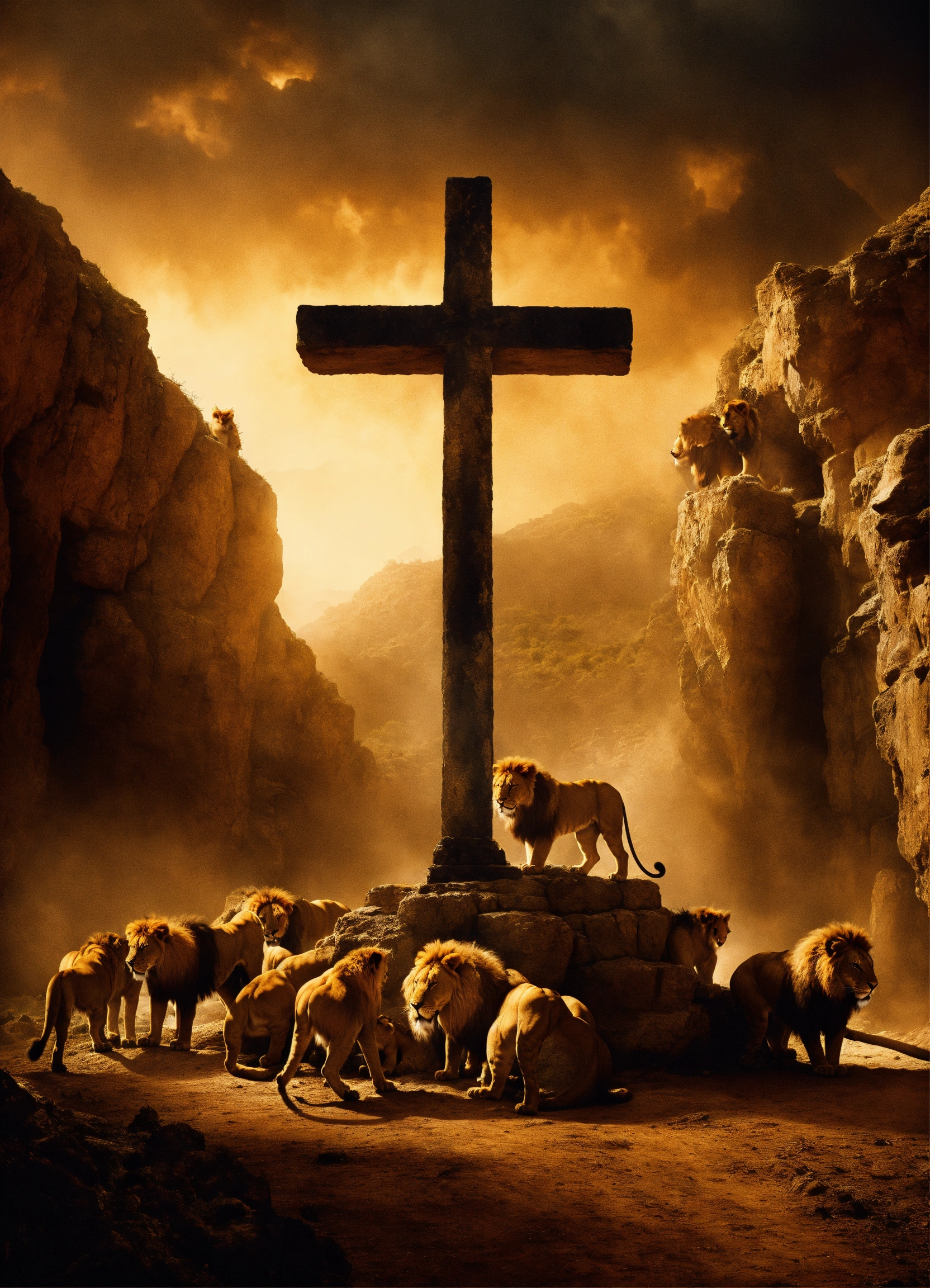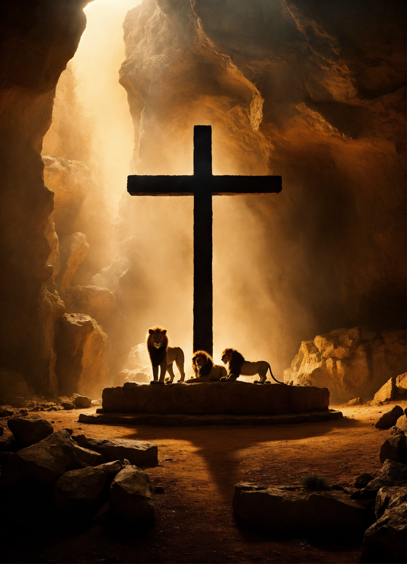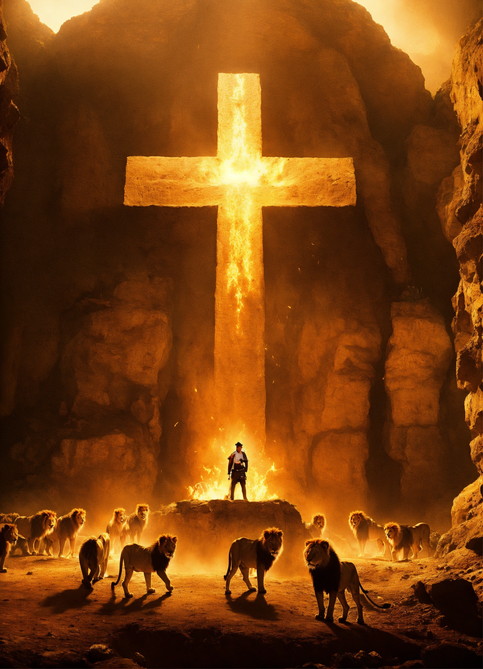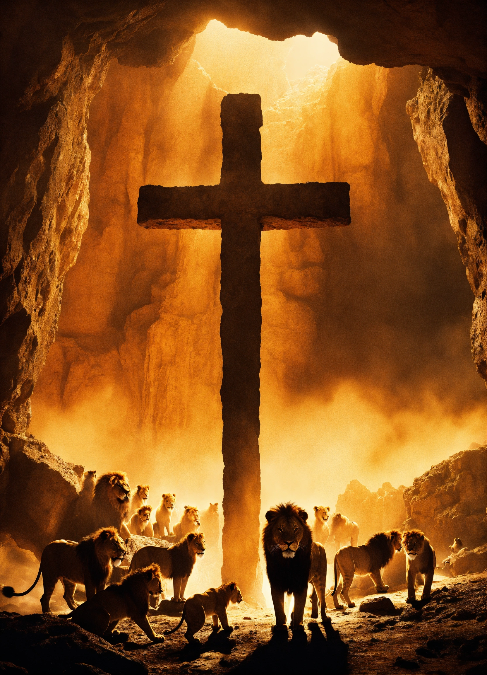 Dramatic film still of a cross surrounded by ferocious lions, cave interior background, directed by michael bay