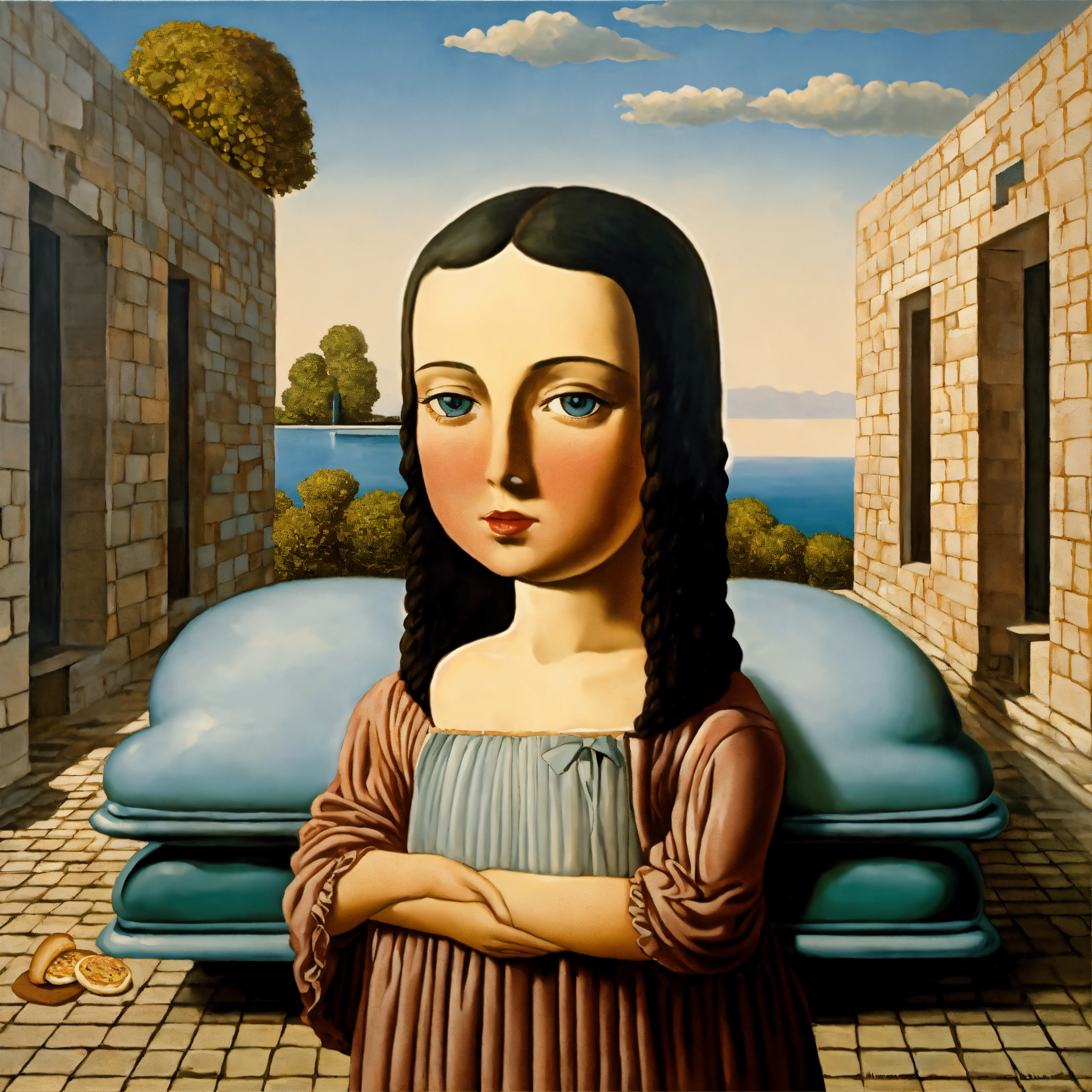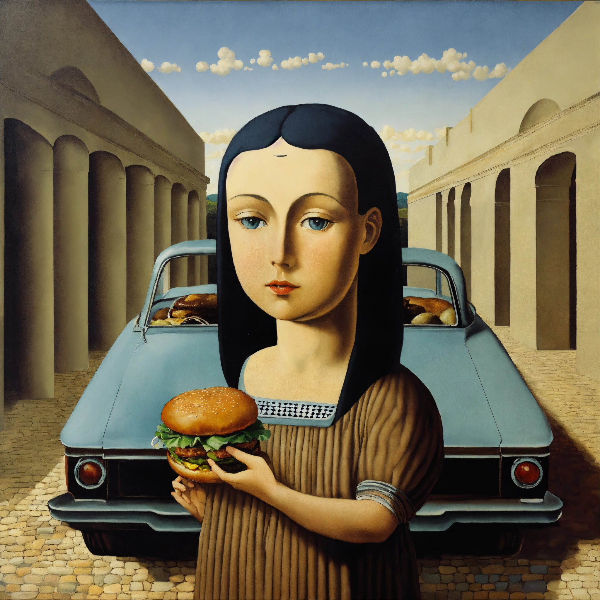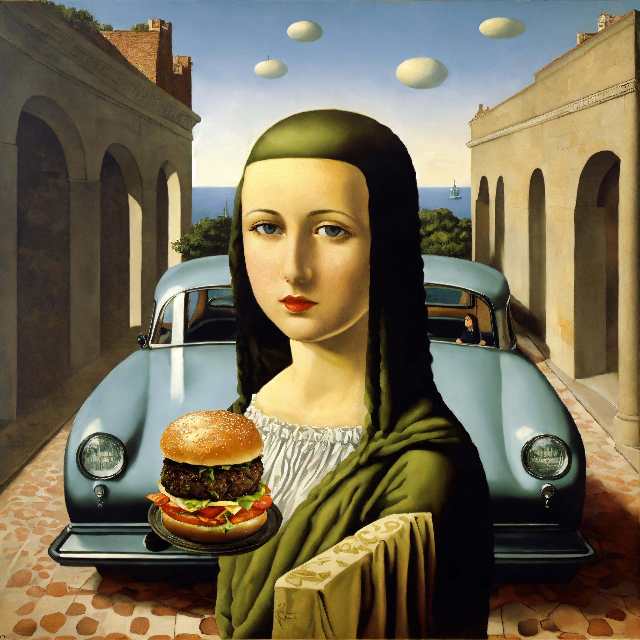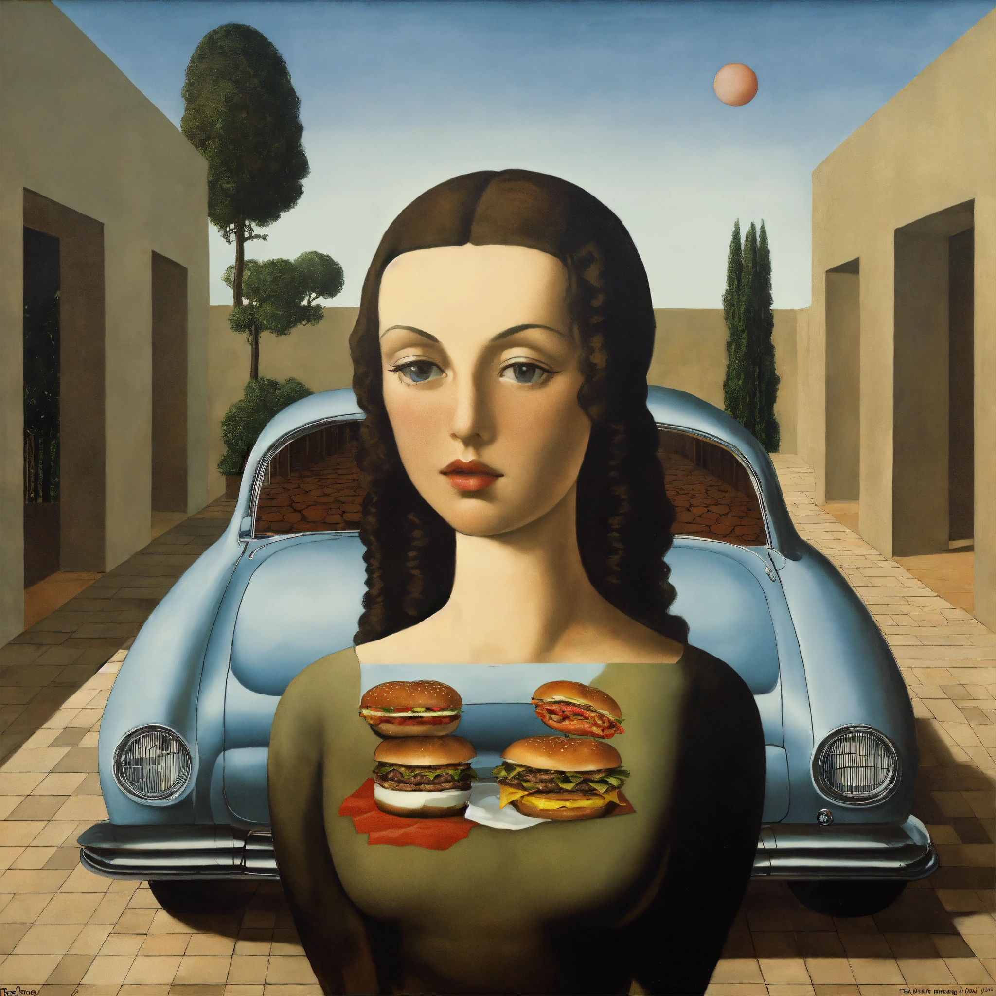 The venus offers a huge burger to us and there is a swimming pool in her background, by rene magritte, a surrealistic setting