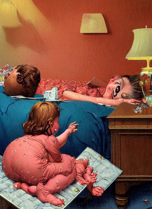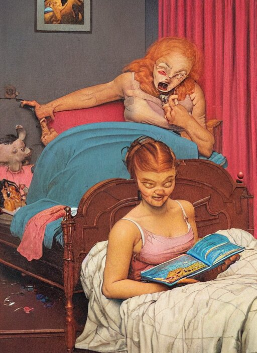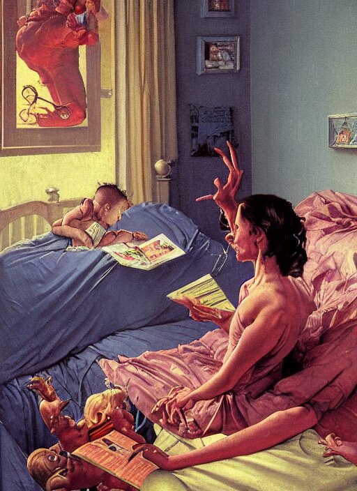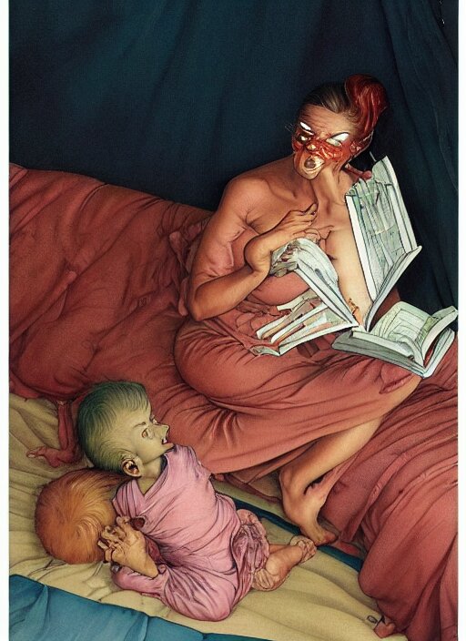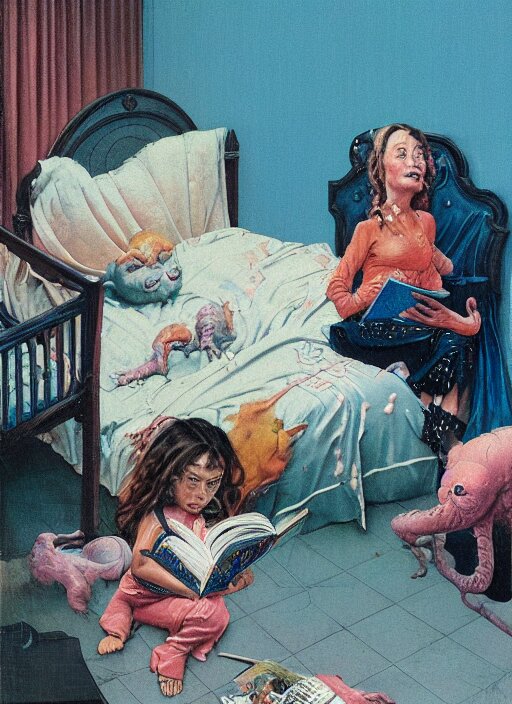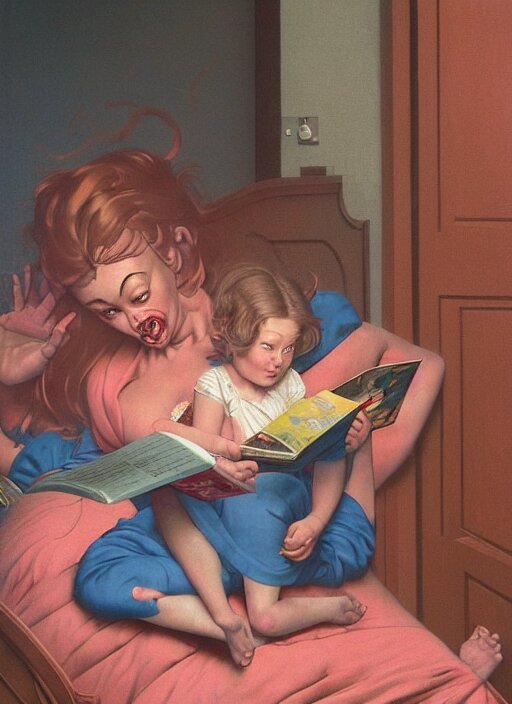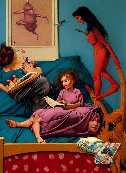 Realistic detailed image of a mother reading a bed time story to her child in bed with monster under the bed in the style of francis bacon, surreal, norman rockwell and james jean, greg hildebrandt, and mark brooks, triadic color scheme, by greg rutkowski, in the style of francis bacon and syd mead and edward hopper and norman rockwell and beksinski, open ceiling, highly detailed, painted by francis bacon, painted by james gilleard, surrealism, airbrush, ilya kuvshinov, wlop, stanley artgerm, very coherent, art by takato yamamoto and james jean