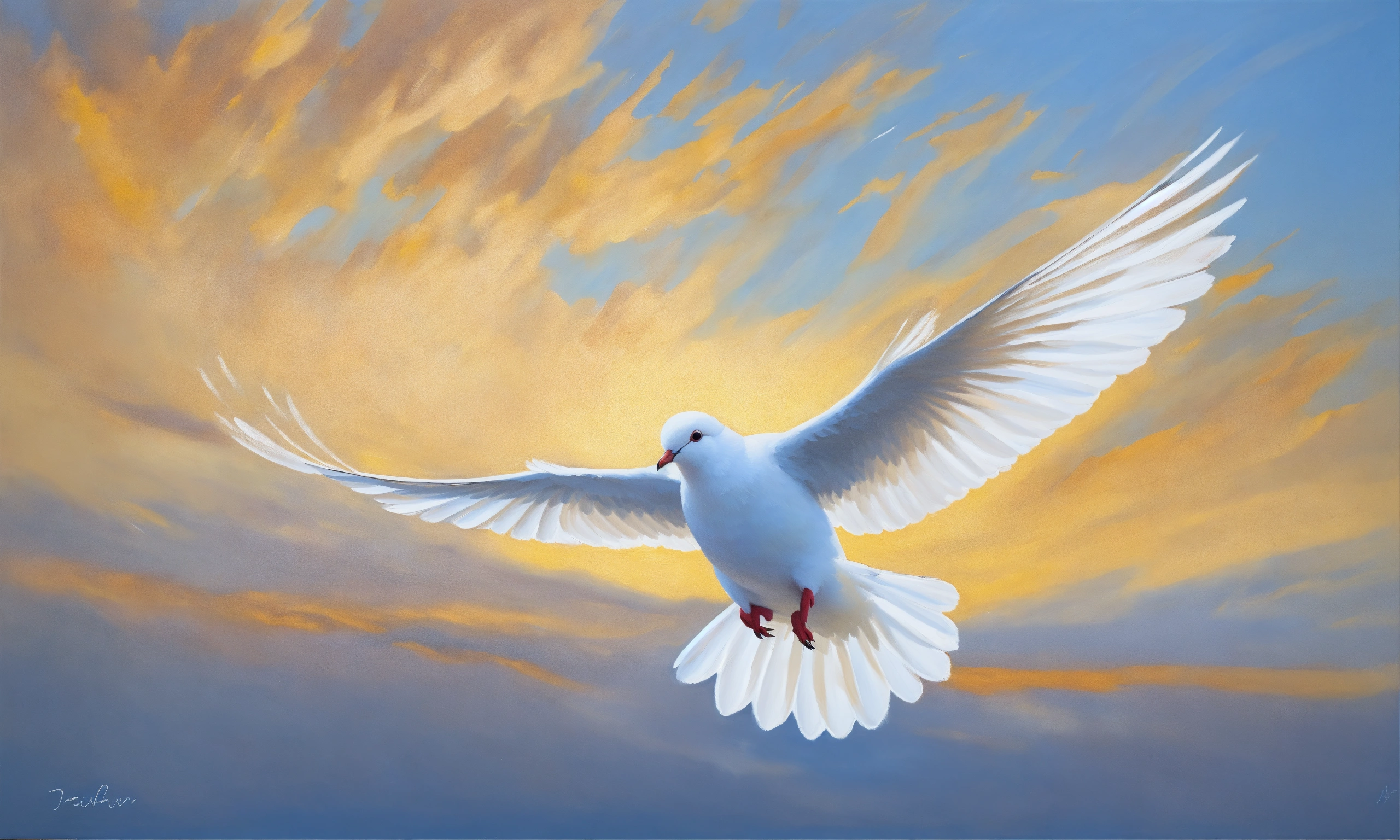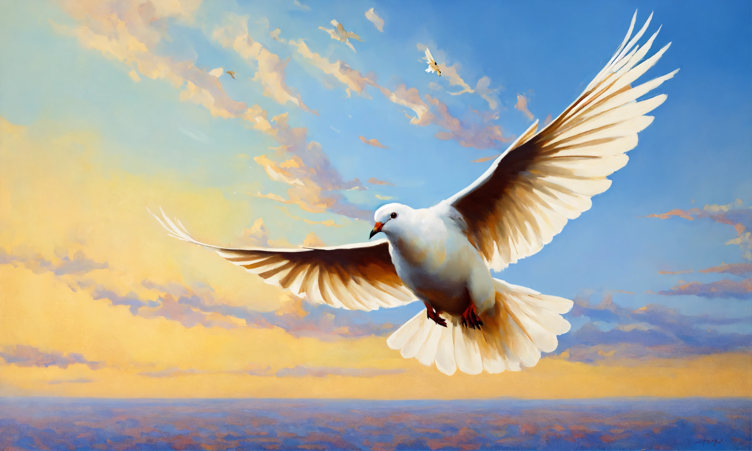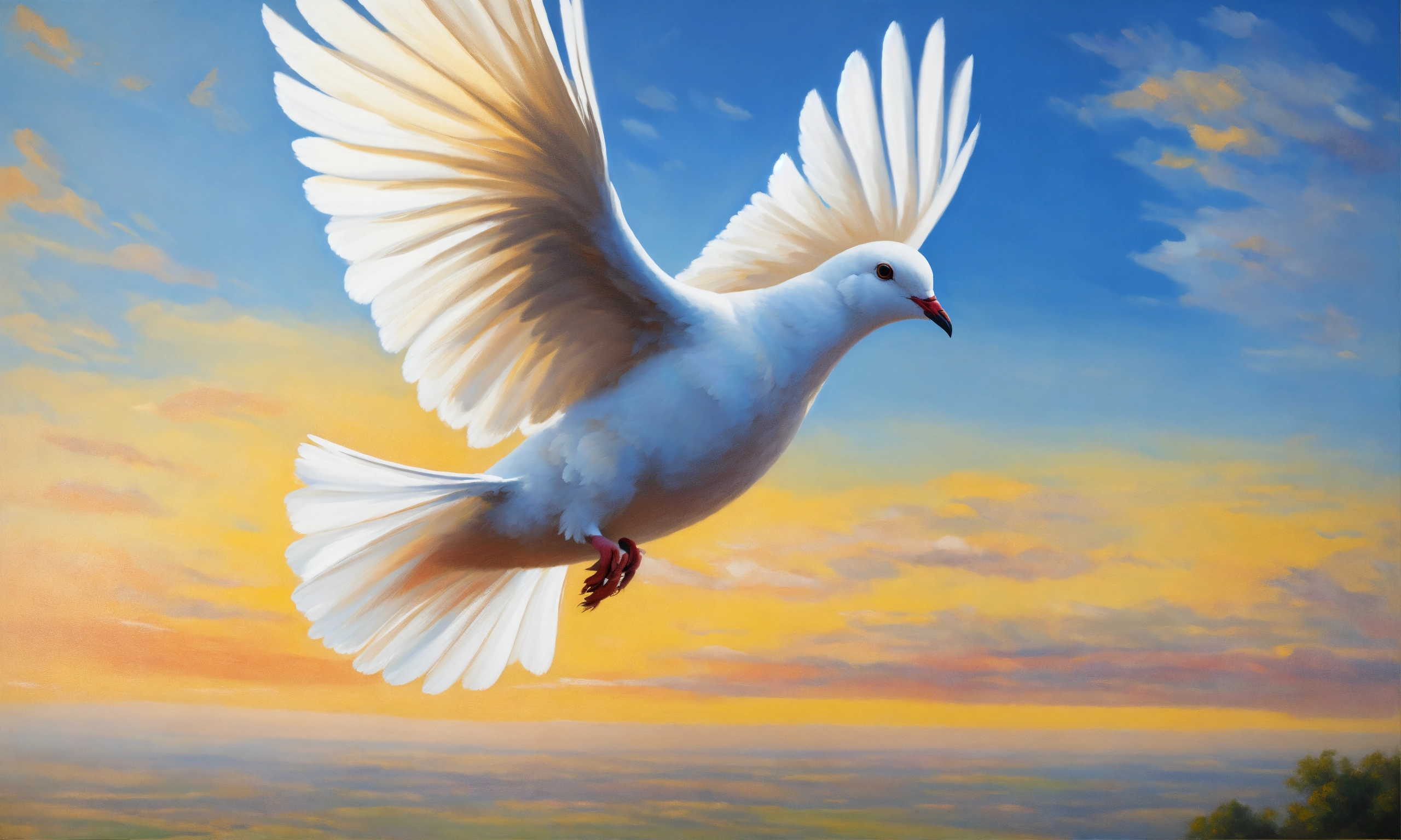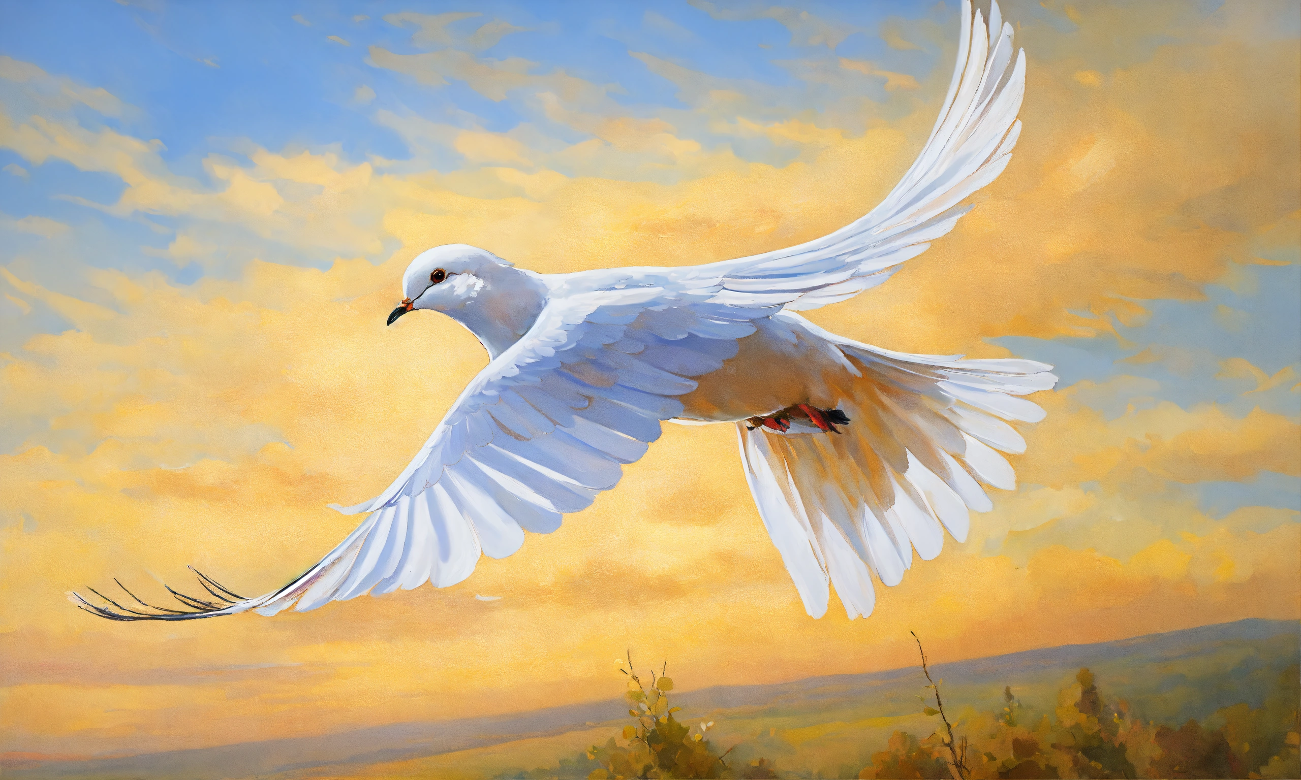 Oil painting portrait of a plain white dove flying