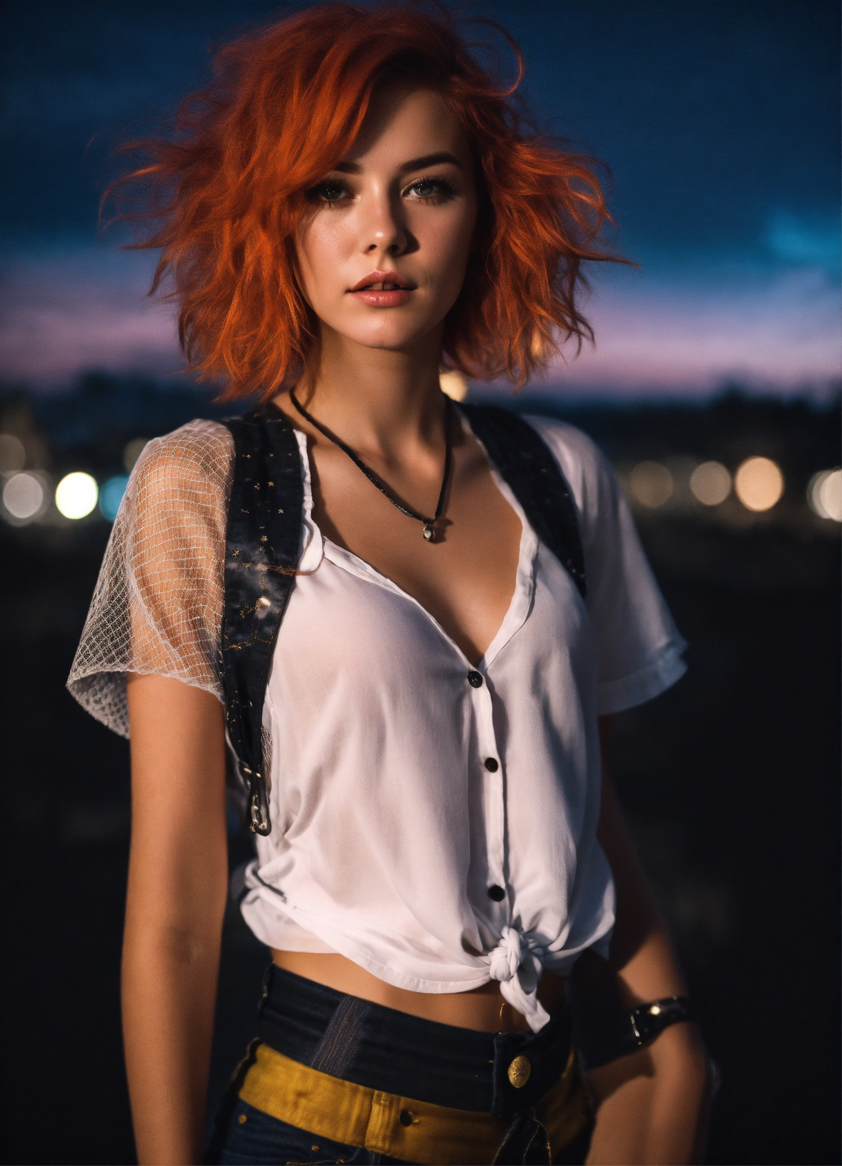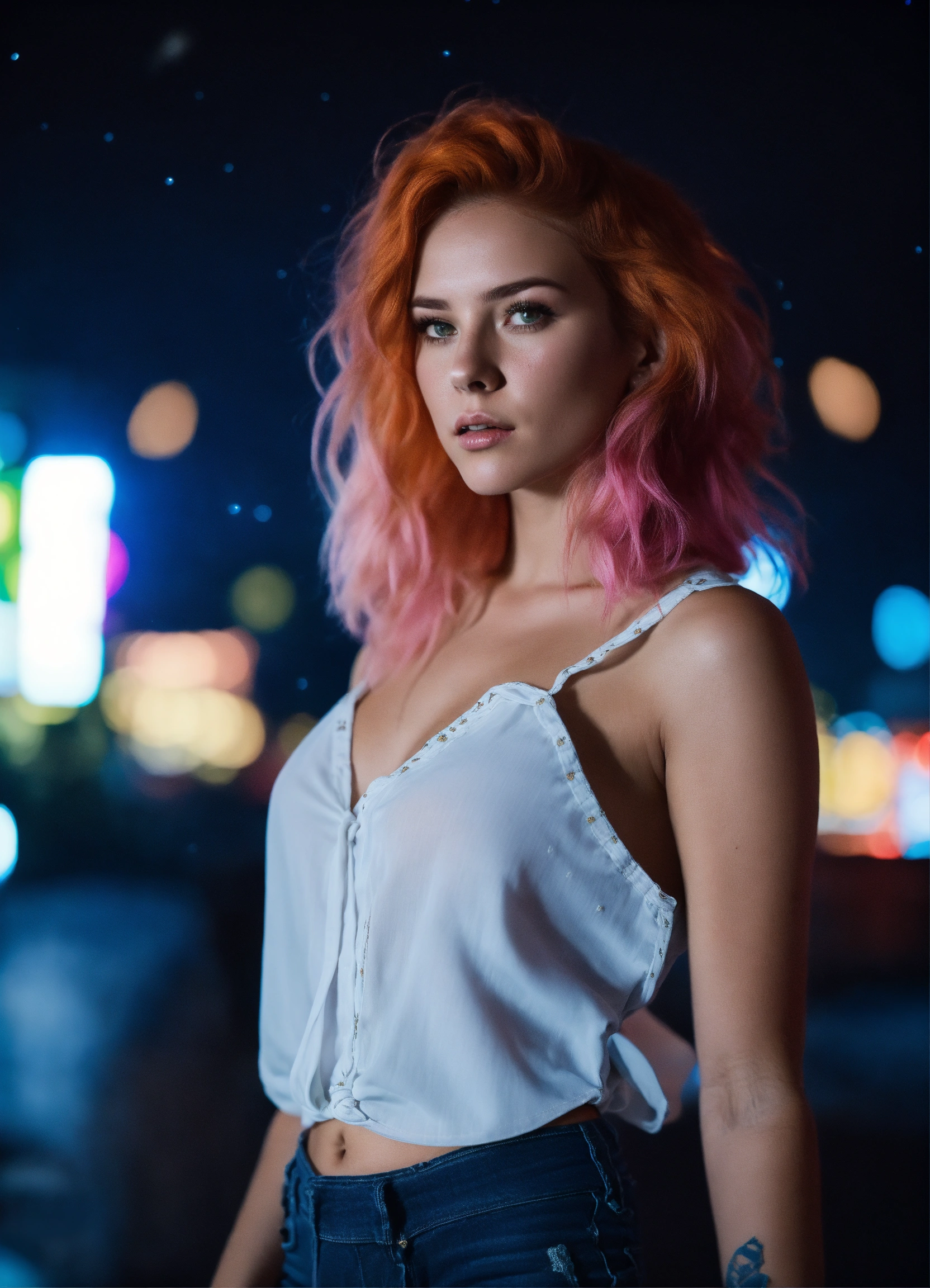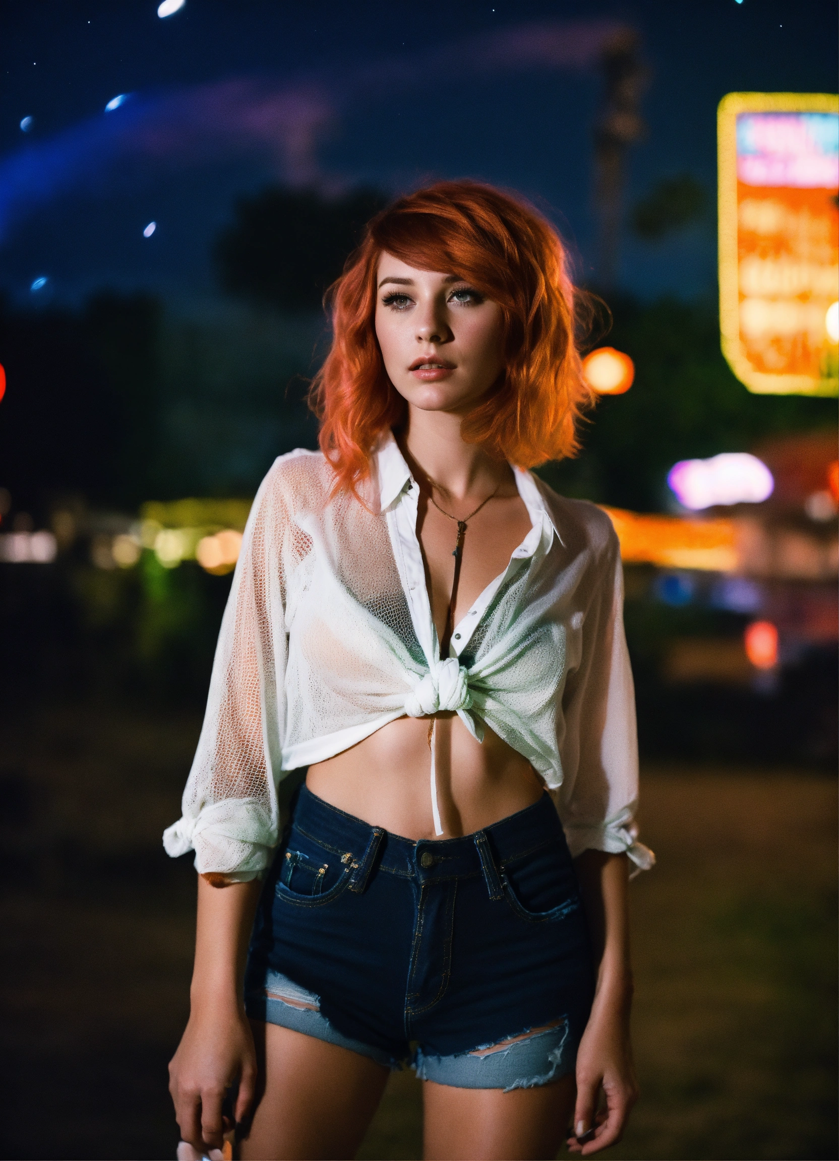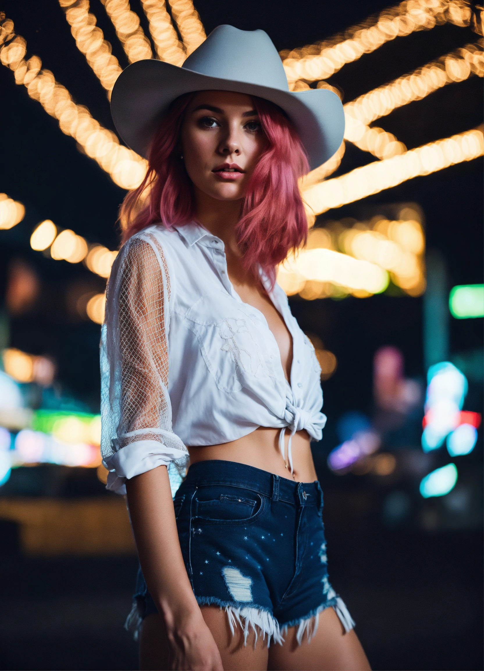 A real photo of a hot 25 year old cowgirl with bright hair. she is wearing a white knotted fishnet blouse, tight short black denim hotpants and a cowboy head. she looks very nervous while she stands at night in a future alien city. in the sky we see the galaxy