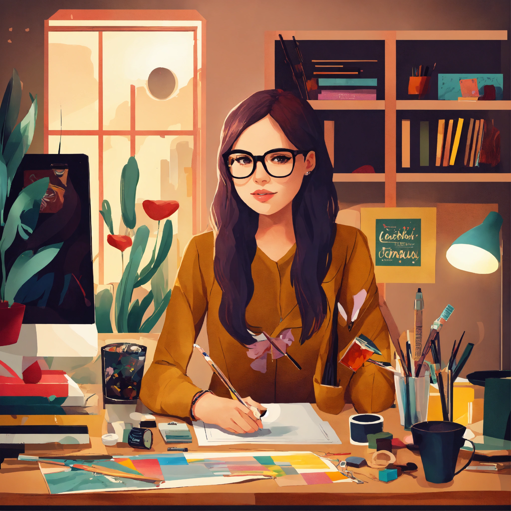Girl who is a hipster graphic designer sitting at her desk with inspiring materials