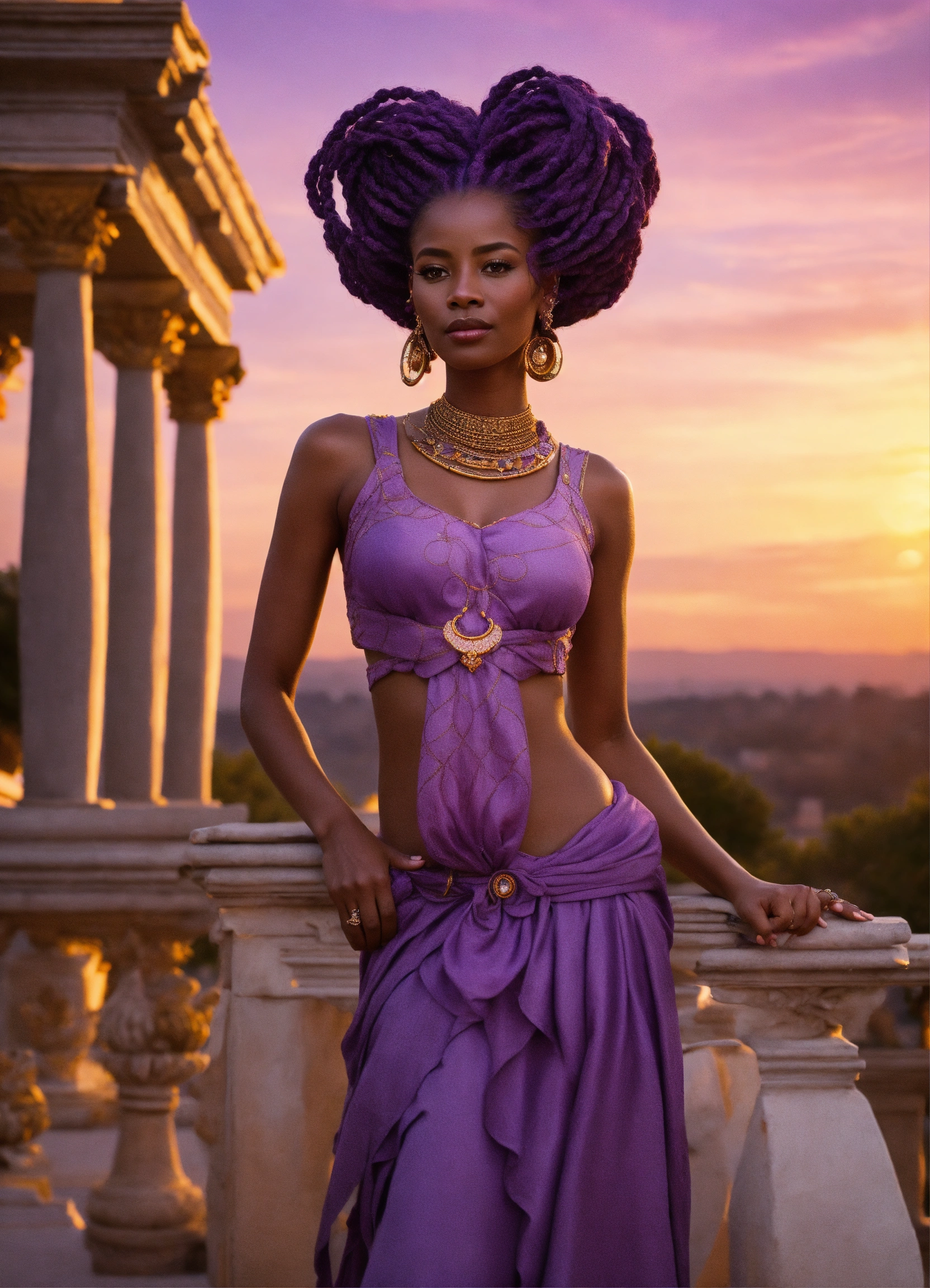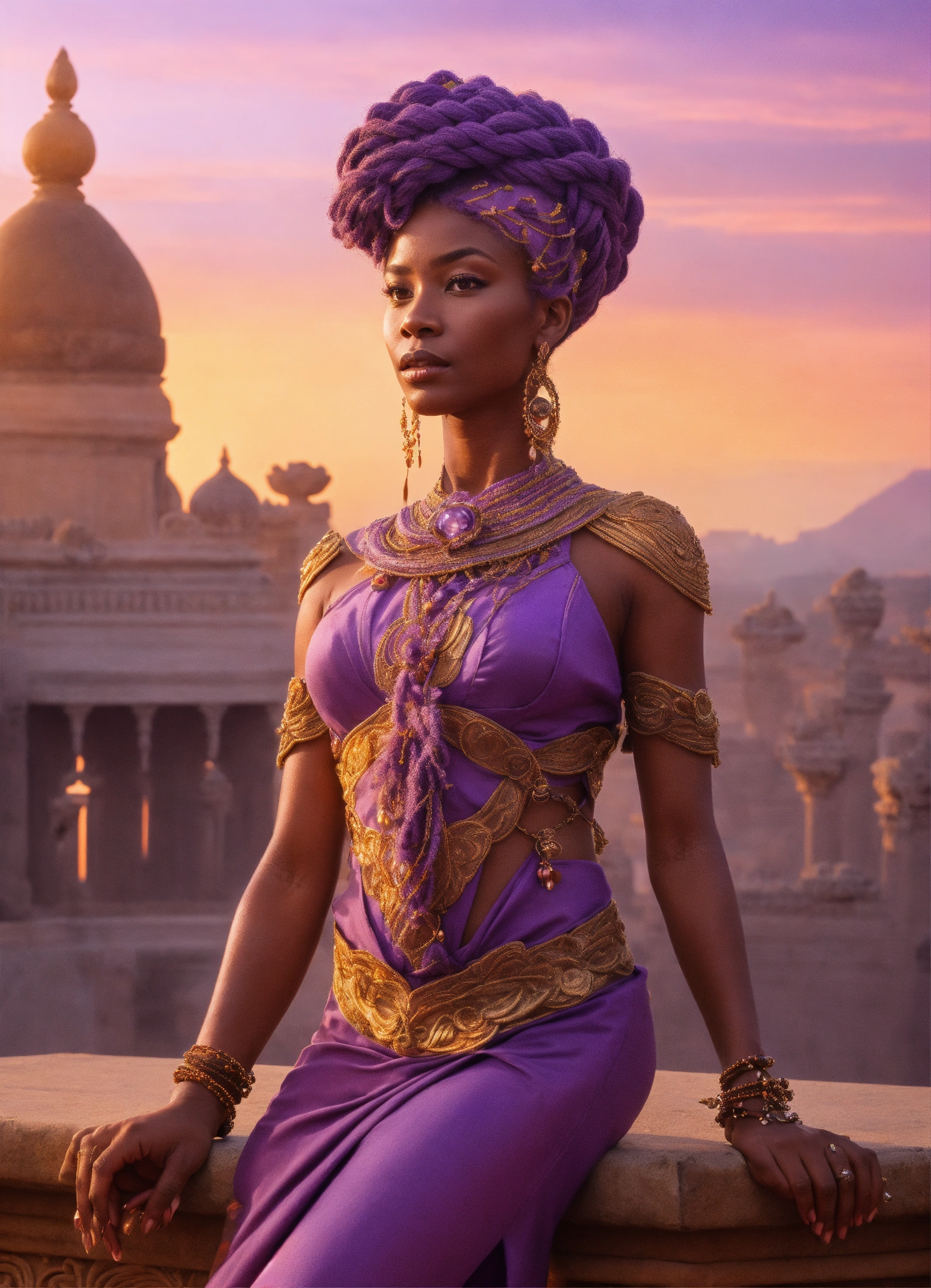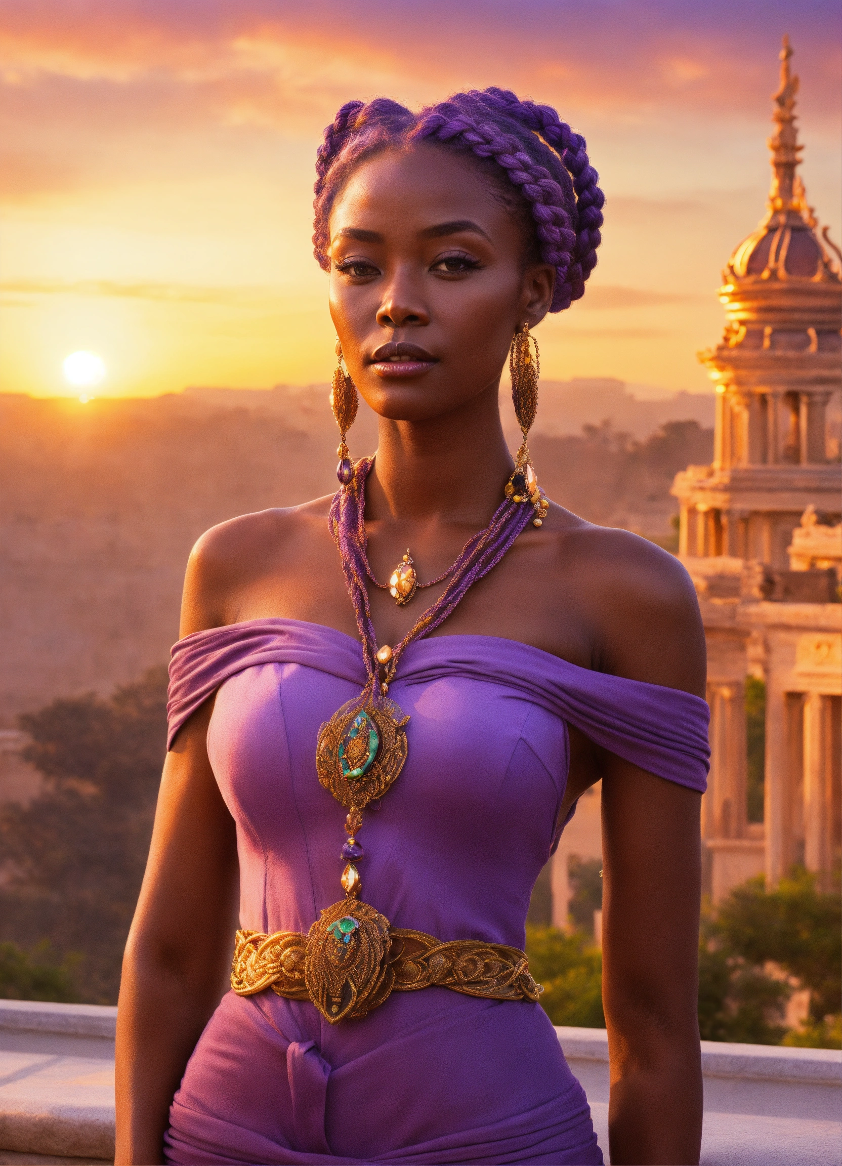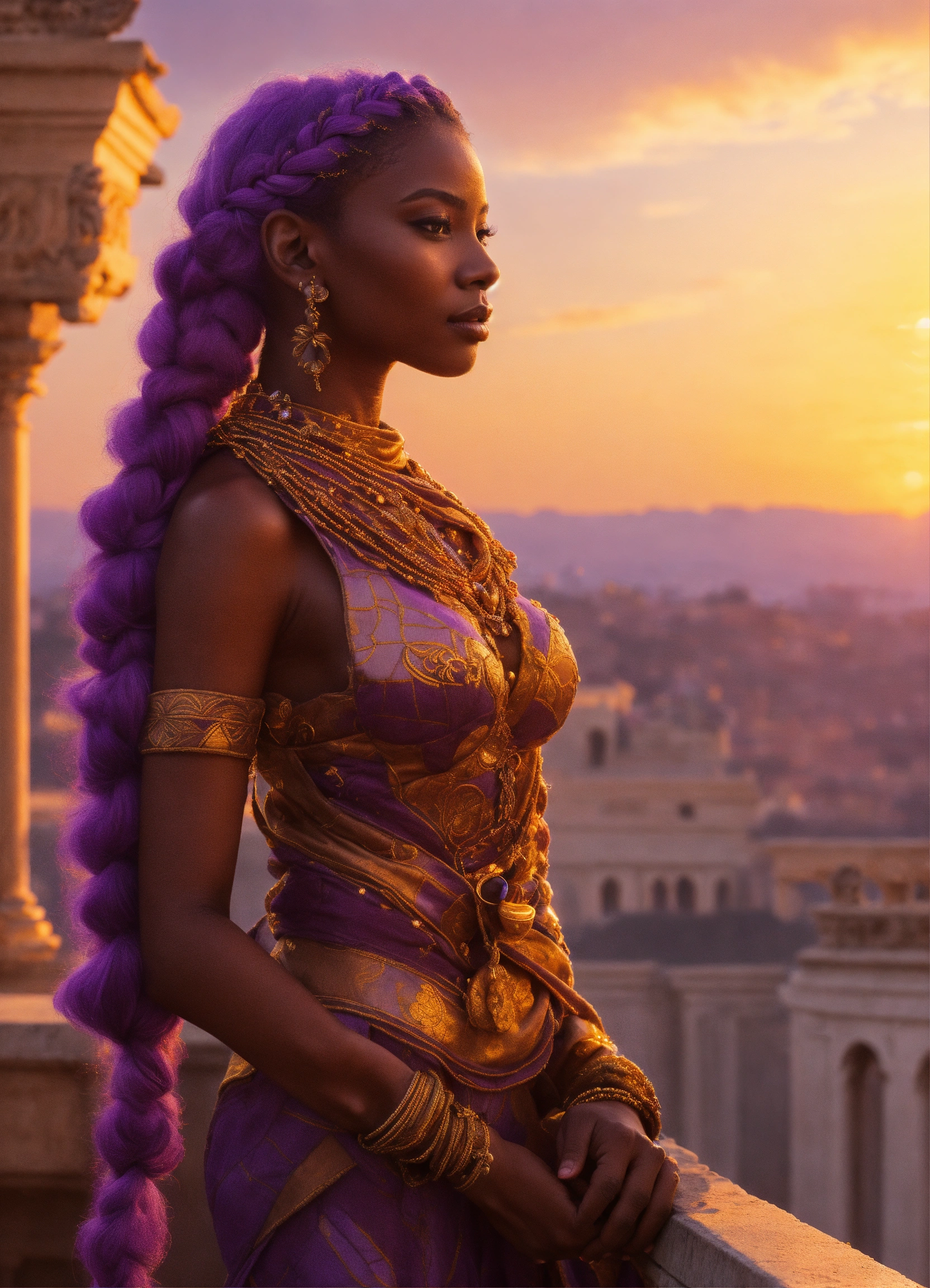 Lavender-skinned alien female, amethyst braided hair, middle age, african features, standing on a sumptuous palace terrace at sunset. charismatic demeanor.