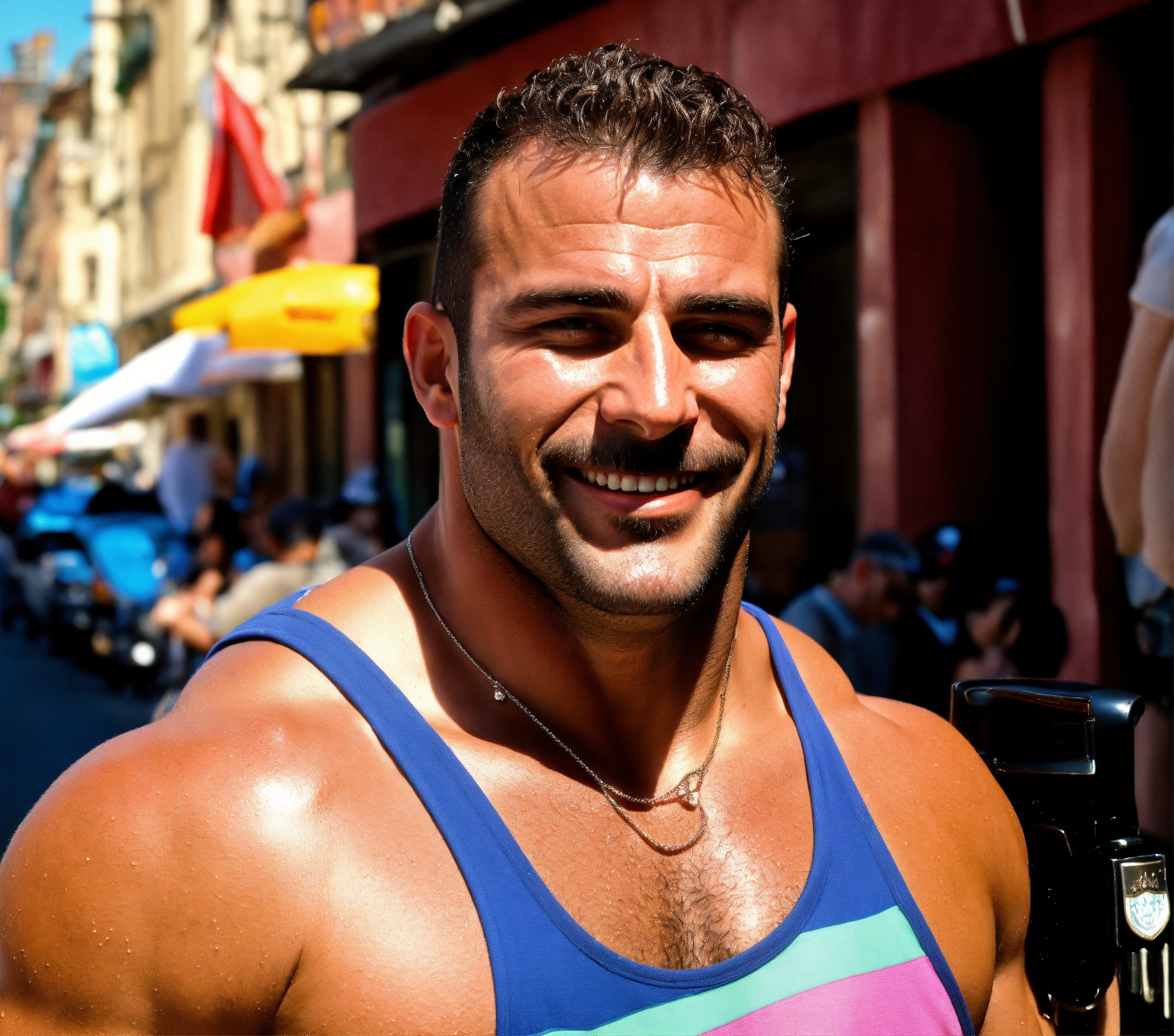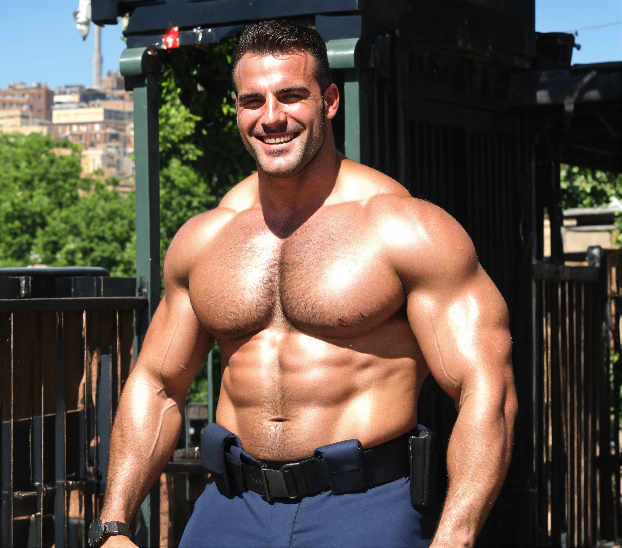 Sweaty shiny handsome italian cop from the bronx, joe menano. he is a heavyweight brute muslebound macho italian man from n.y.c. his sweaty muscles glisten in the hot sun. his tan face smiling a flirting expression.