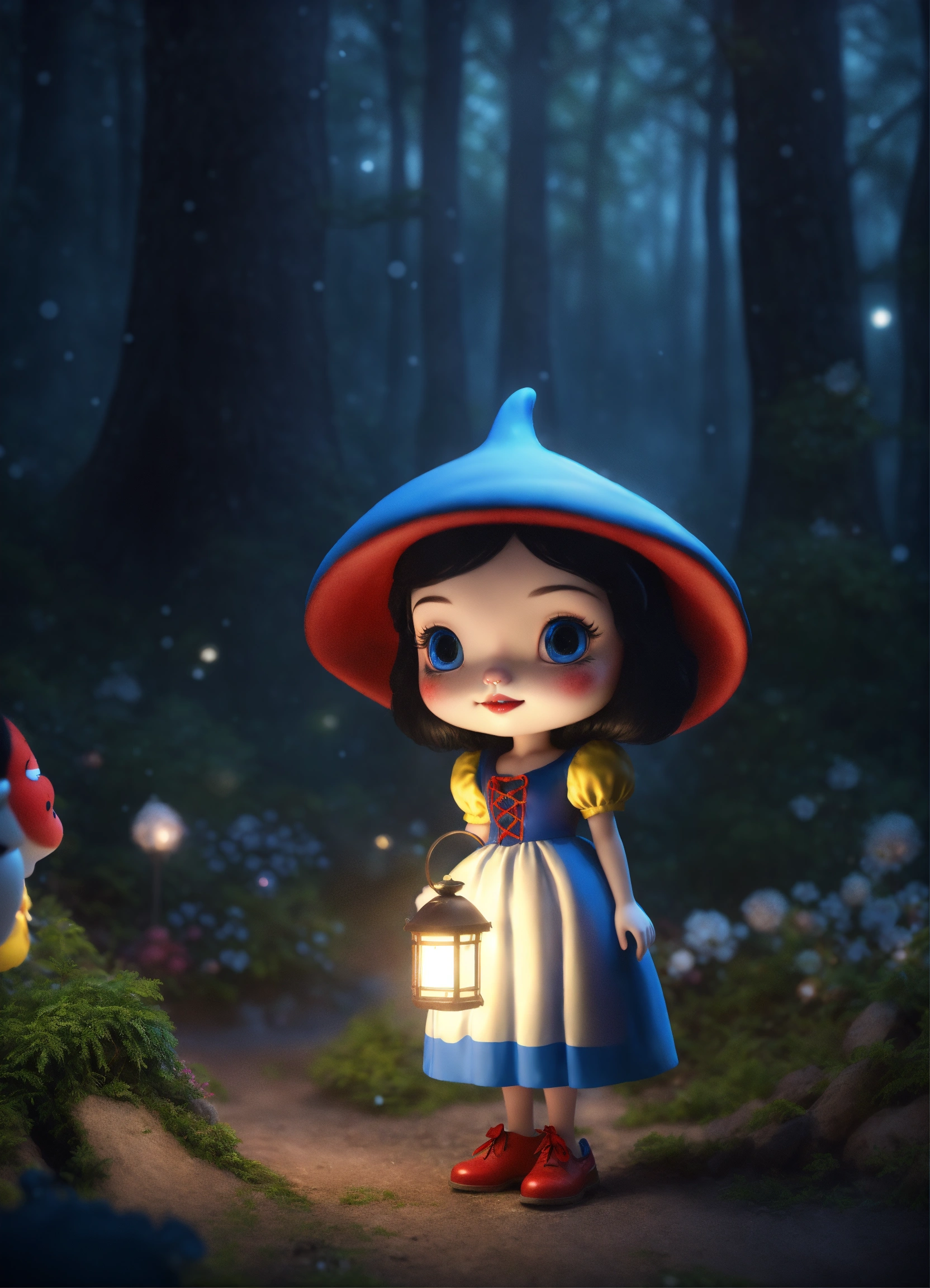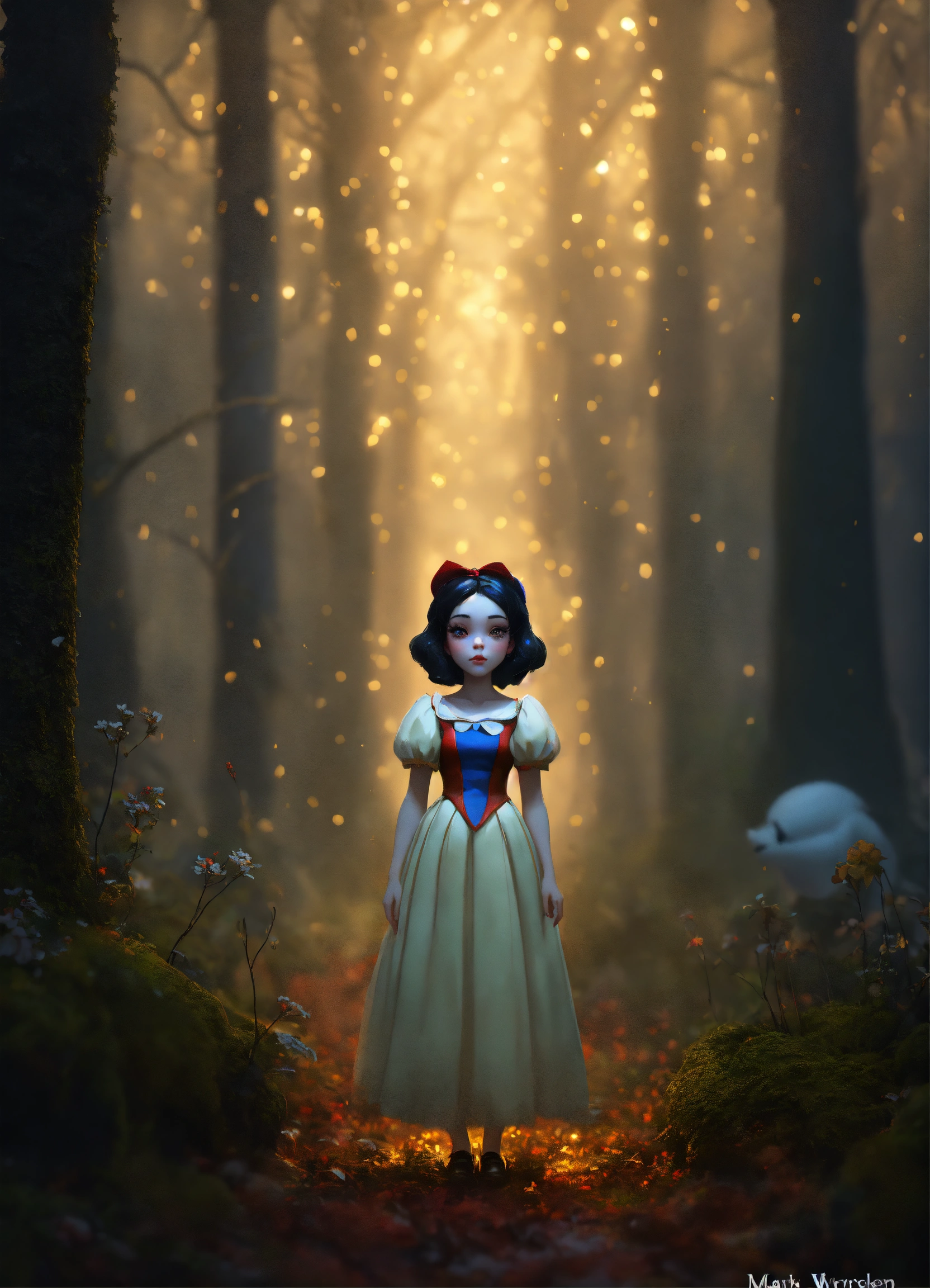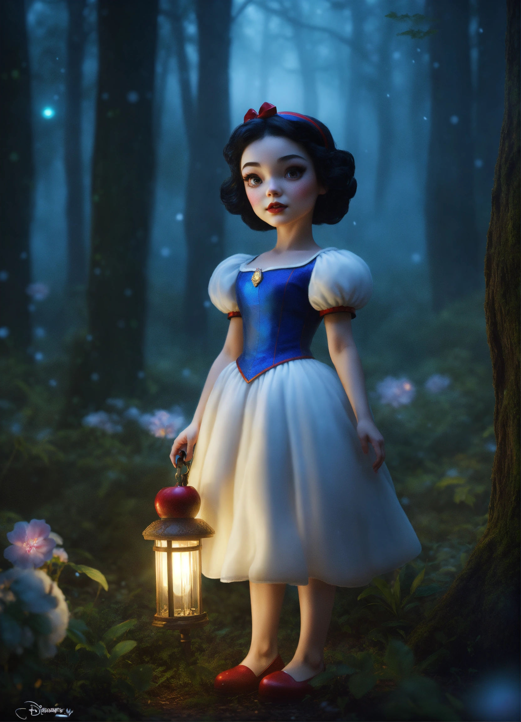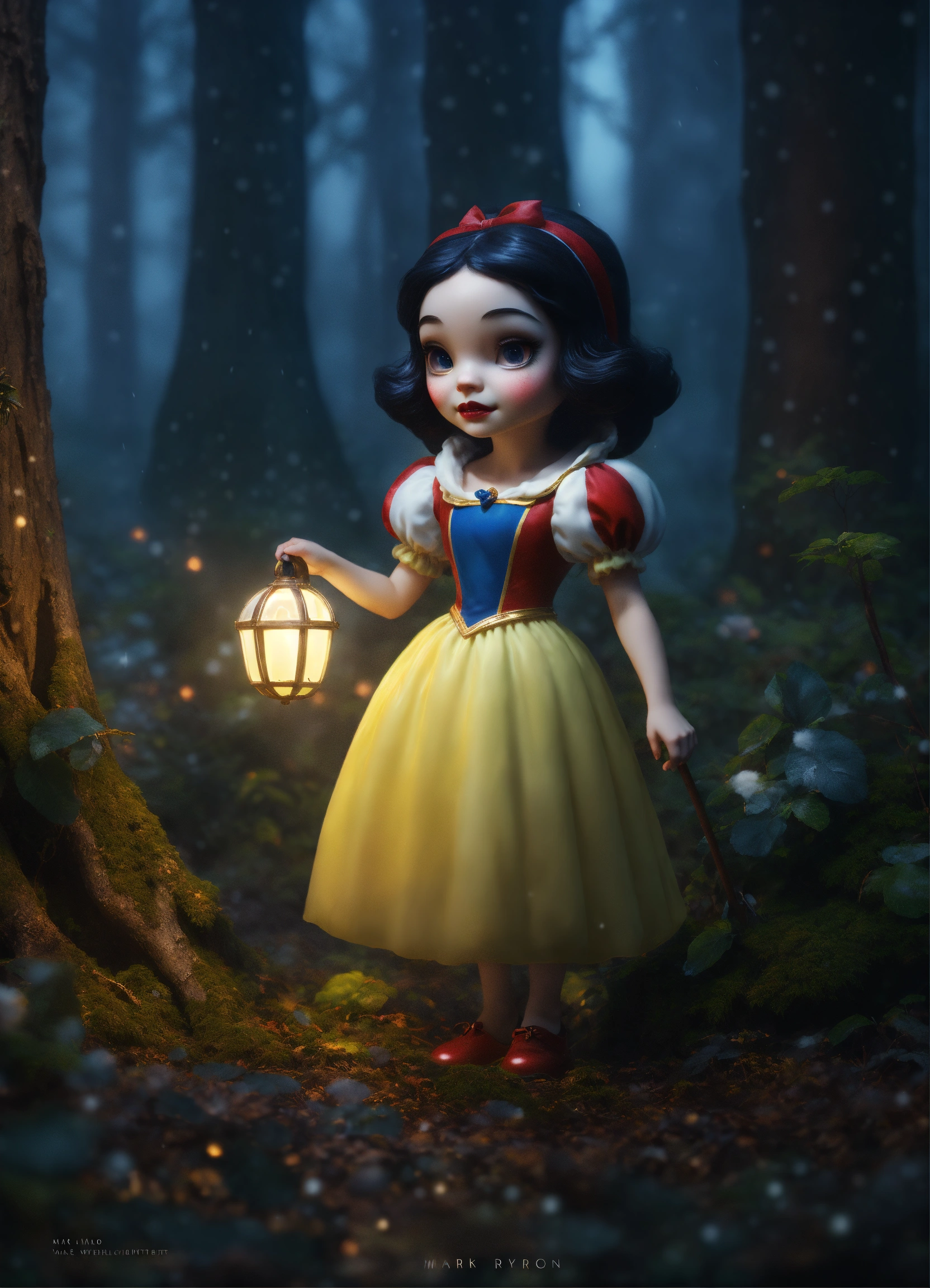 Disney little snow white white painted face, magical forest, foggy weather, night light, intricate, sharf focus, concept art, artstation, fantasy art, octane render, cinematic lighting, otherworldy by mark ryden