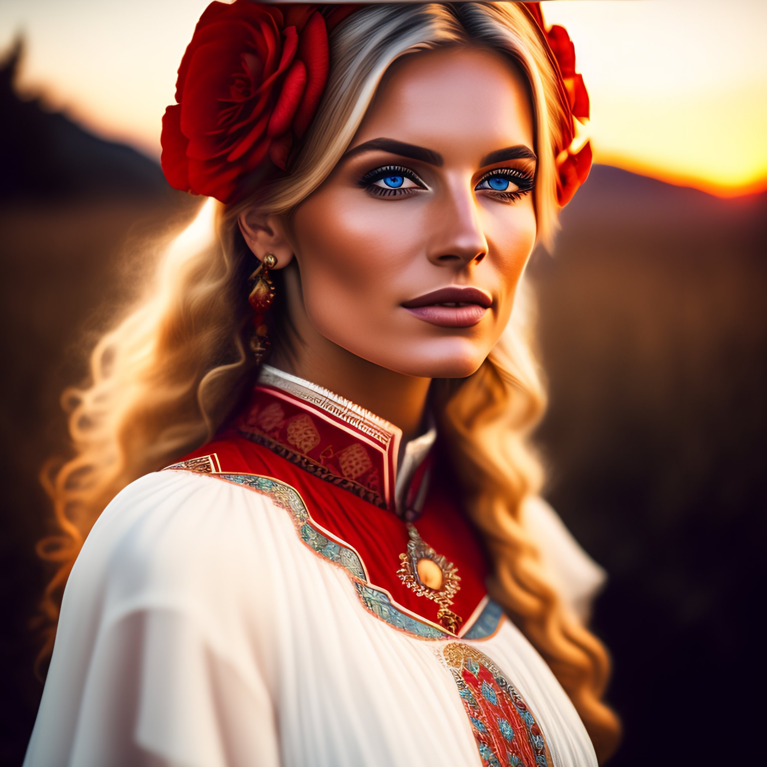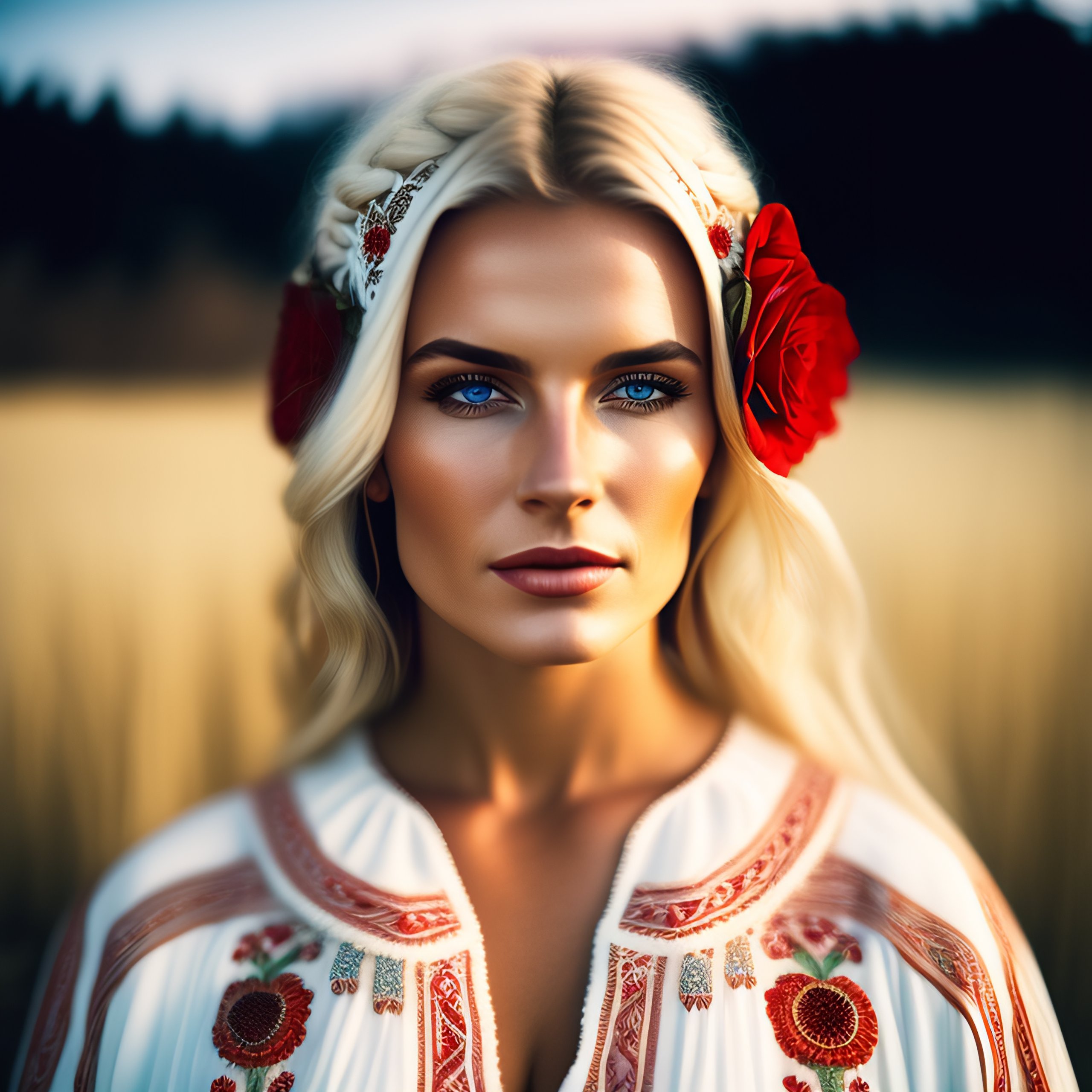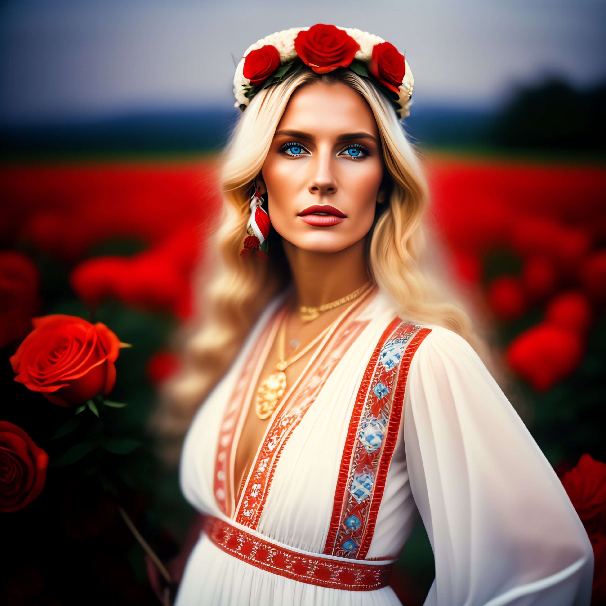 Long shot of a blonde, blue eyed female balkan woman in a slavic village wearing a white transparent dress with red and white balkan folklore type patterns abd roses on her head on hair from a distance walking on fire, mystery, medium format, fuji superia 400, iso 400, cinematic, photorealistic, surrealistic, details, 8k from distance, full body