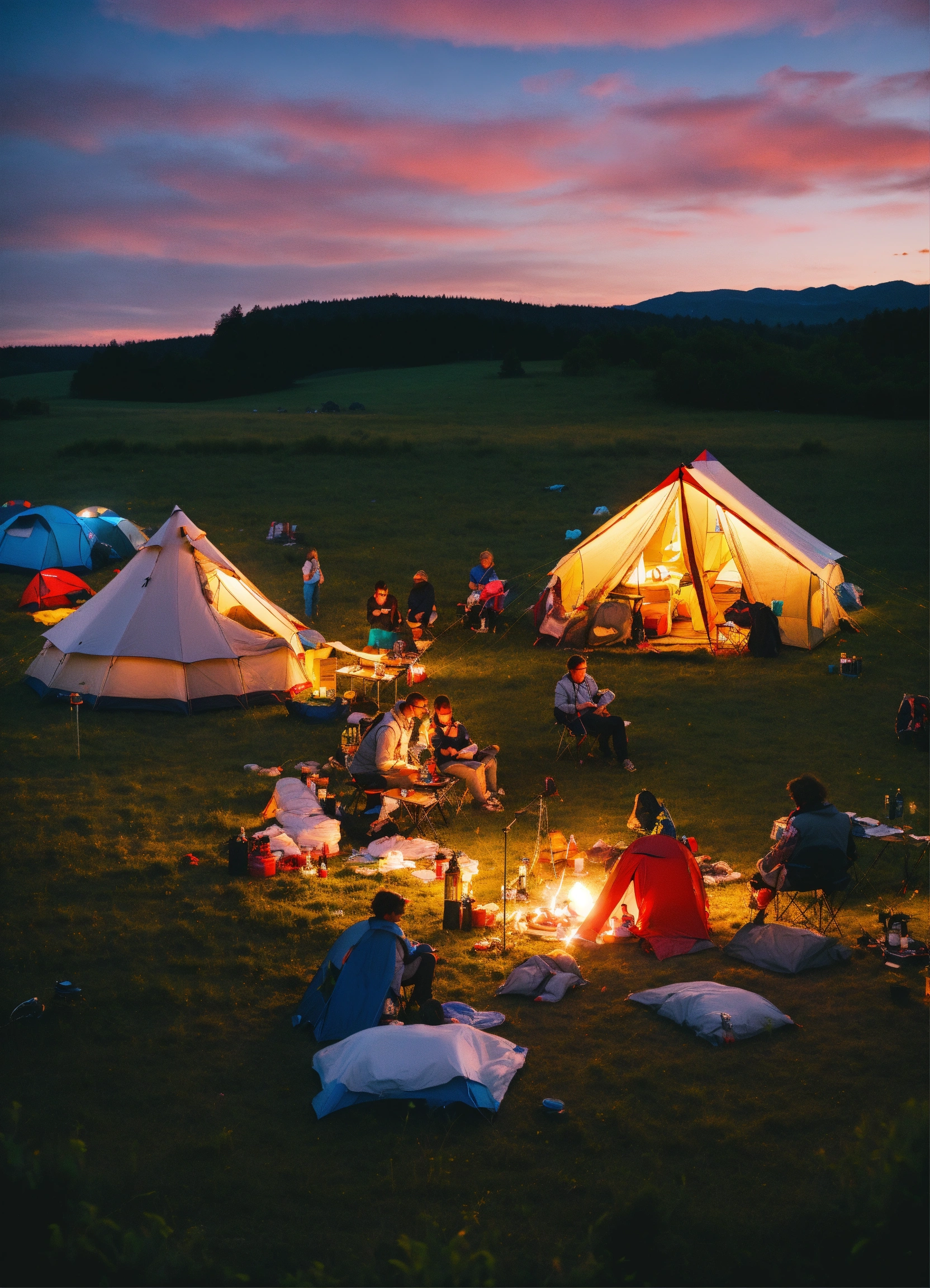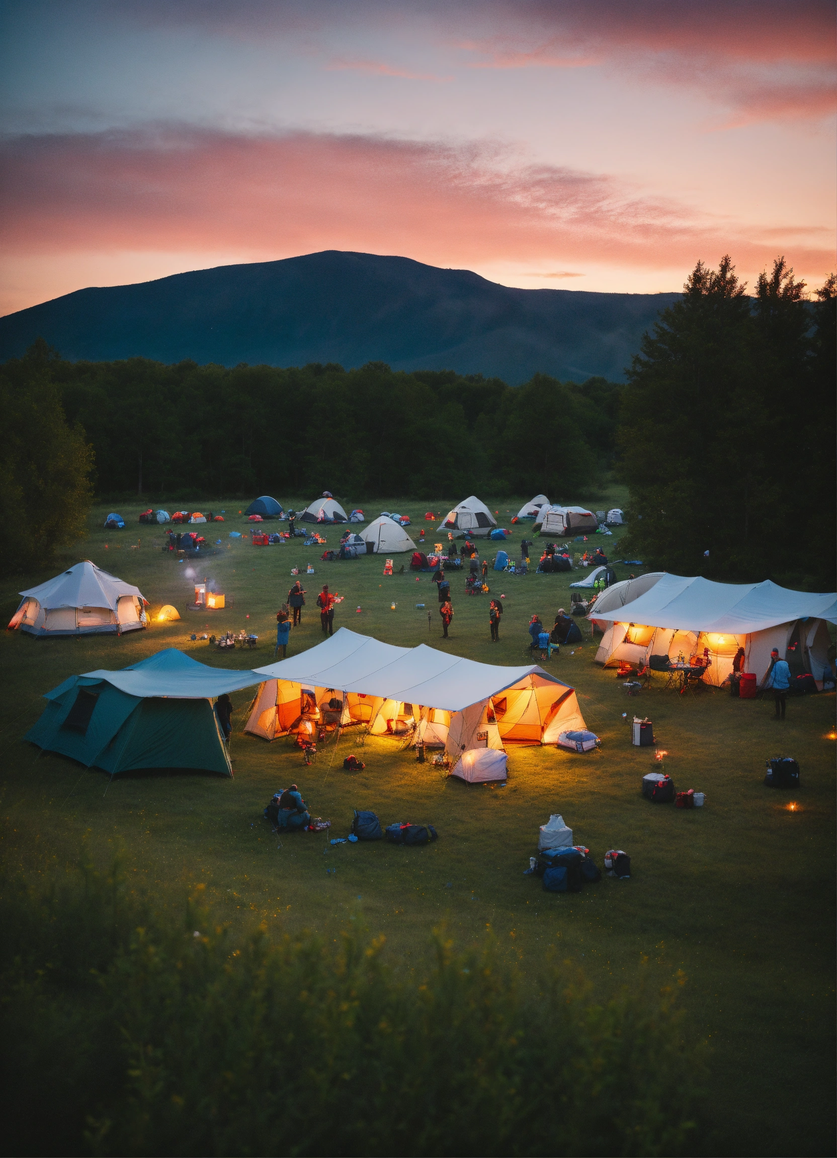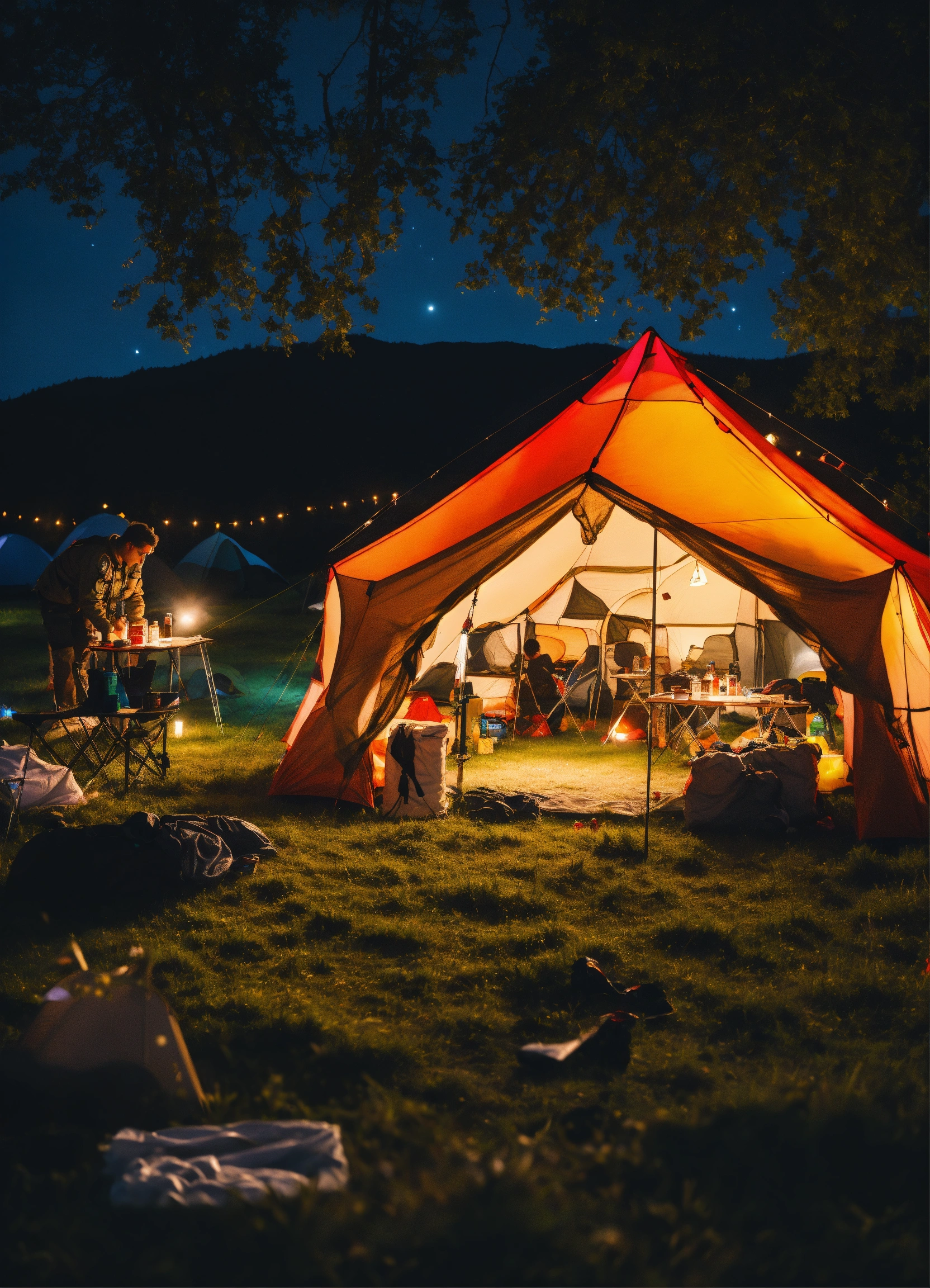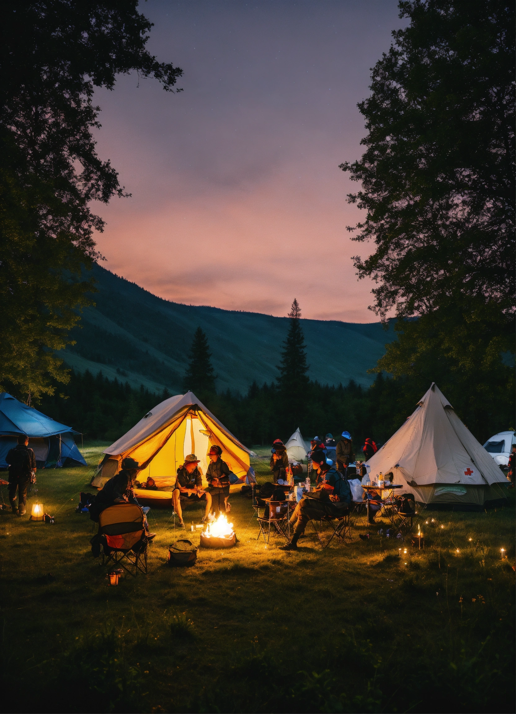 Field hospital out in the open meadow, where the injured goes to get help, first aid station, with people around the tent, campsite, red cross tent. rv campsite, night time. with fairy lights, glamping
