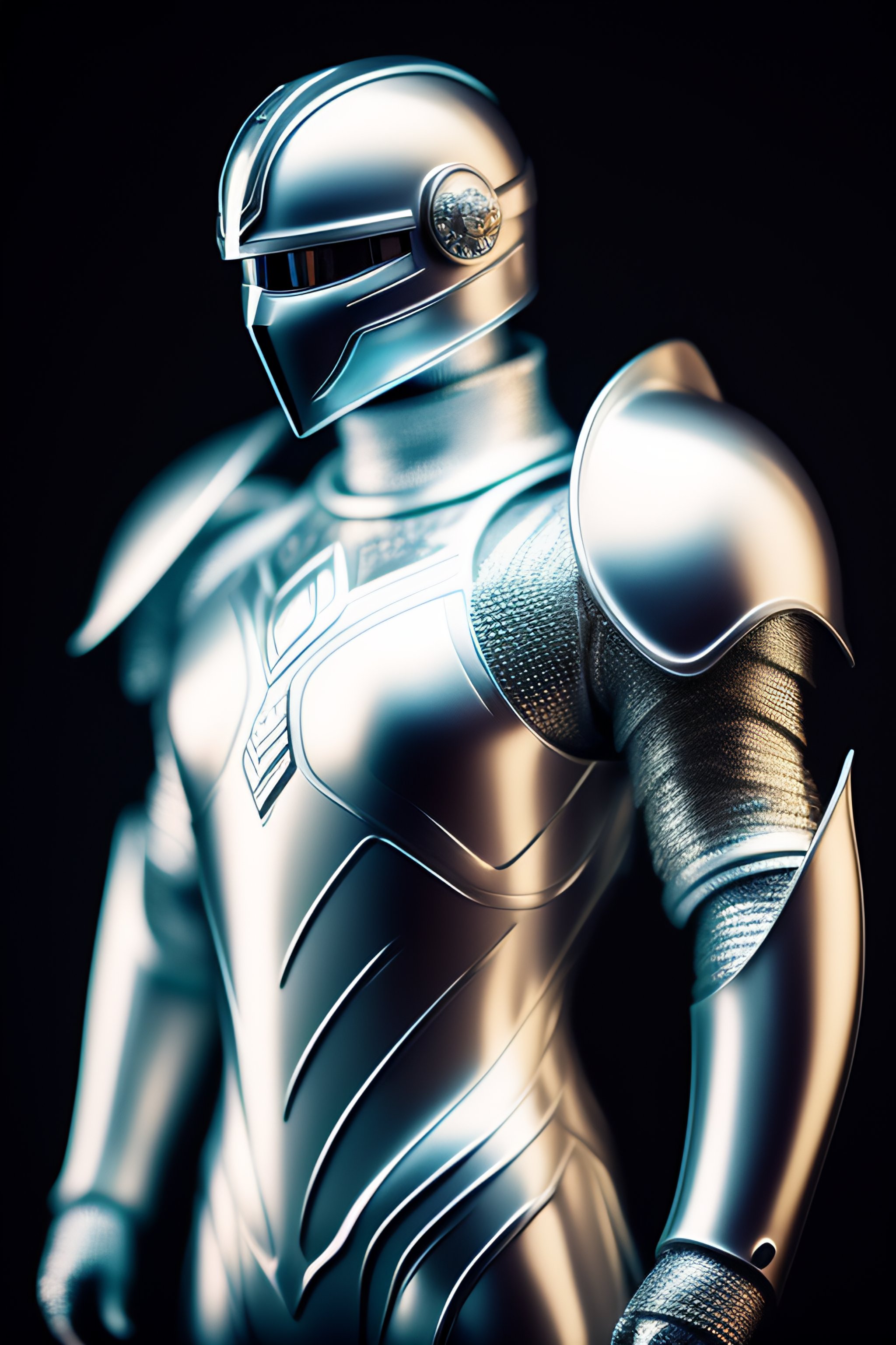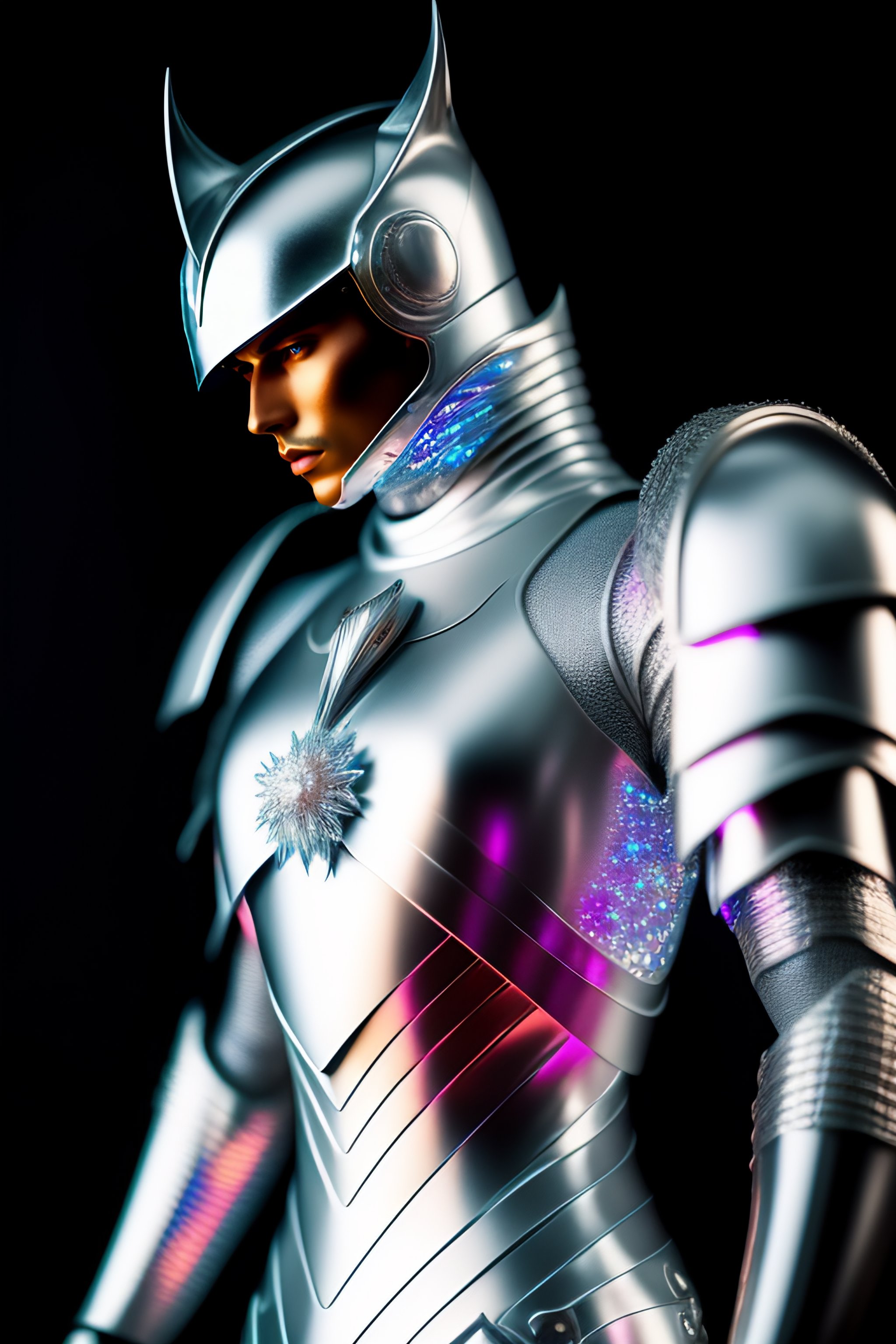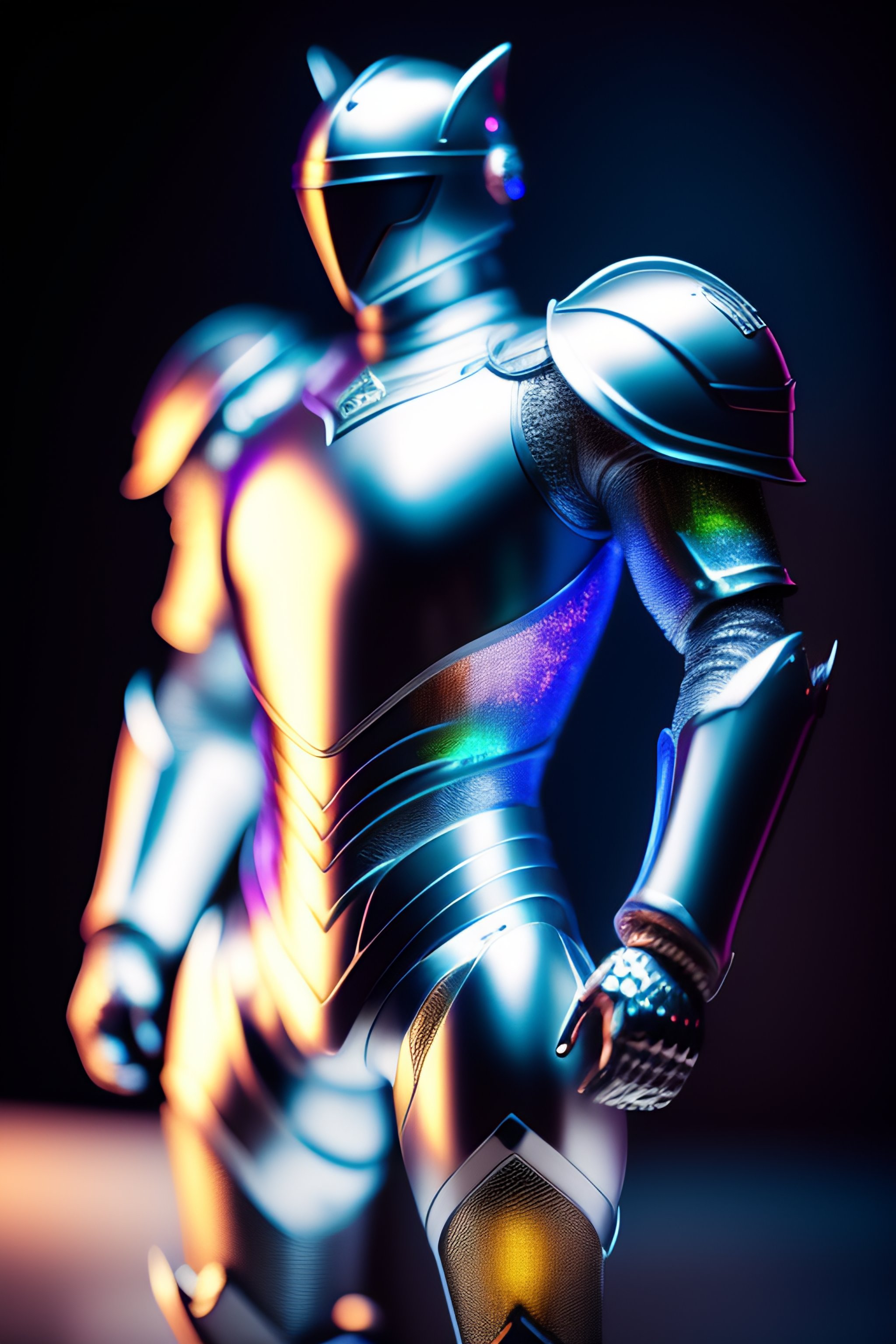 A photograph of a silver elf armour made of white titanium and some crystal, rgb leds rainbow, power suit, gradient, crystal, visible wires and microchip, holograph, crystal transparent torso, imposing, elegant, for men, modern minimalism, low poly lines, glitch core, dreamy, colorful, dystopia, godlike, mysterious, hologram display, flexing pose, pose, fashion pose