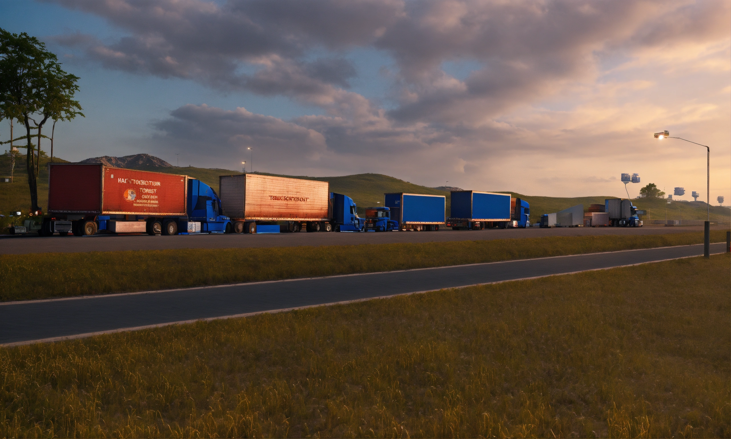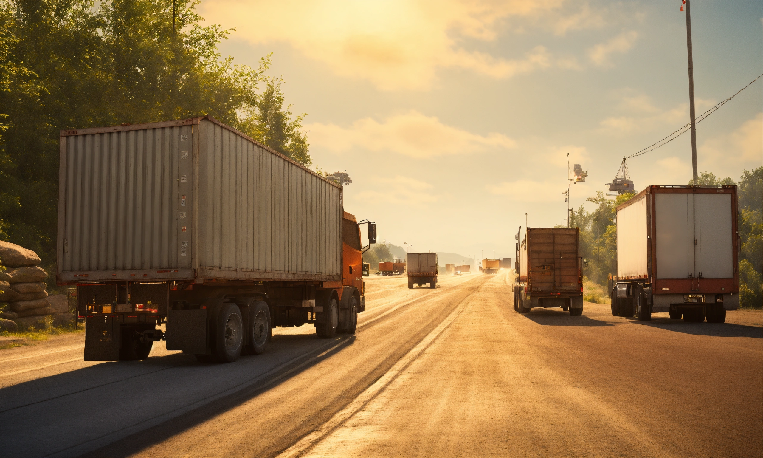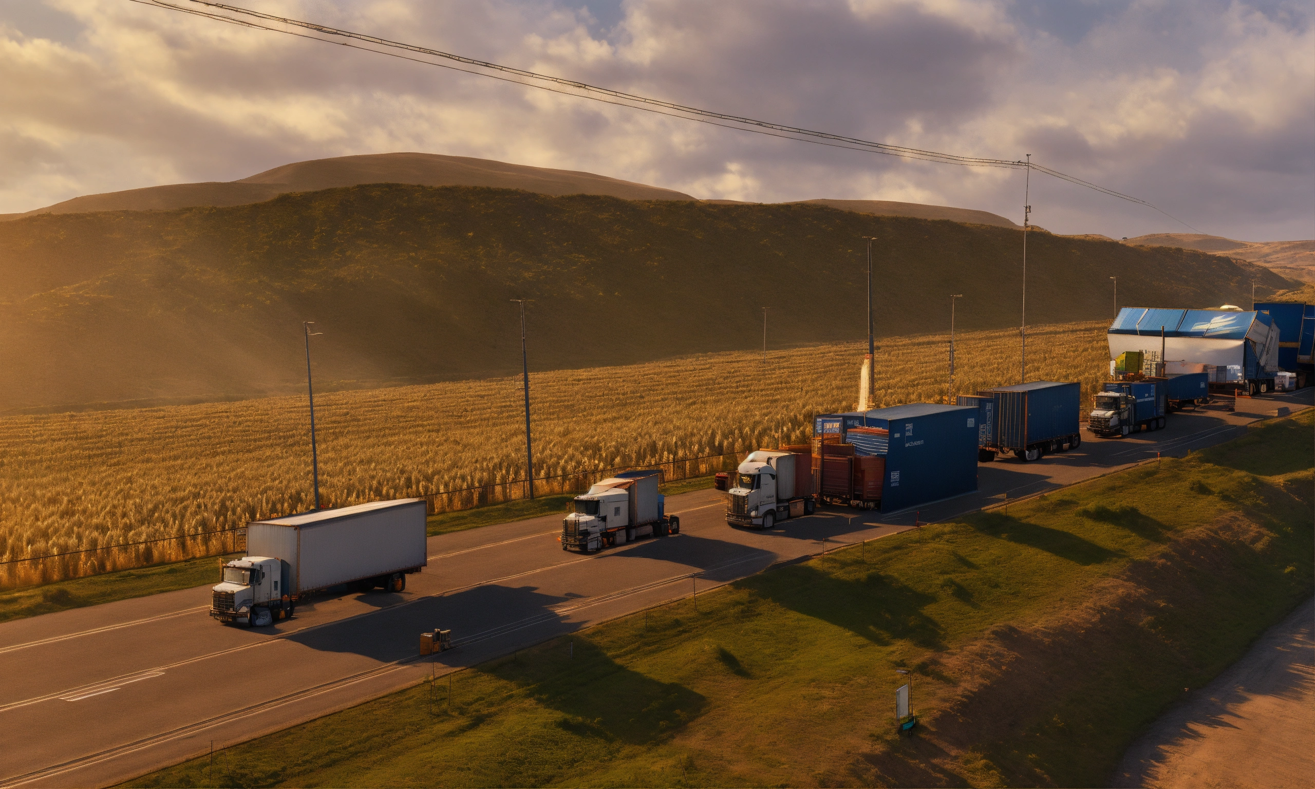 Imagine a scene with a country border checkpoint on the left side and a line of trucks loaded with grain approaching from the right. the trucks are waiting to cross the border. describe the setting, the checkpoint, and the activity of the trucks and checkpoint personnel. it should look like real photo
