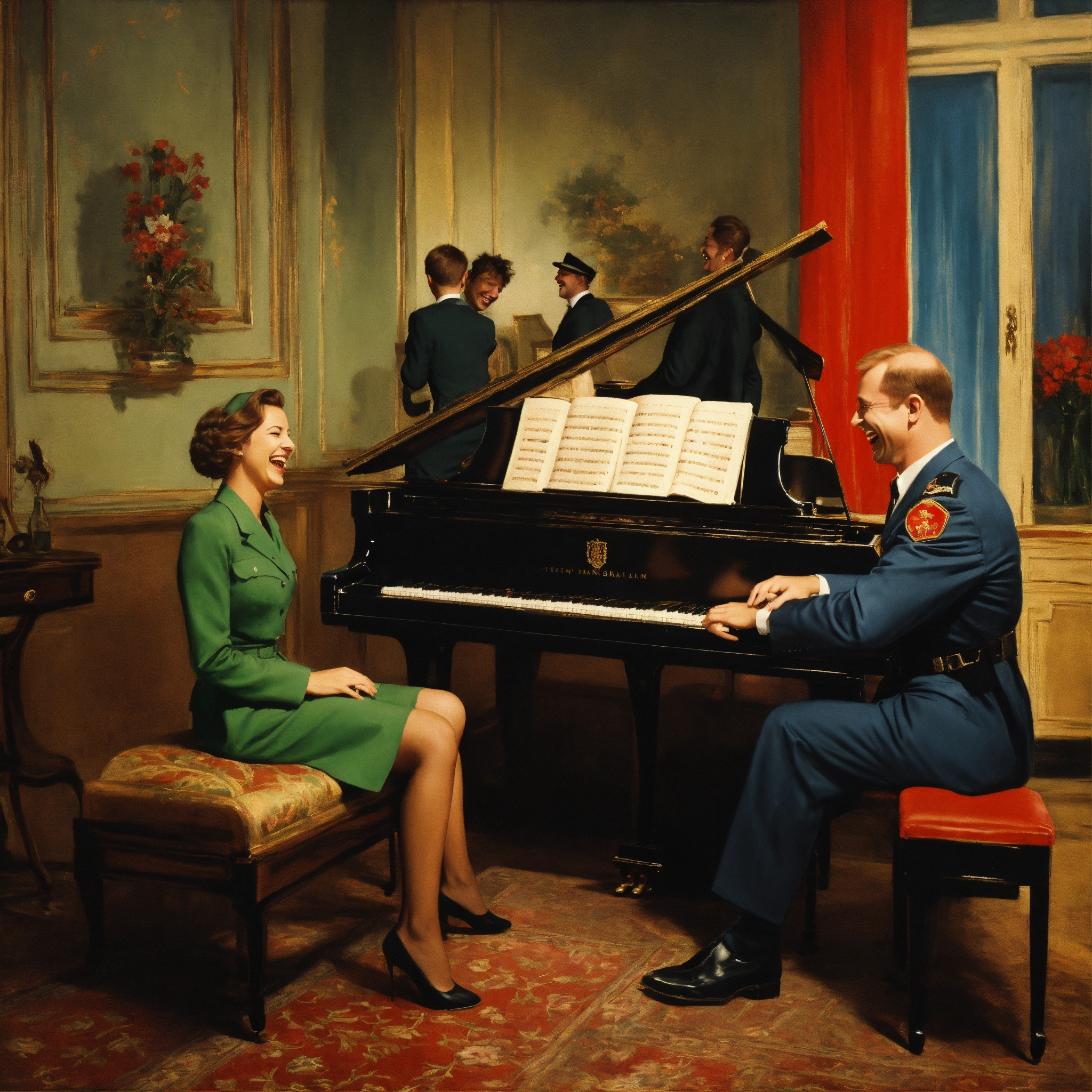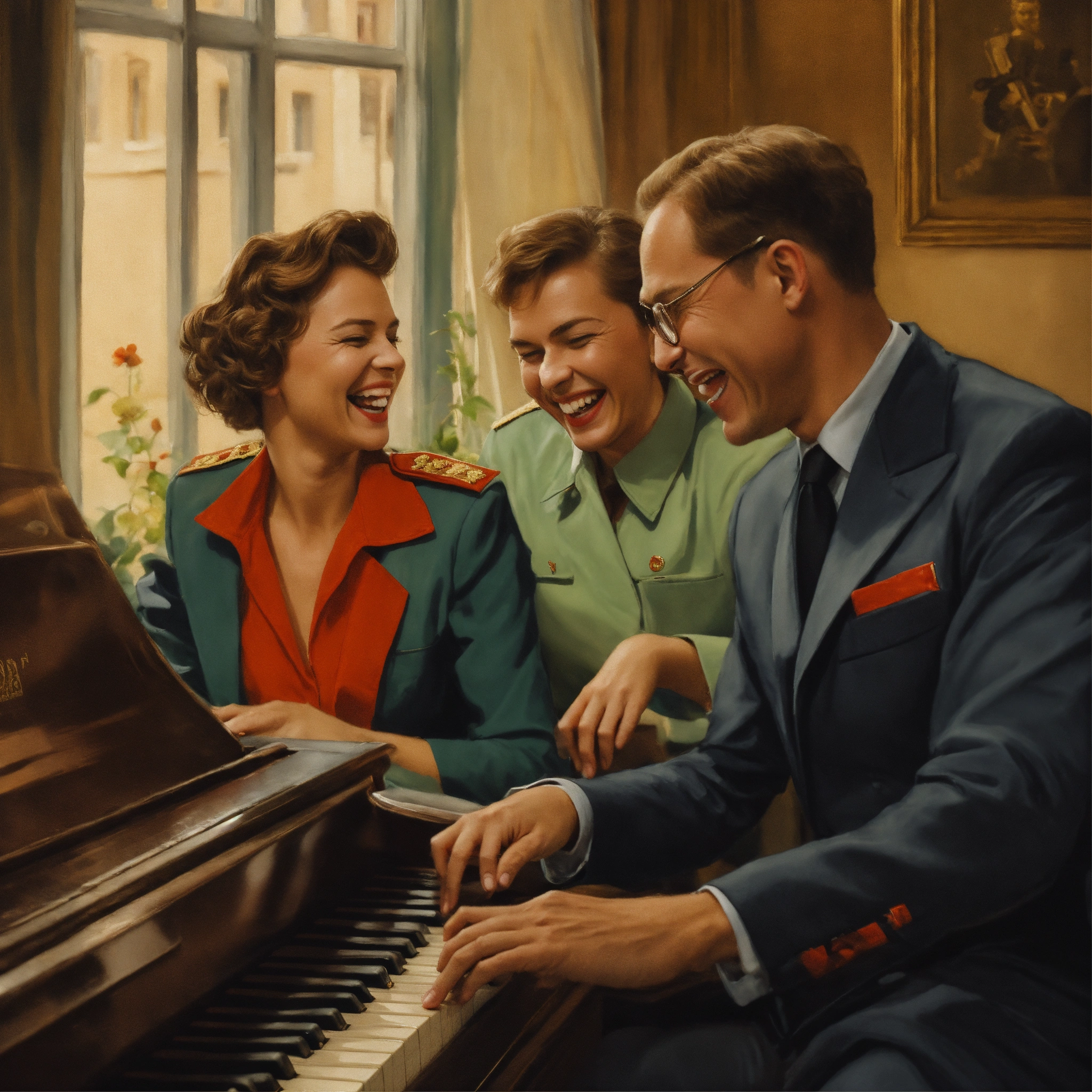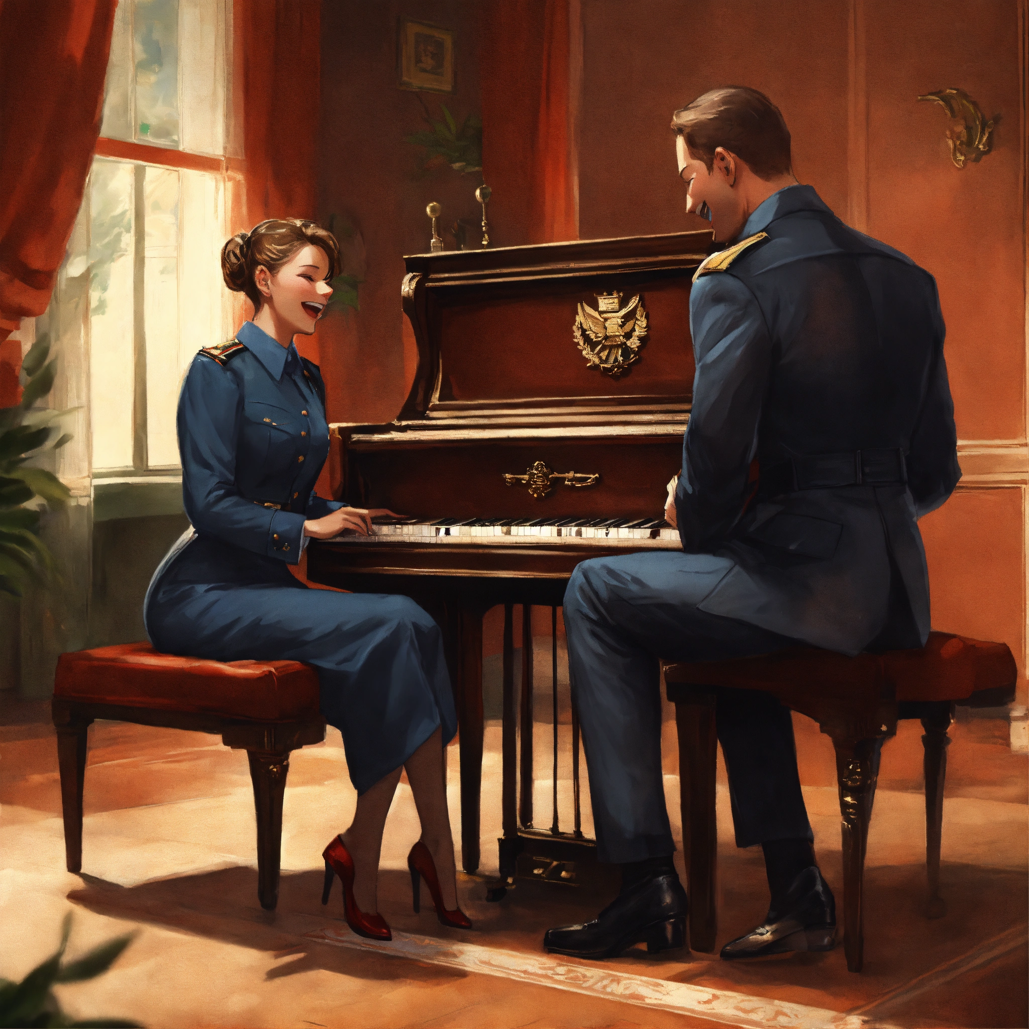 Female and male kgb agents laughing and playing piano