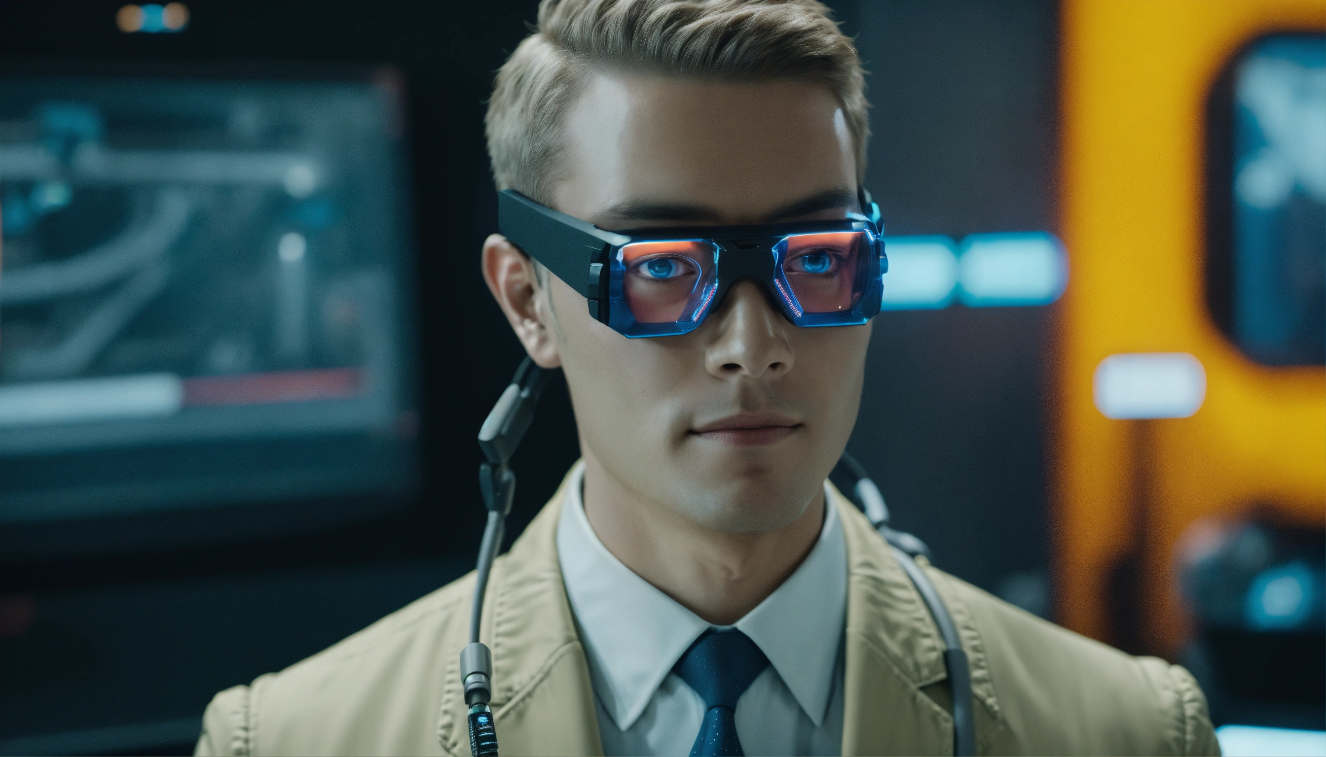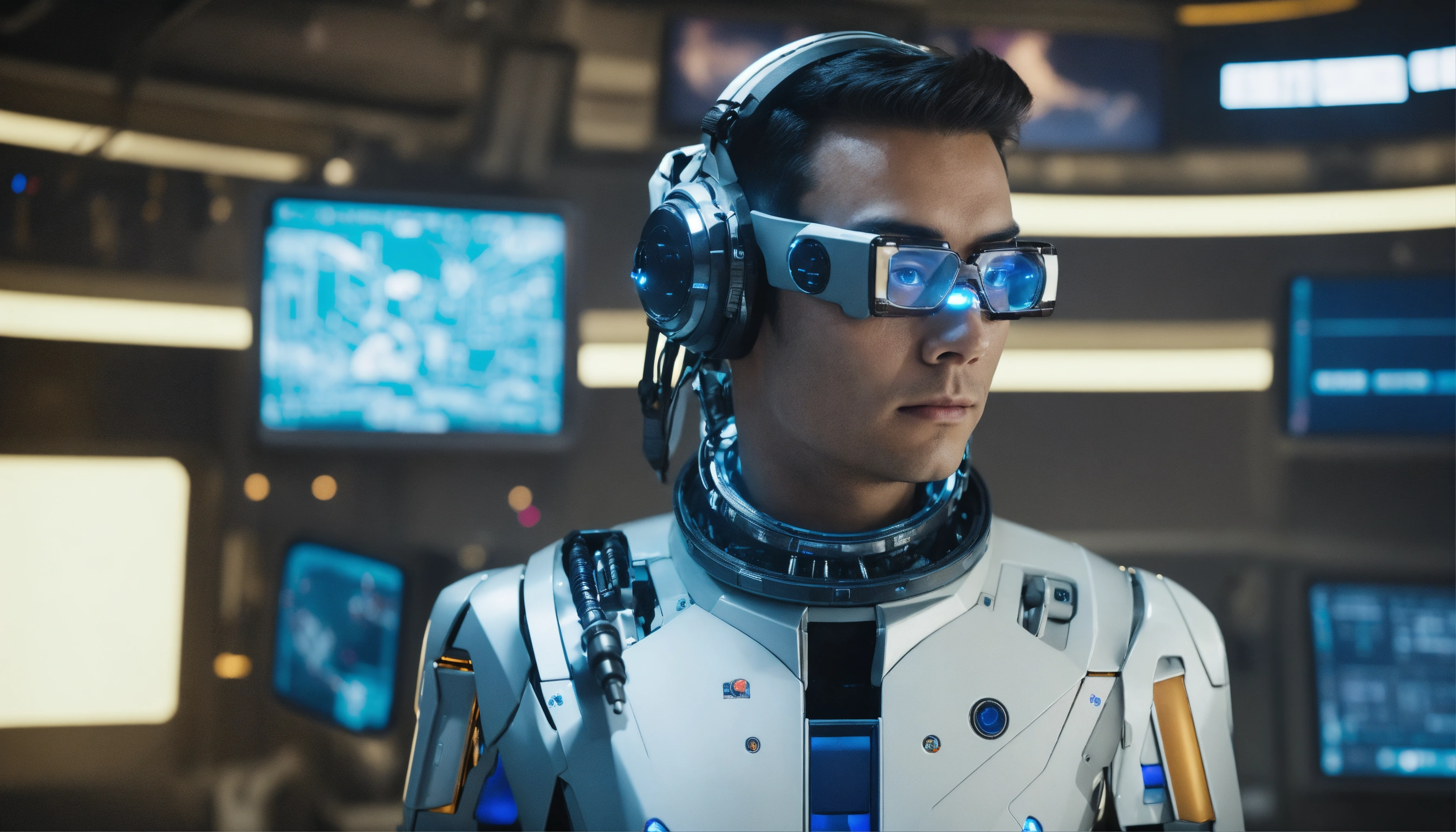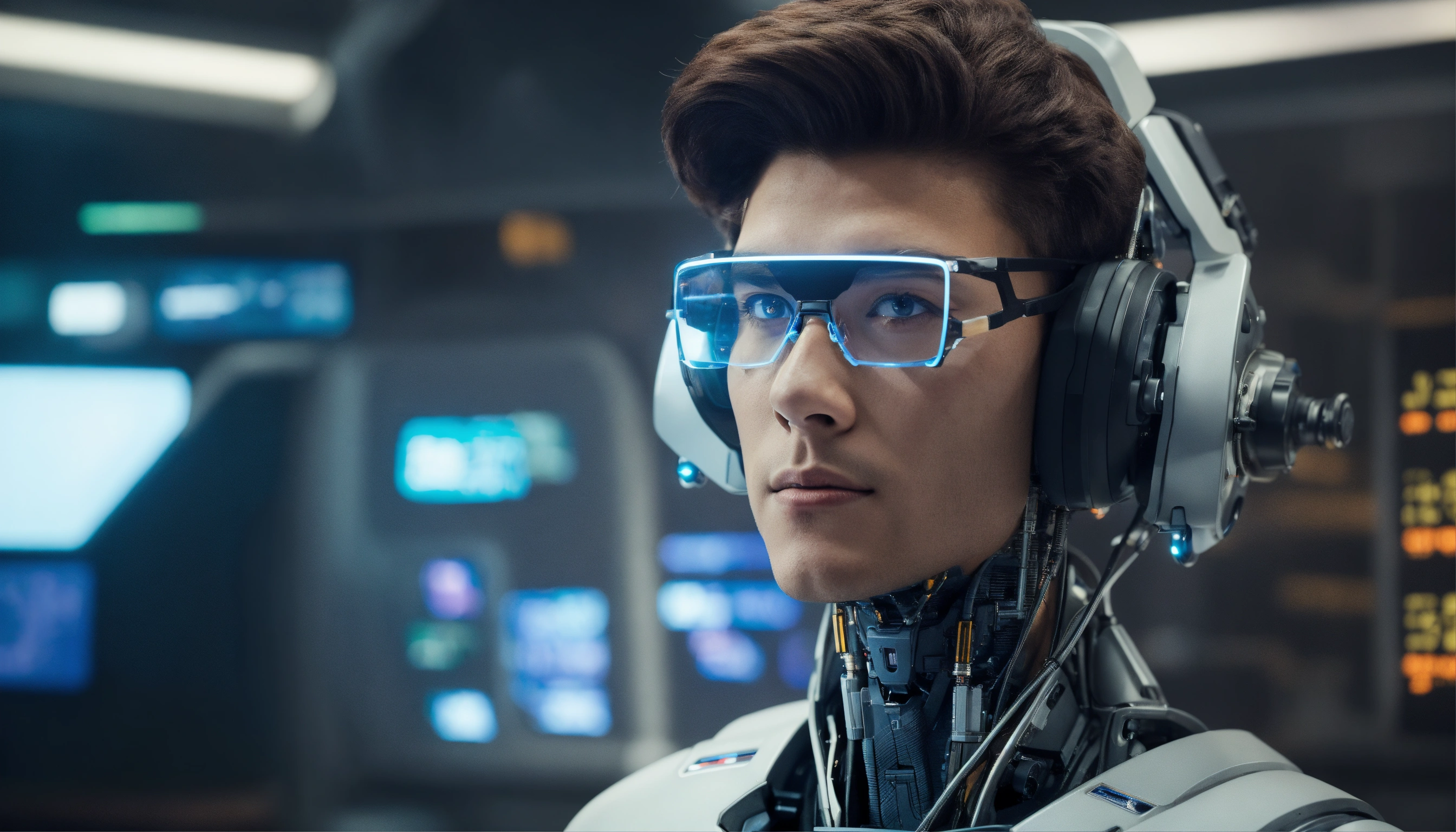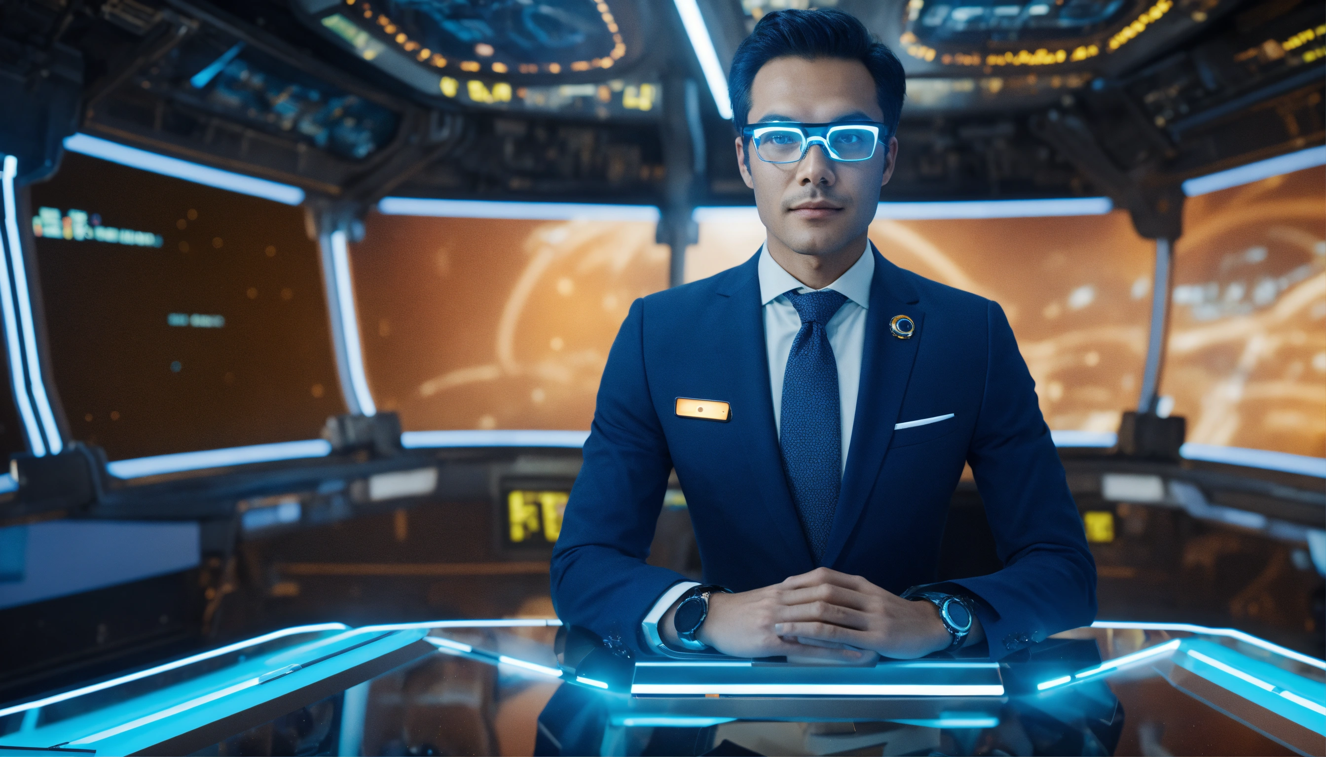 Futuristic space news anchor who is half-robot and half-human, with a face that closely resembles that of a typical human, wearing glasses. a professional news anchor working at a space station in the future. he has a unique appearance, being part robot and part human. look straight to camera