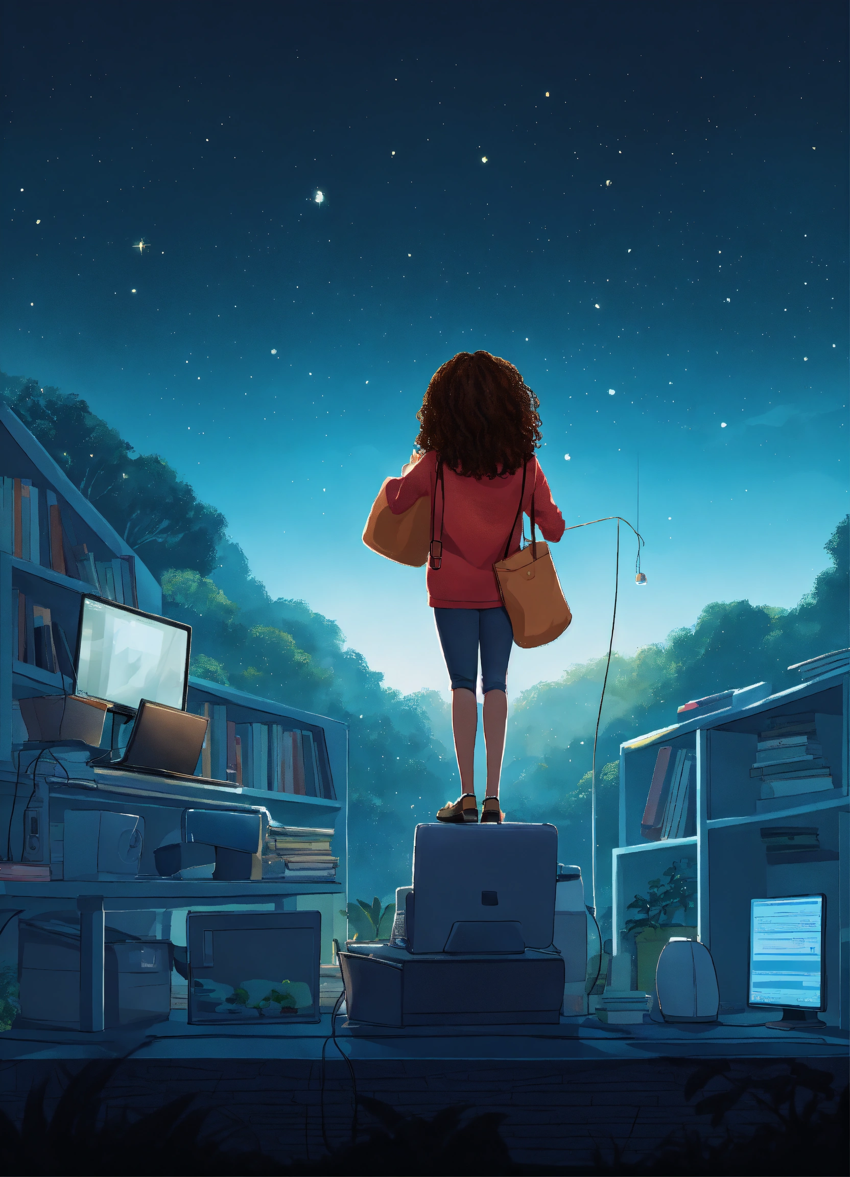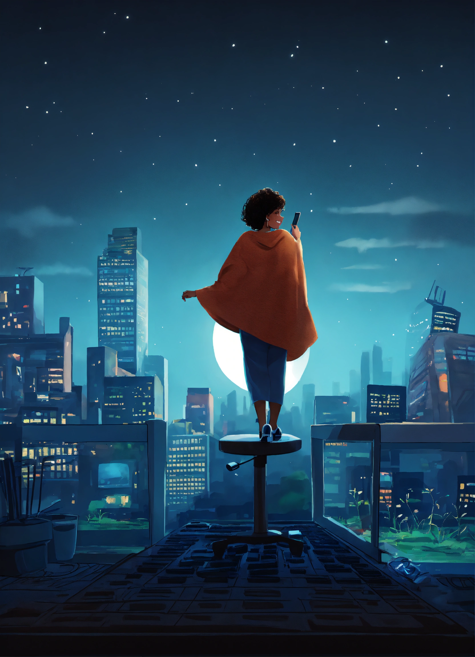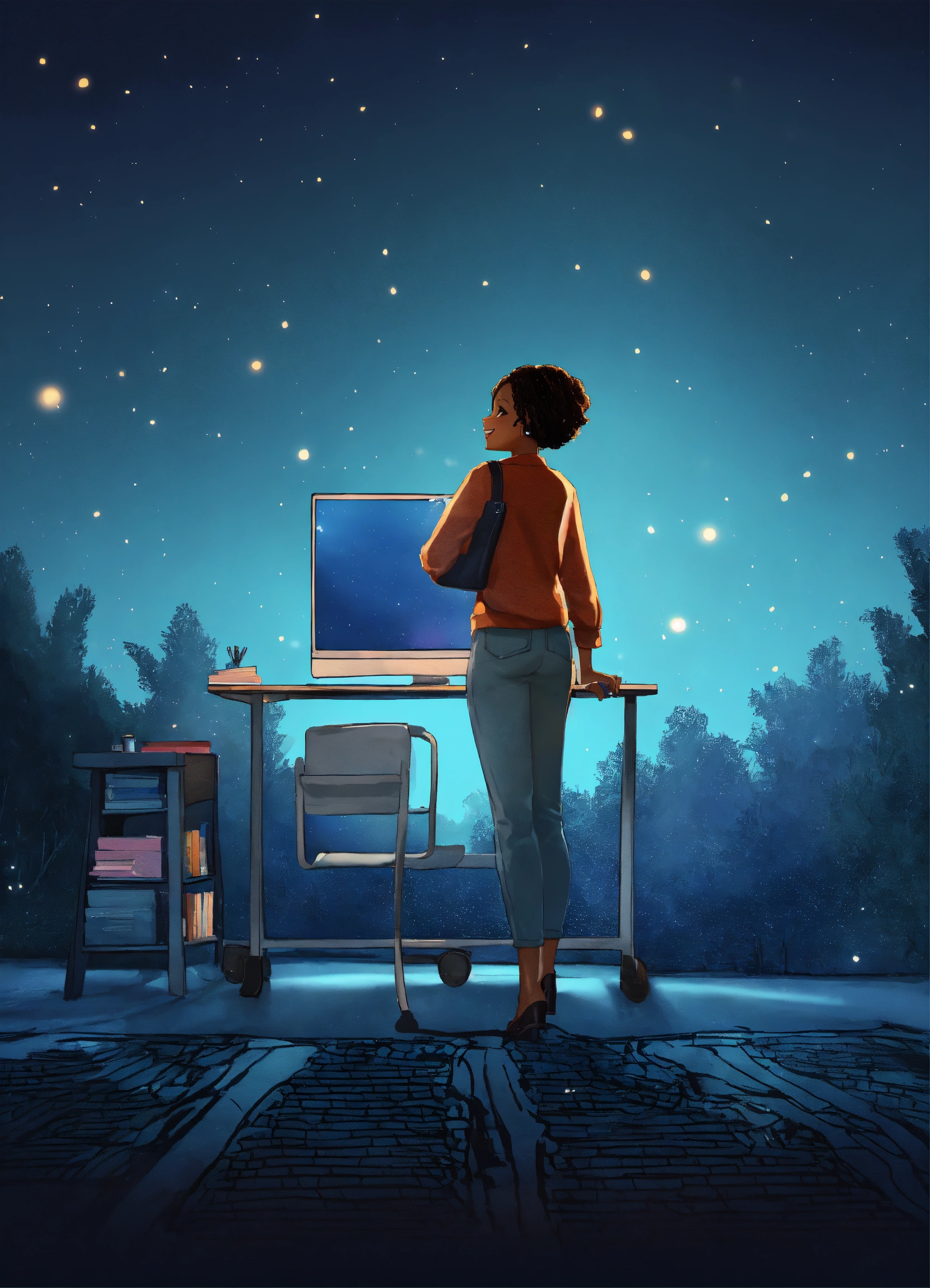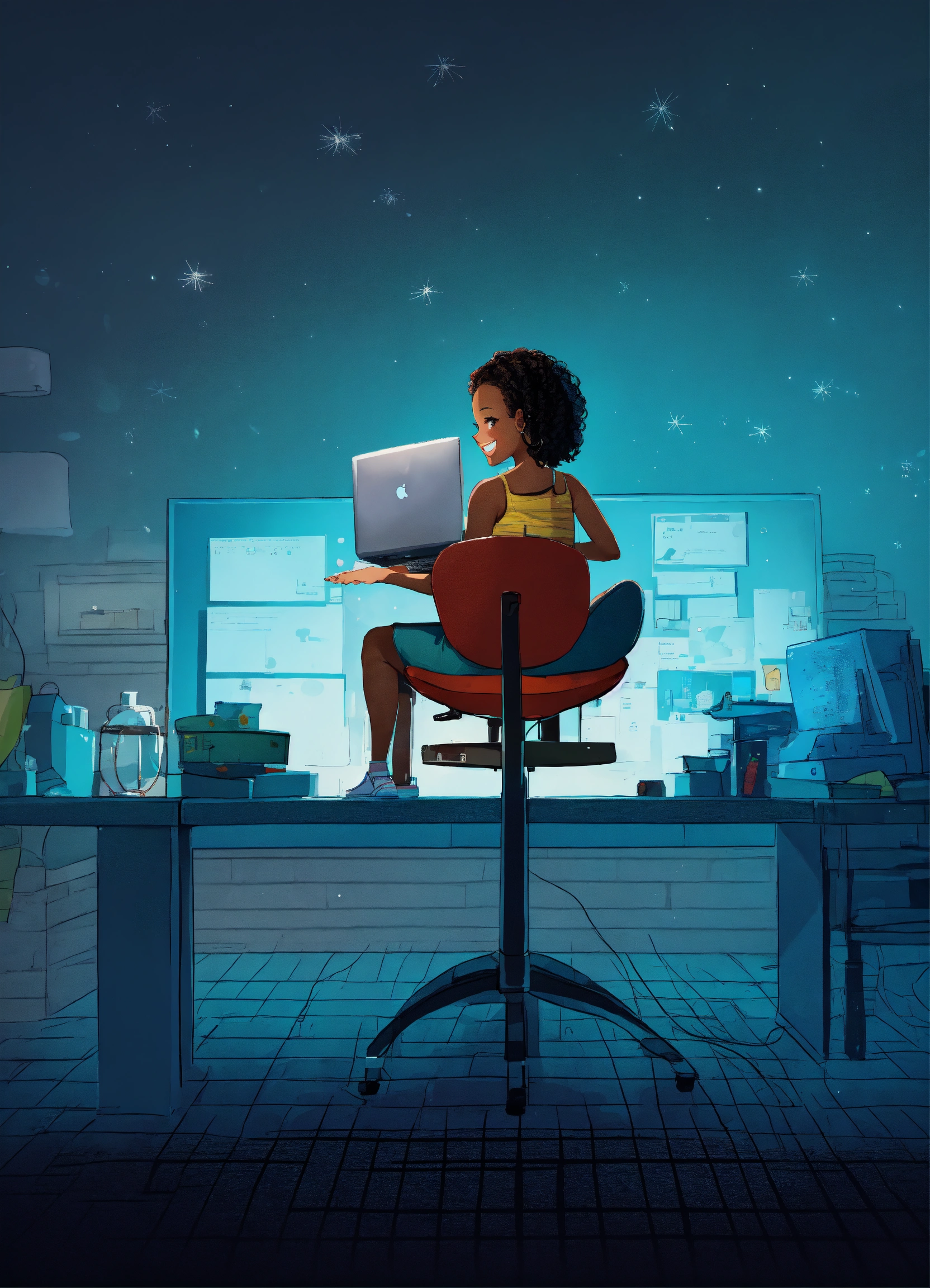 Smiling black woman, typing away at her computer, award winning children's book illustration style, 2d illustration, white background, front view