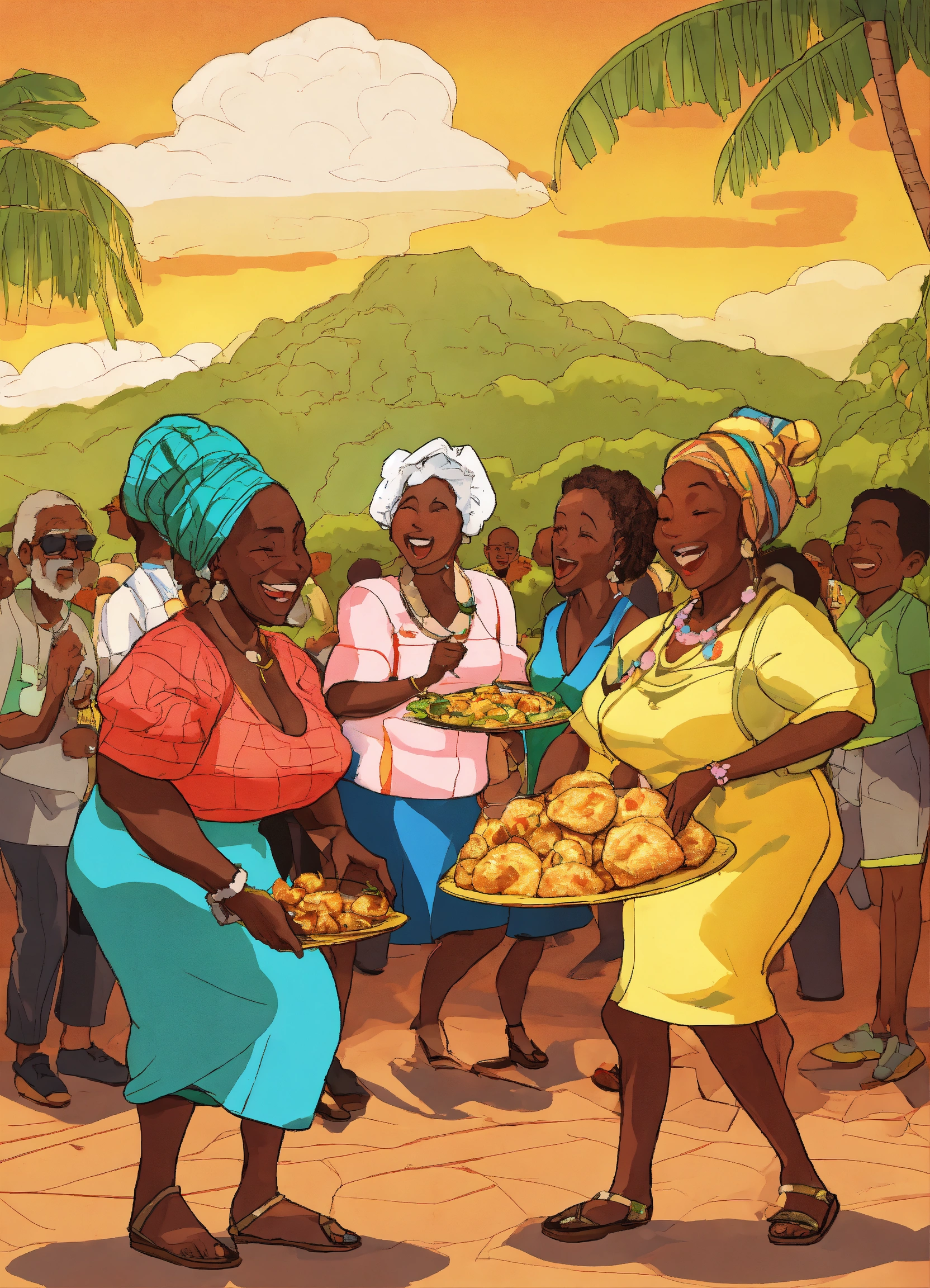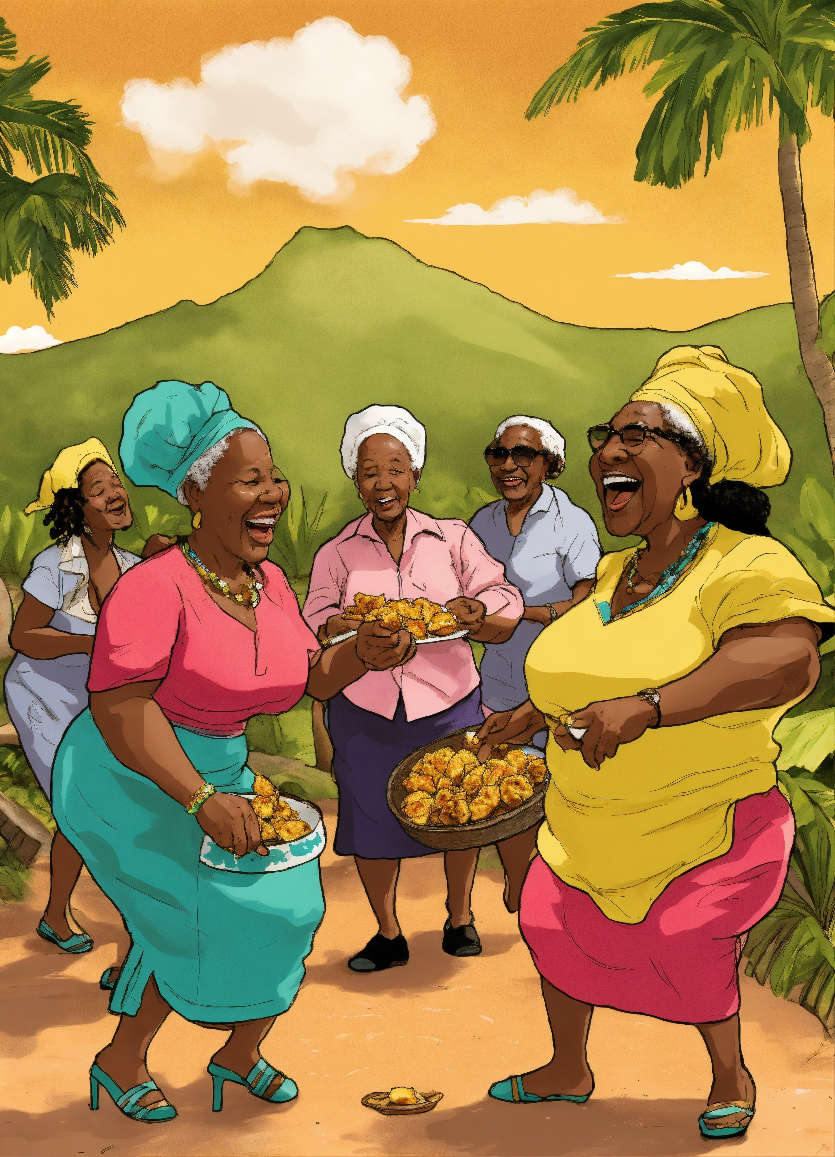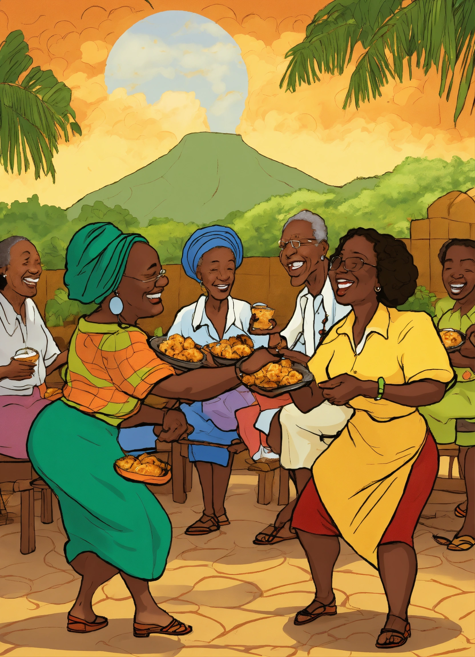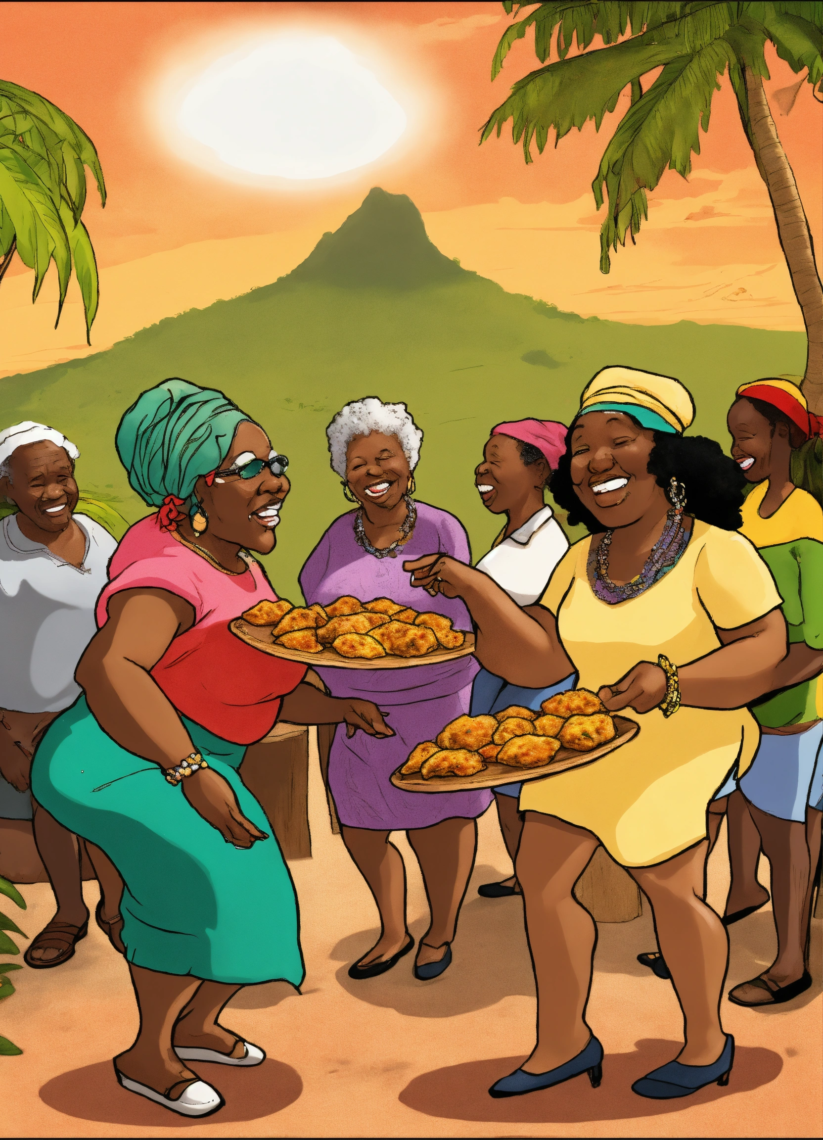 A cartoon of dancing talking caribbean fried dumplings sharing montserrat stories of the elders