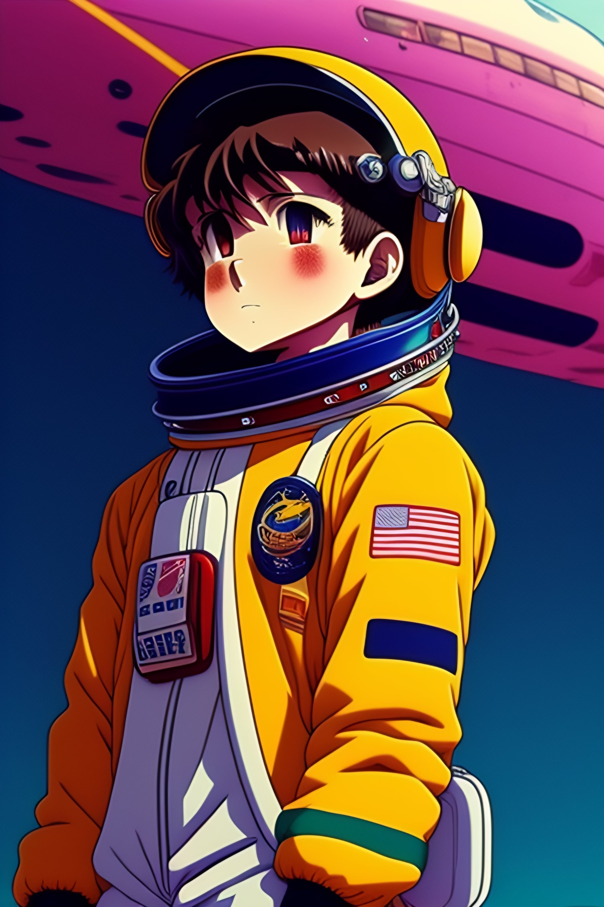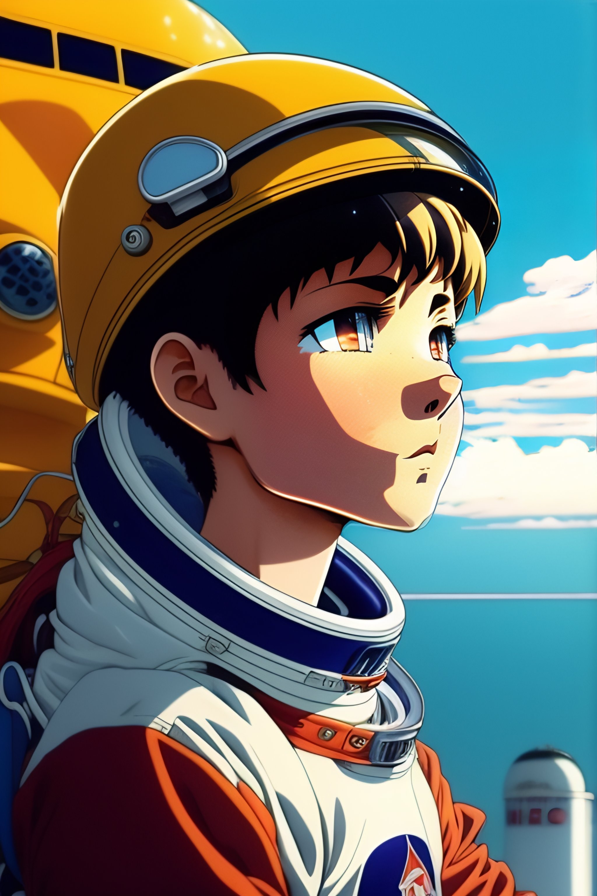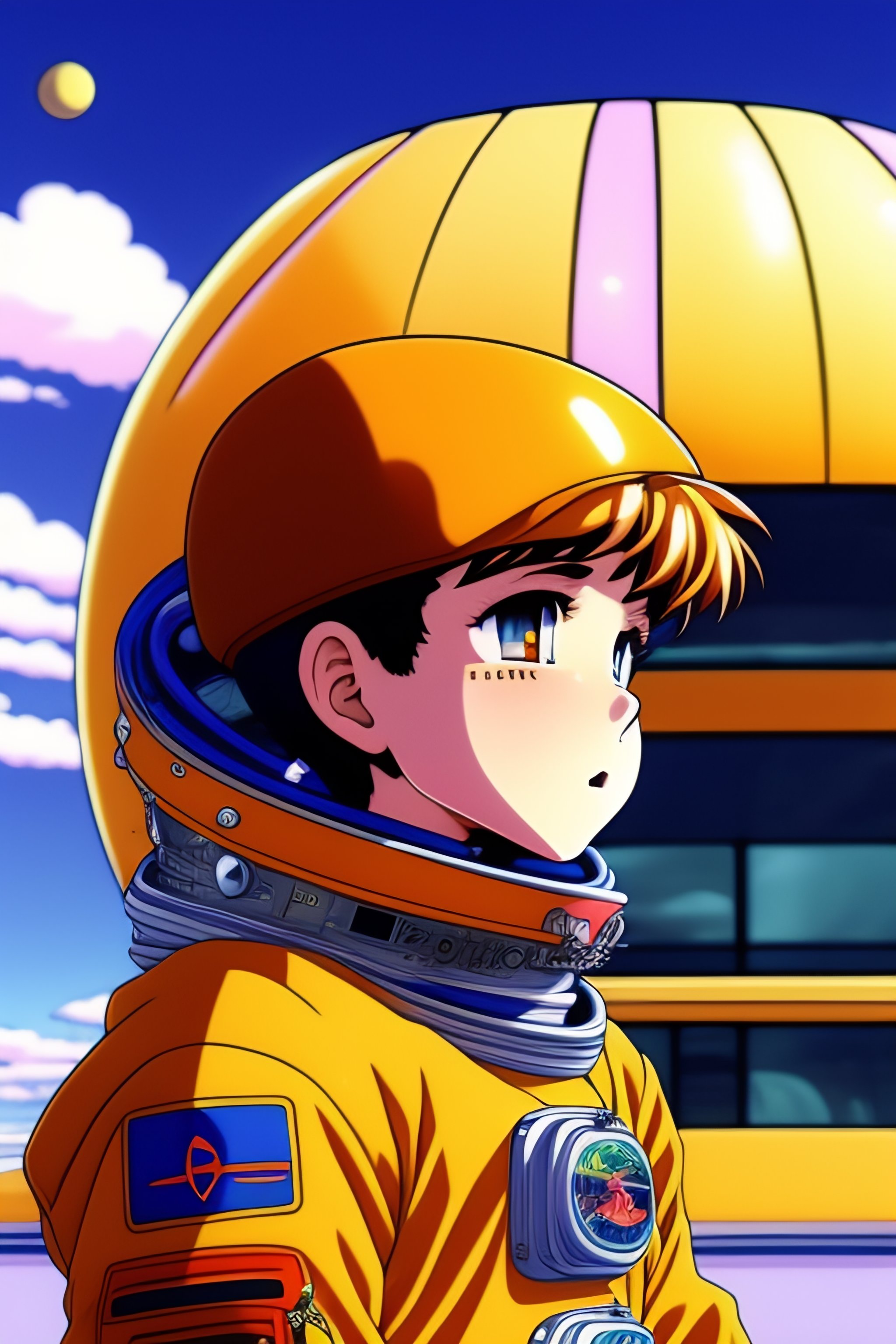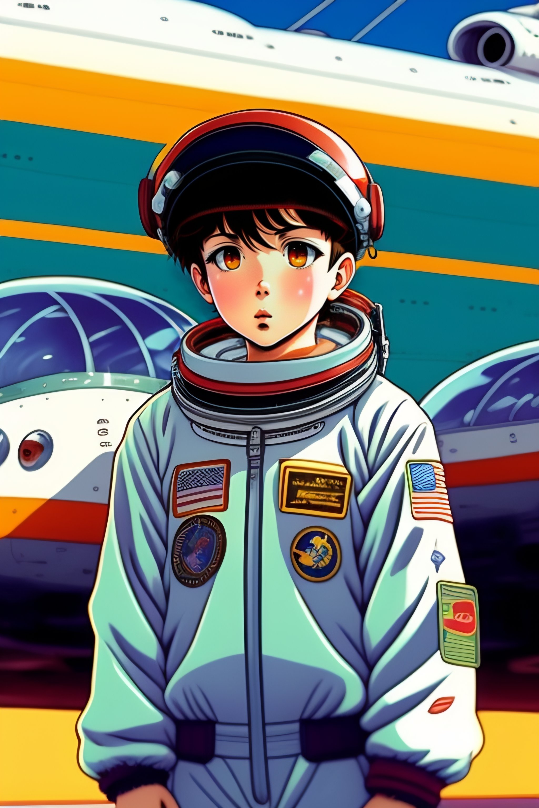 Vintage 90's anime style. a 12-year-old boy in an astronaut suit, staring at an abandoned airport covered with rust