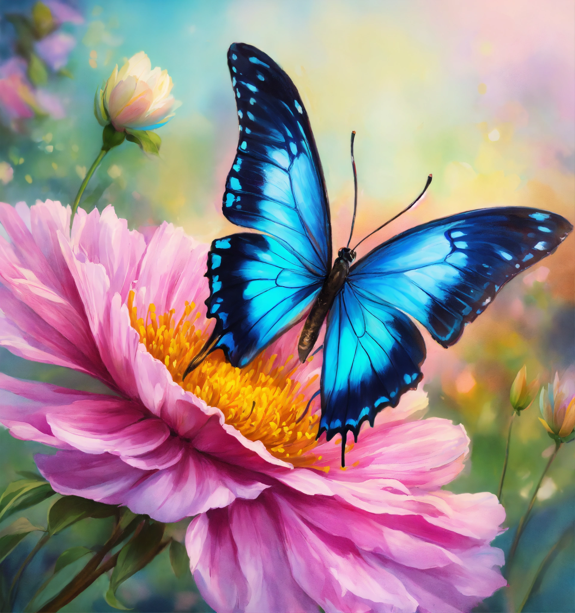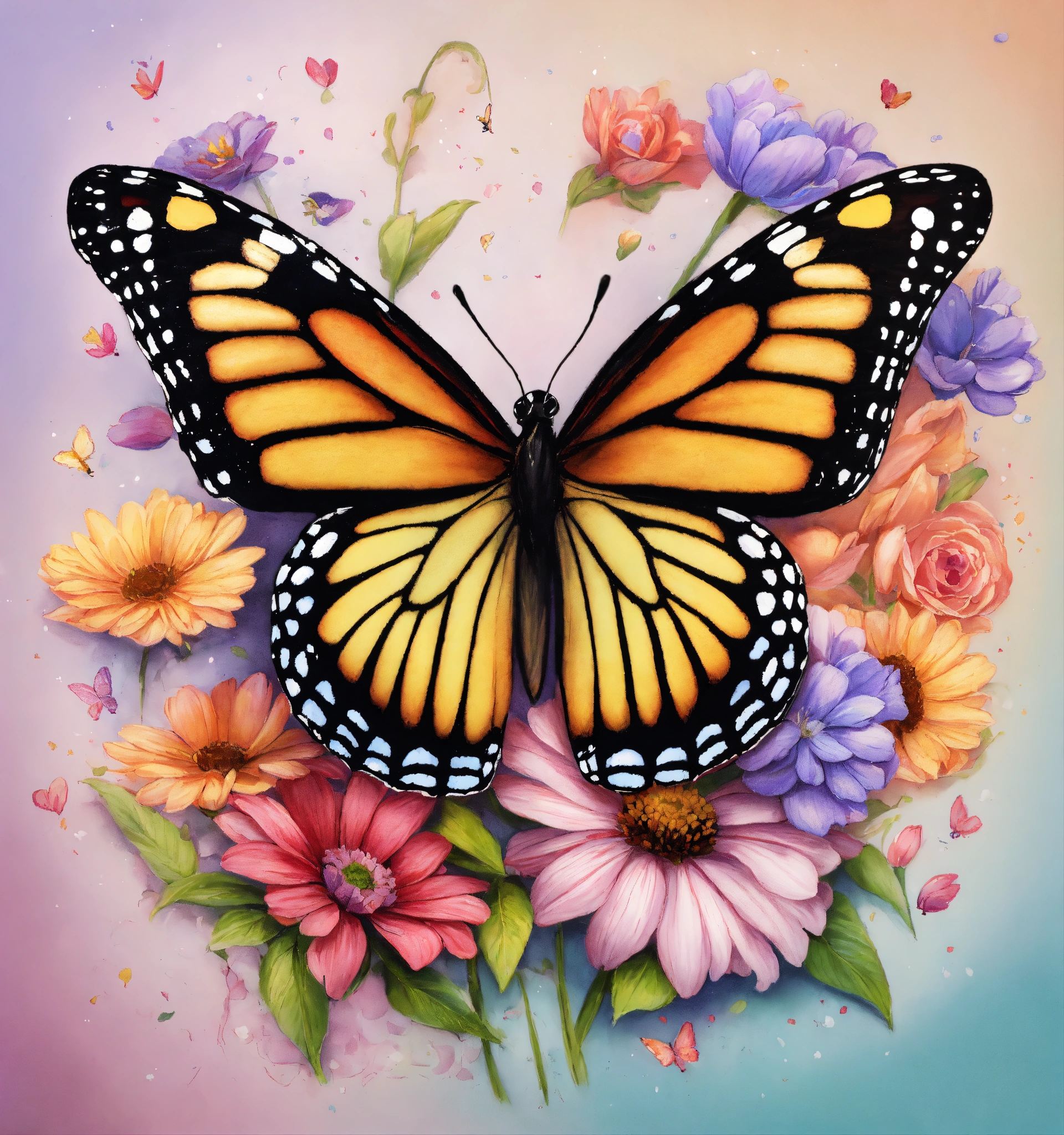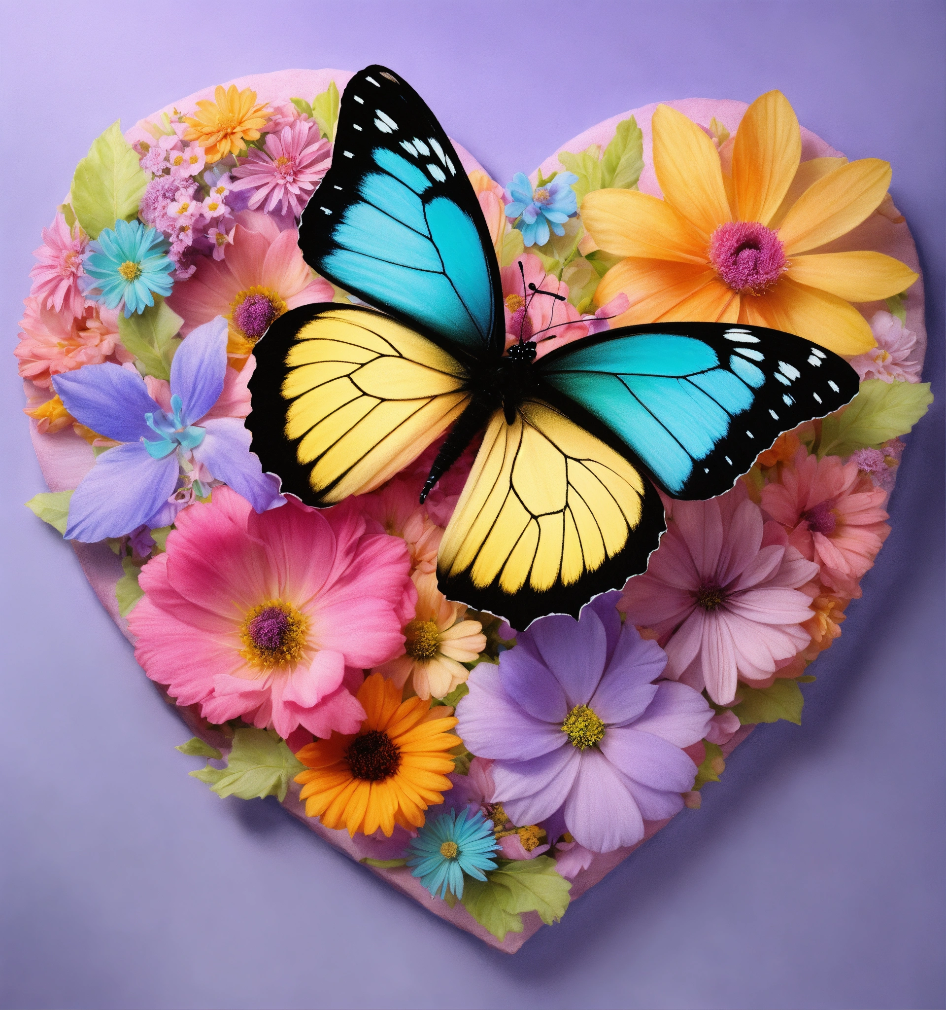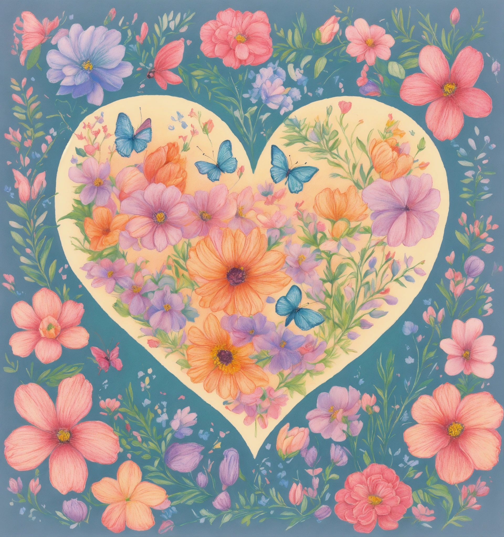 Un cœur en dessin entouré par des fleurs et papillon de couleur pastel