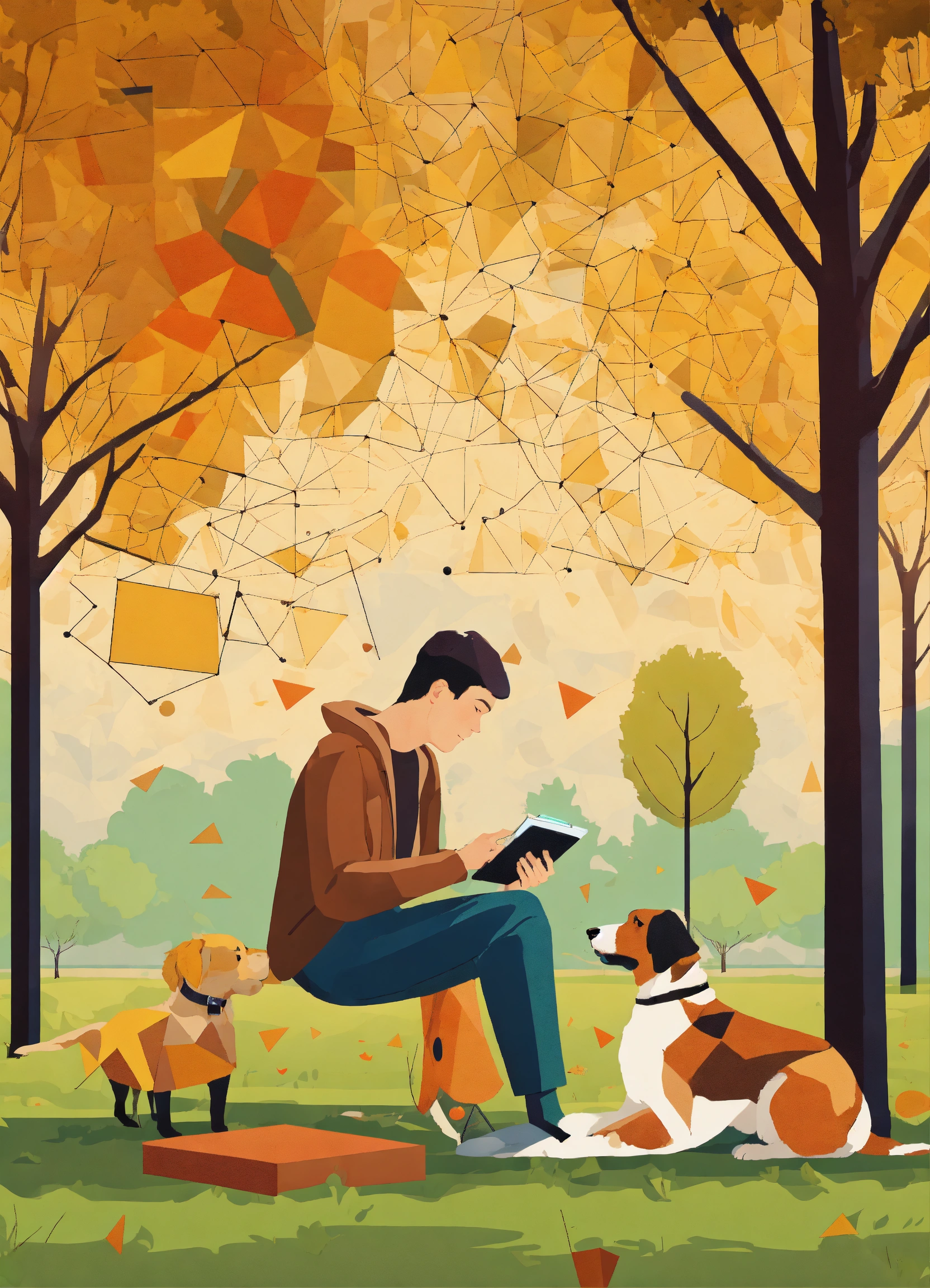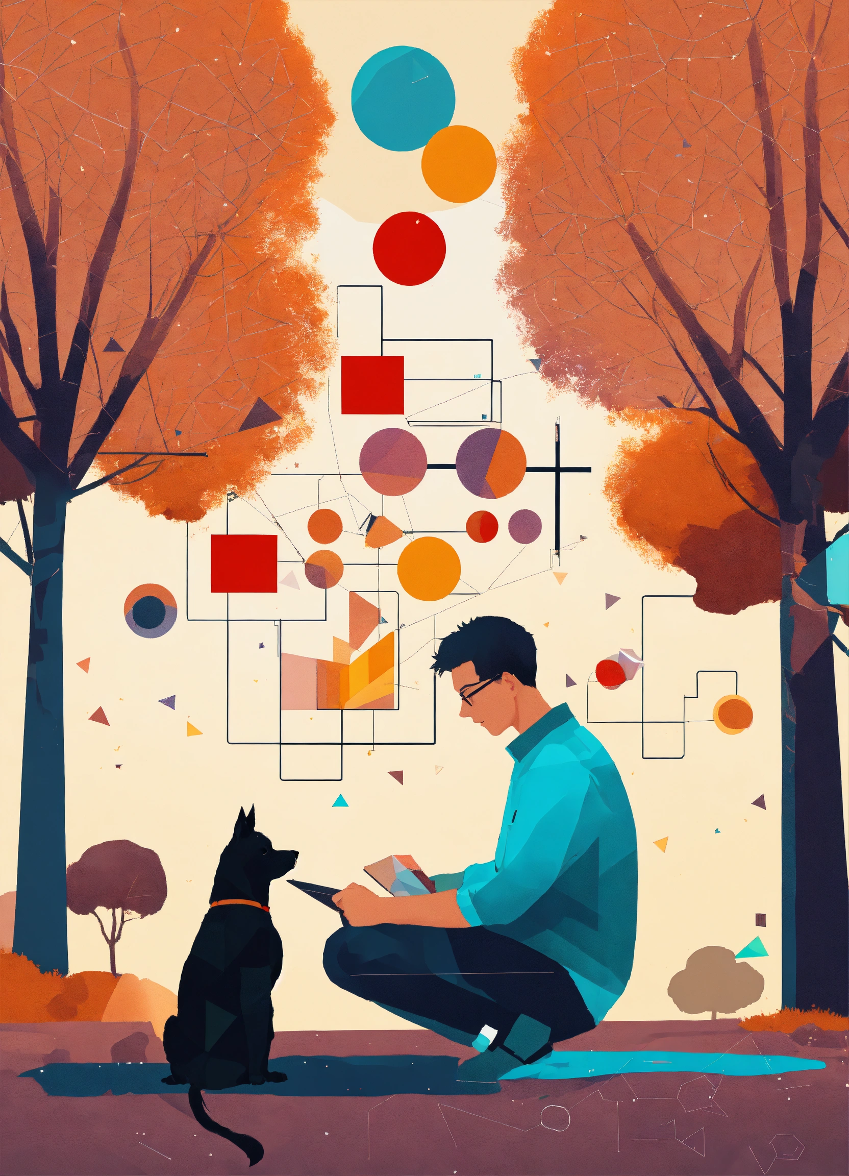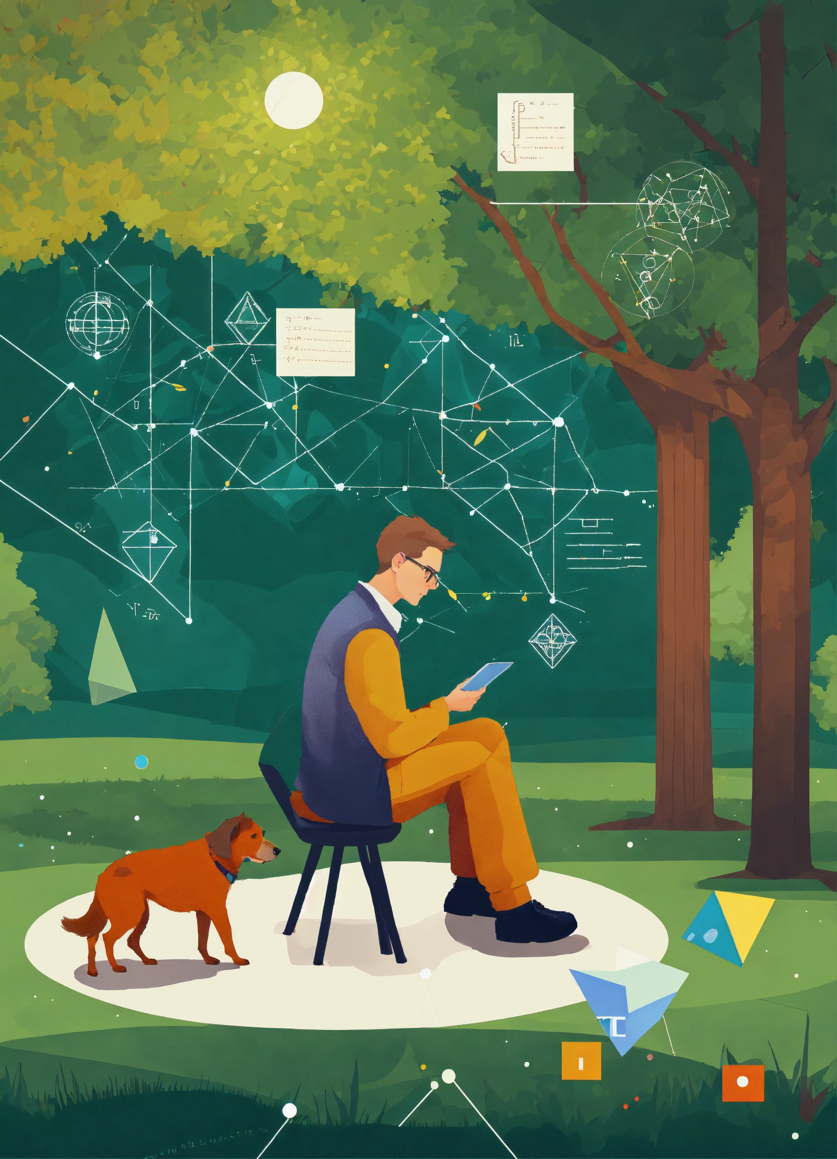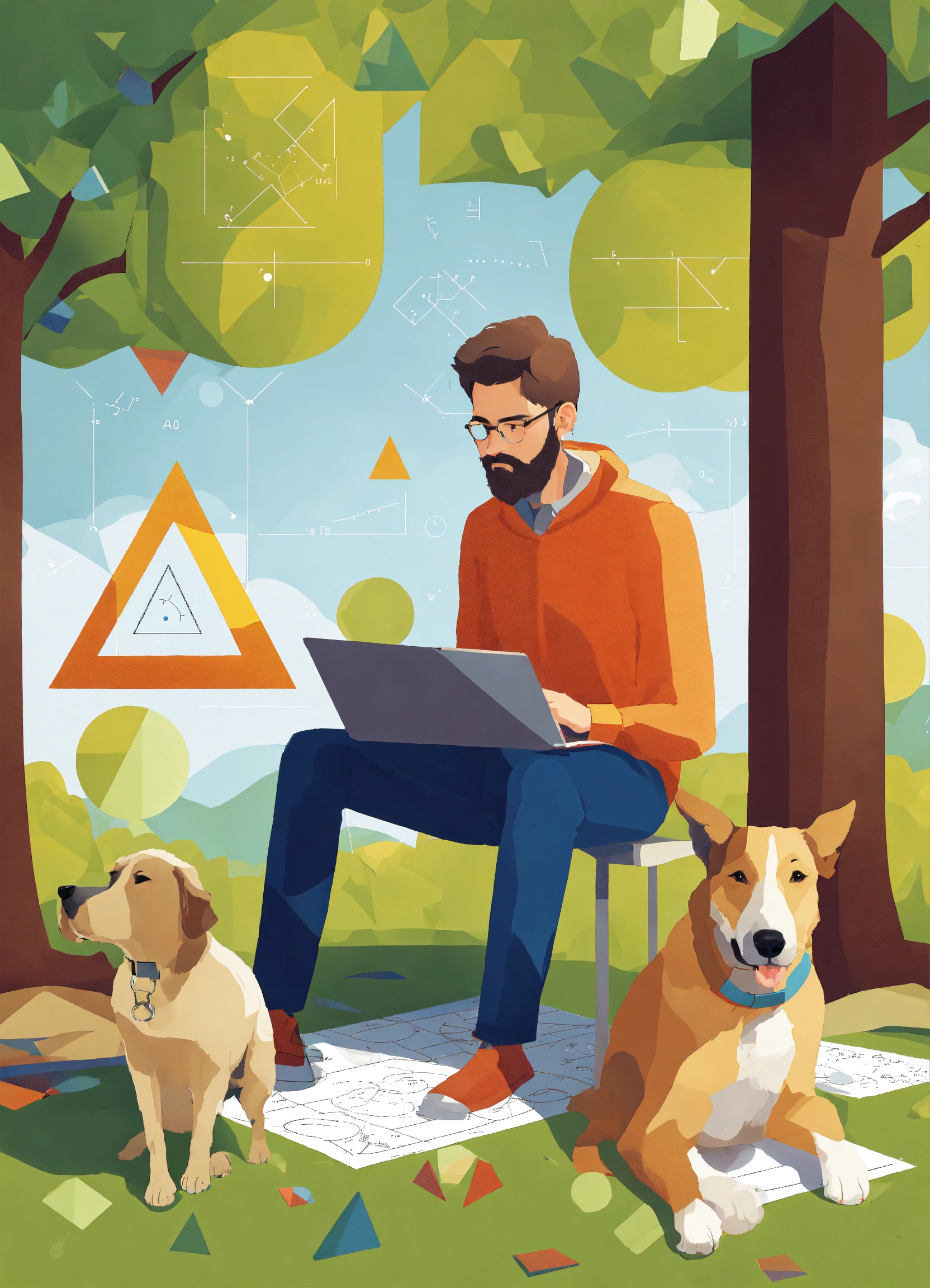 Man discovering geometric shapes like squares, triangules and circles in the world while he is sat under a tree in a park watching it, with a dog next to him. close up to the man's face. with mathematical formulas floating in the background. vector image.