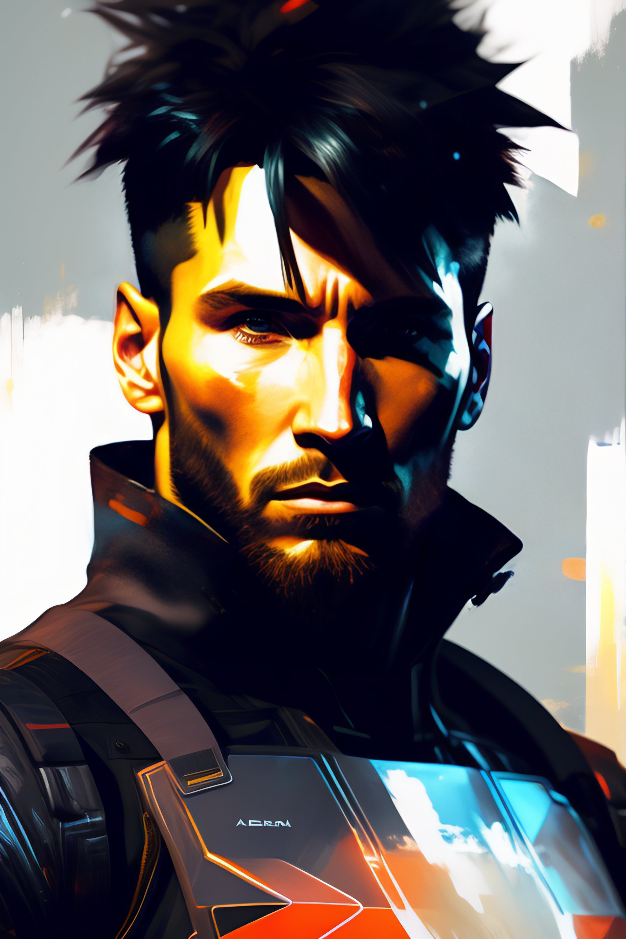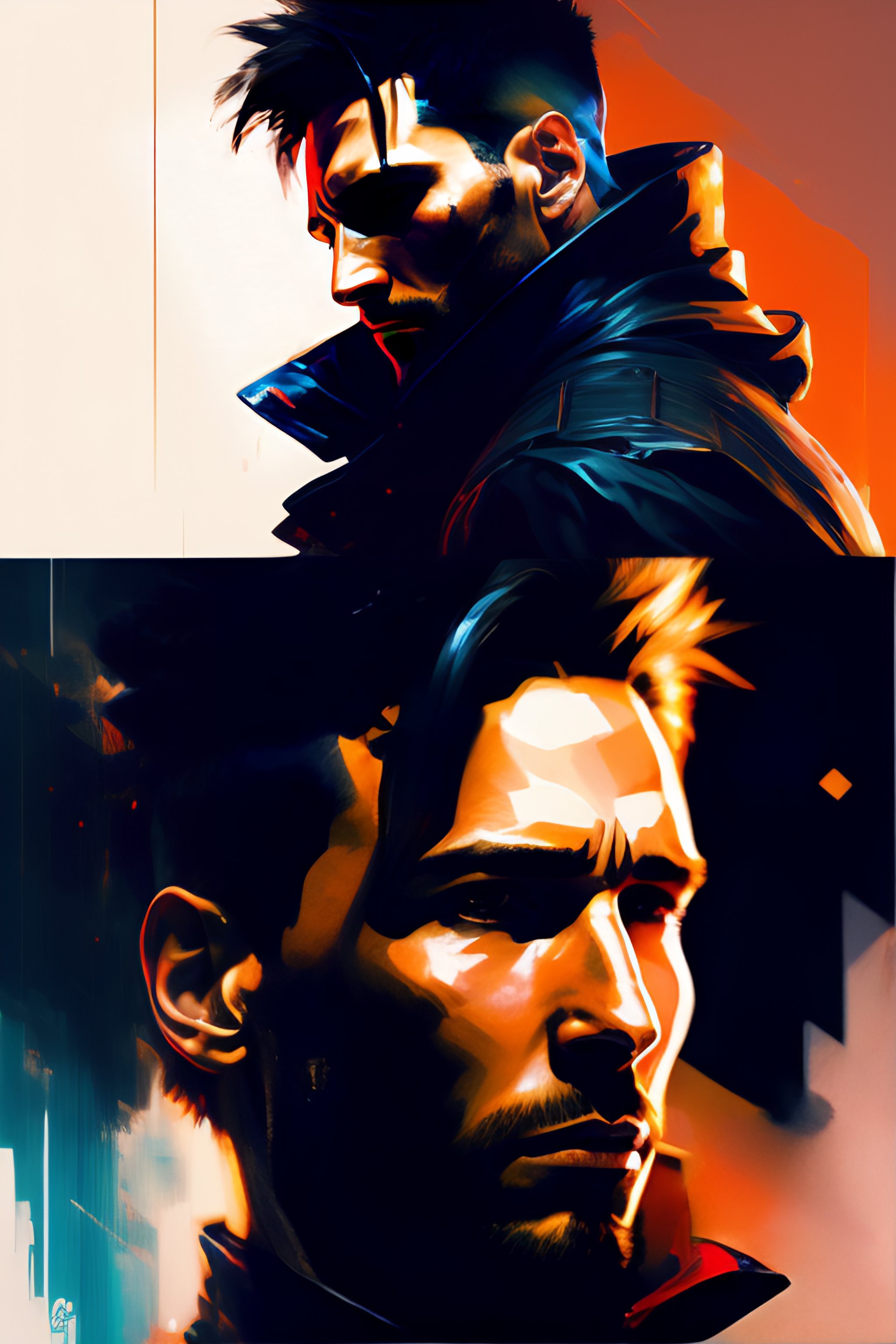 Lionel messi wearing metal gear armor holding gun dramatic lighting art by brandon anschultz by yoji shinkawa by richard schmid by greg rutkowski by sandra chevrier by jeremy lipking cinematic dramatic brush strokes background