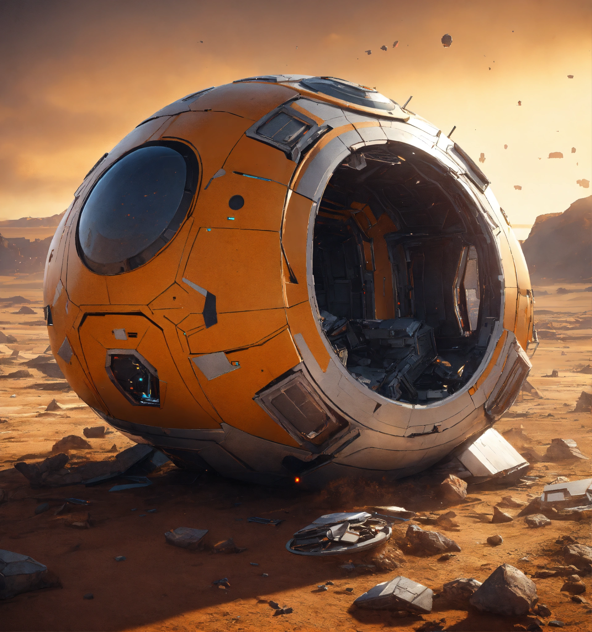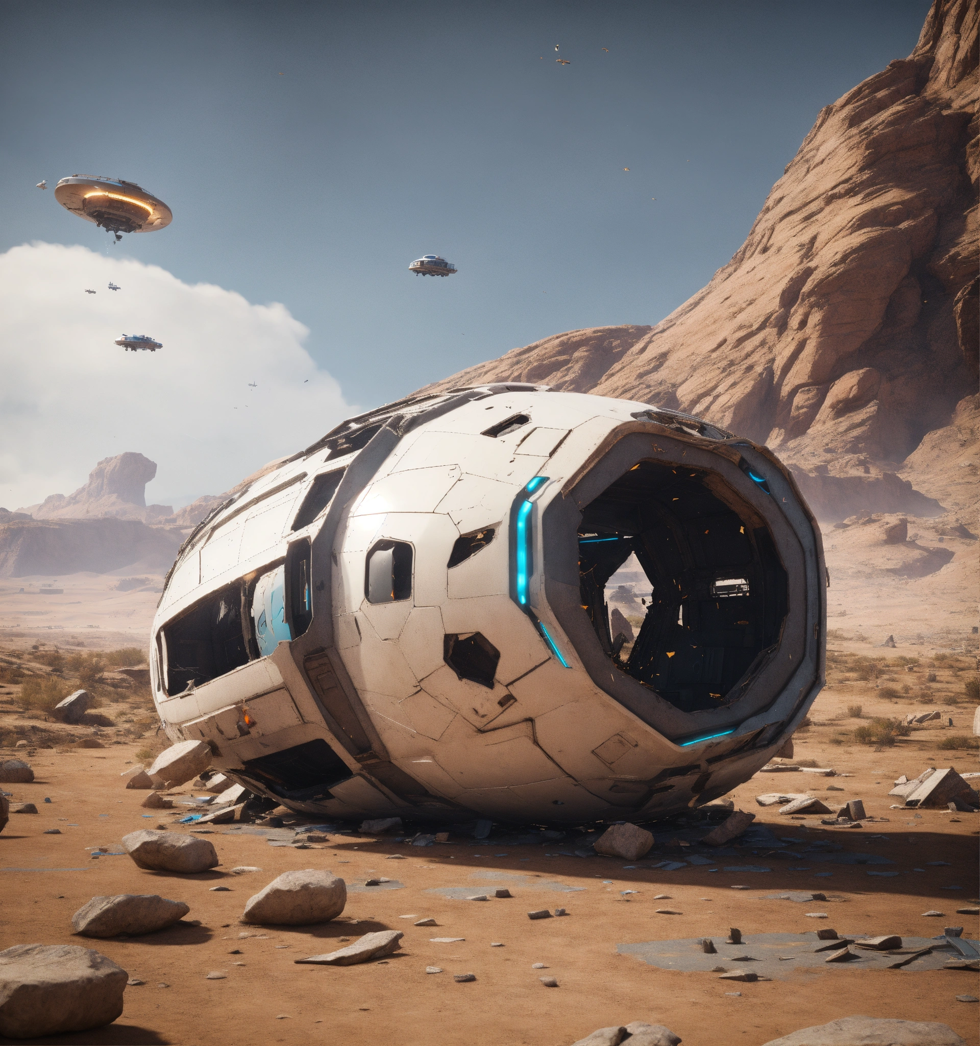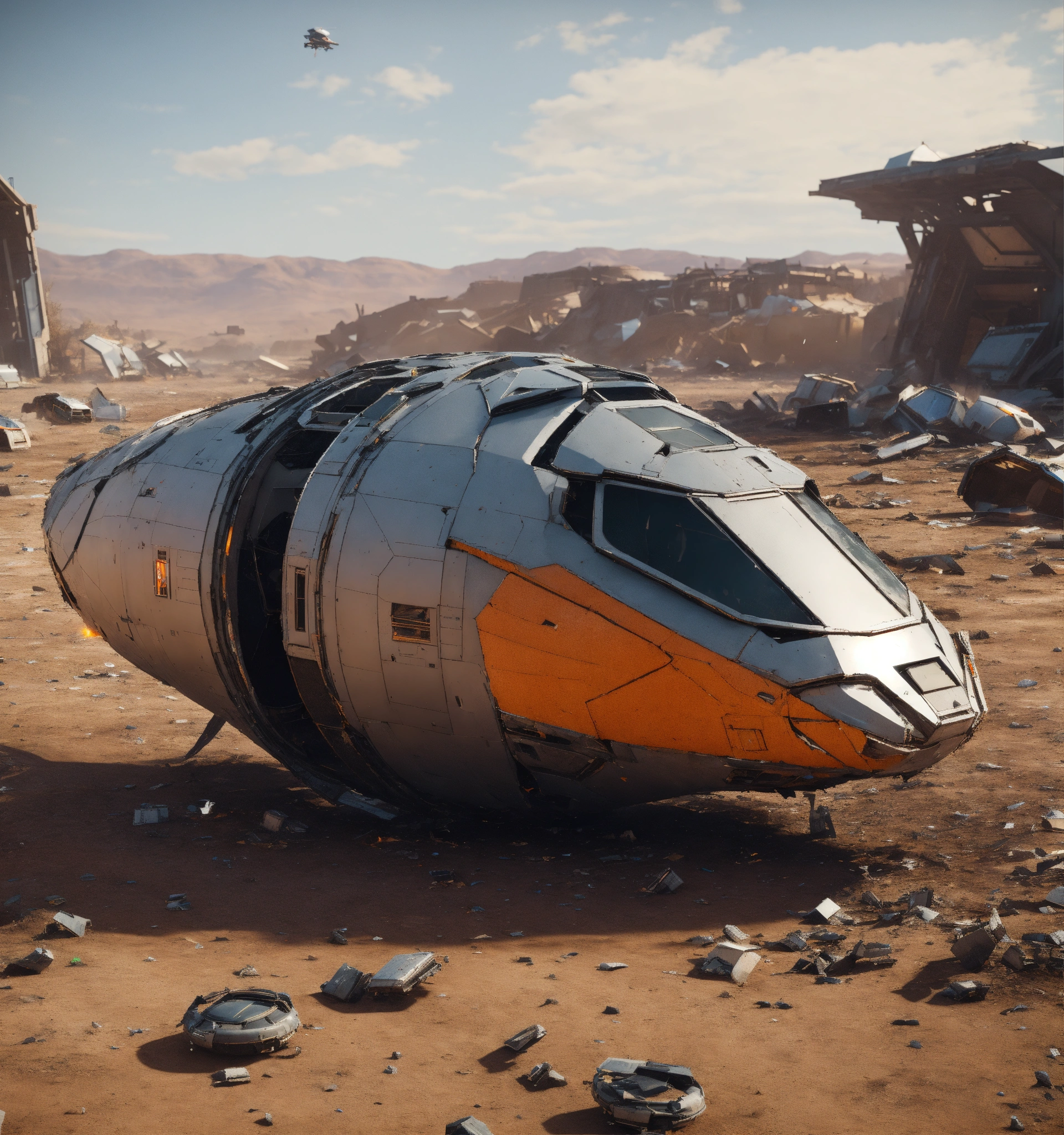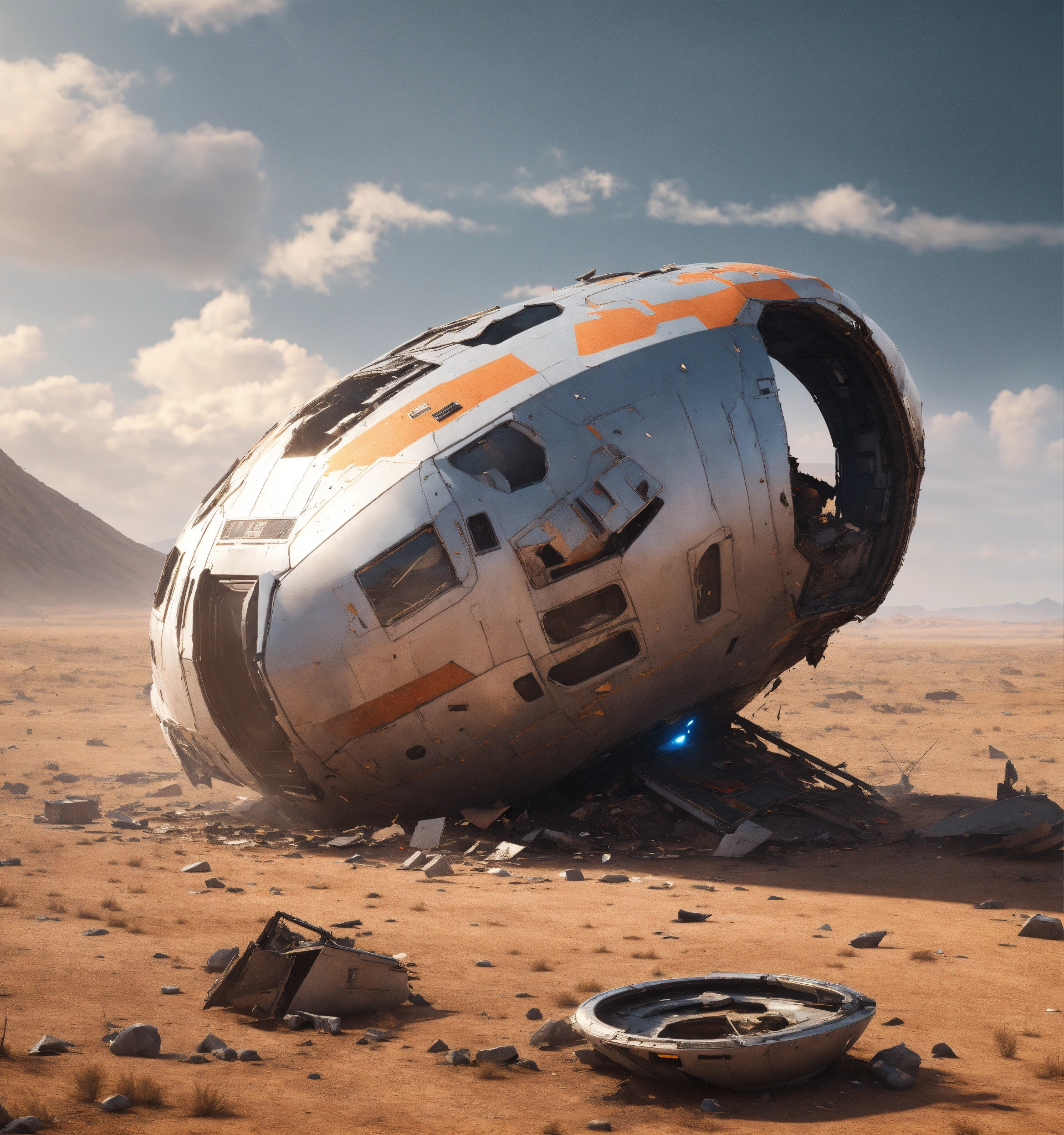 A sleek futuristic seamless evacuation pod crashed and smashed into pieces in the middle of a wasteland, realistic, futuristic, sci-fi, 8k, unreal engine, pixar