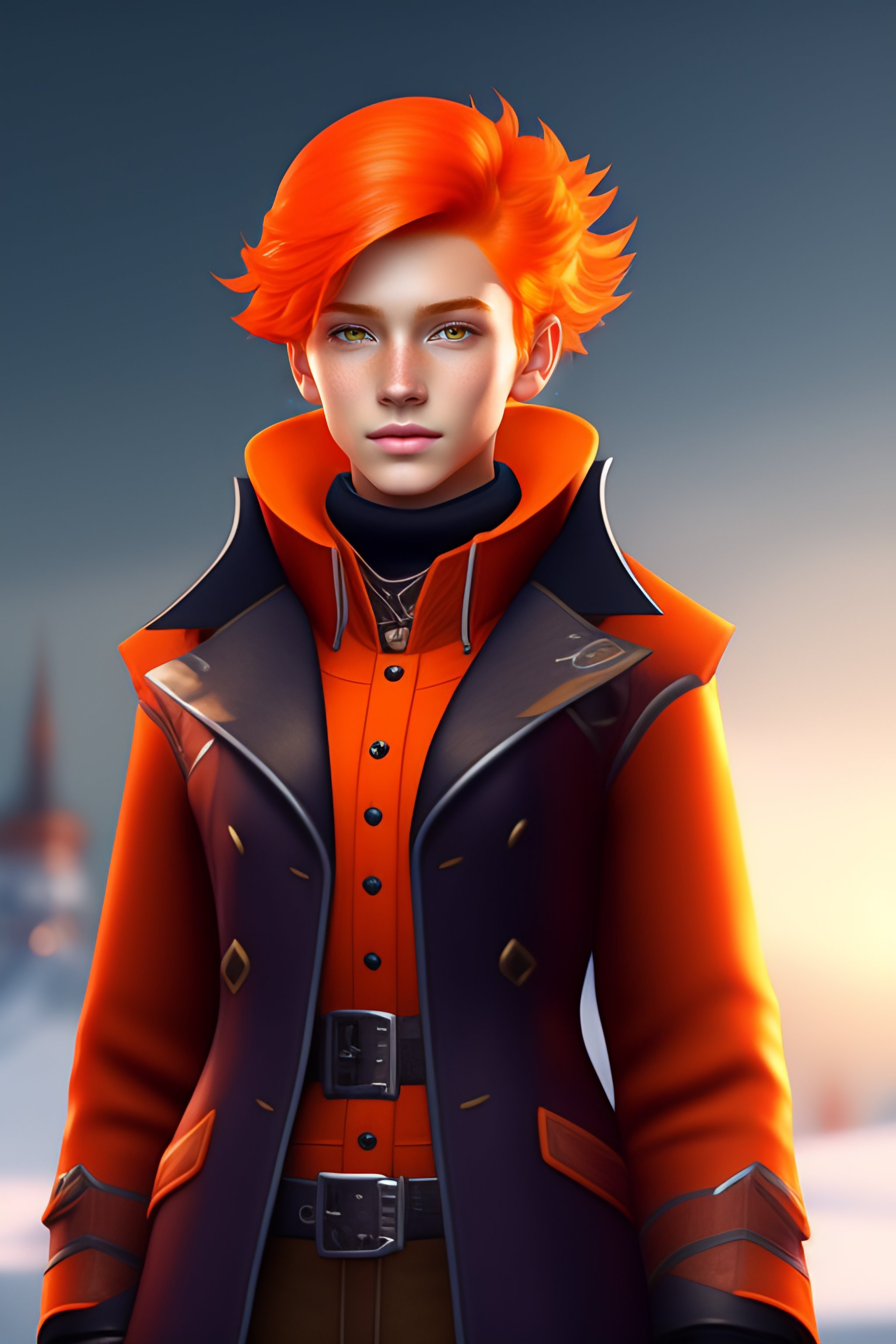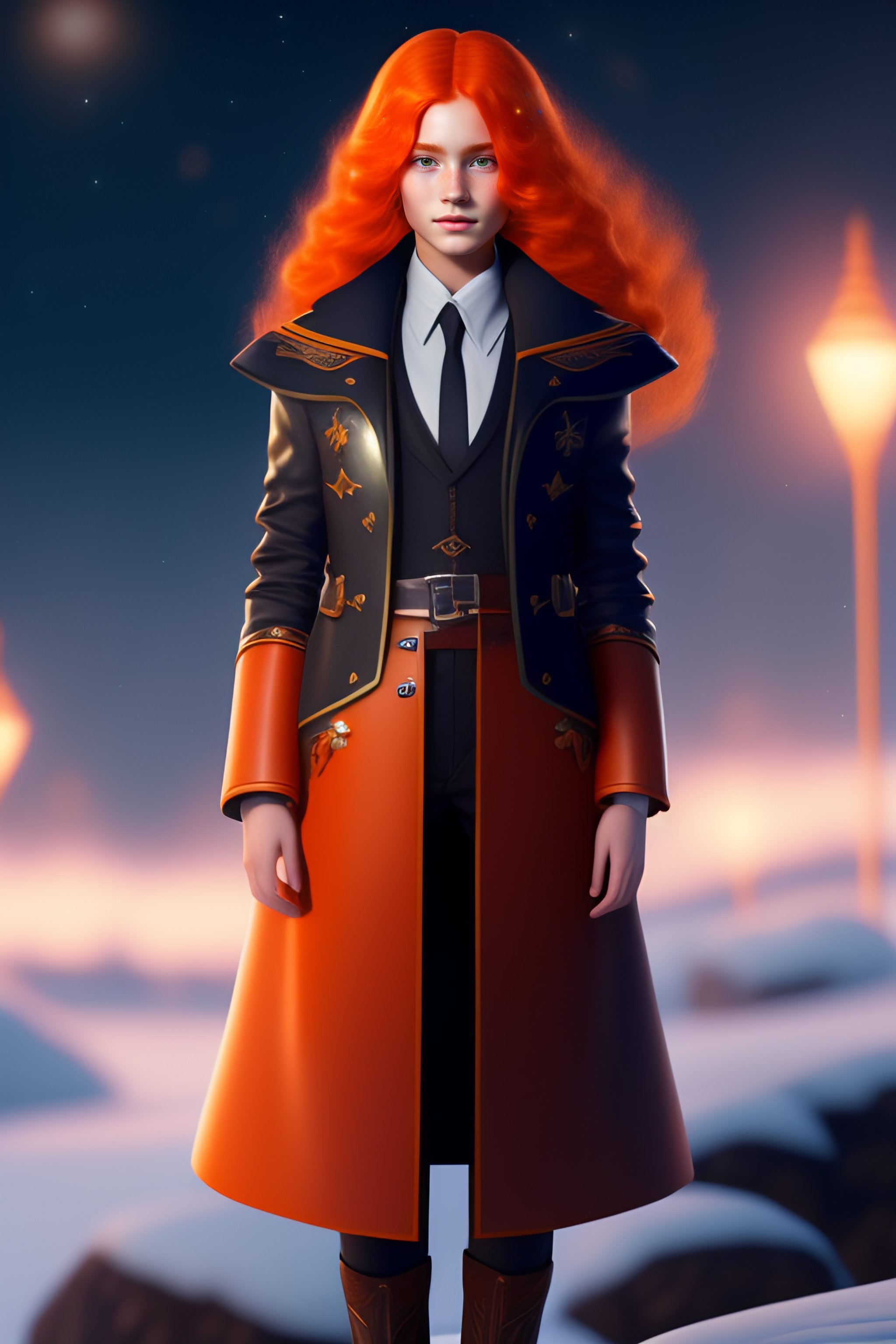 Beautiful androgynous man, cute-fine-face, pretty face, realistic shaded perfect face, twelve year old boy. girly ranger. orange hair, long hair. unreal engine. long coat, blizzard, night, illuminate by moon.