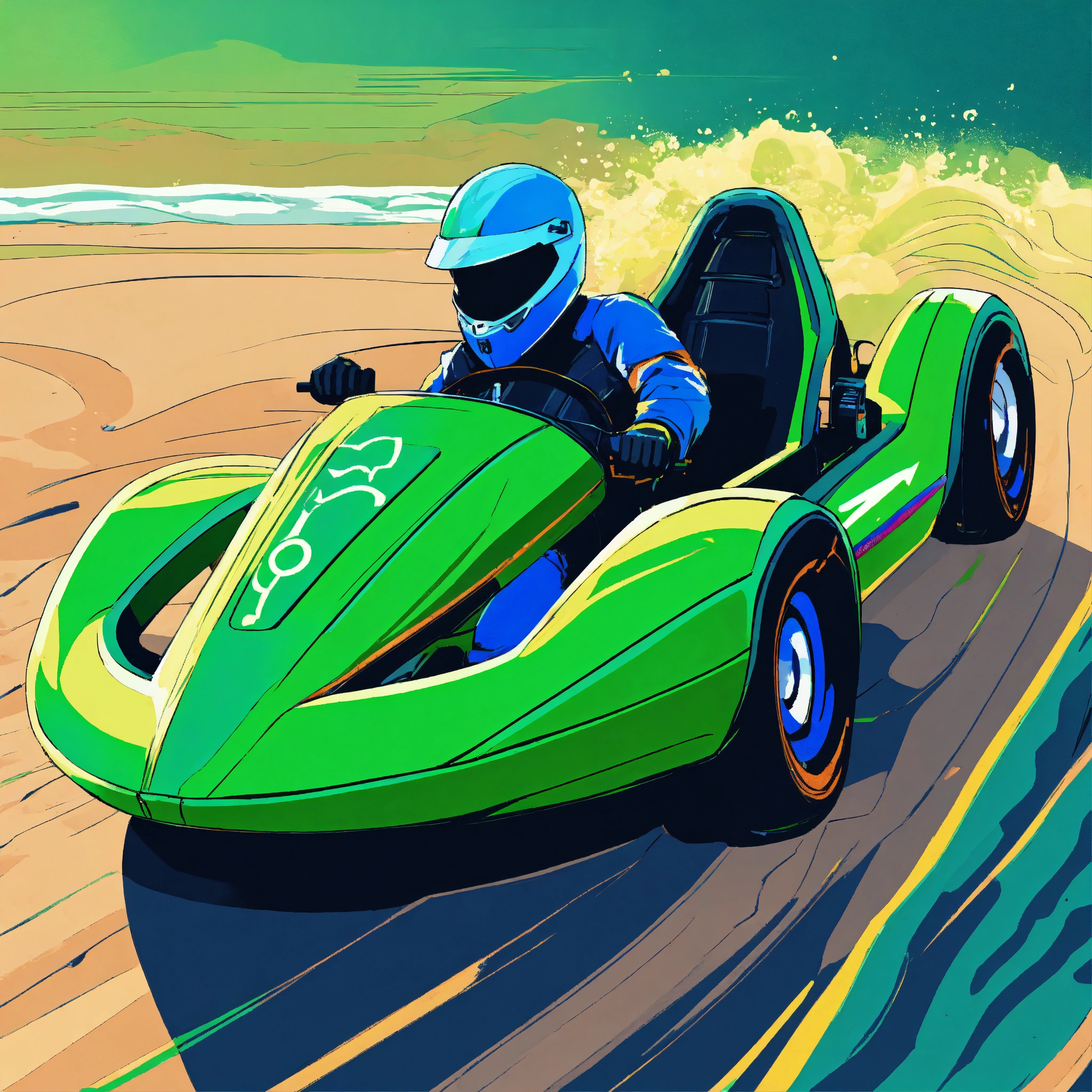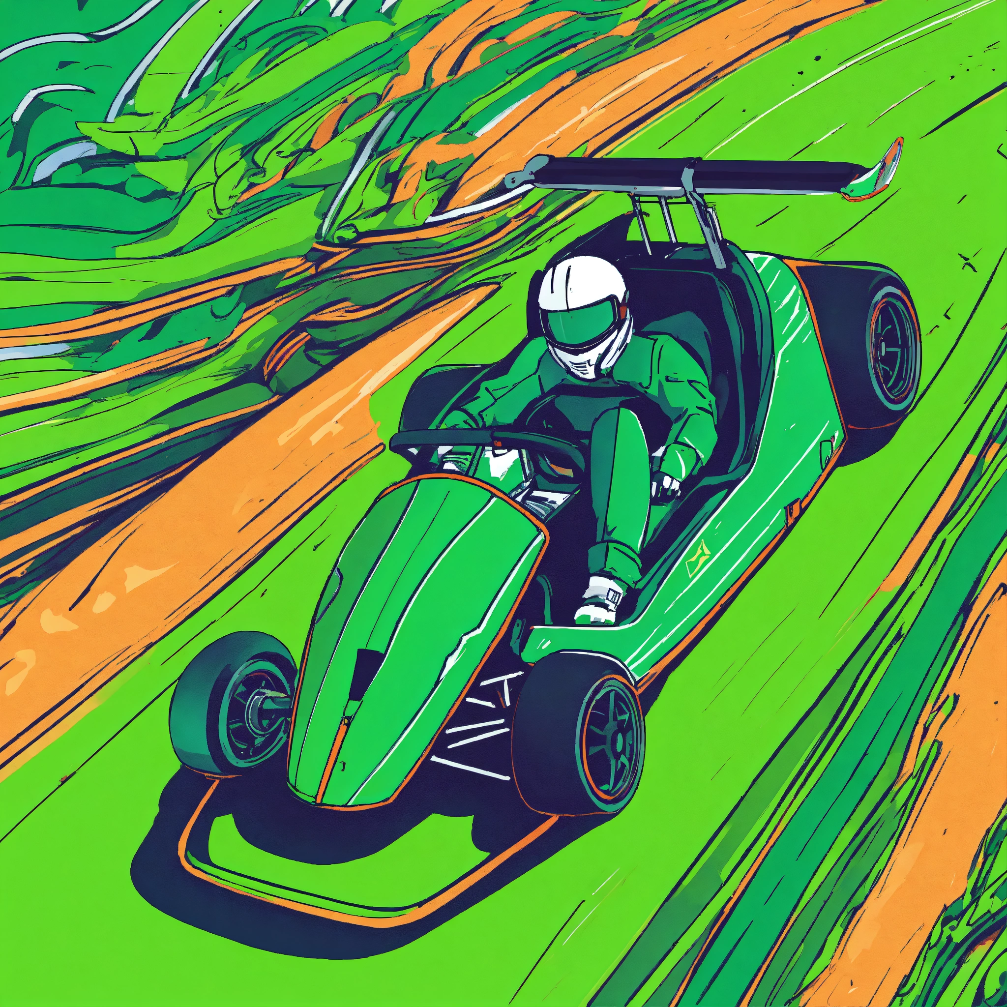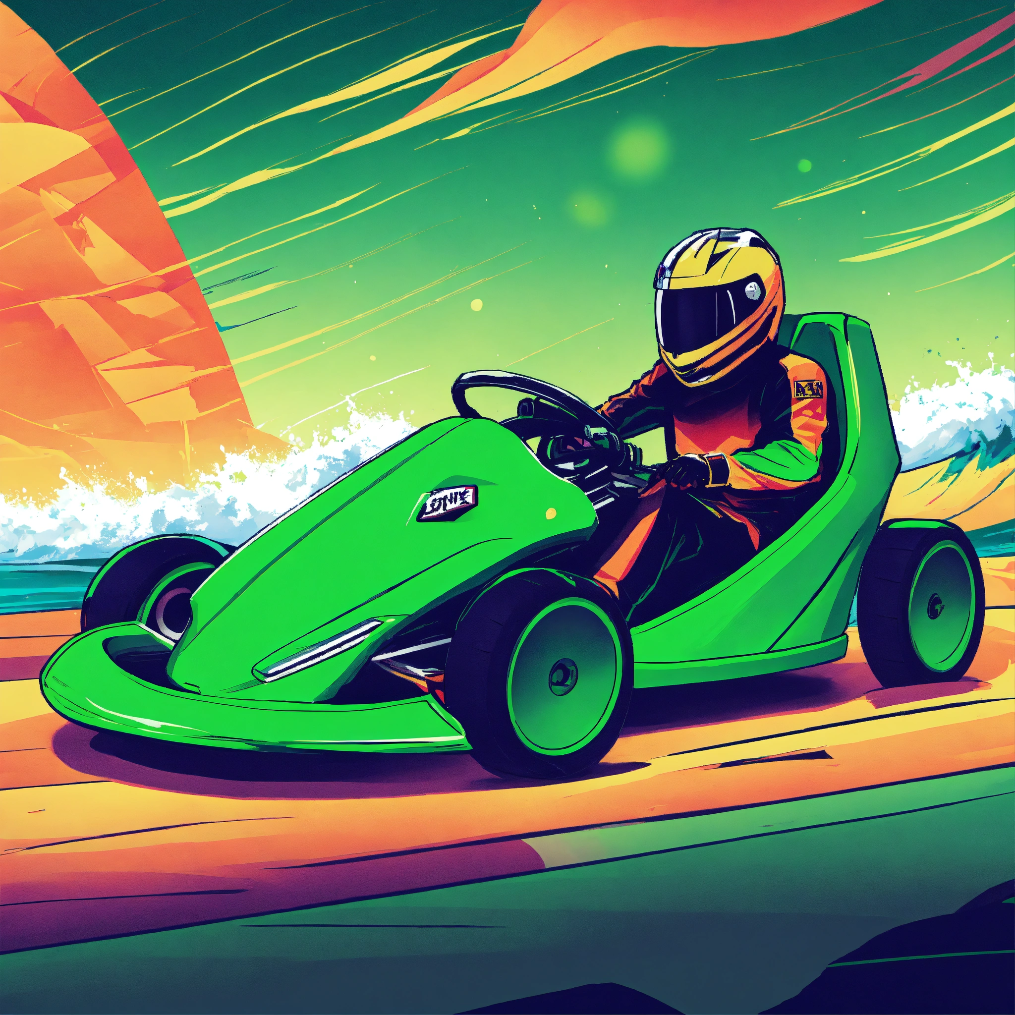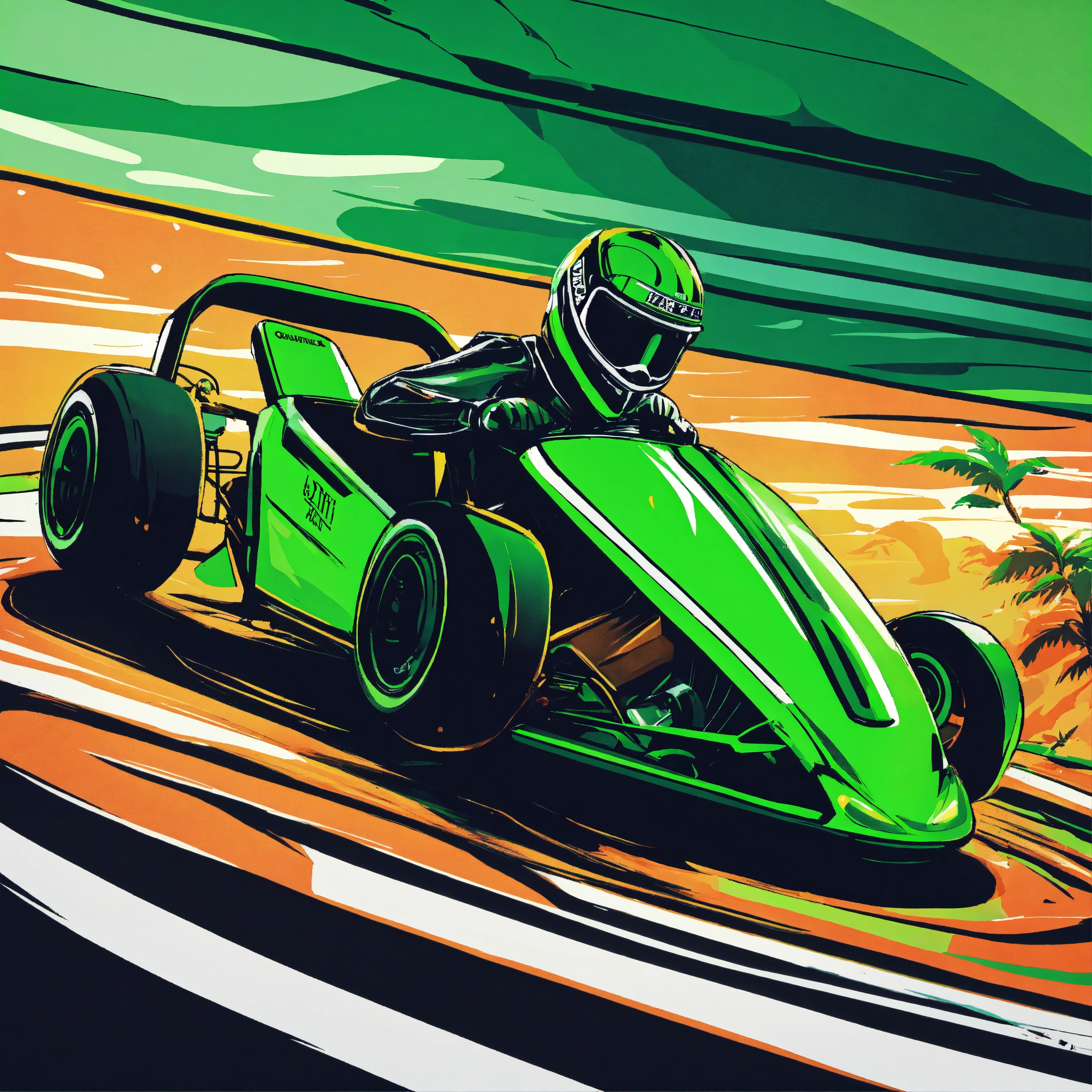 Une illustration d'un circuit de kart electrique vert avec le graphisme du surf, la couleur des karts doit etre verte