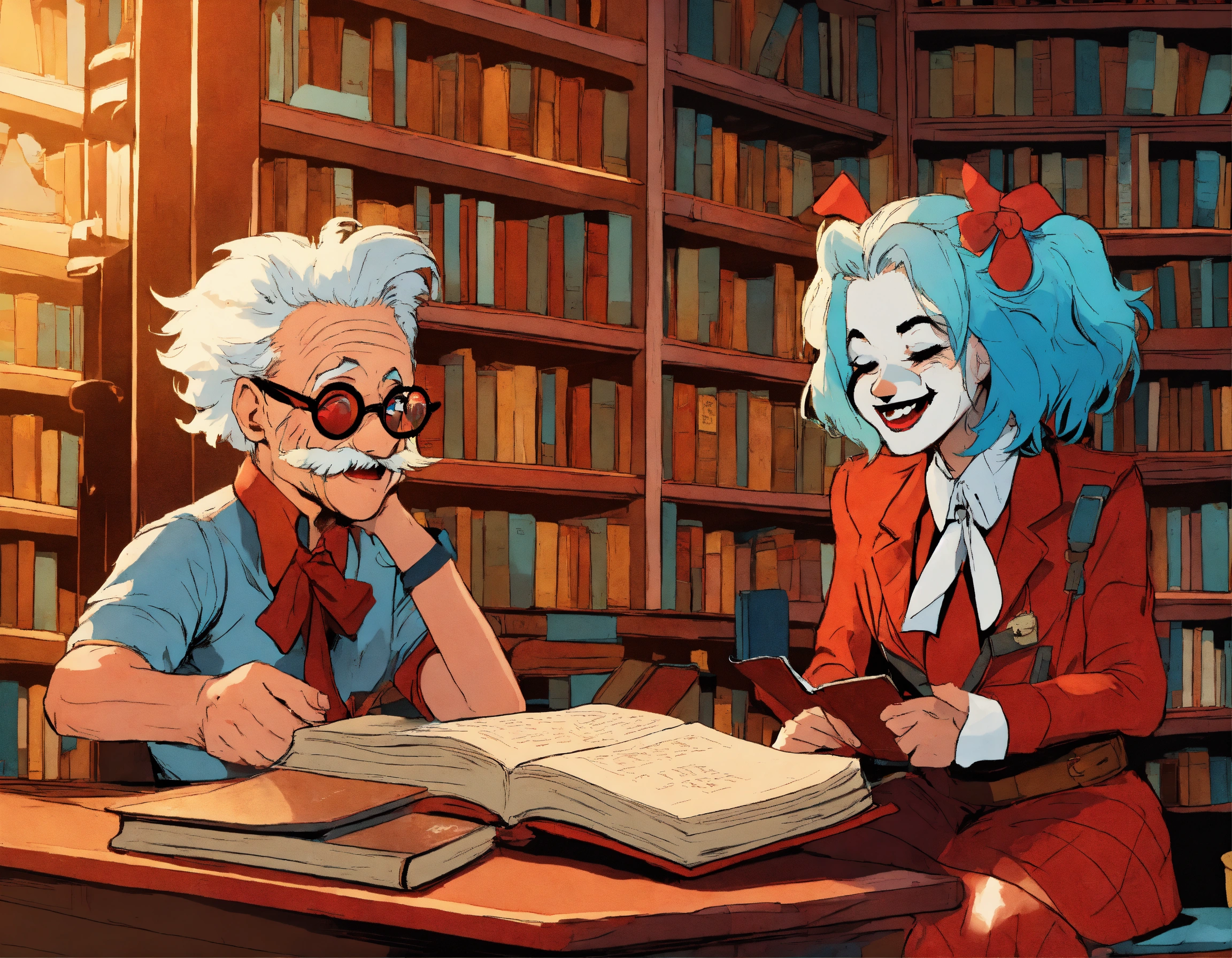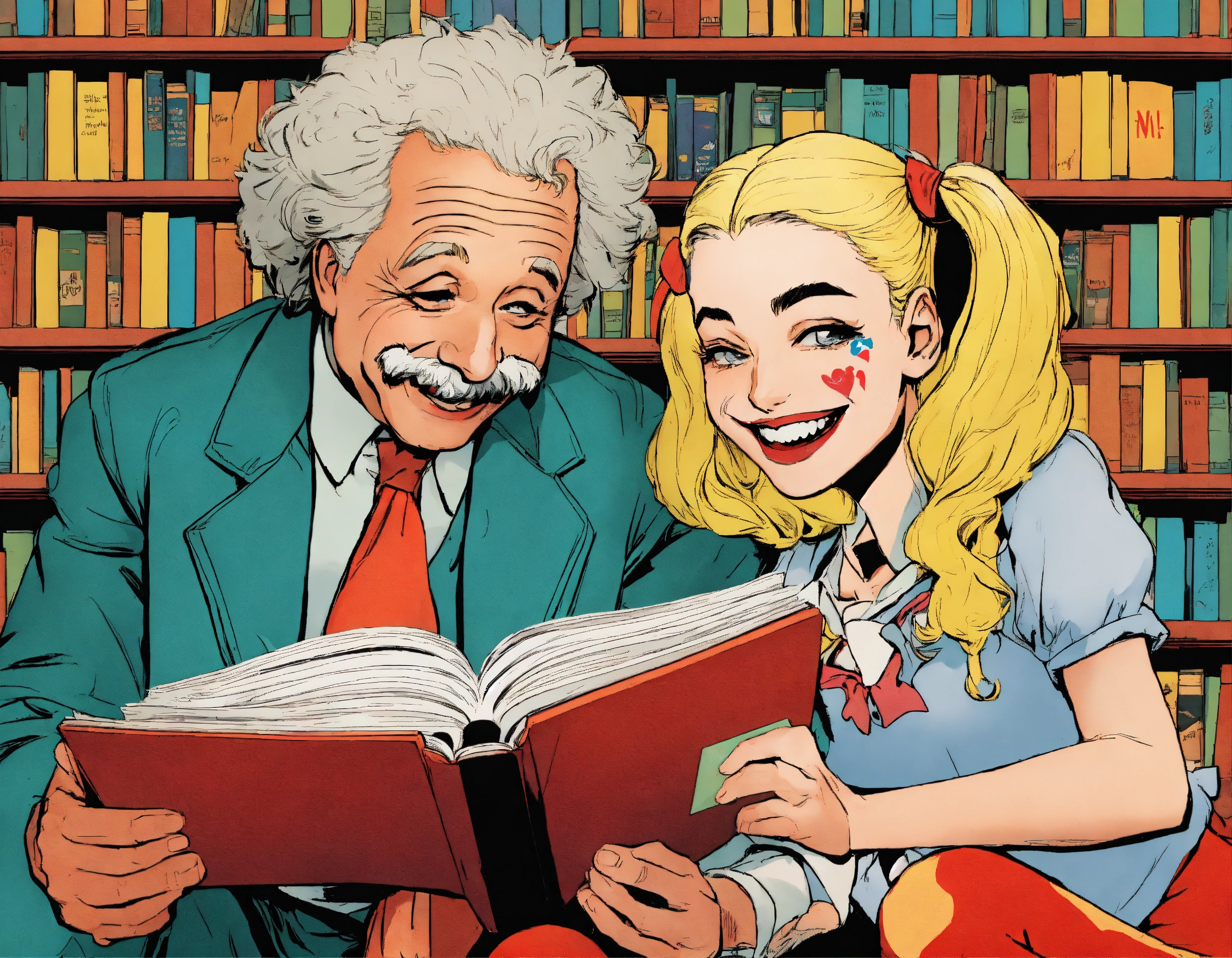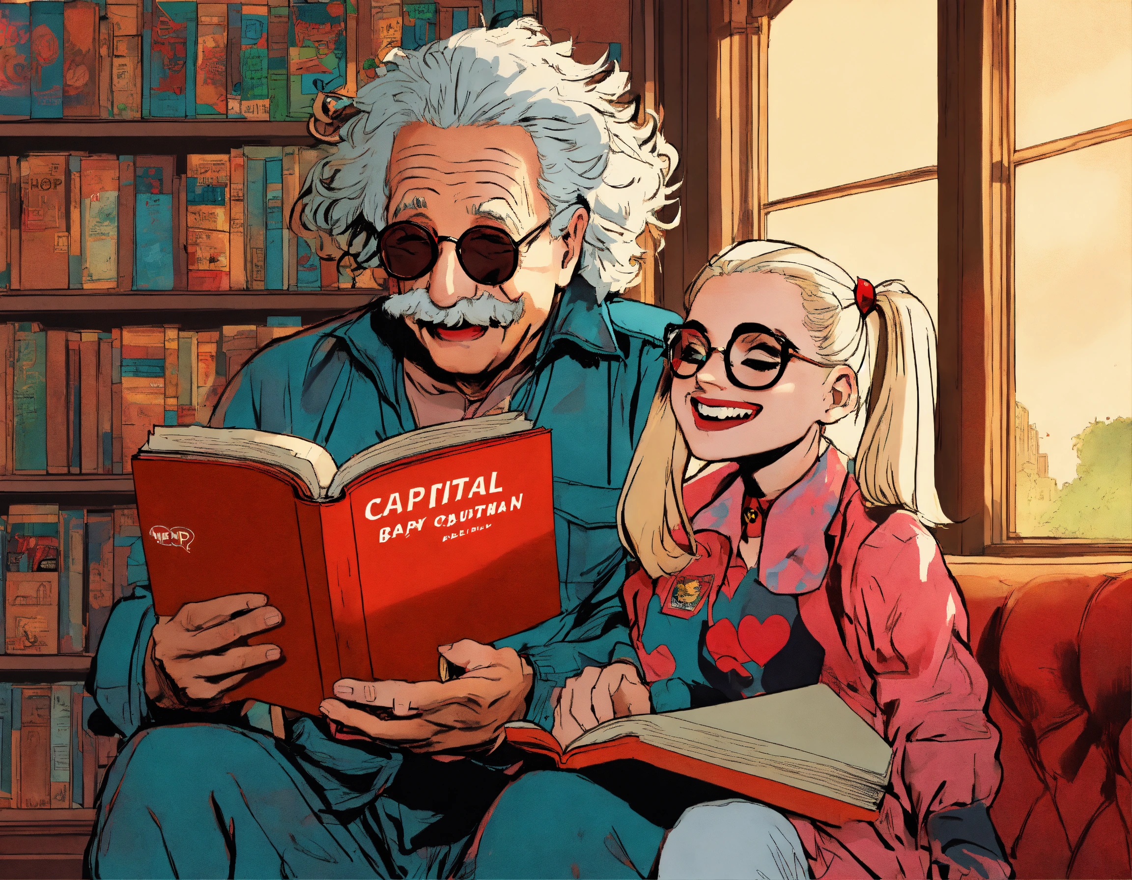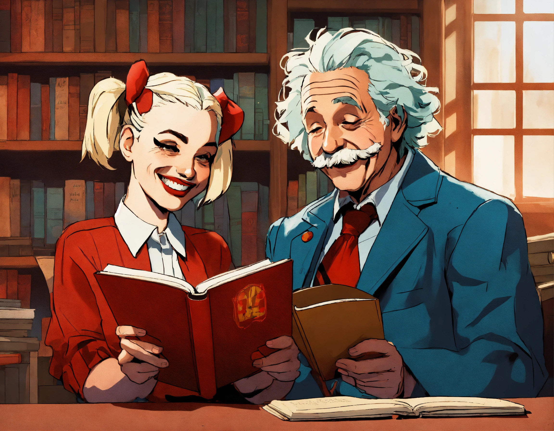 Old albert einstein and young harley quinn read a red book together in a library and laugh heartily, one book has the title "capital" written on it; pop art