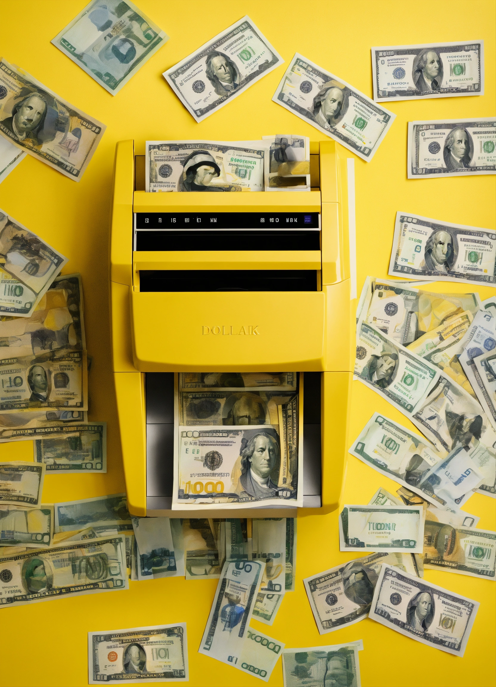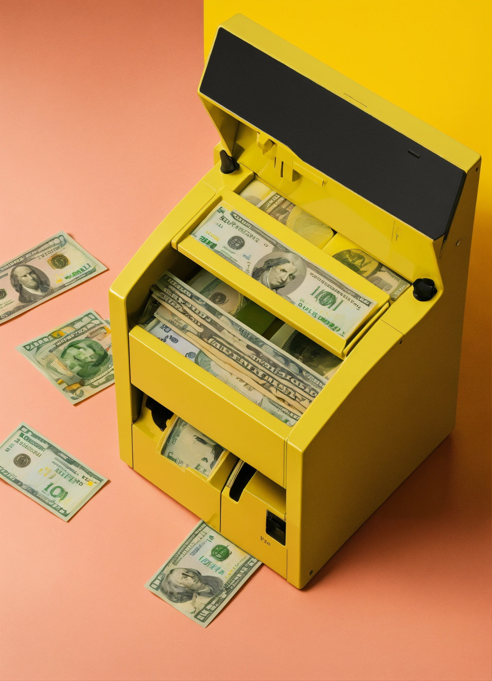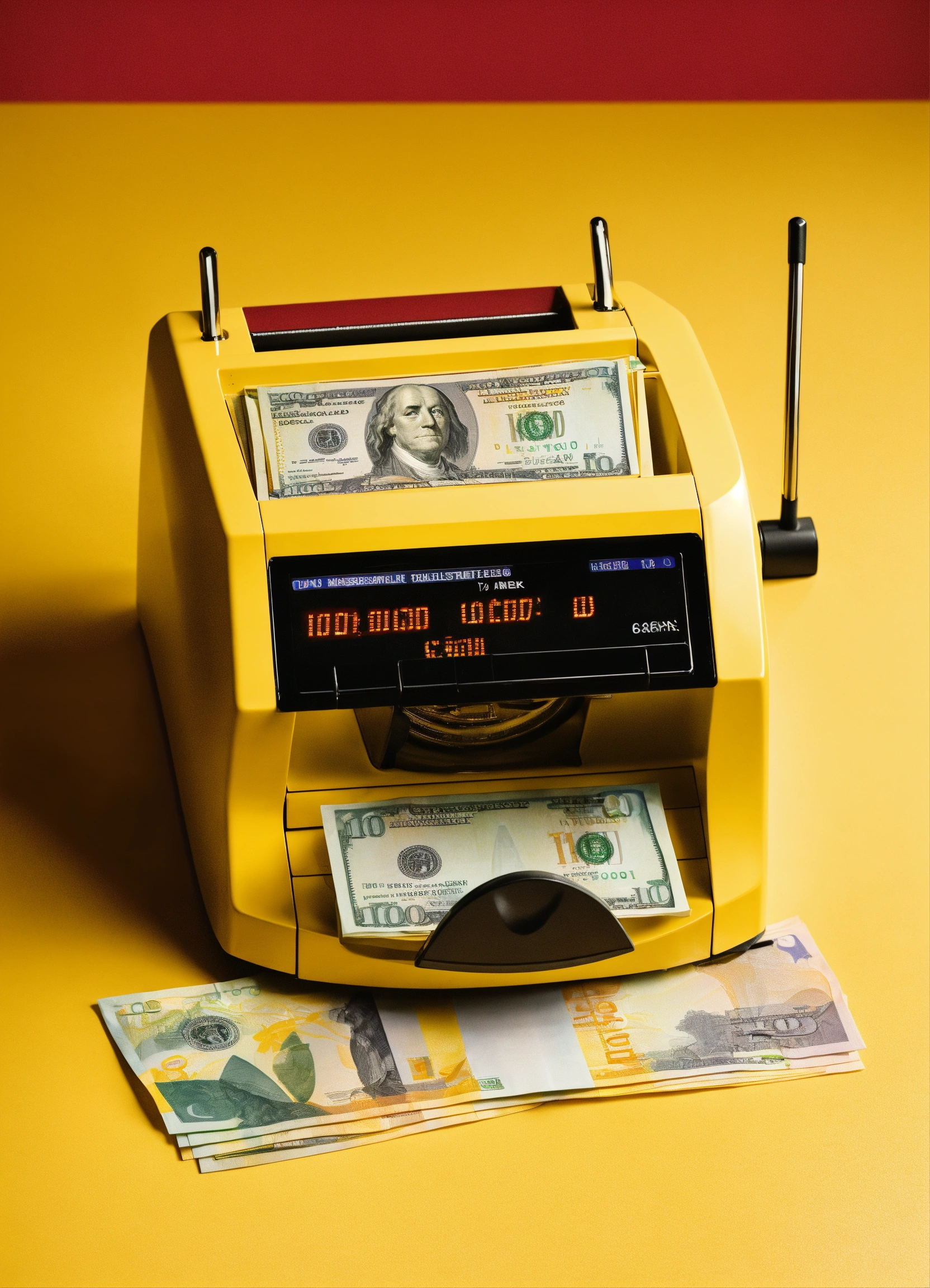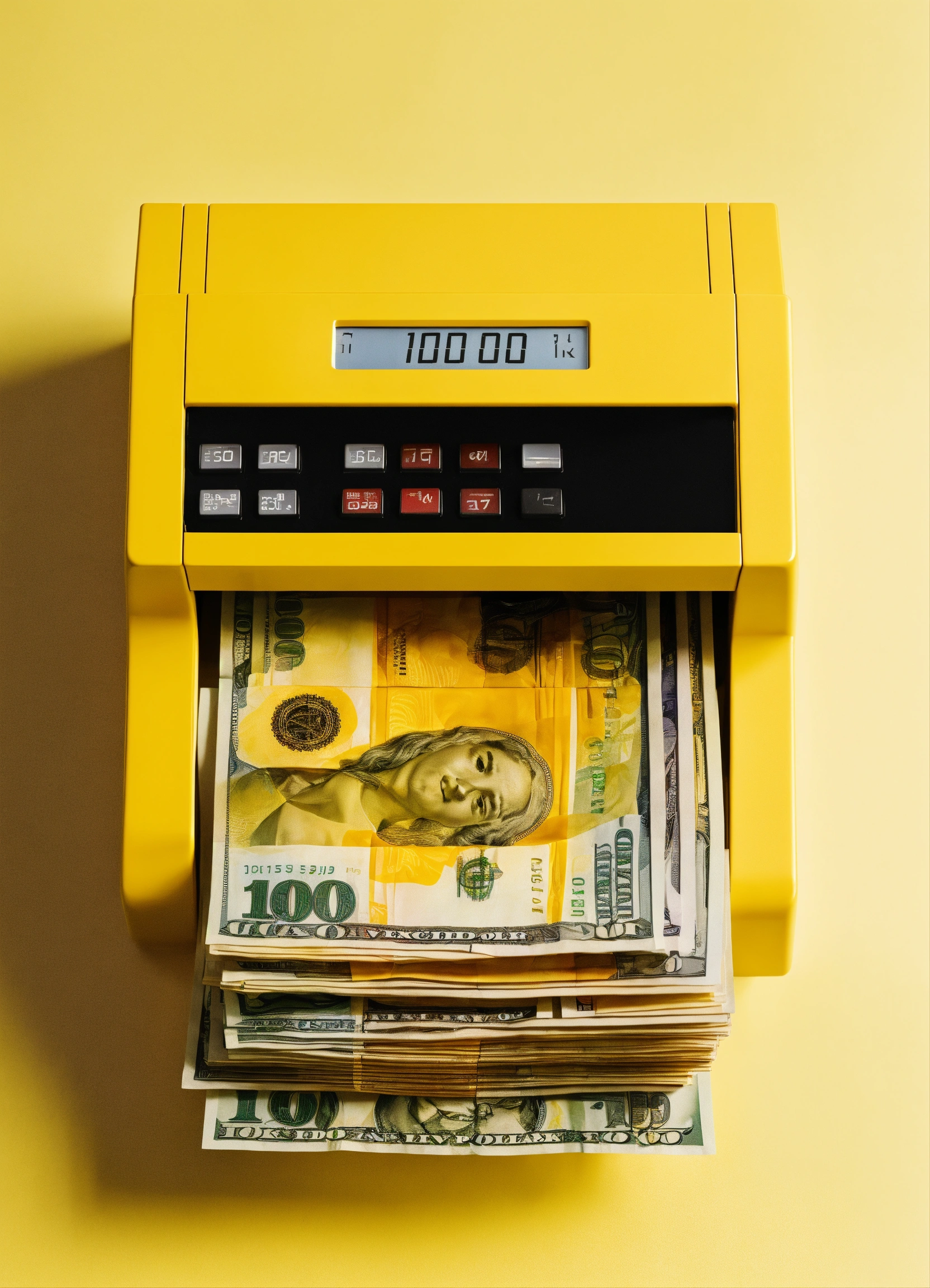 The banknote counter is on the table, from there come out us dollar, minimalist style, view from above, yellow background.
