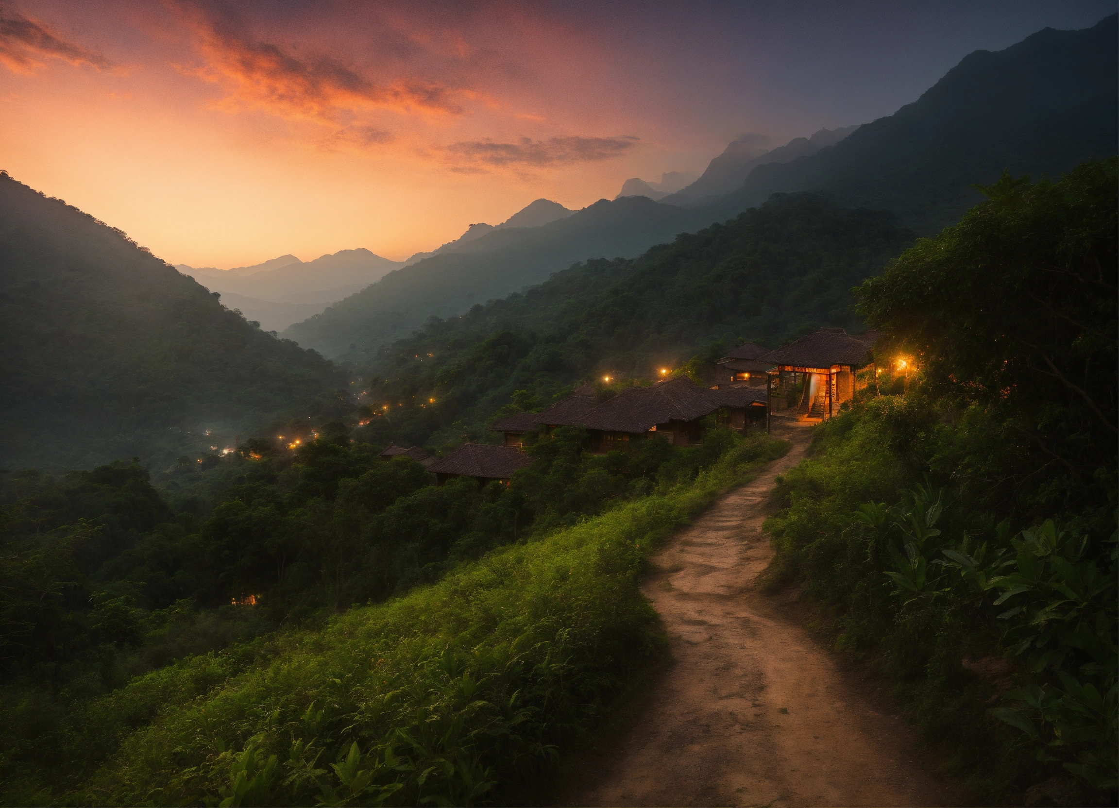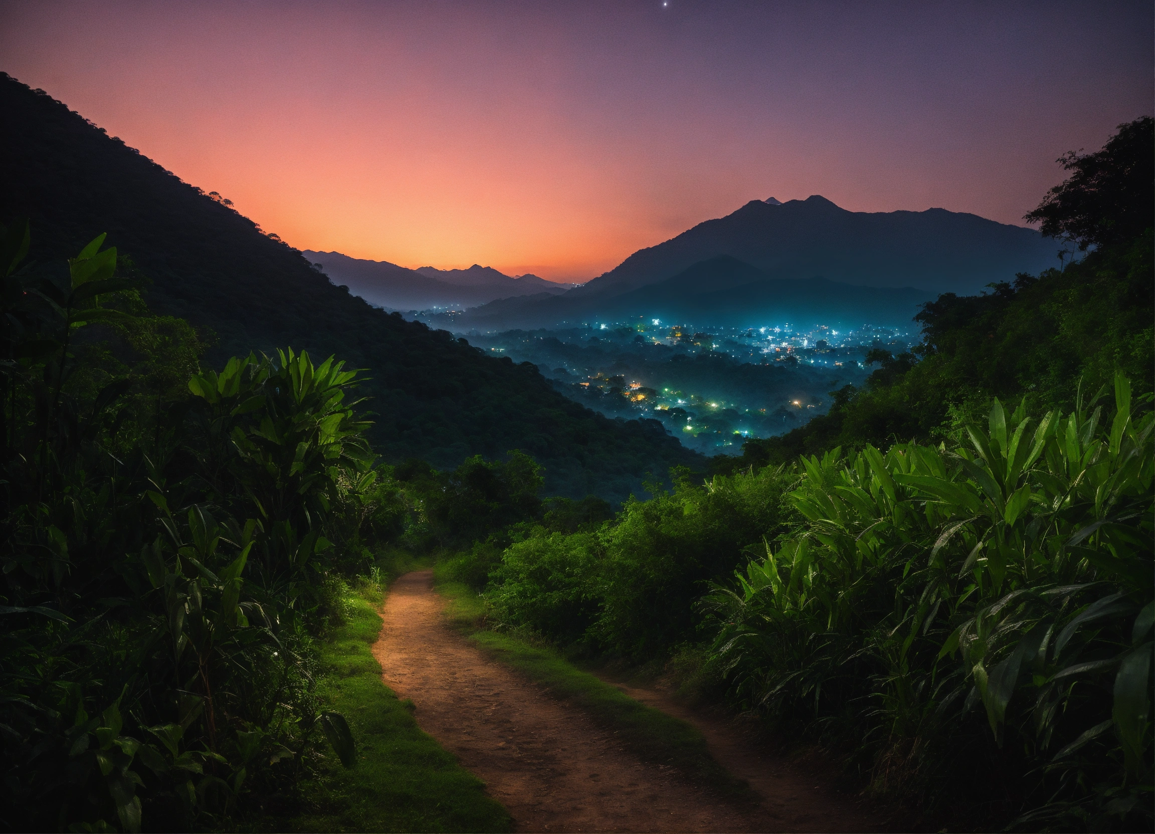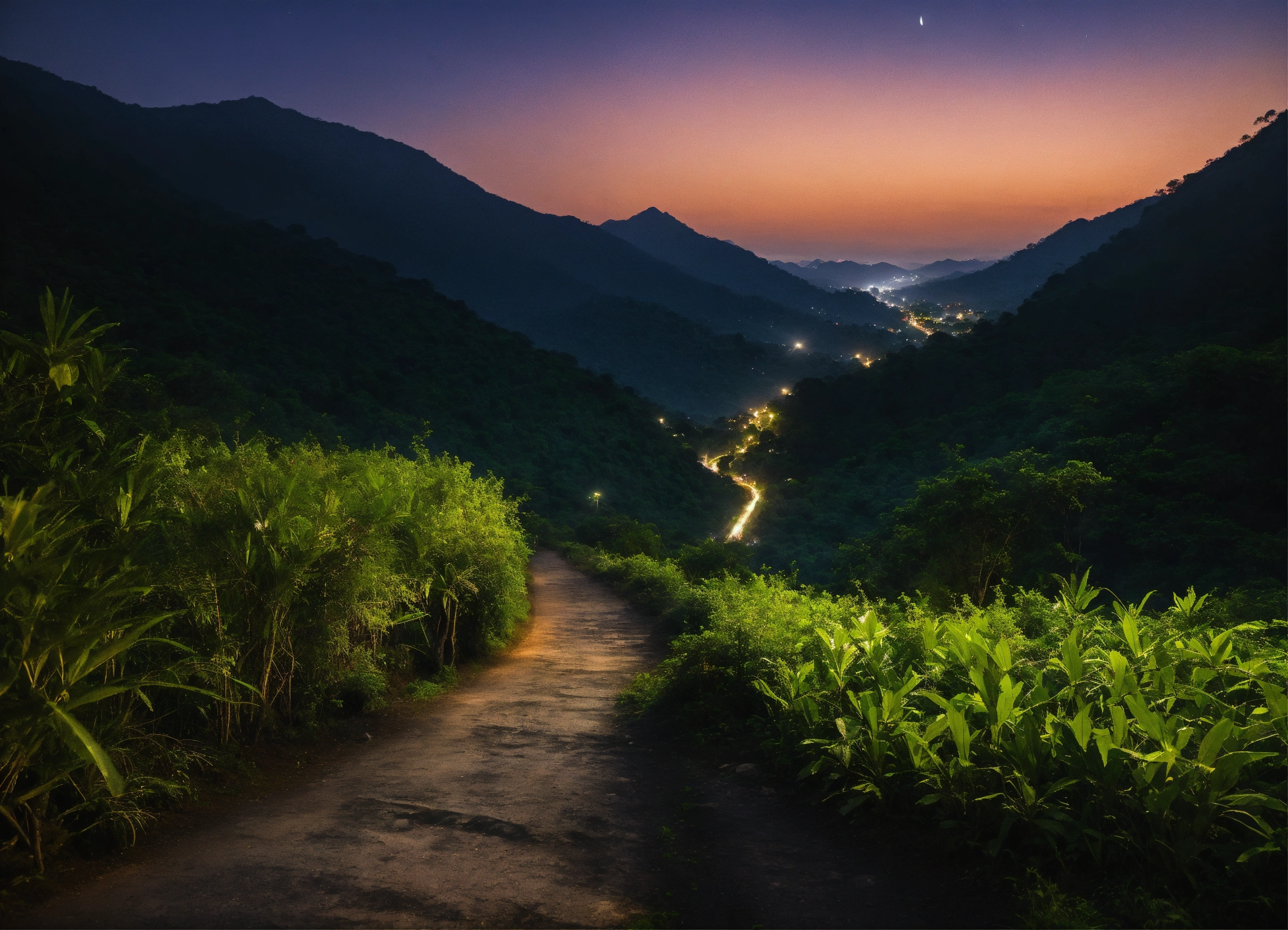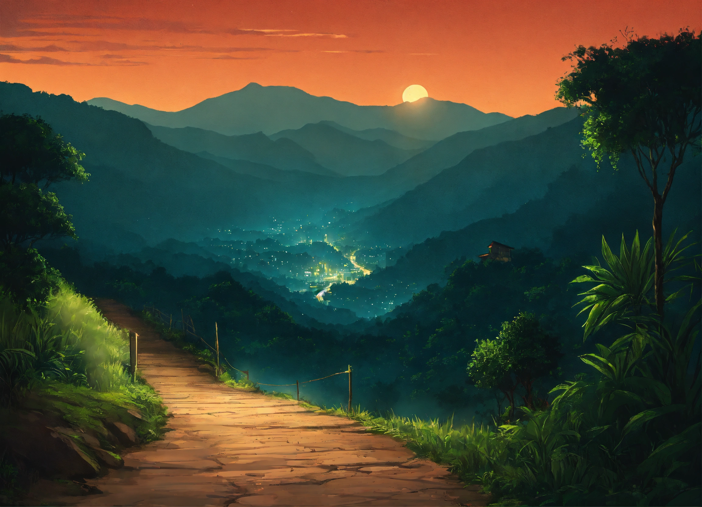 At night a footpath through a hilly landscape, jungle mountains on the left side, the heat is oppressive, the air humidity is high, medieval setting