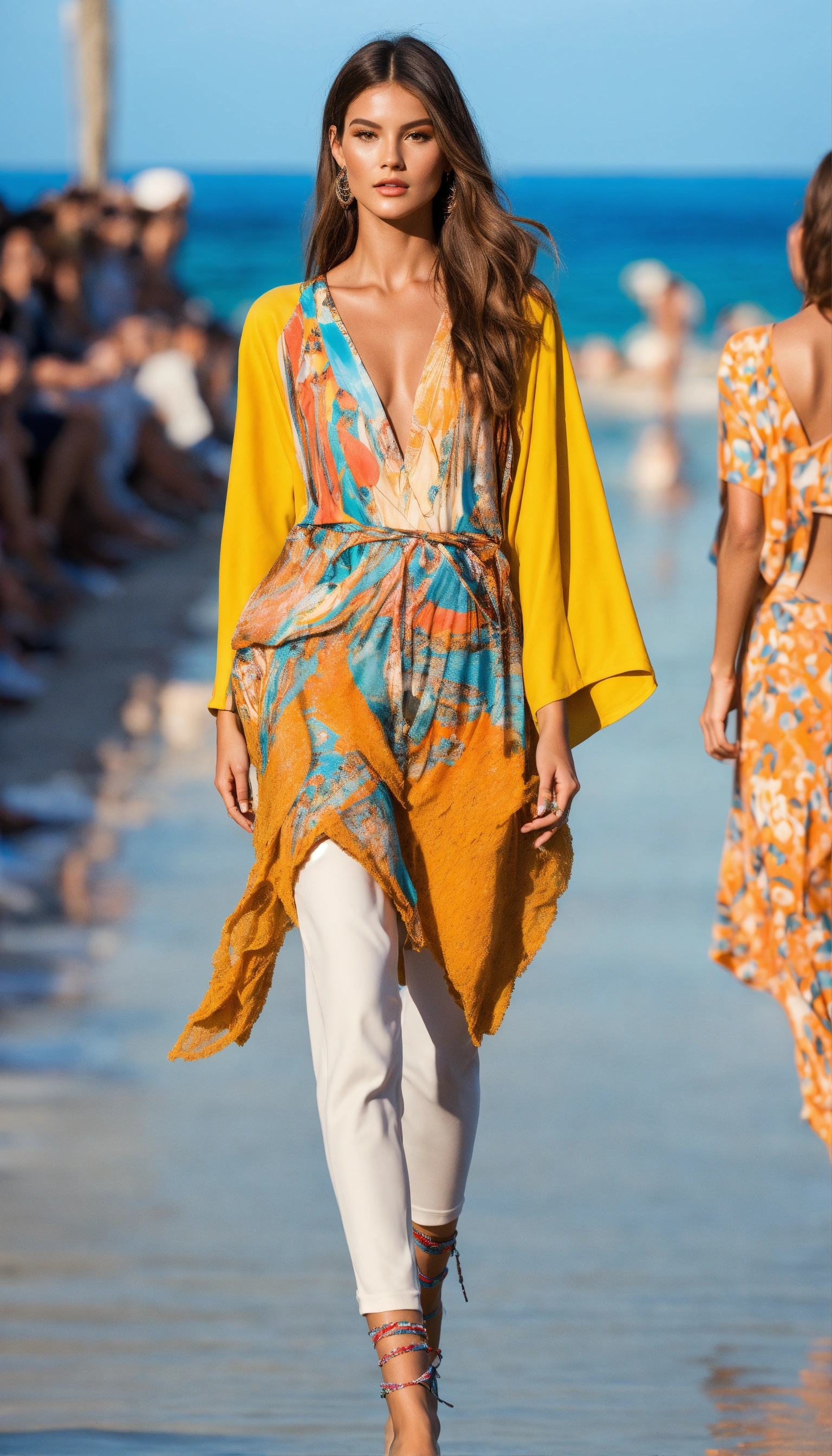 Ultra realistic full body photo of an fashionable model modeling summer designer novelty interesting complex unusual street sporty classy modern brave beachy sea beach details cutouts dolman sleeve outfit walking the runway at the positano beach