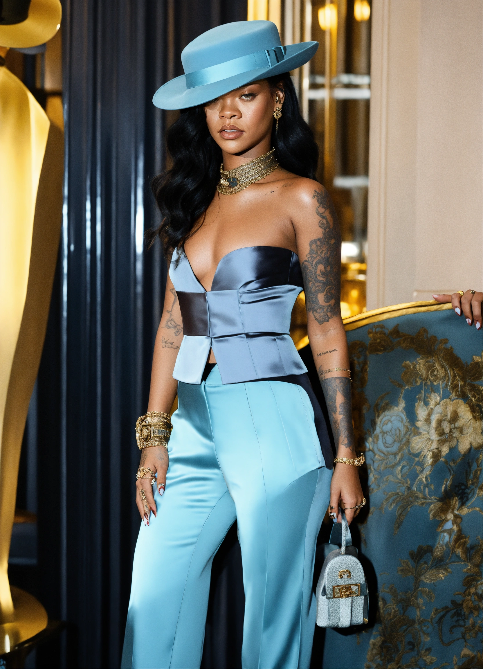Rihanna glamorous light blue and charcoal versace style silk outfit with pants and heeled boots and a bowler hat