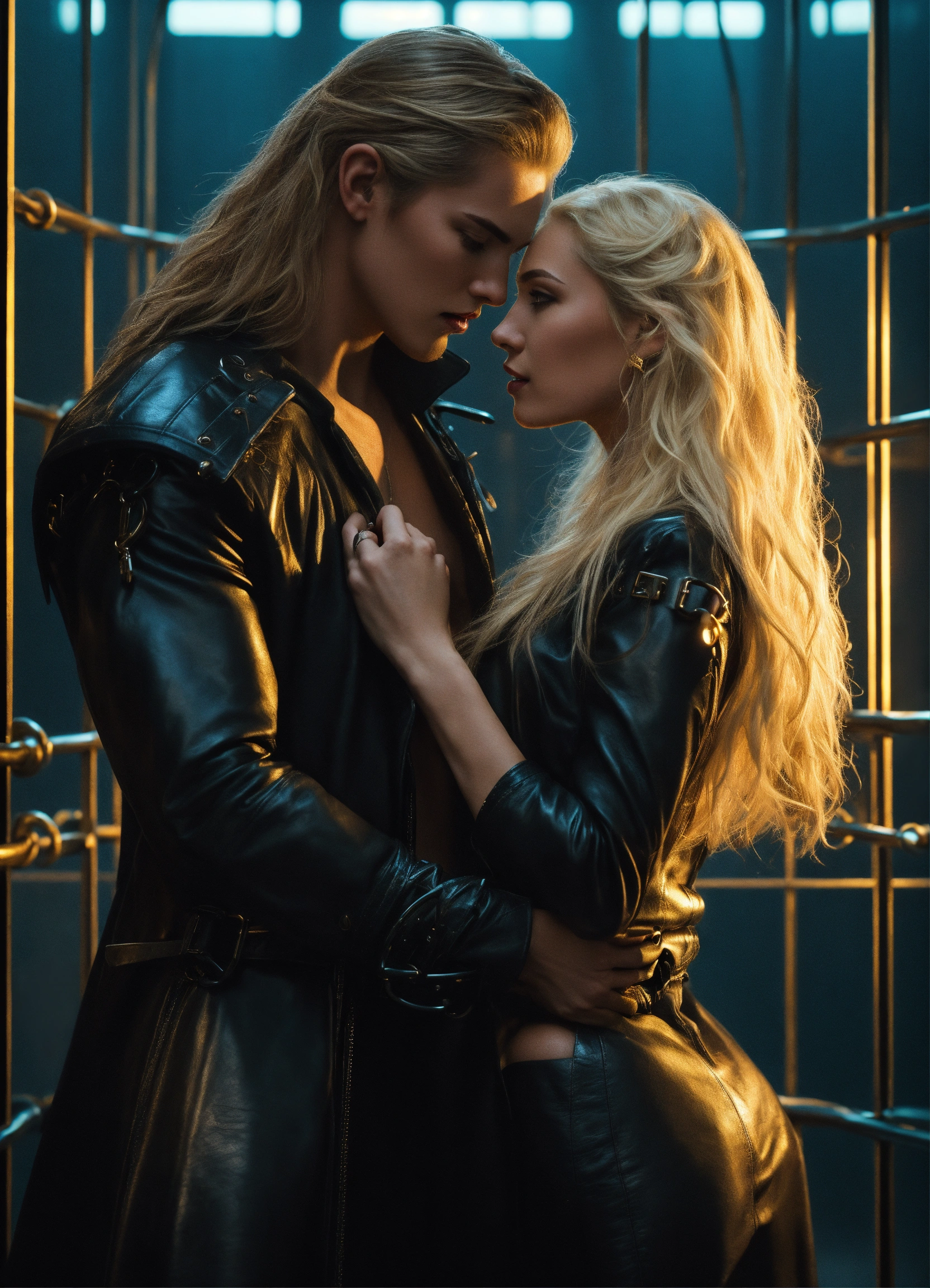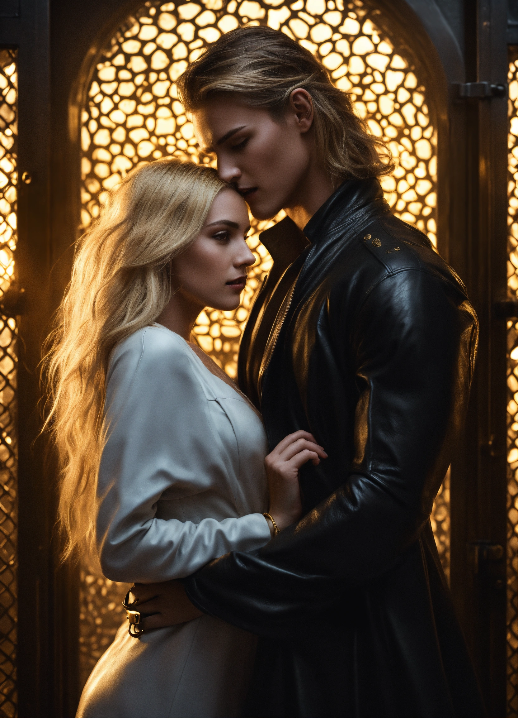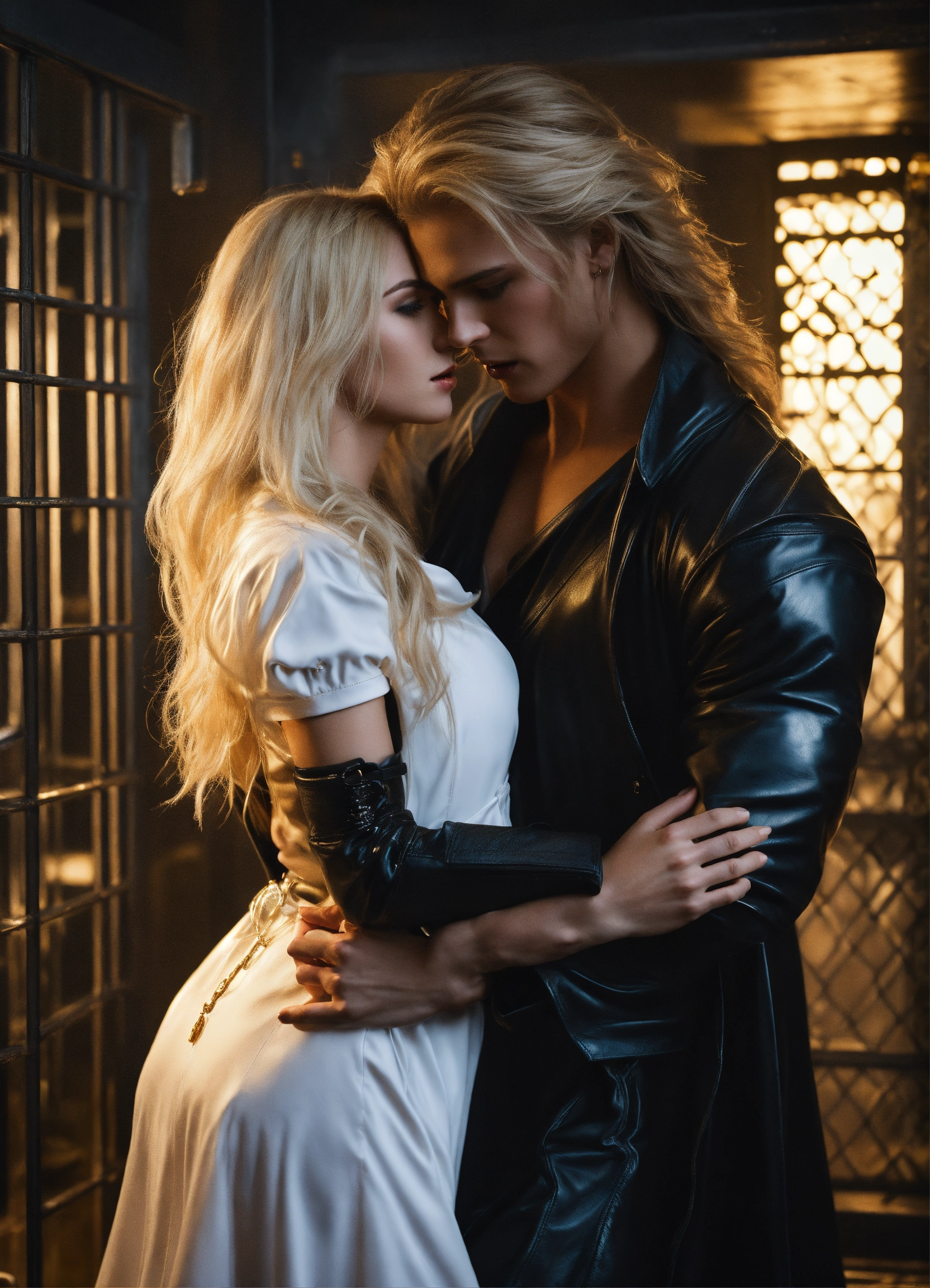 A male vampire, a huge strong short hair muscular blonde icelandic male vampire wearing a long black leather coat and black clothing embracing a beautiful hand cuffed white girl prisoner, a beautiful perfect soft girl with long flowing hair, long hair. flowing hair, wearing a resplendent gold dress and handcuffs in a futuristic glass prison cell in a supernatural prison, fantasy, high detail, realistic photo, high detail, digital painting, cinematic, stunning, hyper-realistic, sharp focus, high resolution 8k, insanely detailed