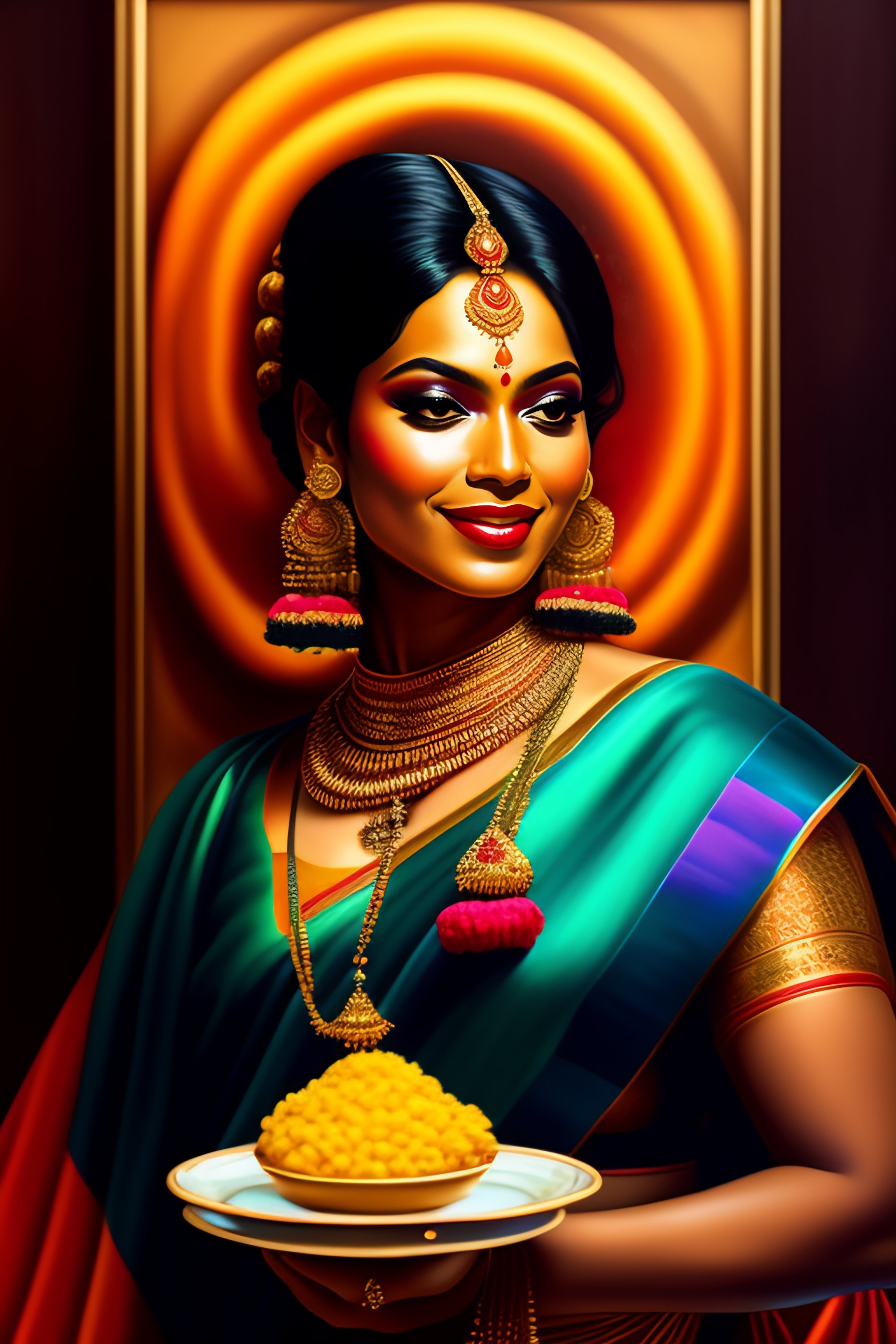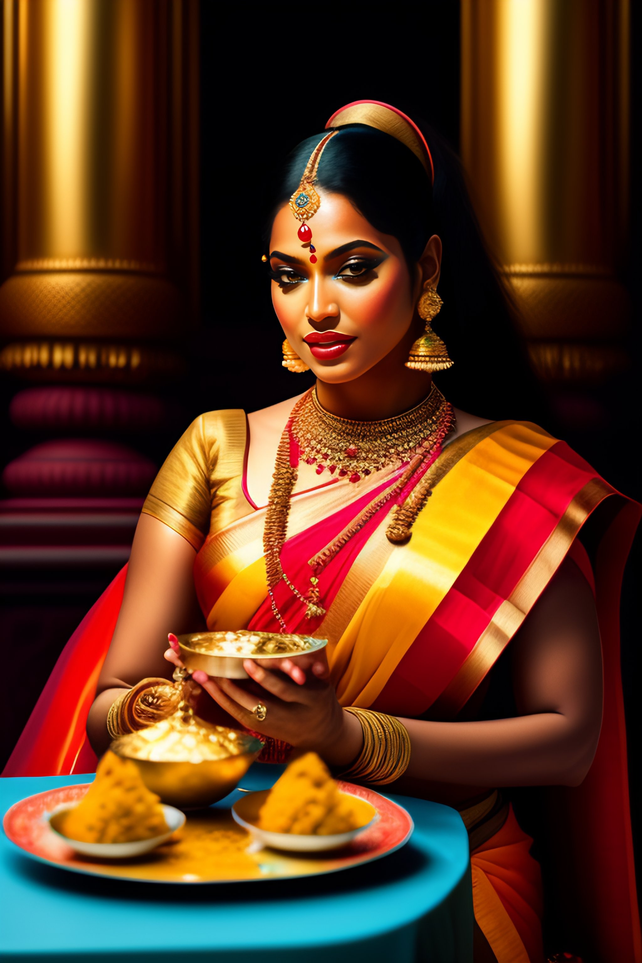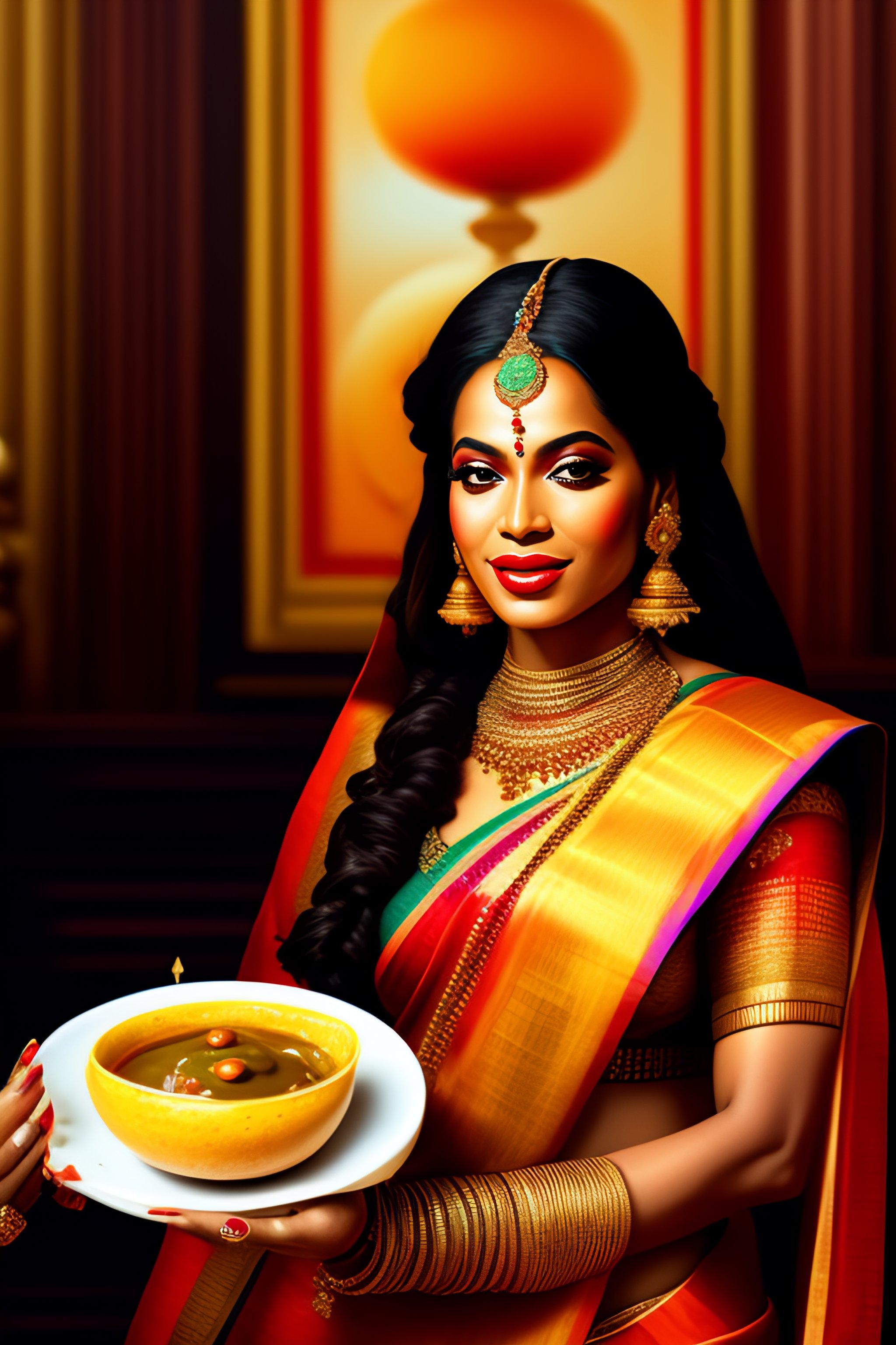 A abstract oil painting of beyonce eating pani puri, hindu temple, wearing a saree, award winning photography, masterpiece