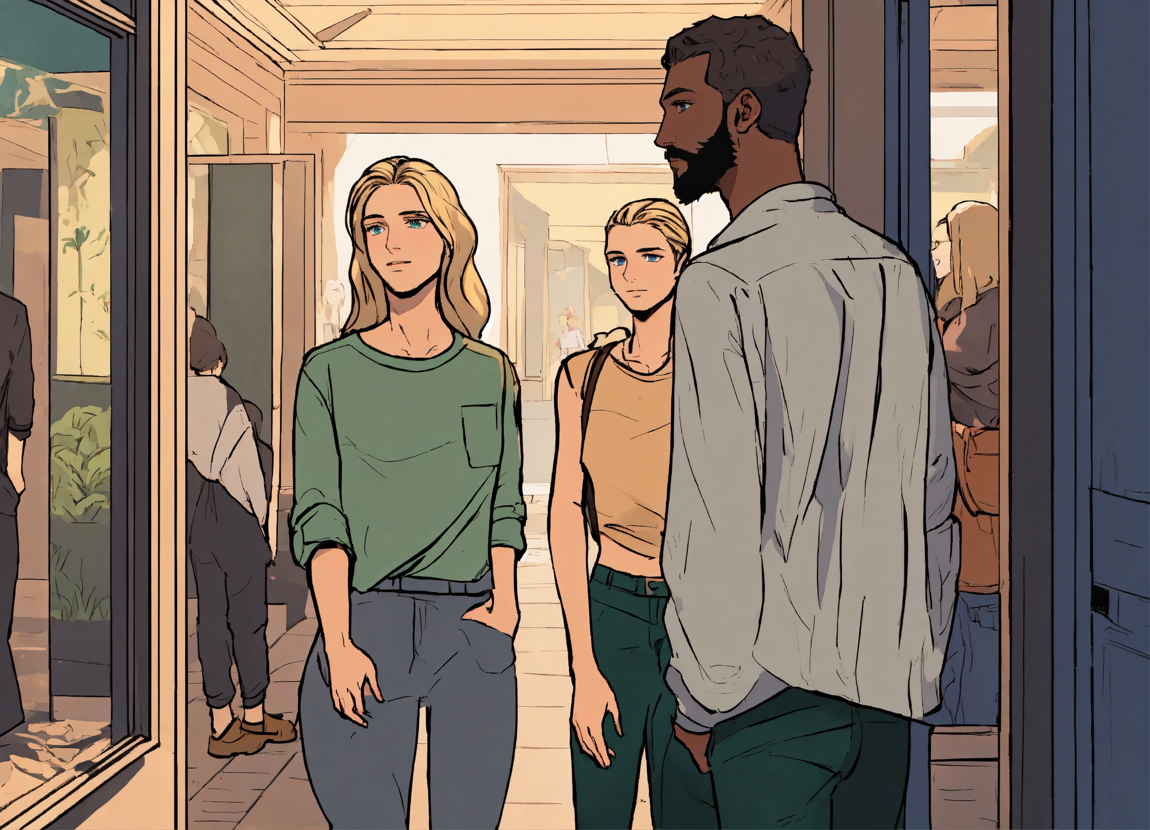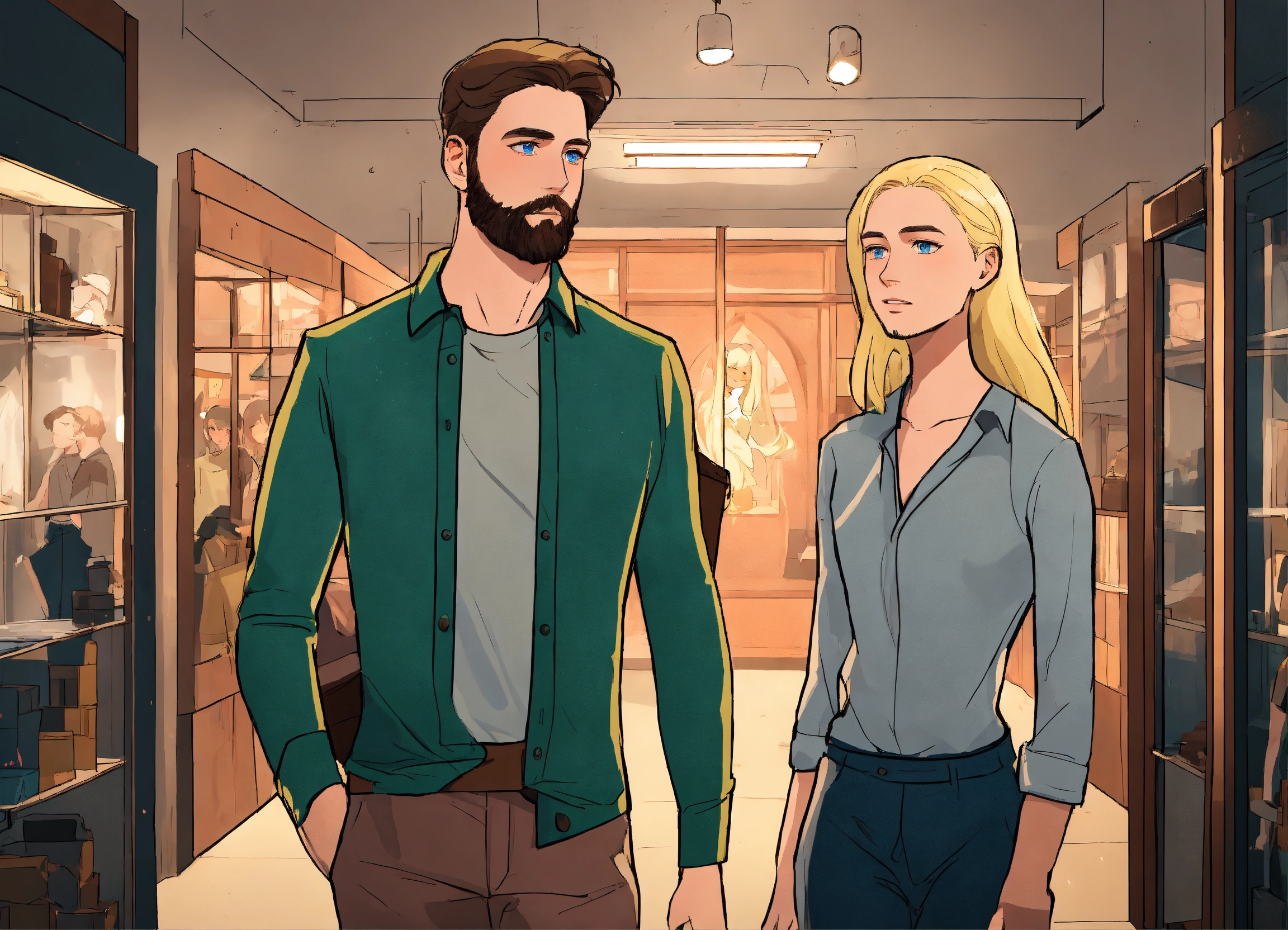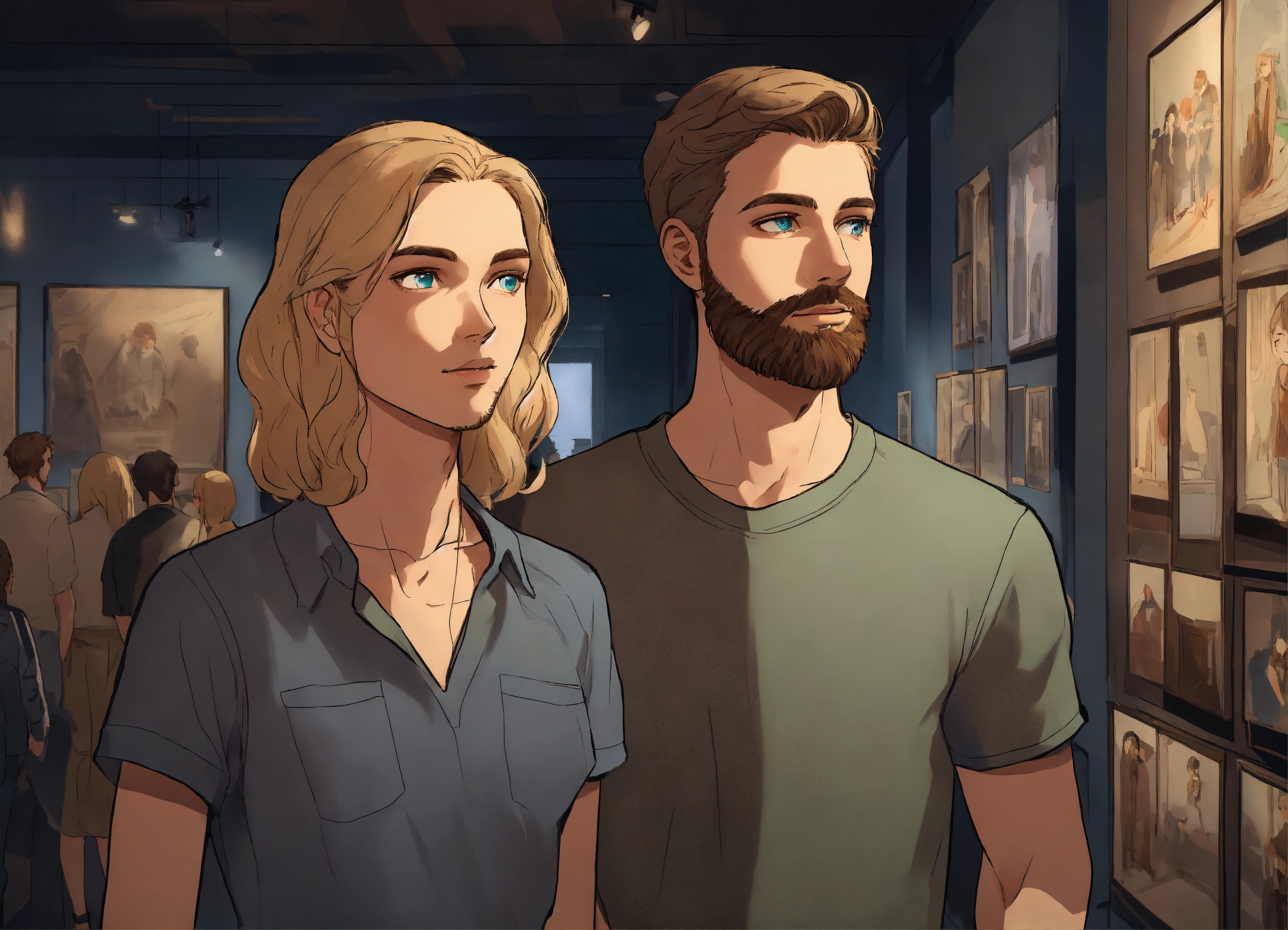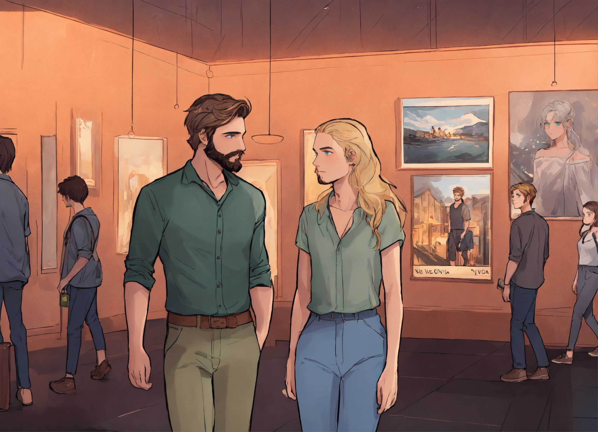 An illustration style where young man with green eyes, sparse light thin brown beard wearing silver shirt dark gray pants meeting his friend, her name is olivia and she is blonde girl with blue eyes and v shape face and they both go to museum. walking inside dark museum show whole room and they are only friends