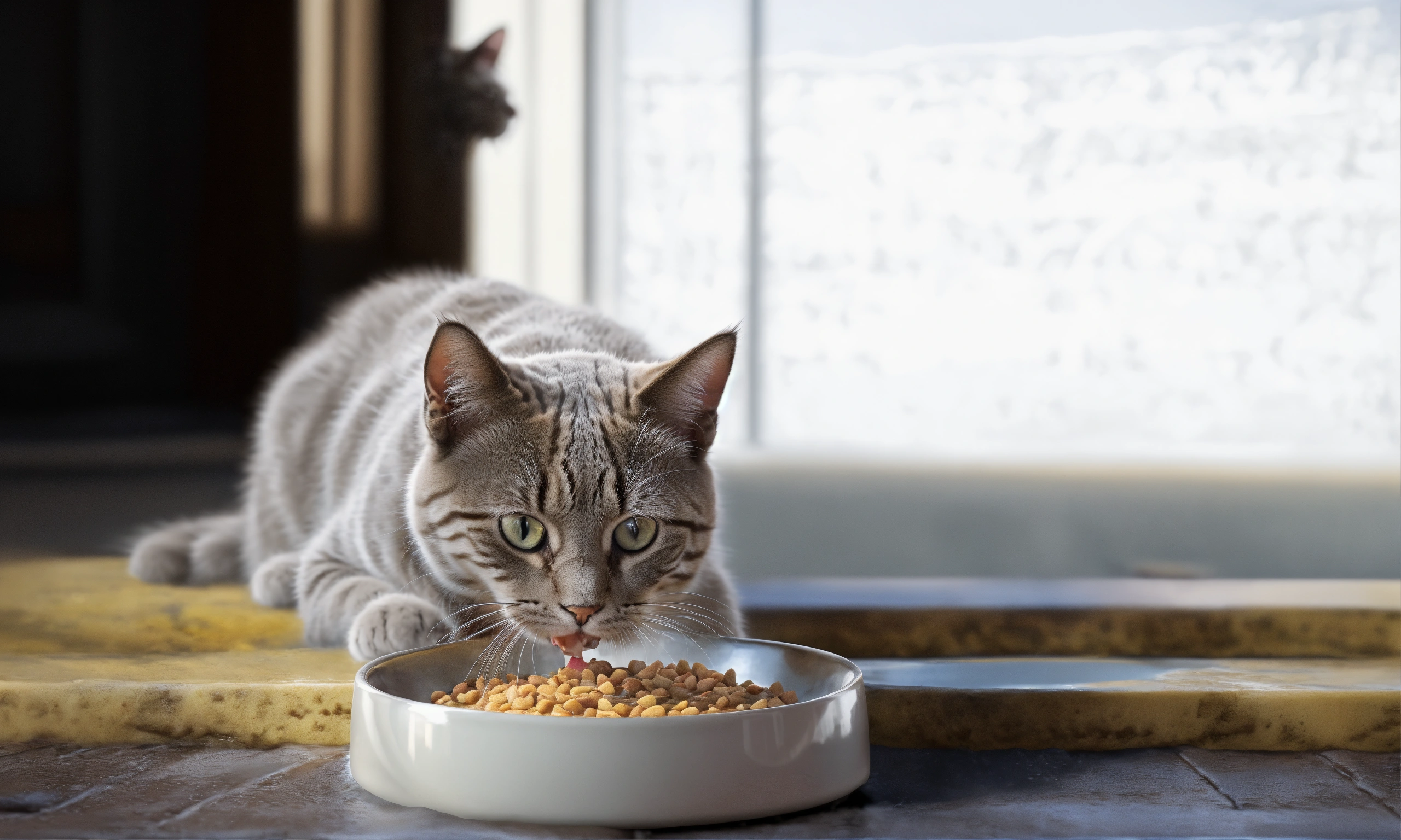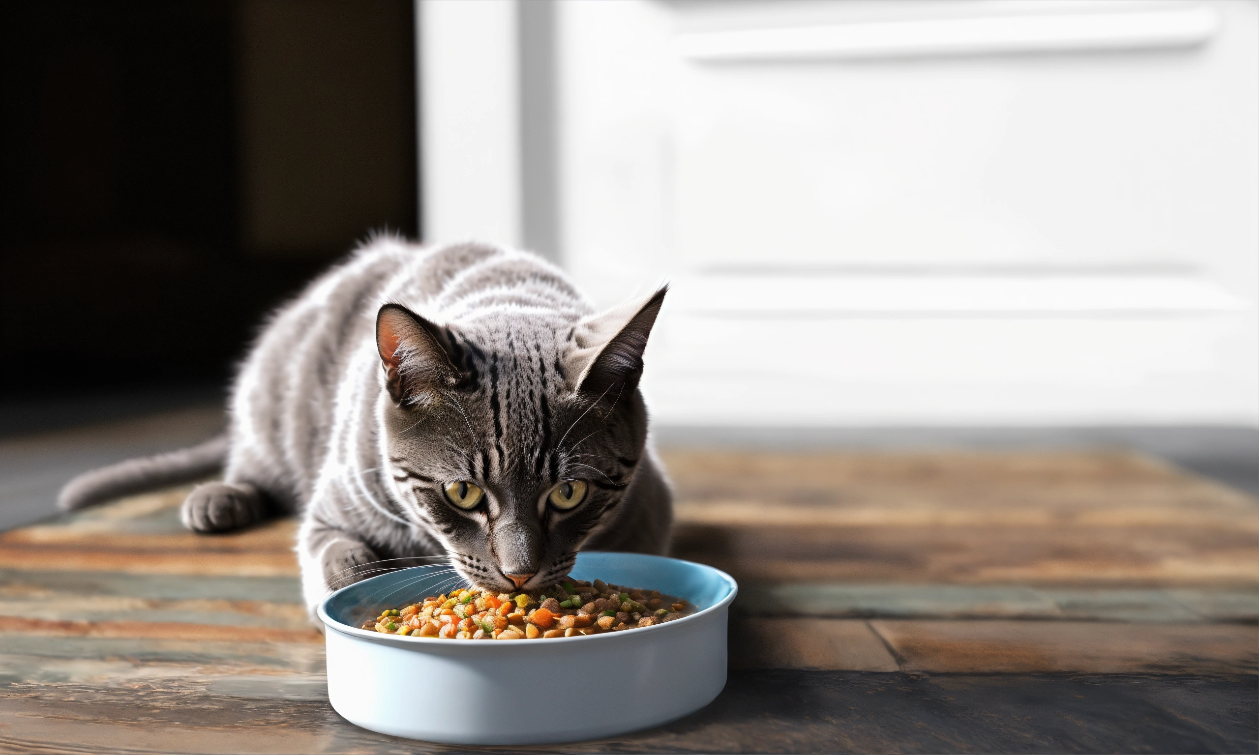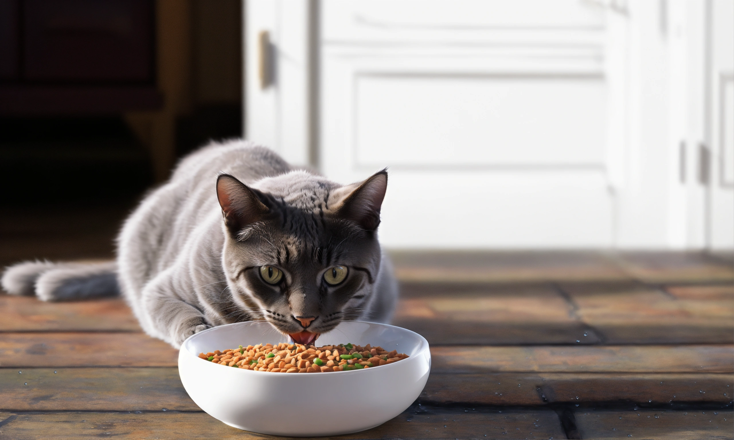 Generate a highly realistic image of a cat eating from a bowl of wet cat food