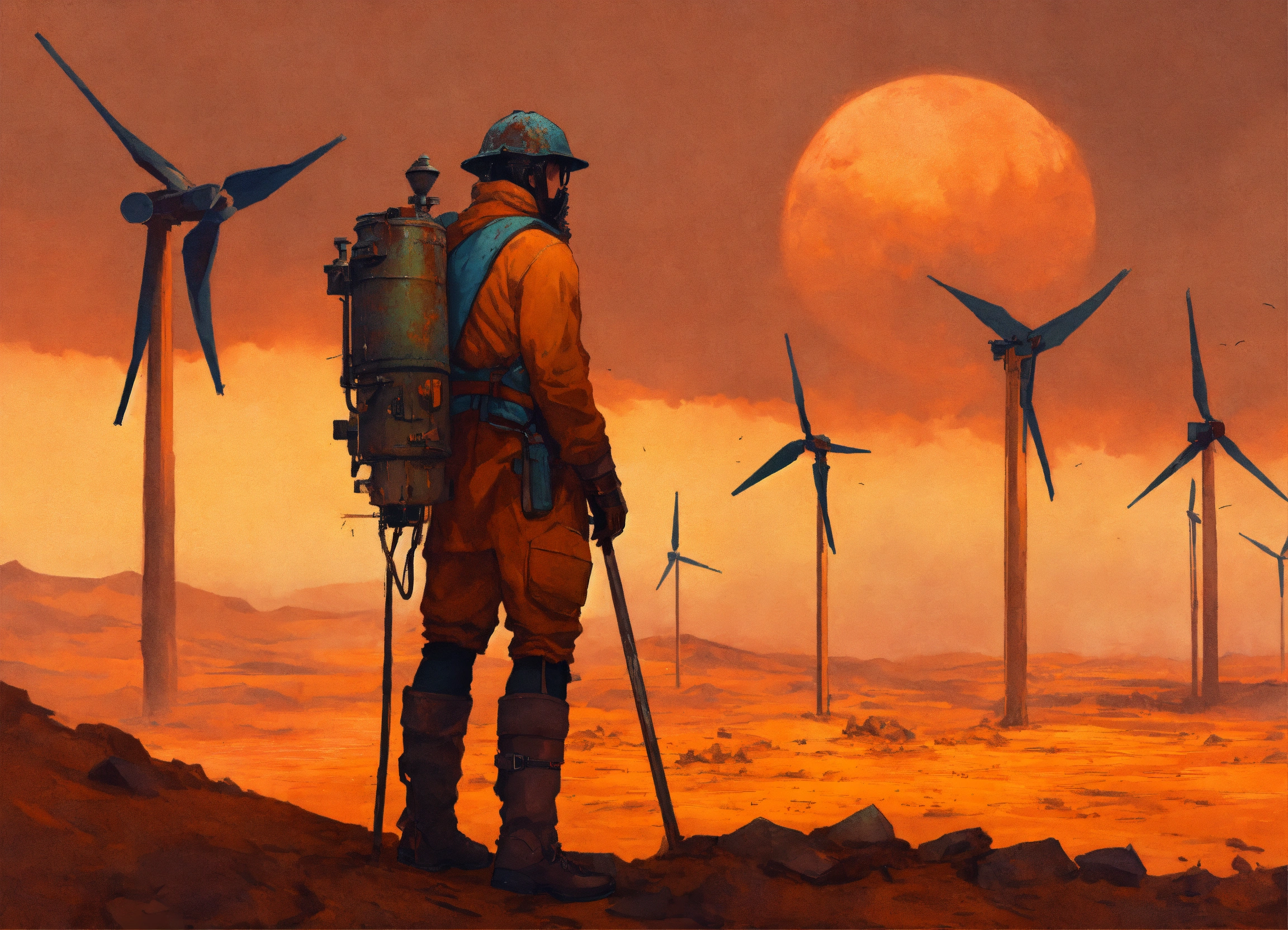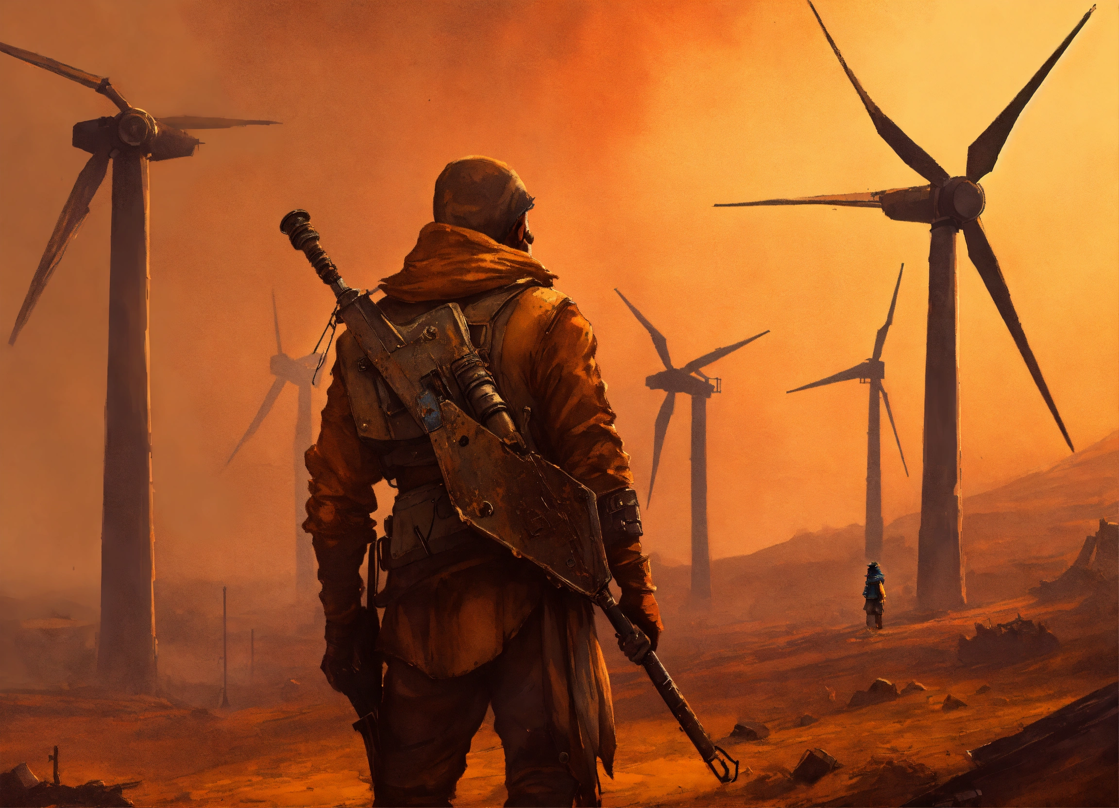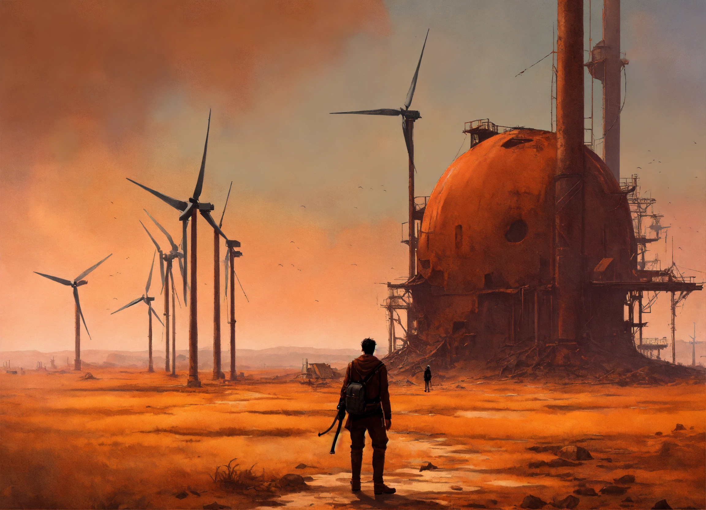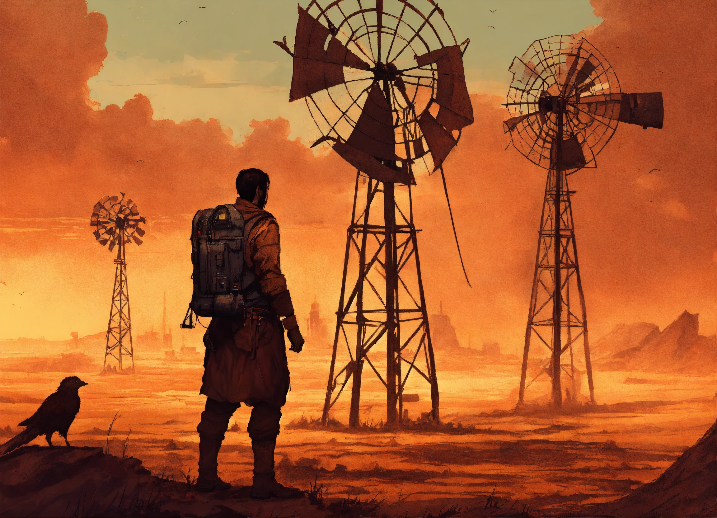 Depict an isolated adventurer standing among crumbling, rust-coated wind generators under a burnt sienna sky of a forsaken earth