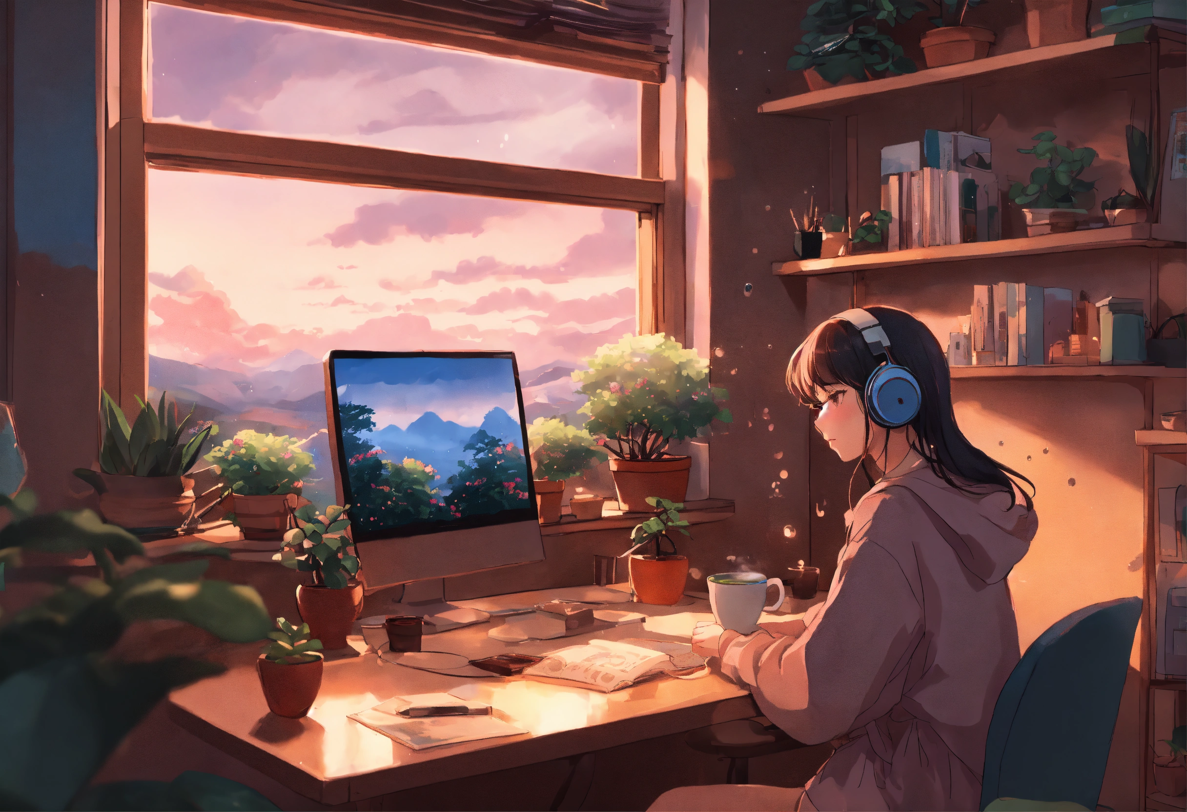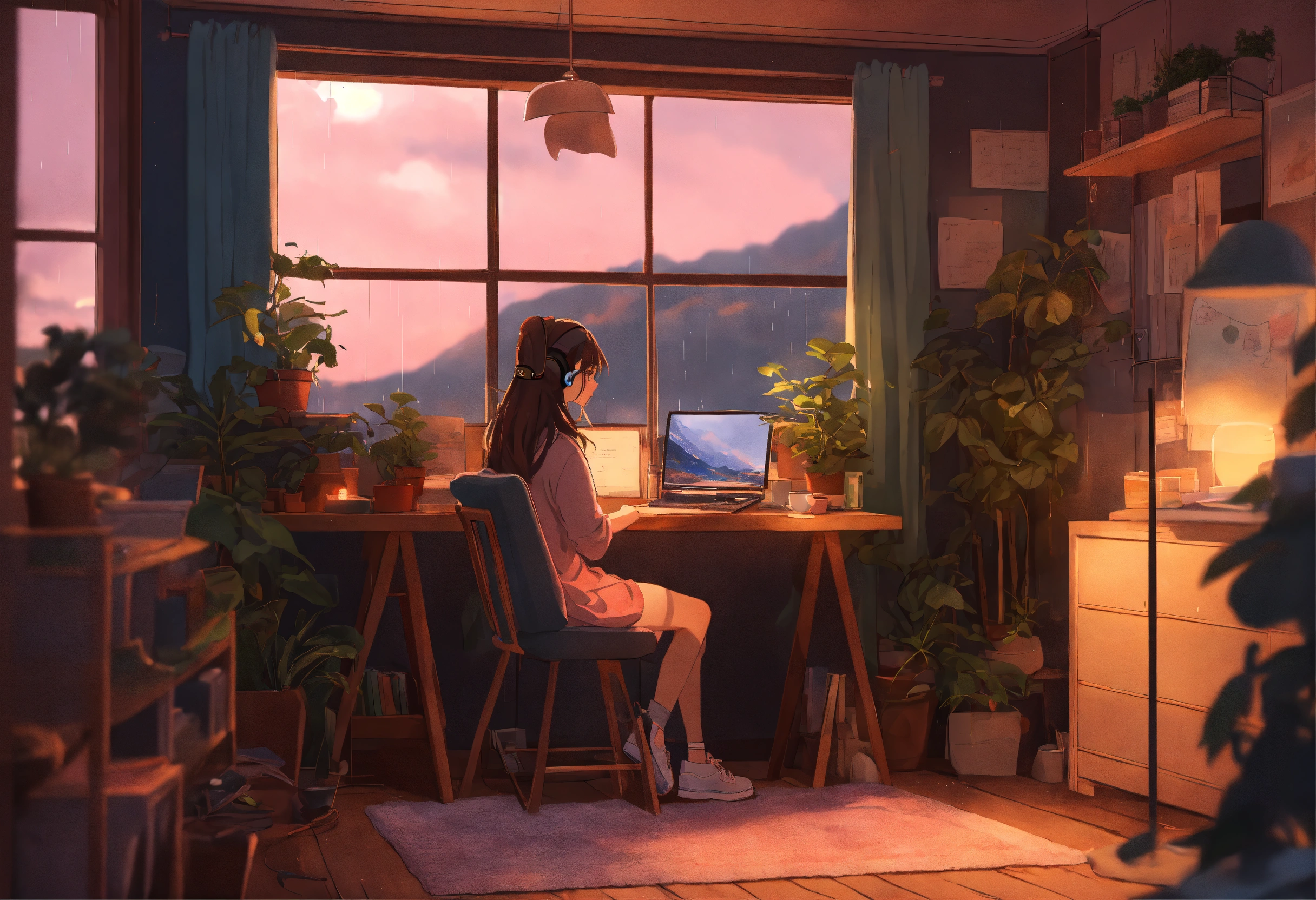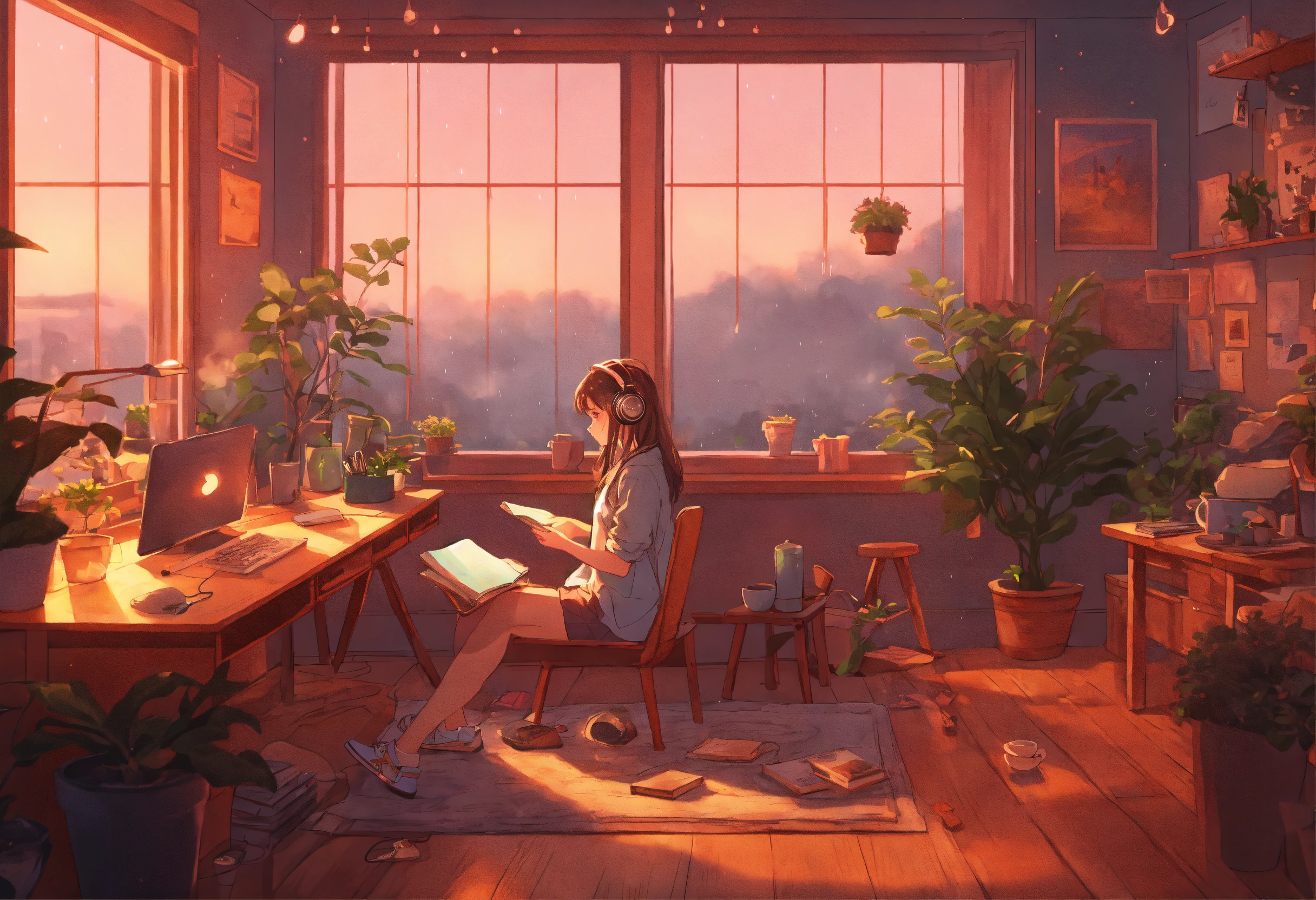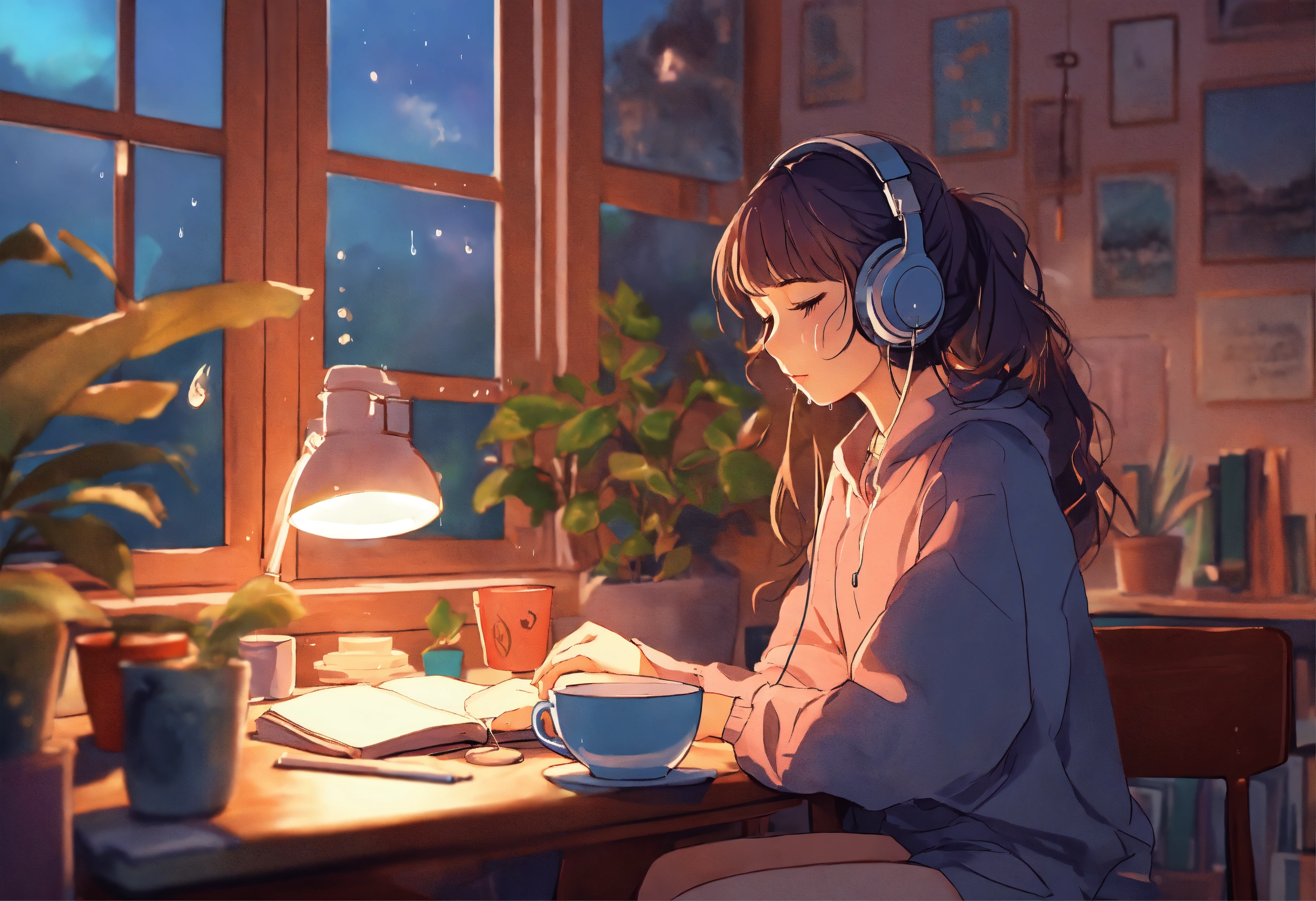 "generate an image reminiscent of the 'lofi girl' aesthetic on youtube. picture a cozy dorm room with pastel hues, soft lighting, and a girl sitting at her desk. the girl should be wearing headphones, immersed in her study, with open textbooks and notes. surround her with elements that enhance the serene atmosphere, such as potted plants, a steaming cup of tea, and perhaps a view of the outside with rain gently falling. the image should convey a sense of focus, relaxation, and the ideal ambiance for a lofi music video. capture the nostalgic and calming essence of 'lofi girl' in this scene."