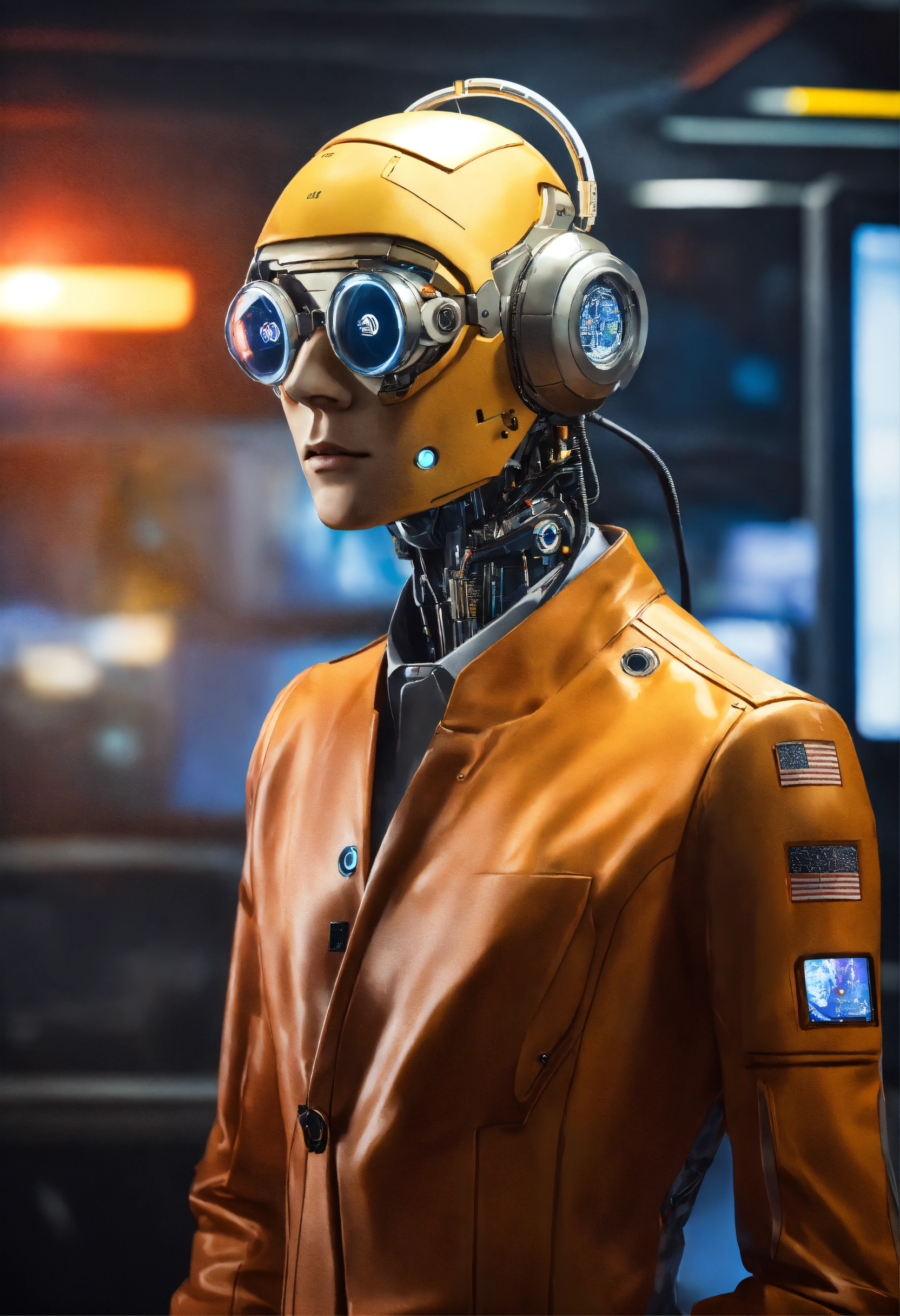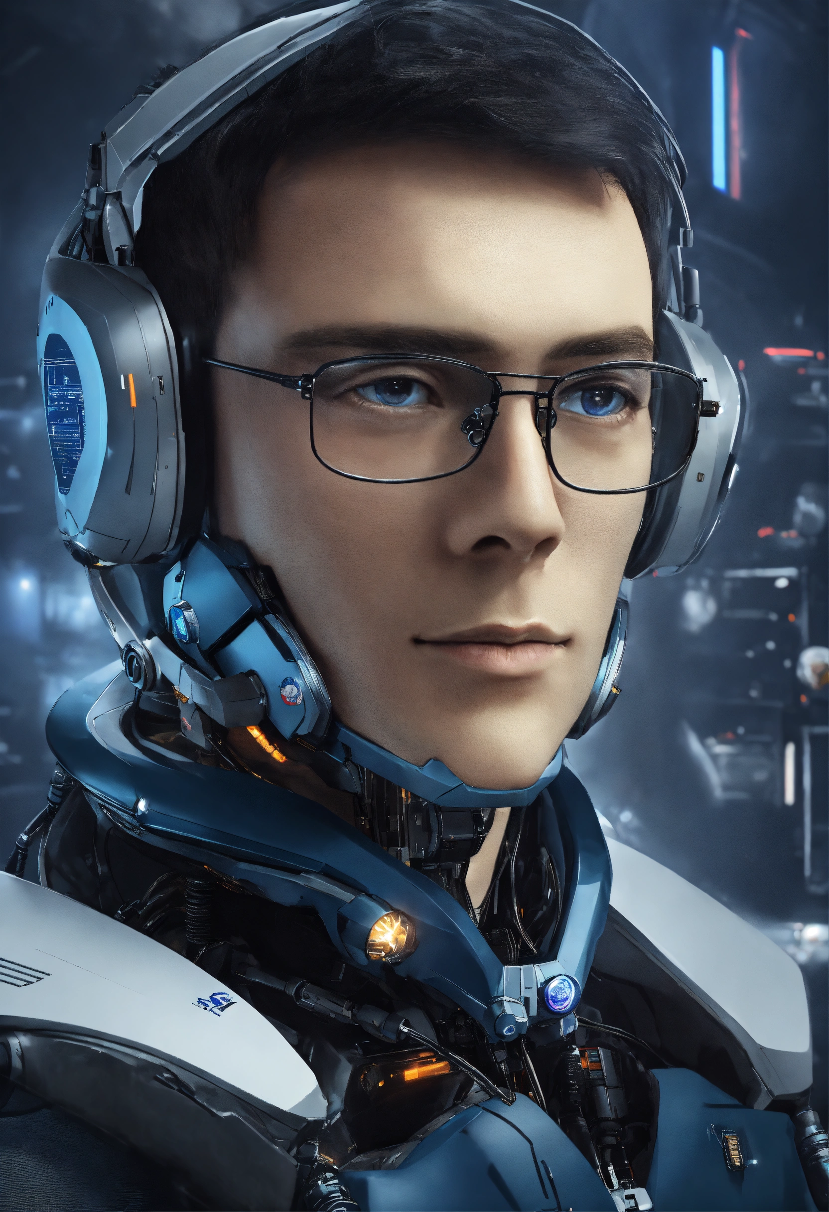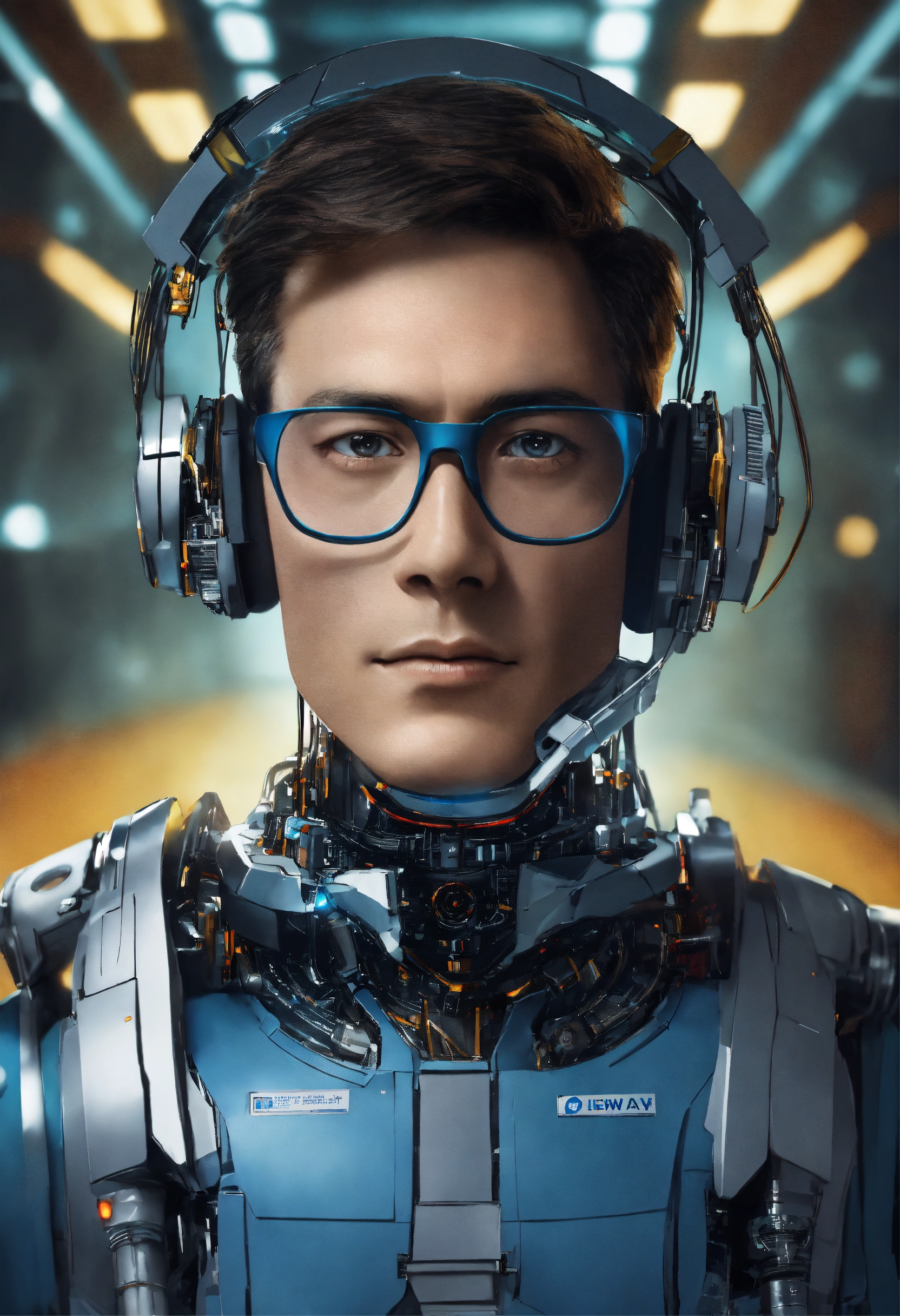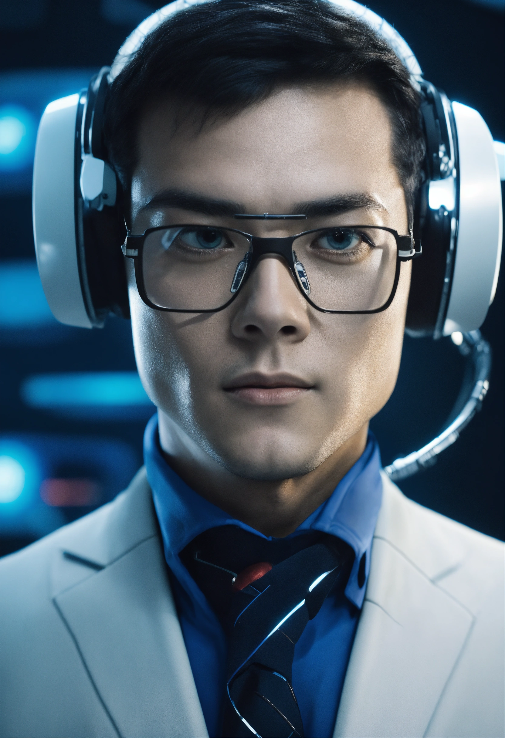 Futuristic space news anchor who is half-robot and half-human, with a face that closely resembles that of a typical human, wearing glasses. a professional news anchor working at a space station in the future. he has a unique appearance, with robot part from back of his head to his neck. like in the movie called "the creator"