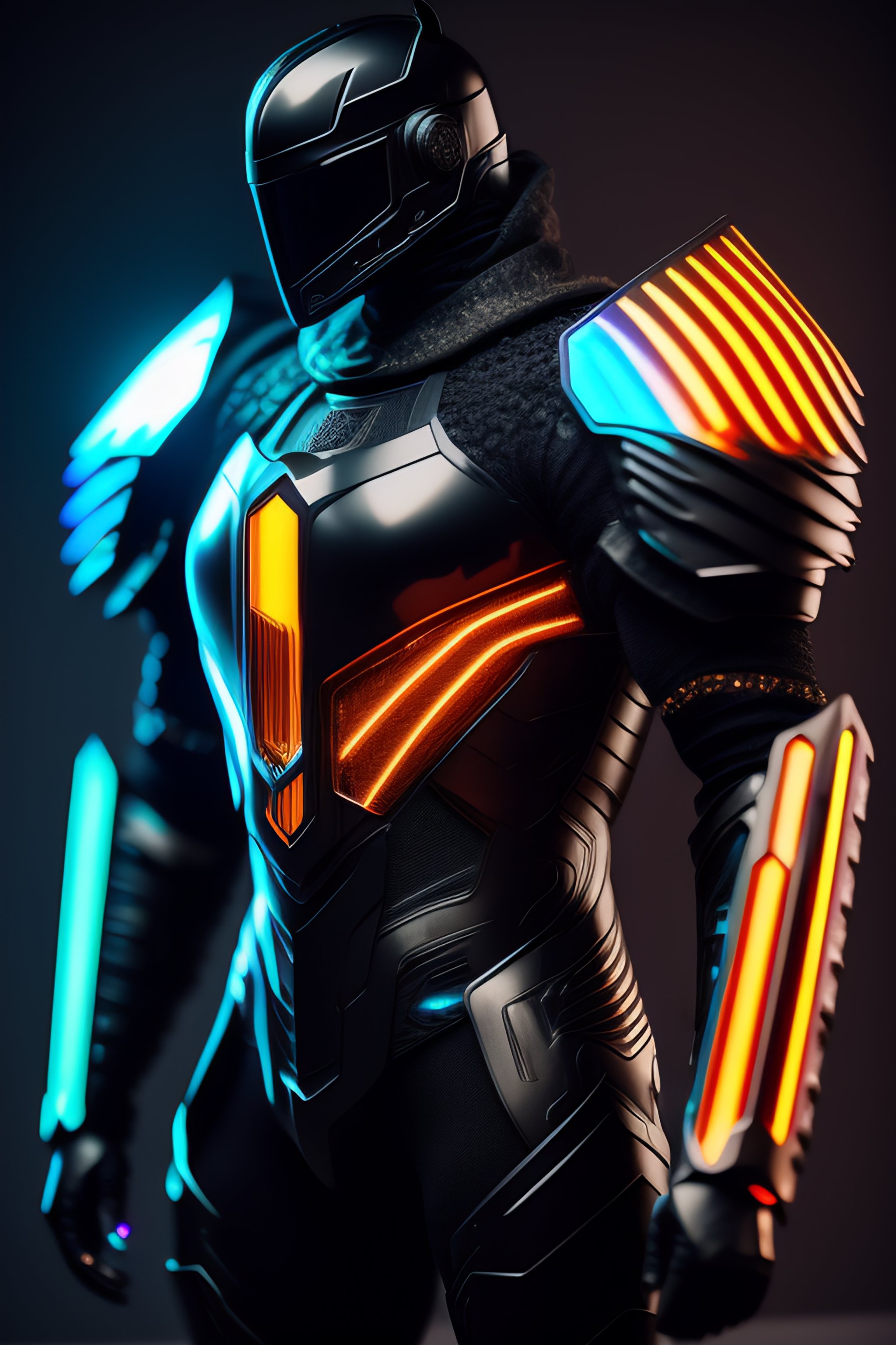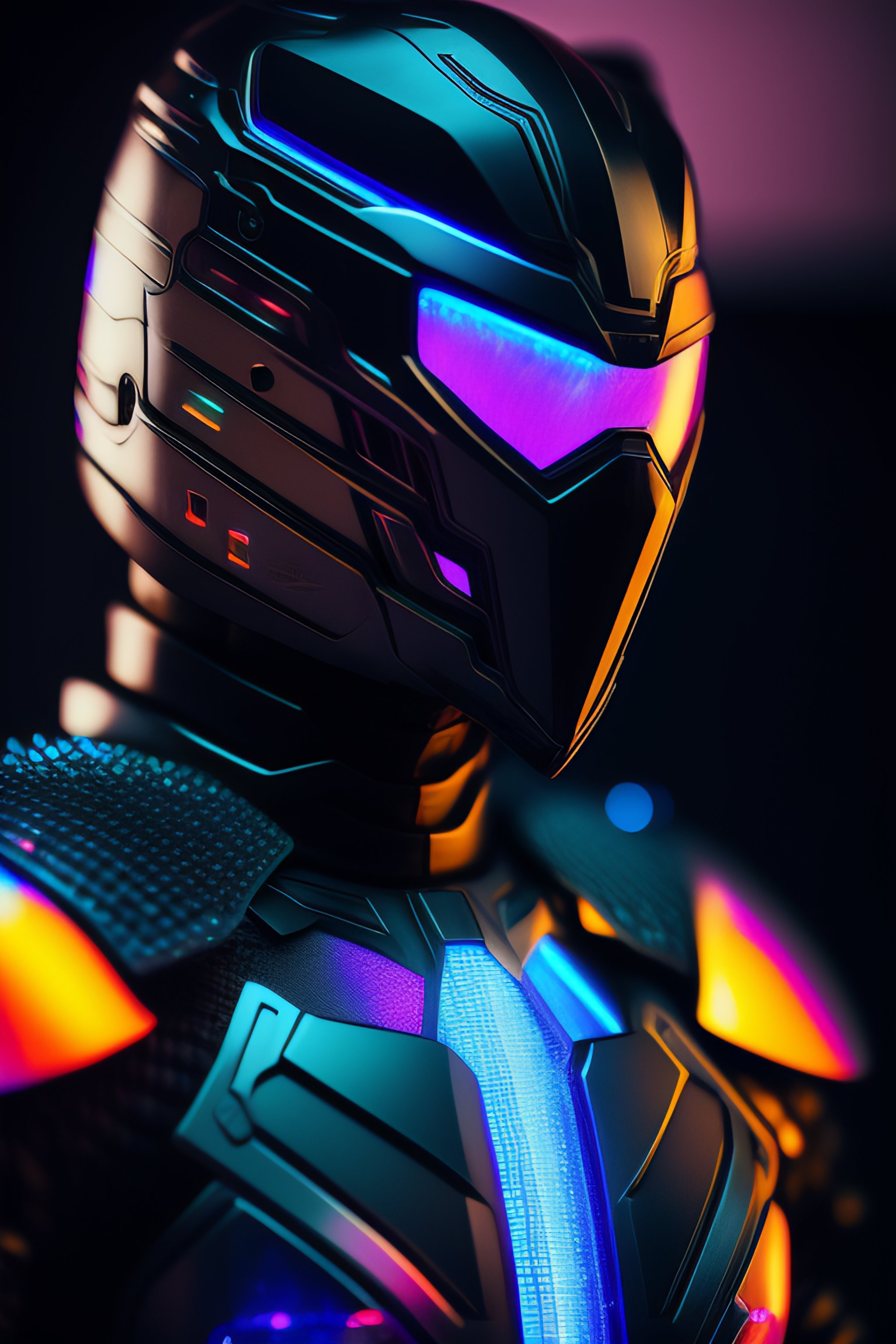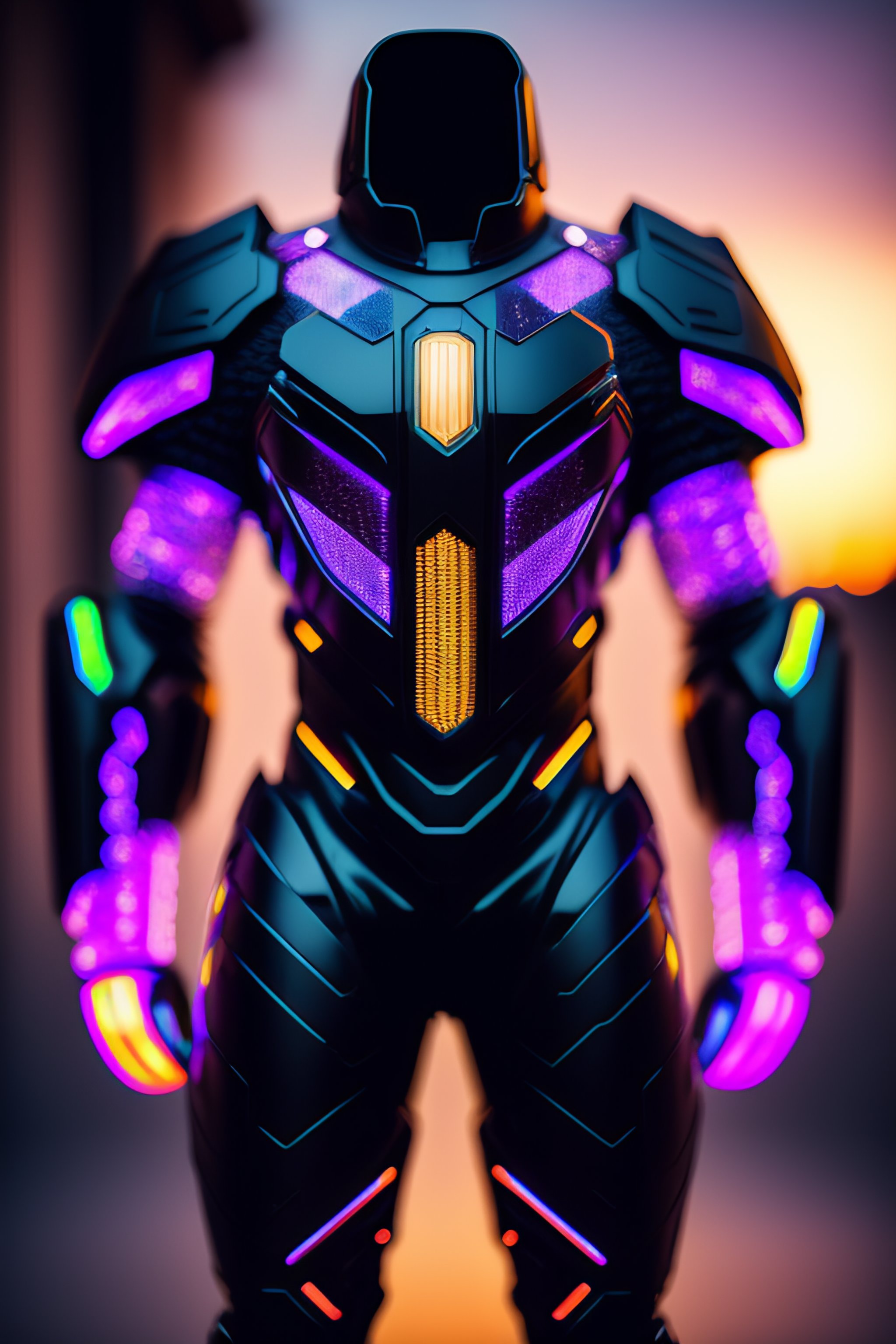A photograph of a cyberpunk armour made of black titanium and some crystal, rgb leds rainbow, power suit, gradient, crystal, visible wires and microchip, holograph, crystal transparent torso, imposing, elegant, for men, modern minimalism, low poly lines, glitch core, dreamy, colorful, dystopia, godlike, mysterious