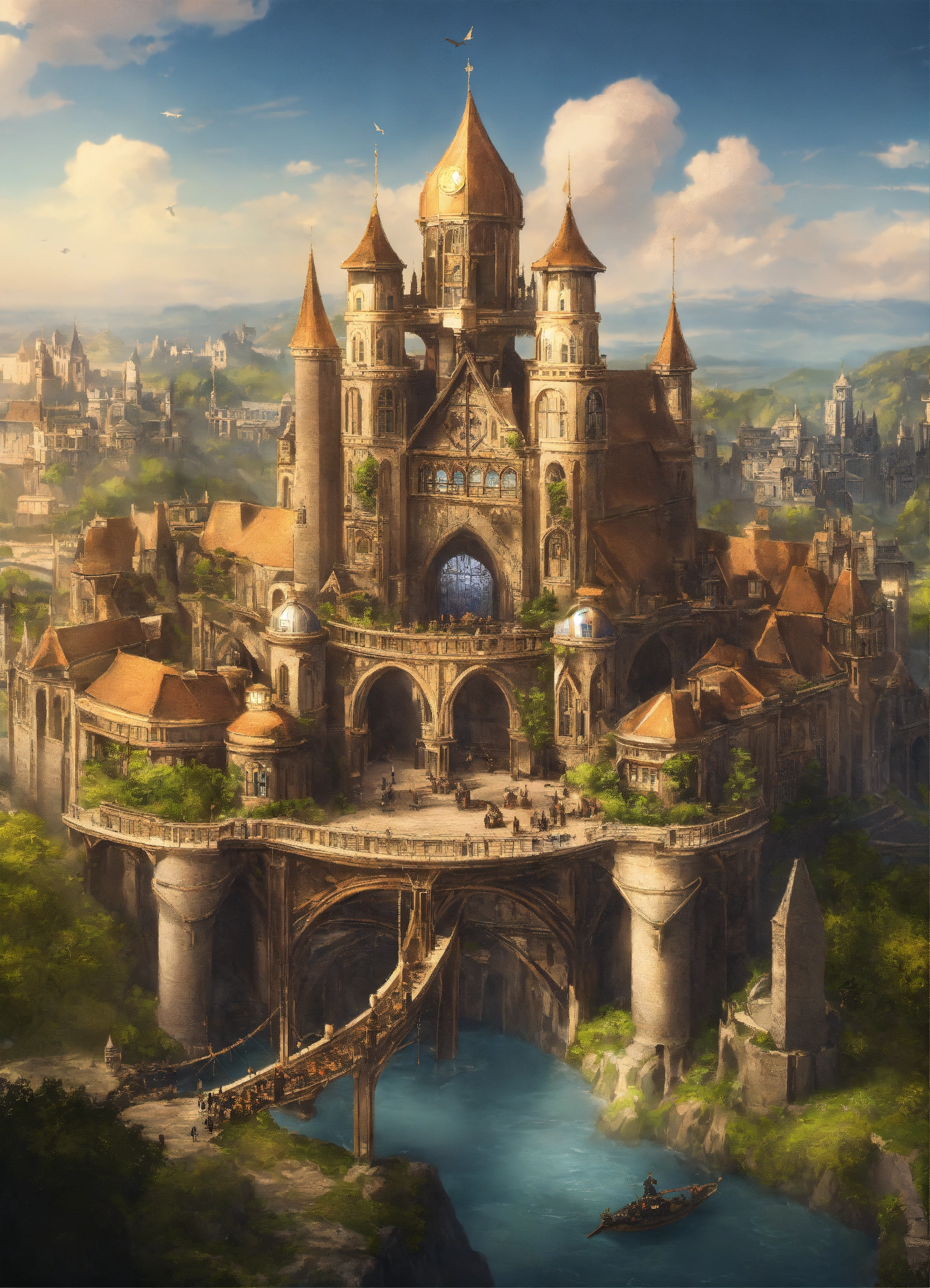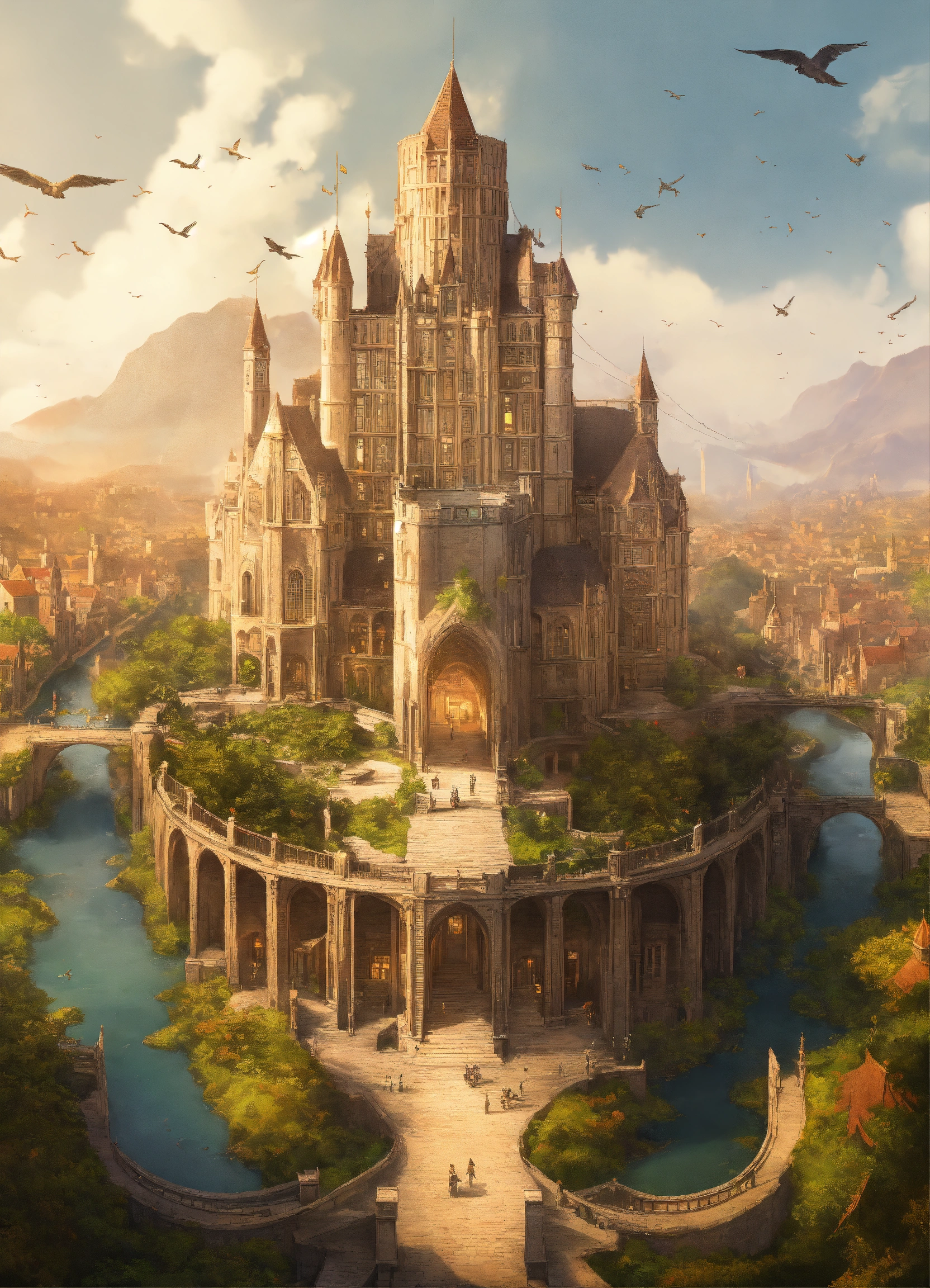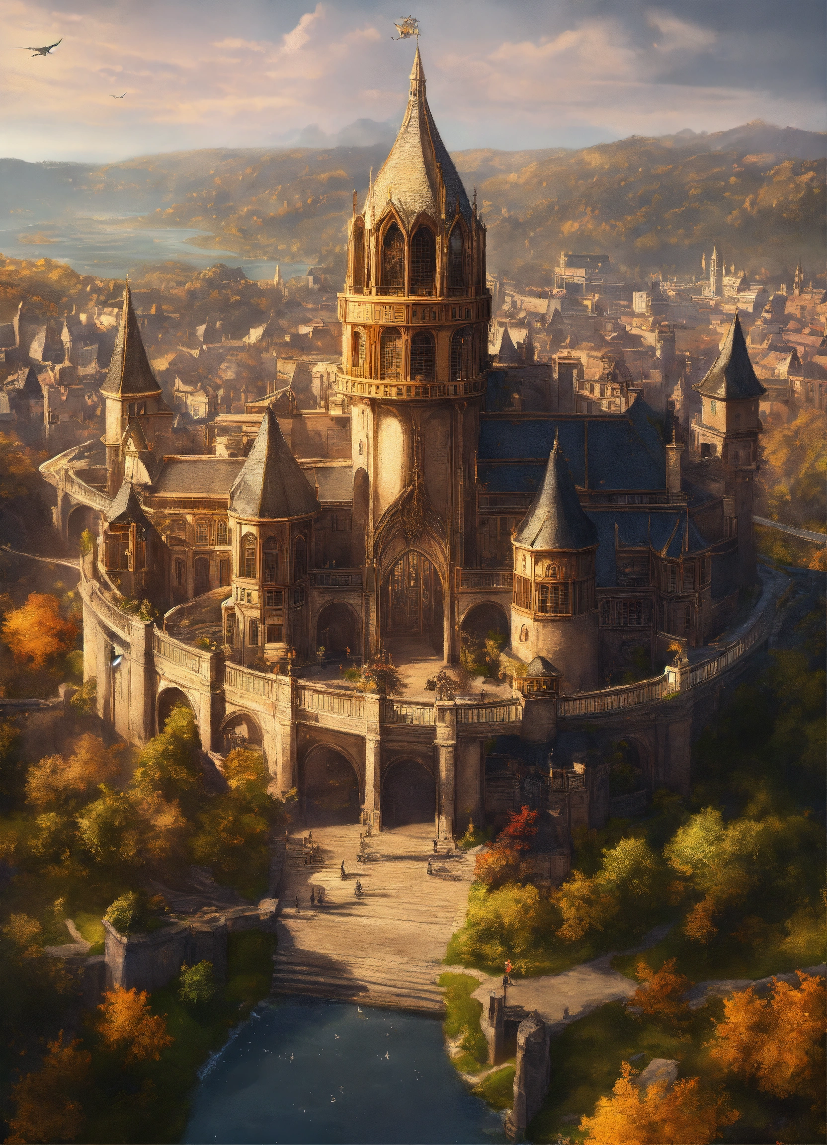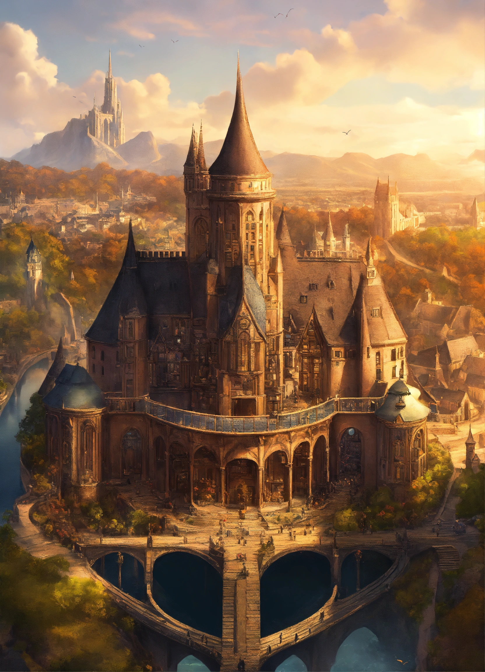Bird-view of a fantasy city, in the middle is a big gothic-inspired, fantasy academy building with a bridge leading up to the entrance. the building has a round foundation and is several stories high. the academy has dirty gold specs