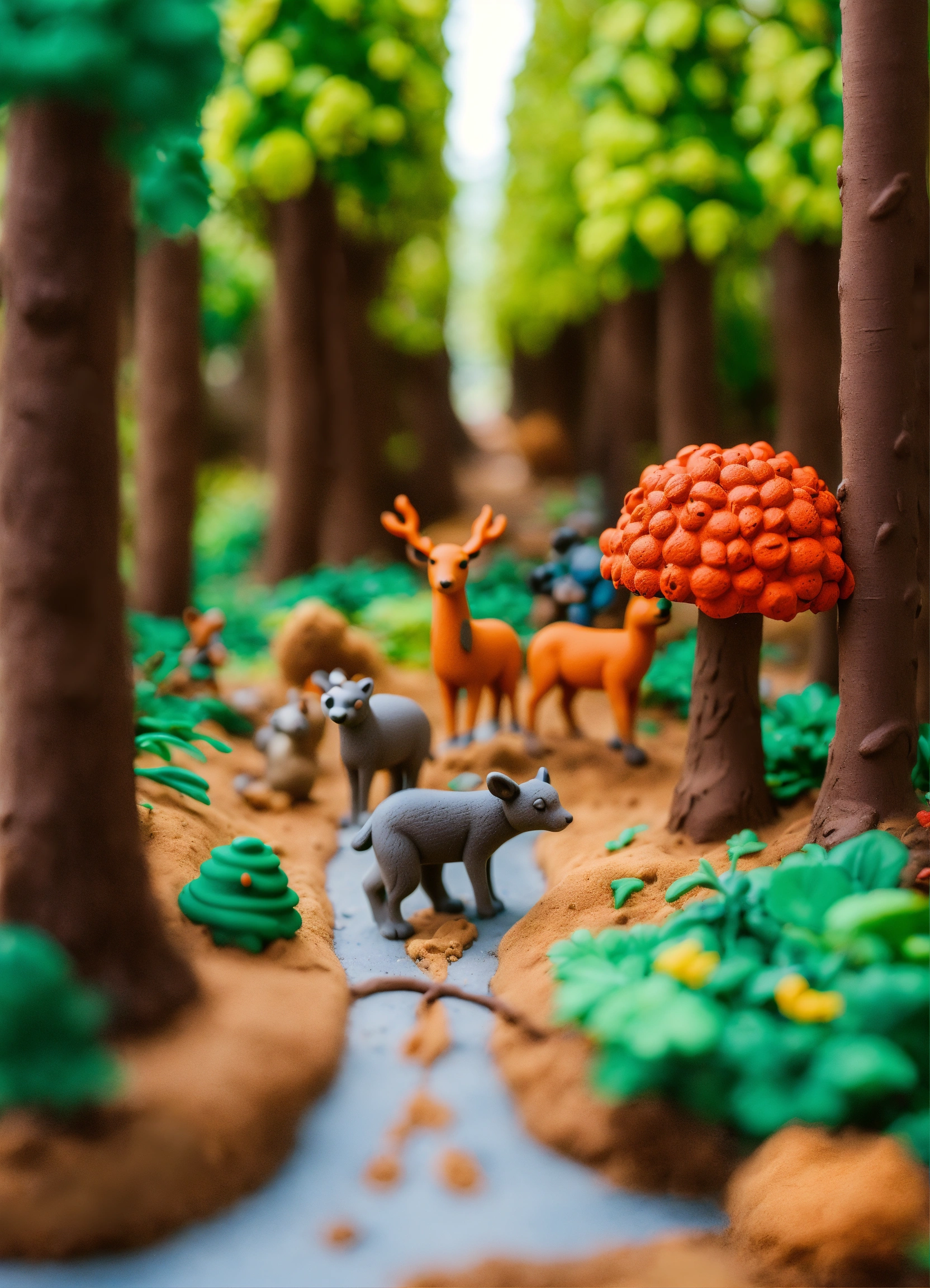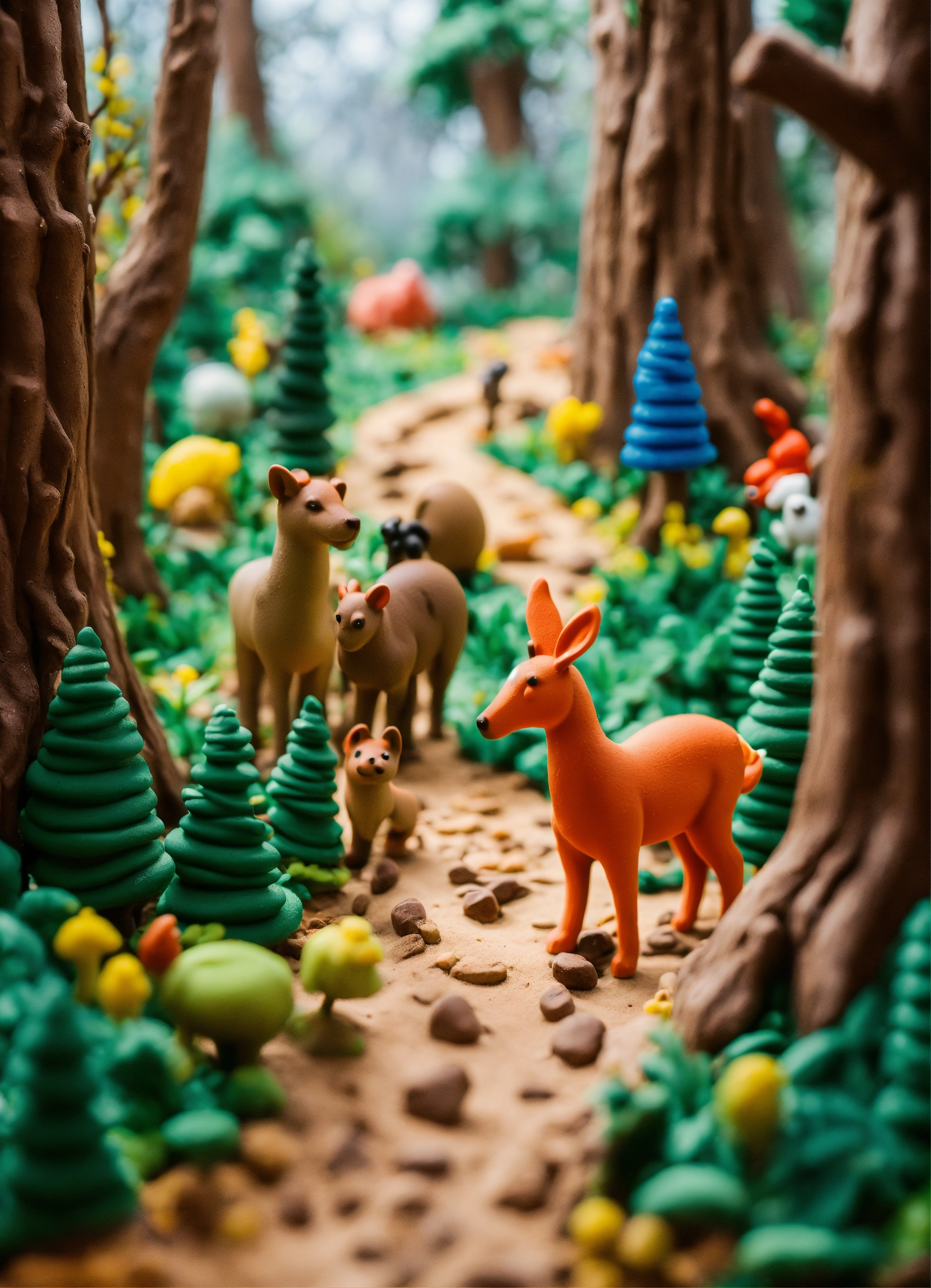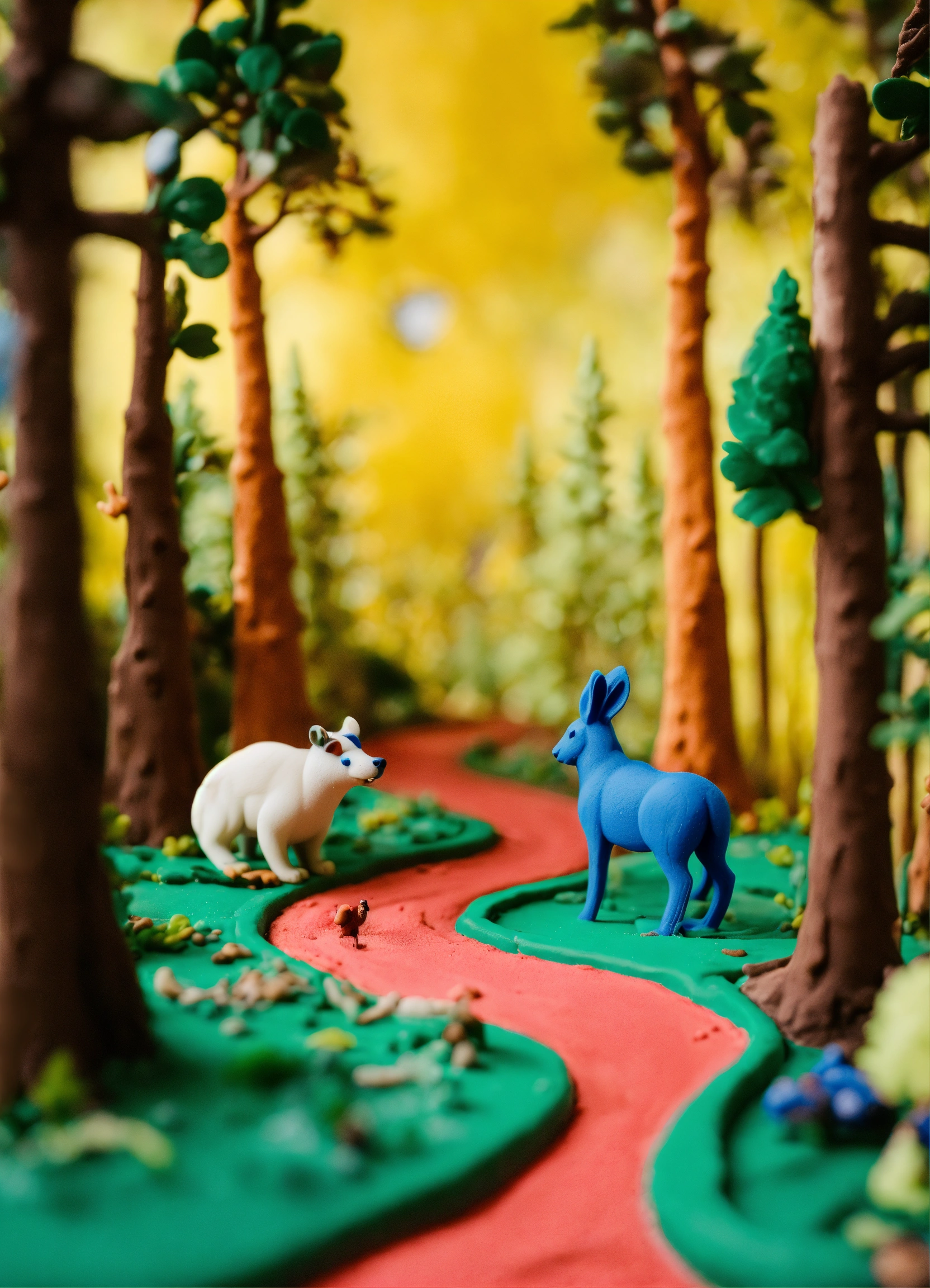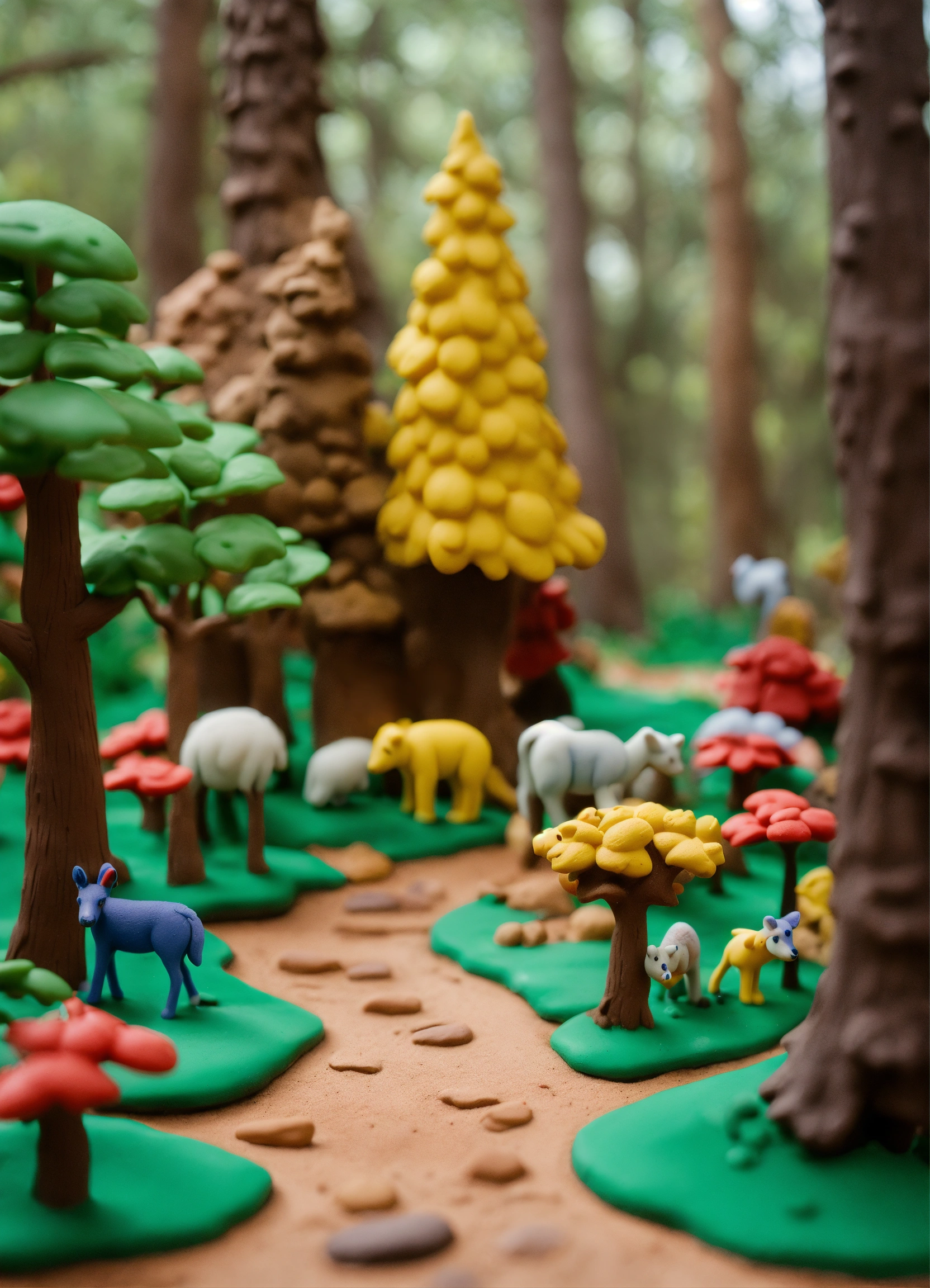 The path goes through the forest, there are many trees and animals around. everything is made of plasticine