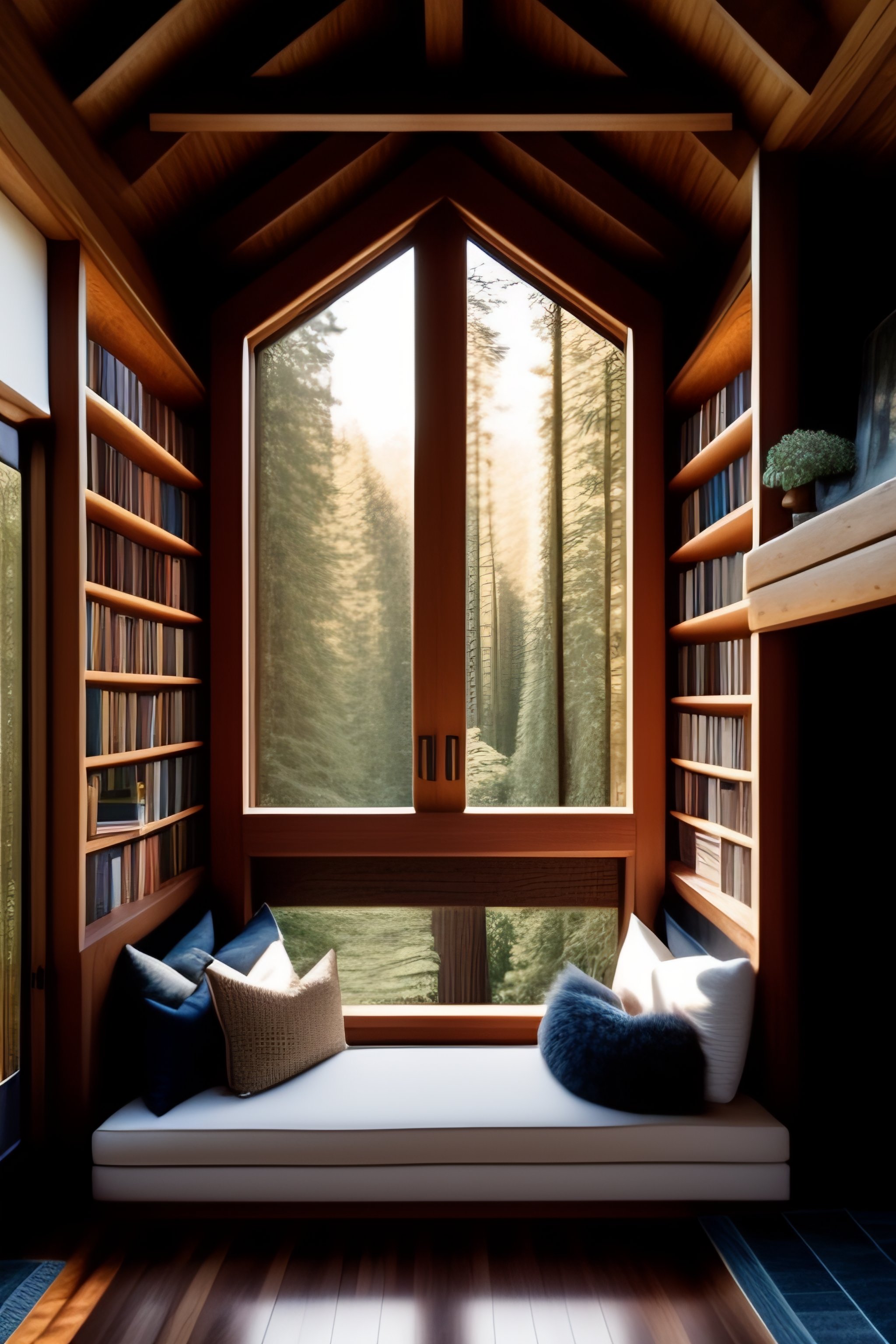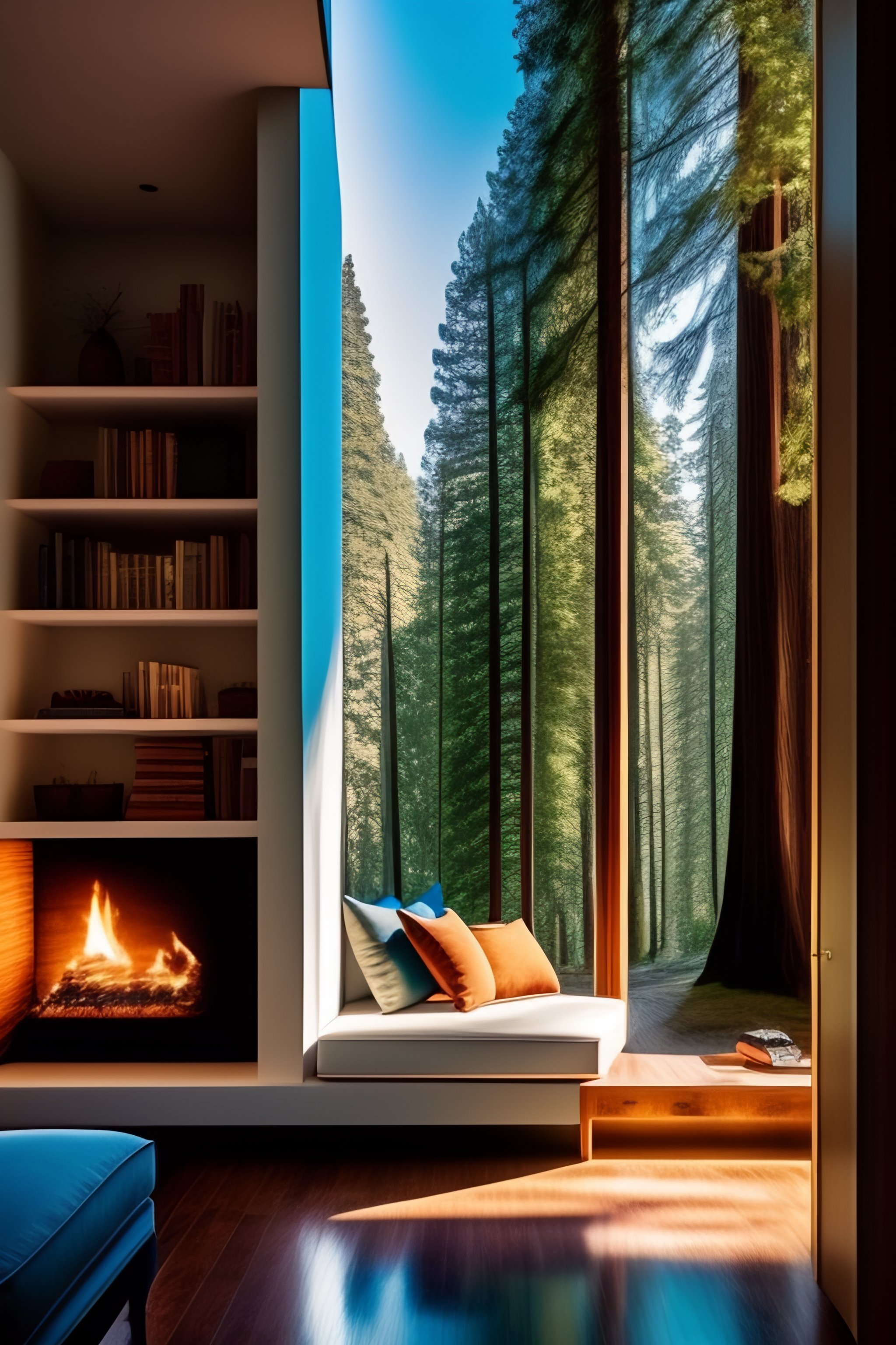 Reading nook with bookshelves and fireplace overlooking redwood forest