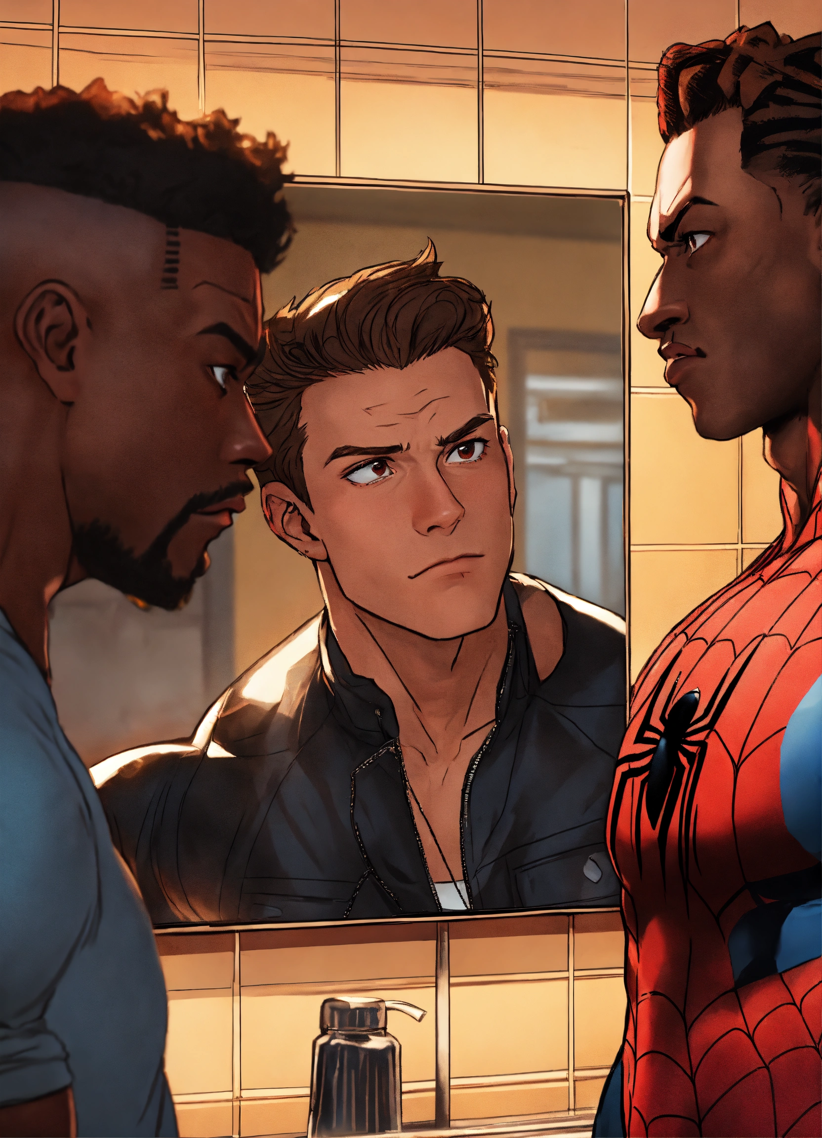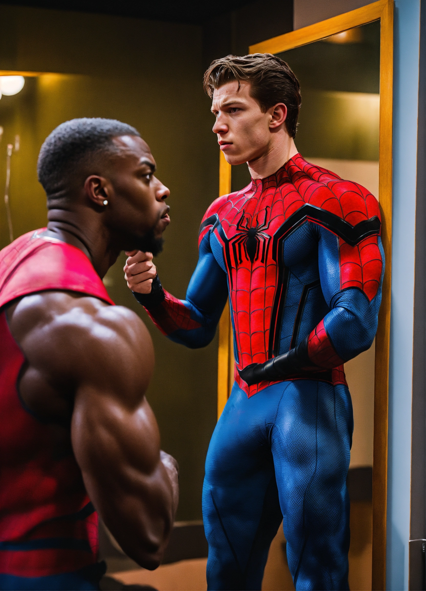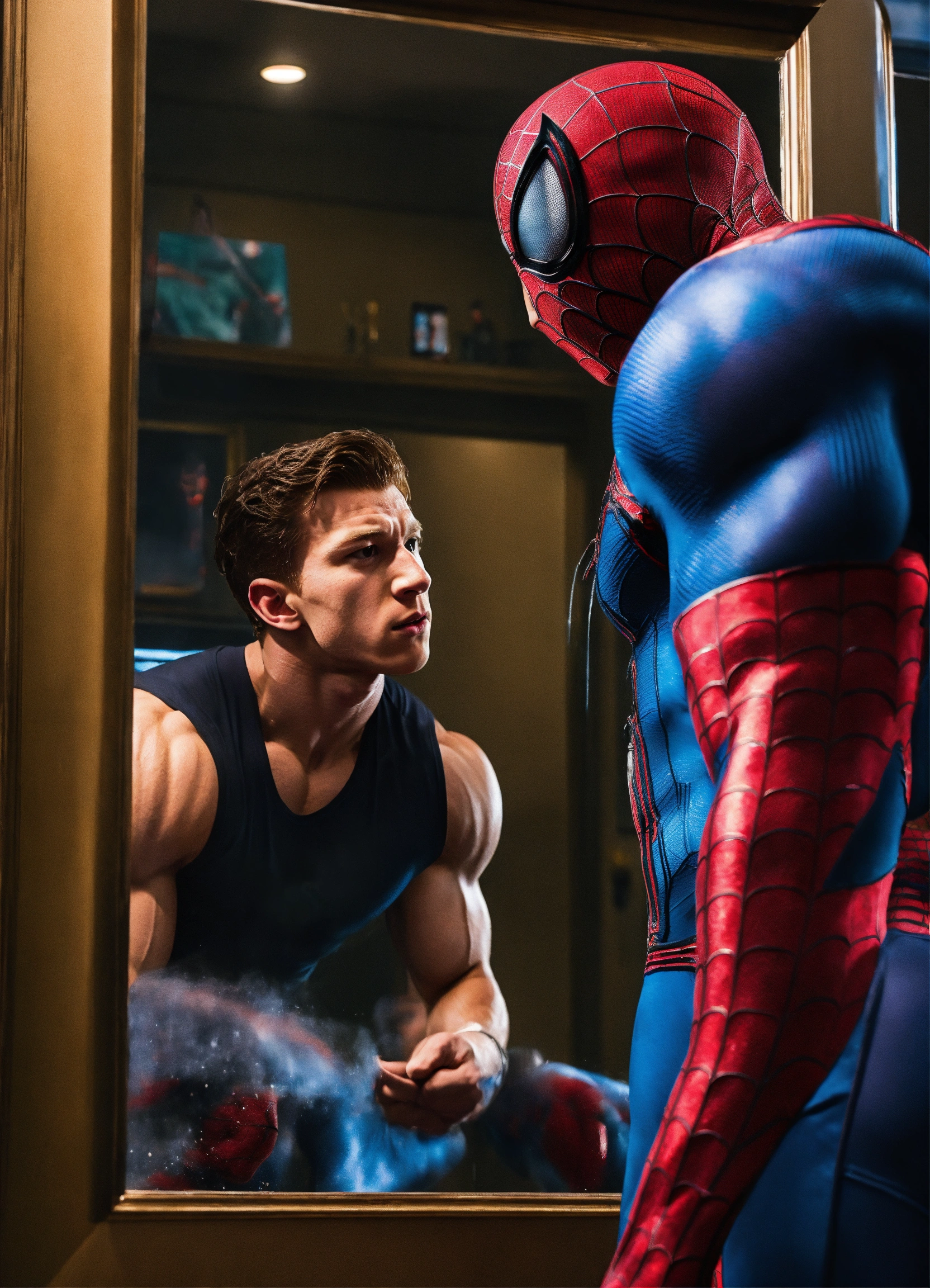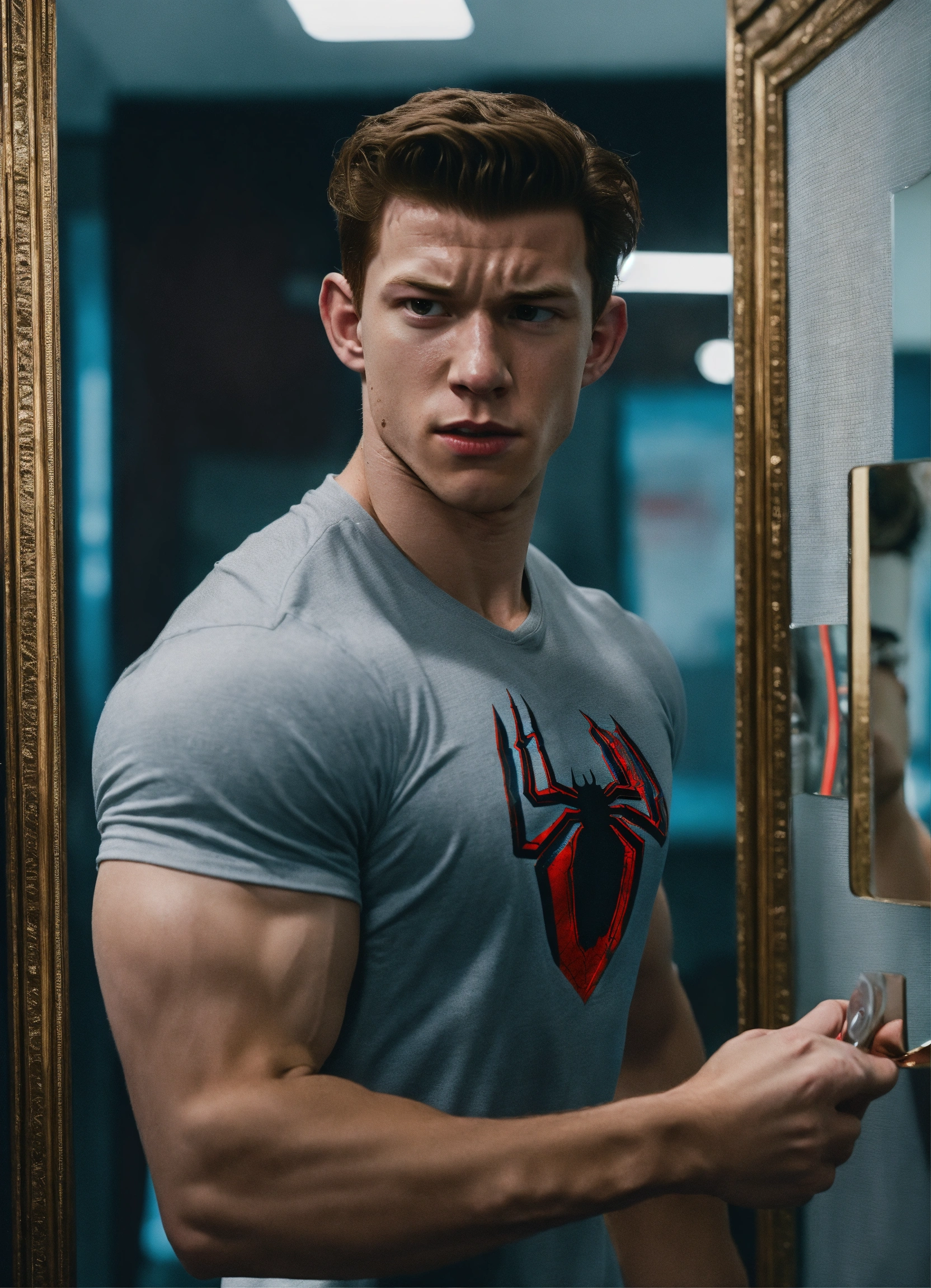 Spider-man tom holland looking at a mirror and seeing a terry cruise kali muscle angry