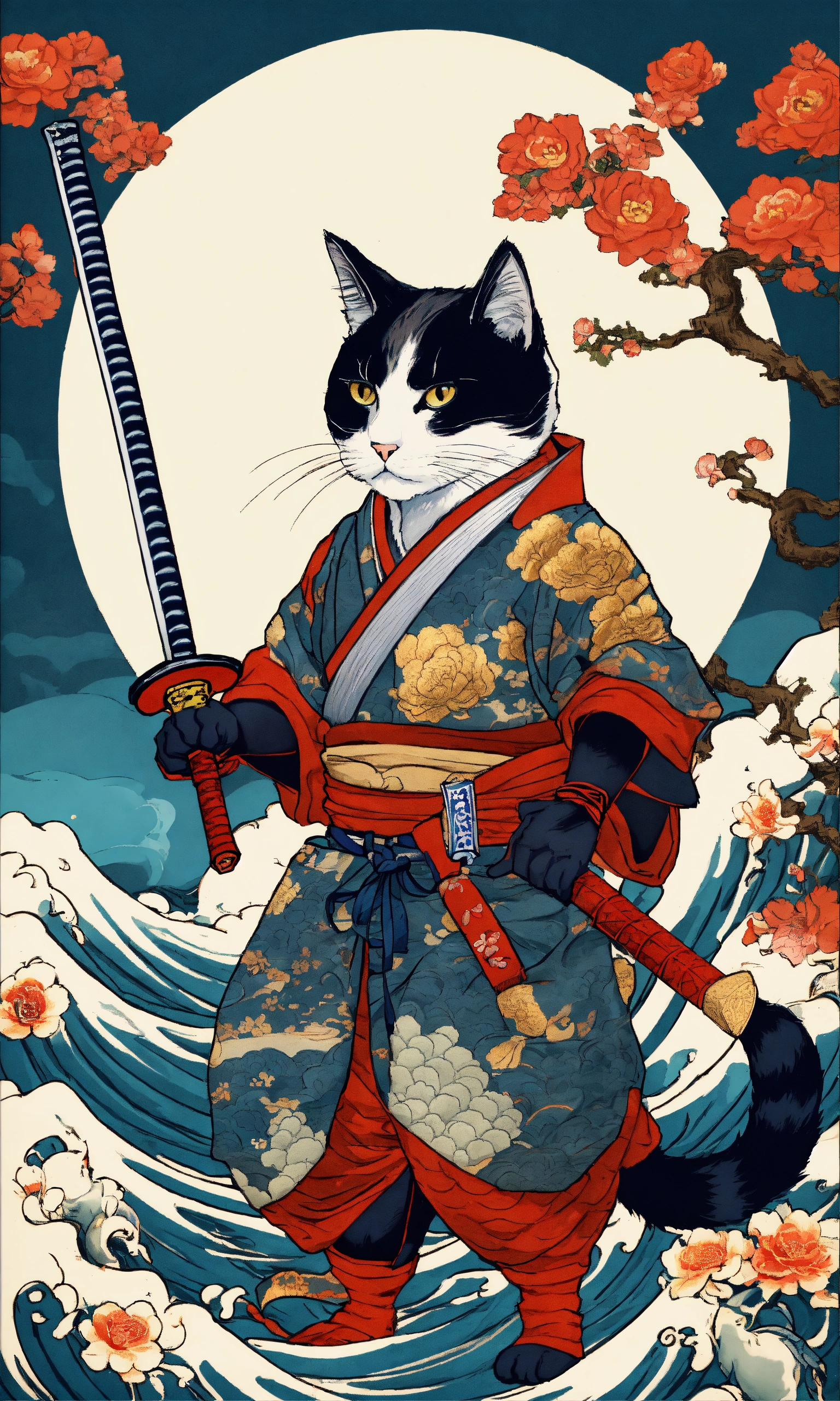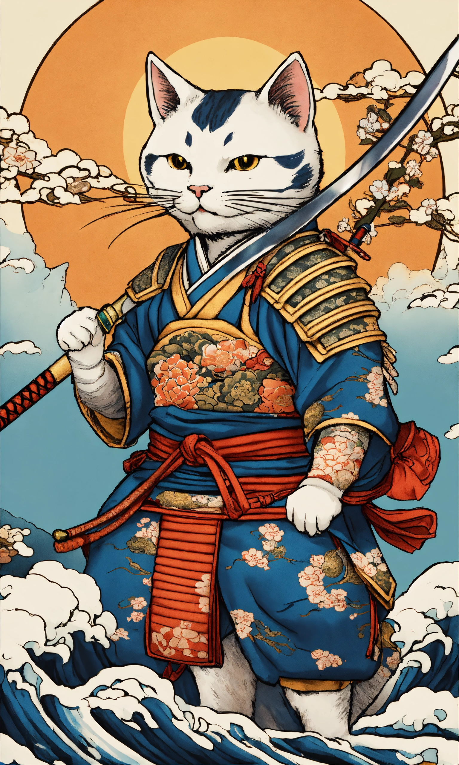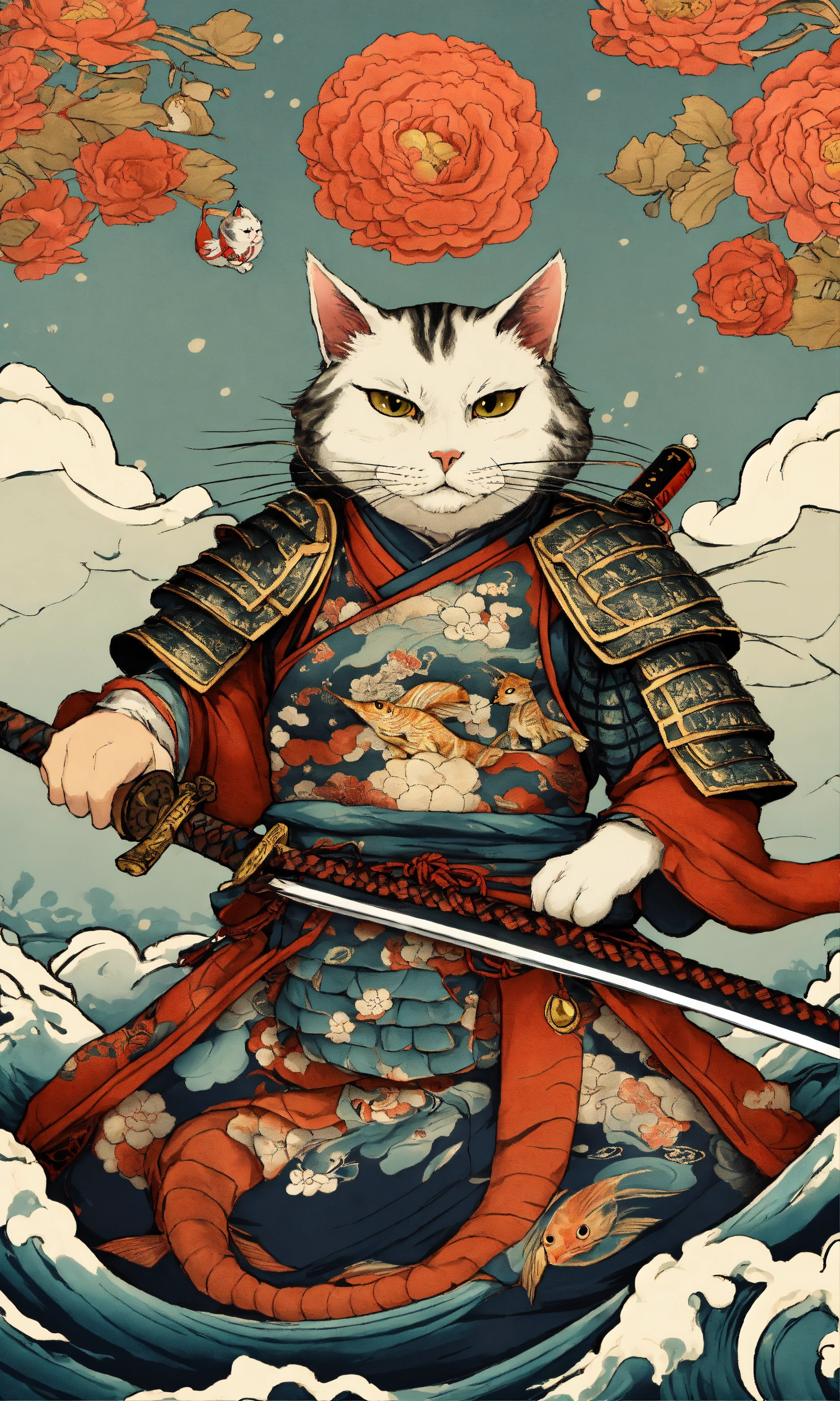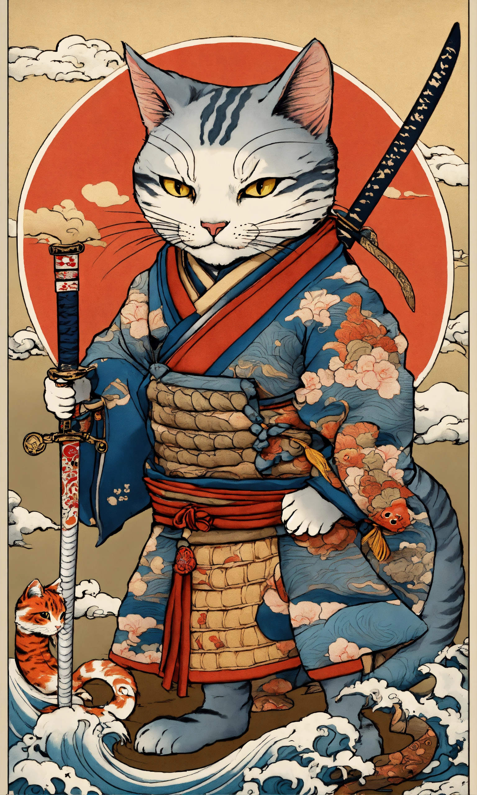 There is a cat with a fish and a sword on a white background, samurai cat, cat warrior, armored cat, anthropomorphic cat ninja, samurai deity with koi armor, by kanō tan'yū, highly detailed and colored, in the art style of ukiyo - e, inspired by utagawa kuniyoshi