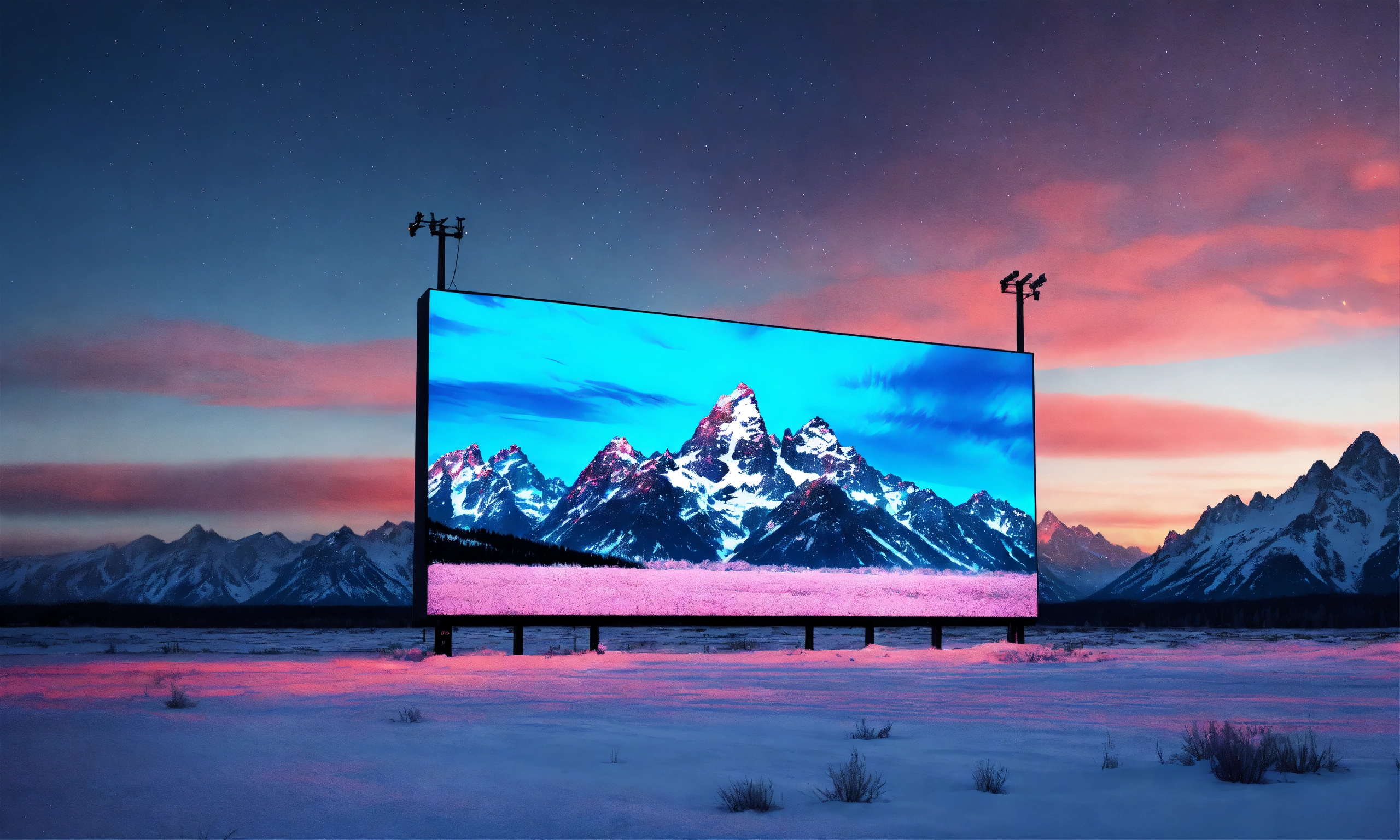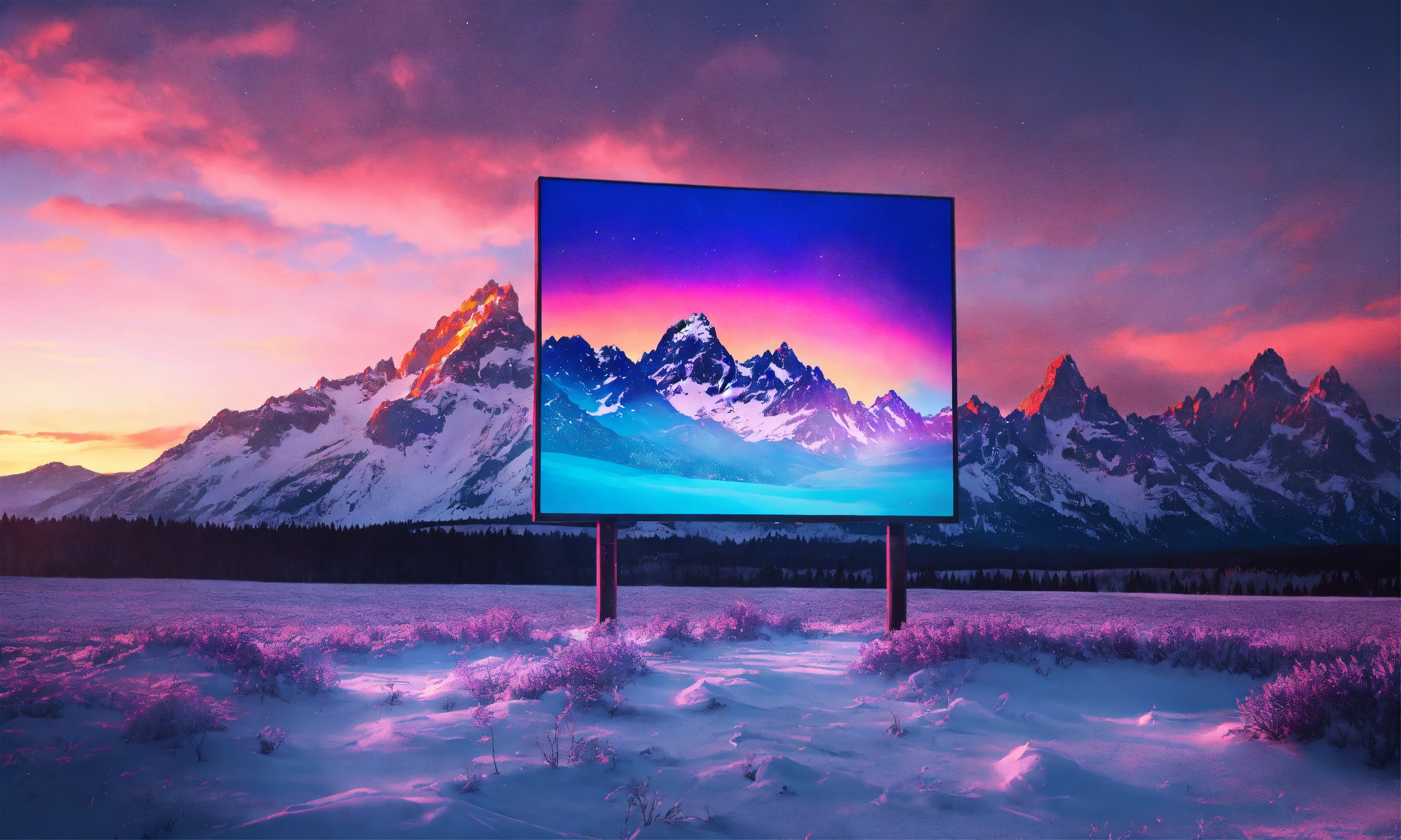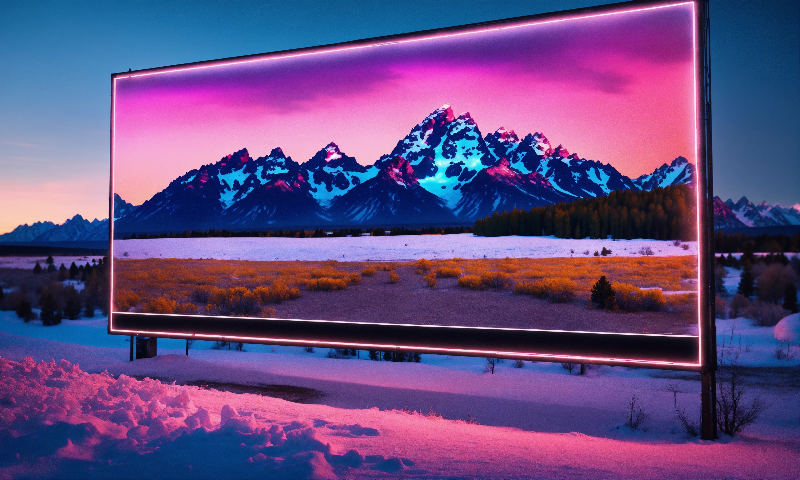 A beautiful, sharp focus, massive square electric advertising board. in the middle of grand teton national park, wyoming. the ground is covered in heavy snow. it is night time and dark. wide angle. vaporwave ombre rendering. by chris moore. beeple colors. ambient occlusion. low resolution background. digital painting.