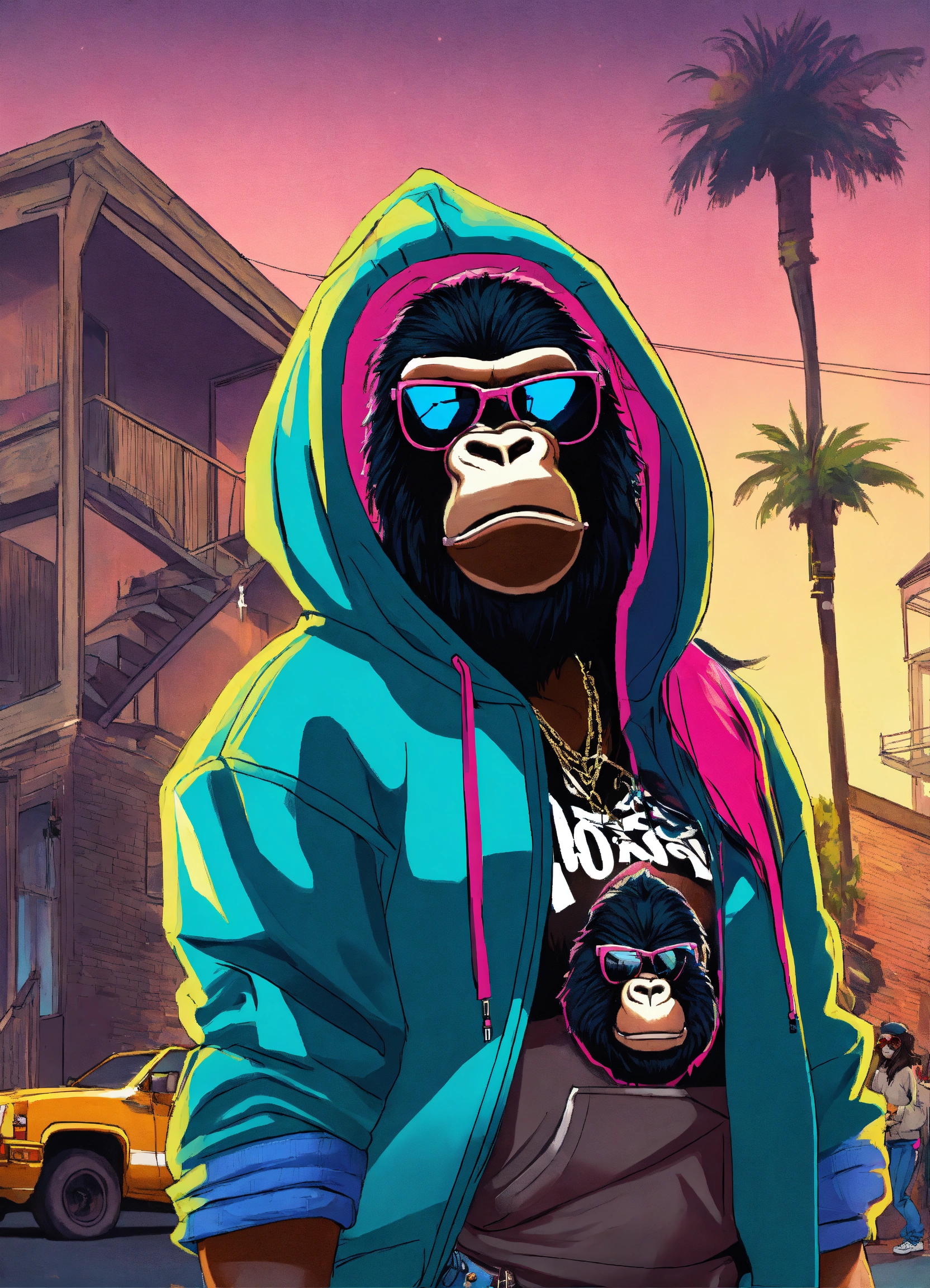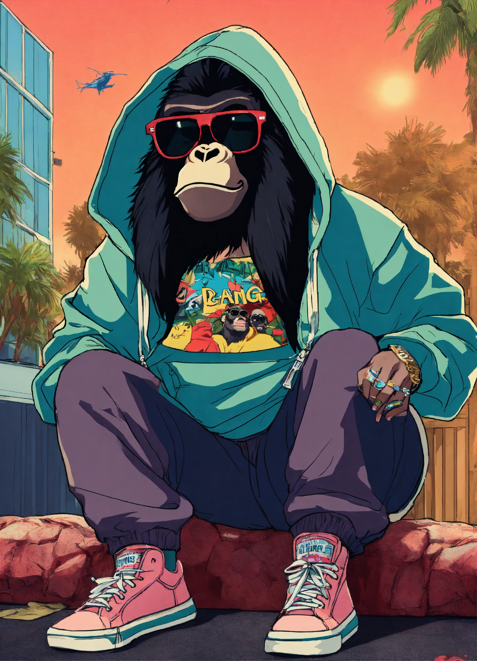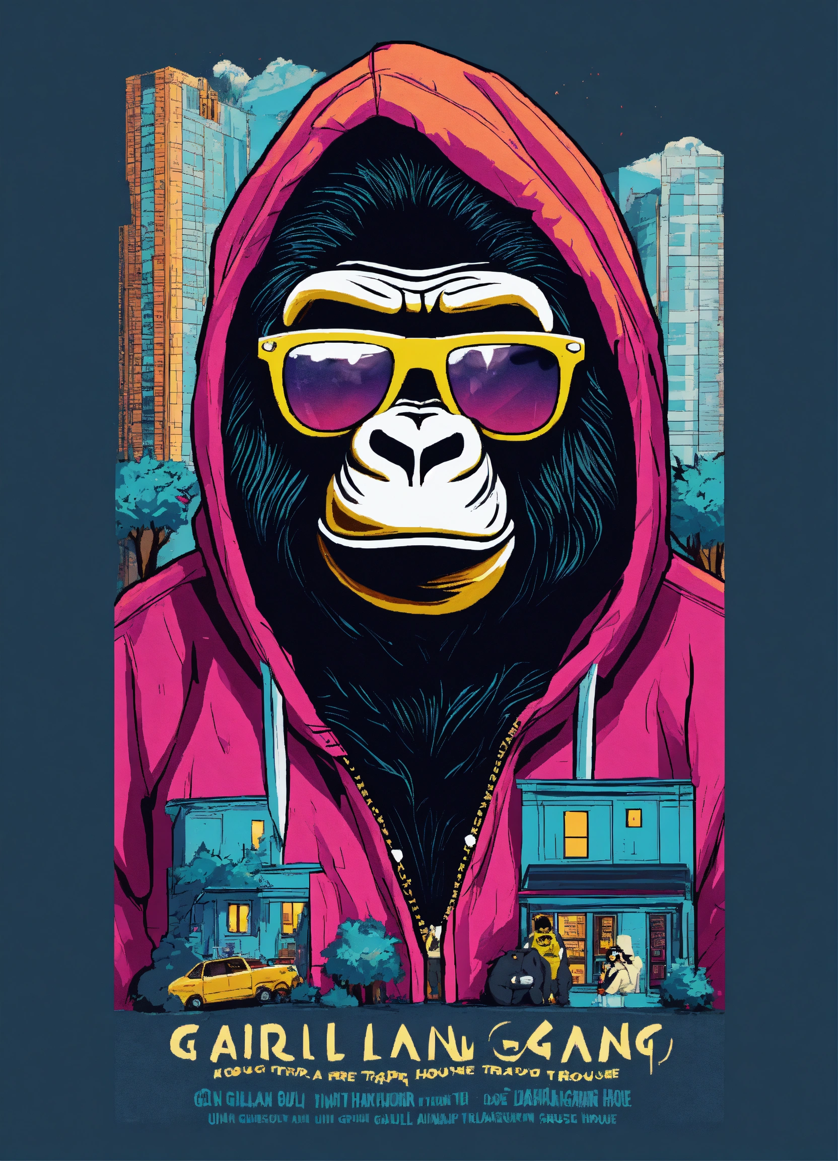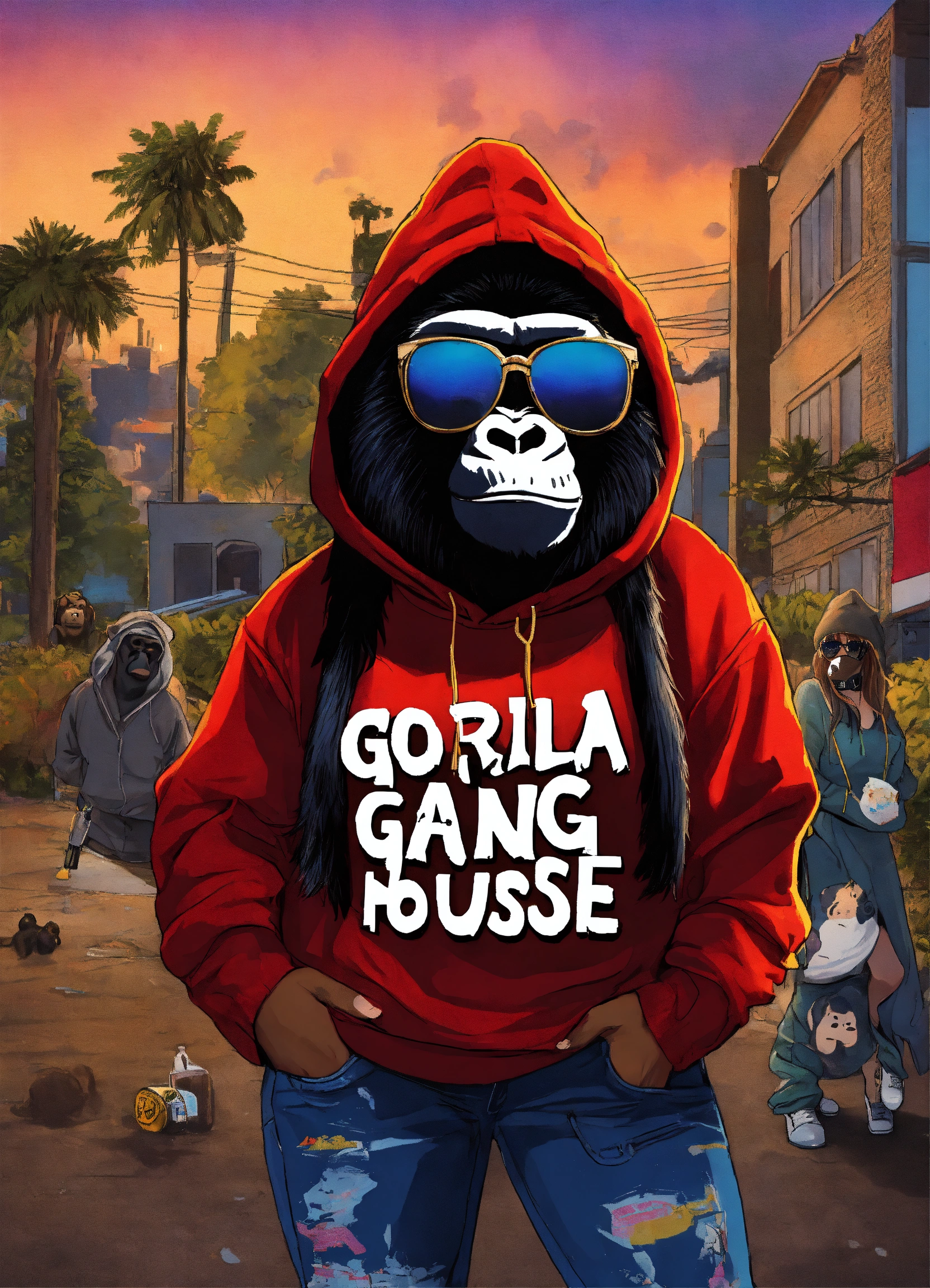 Girl gorillas wearing gangster wearing designer sunglasses and hoodies with words gorilla gang trap house urban neighborhood