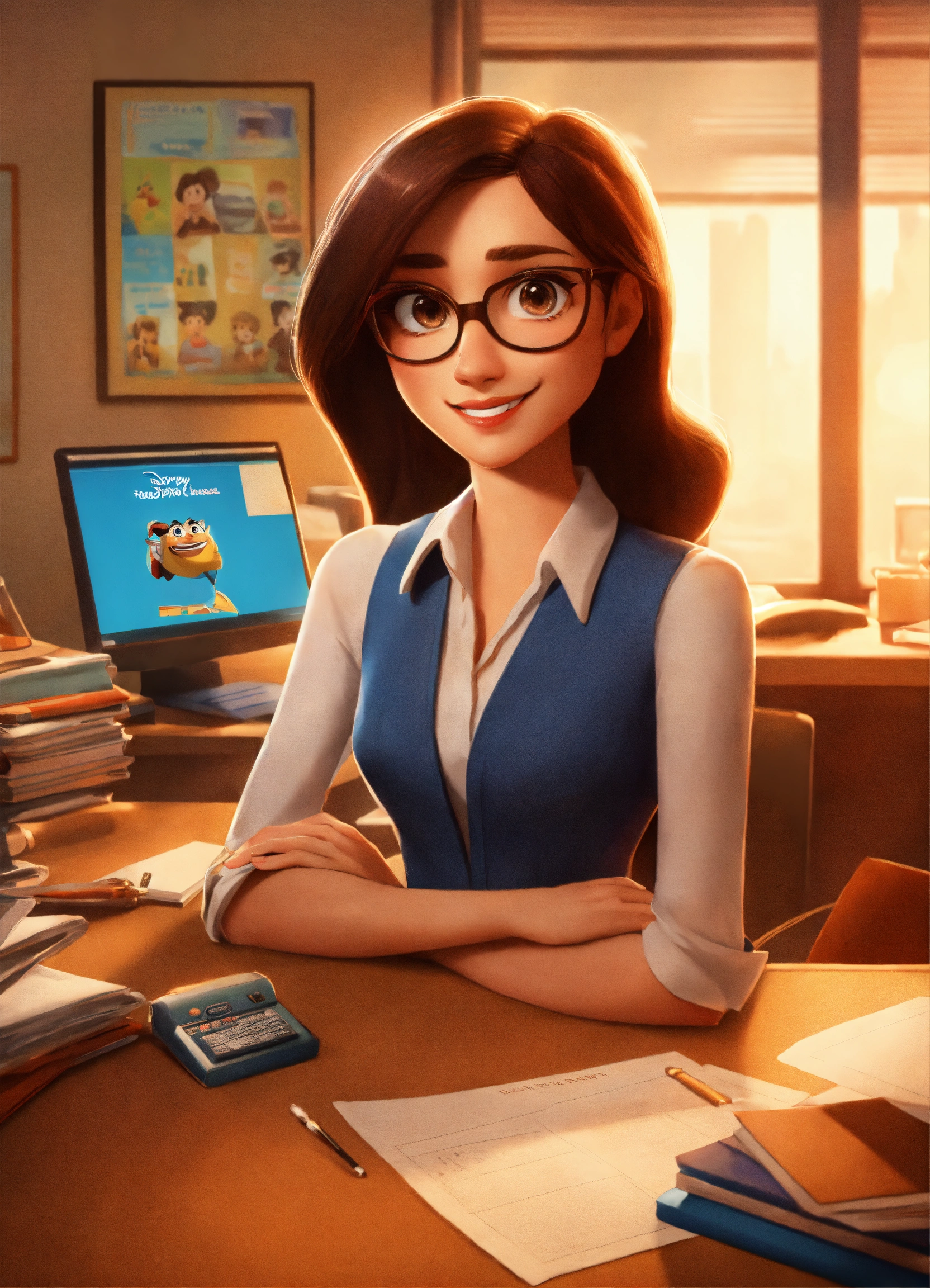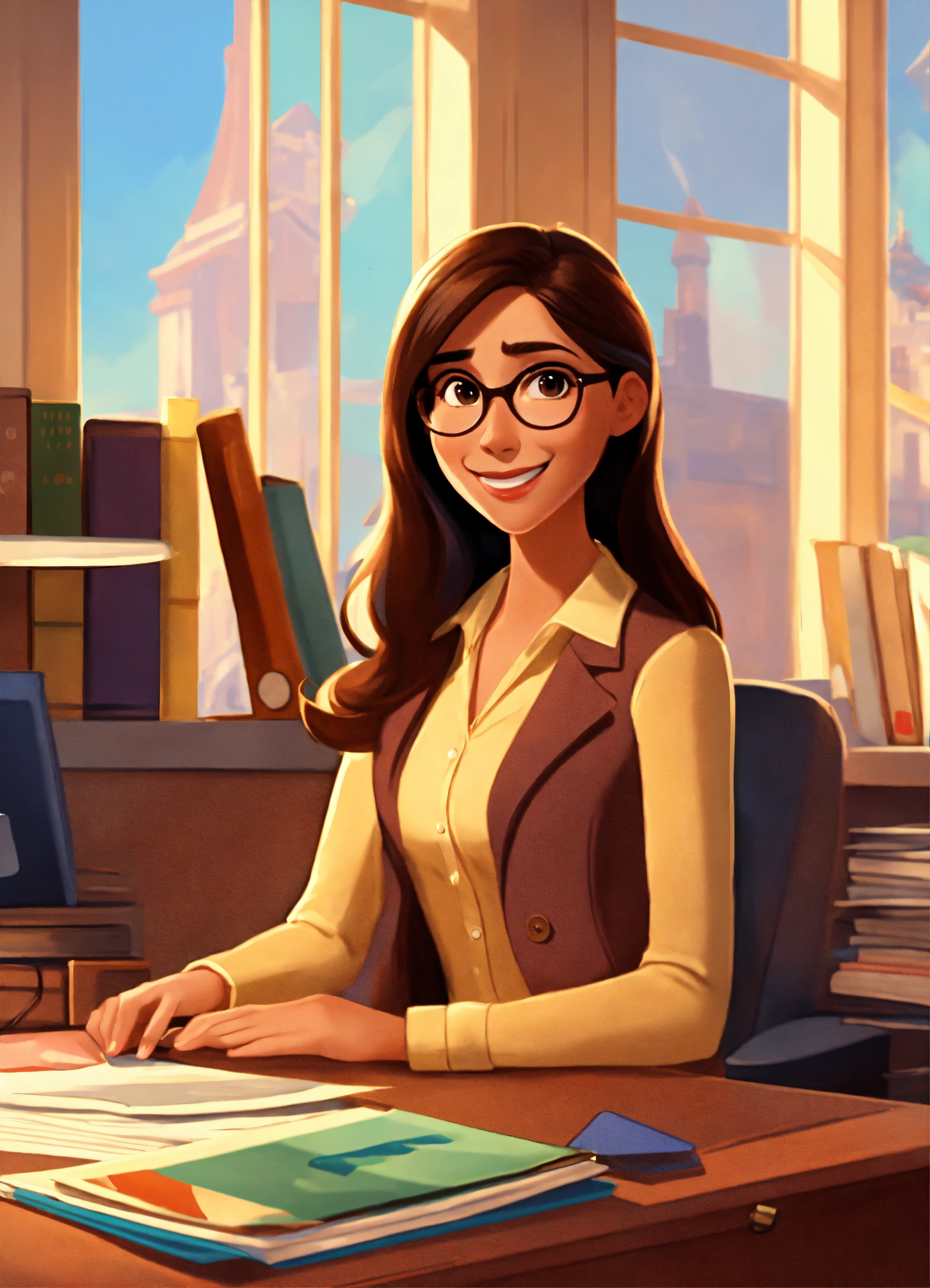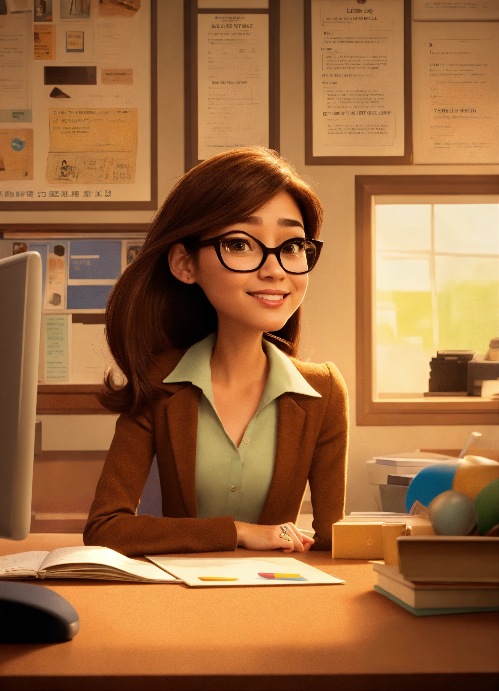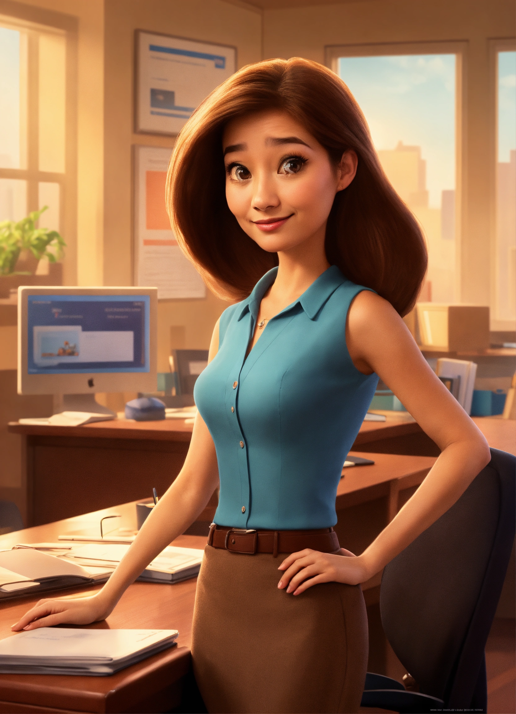 Pixar style movie poster, disney style, of a legal assistant, woman, approximately 40 years old, slim, long straight brown hair, small, pretty face, brown eyes, casual clothes, in the office