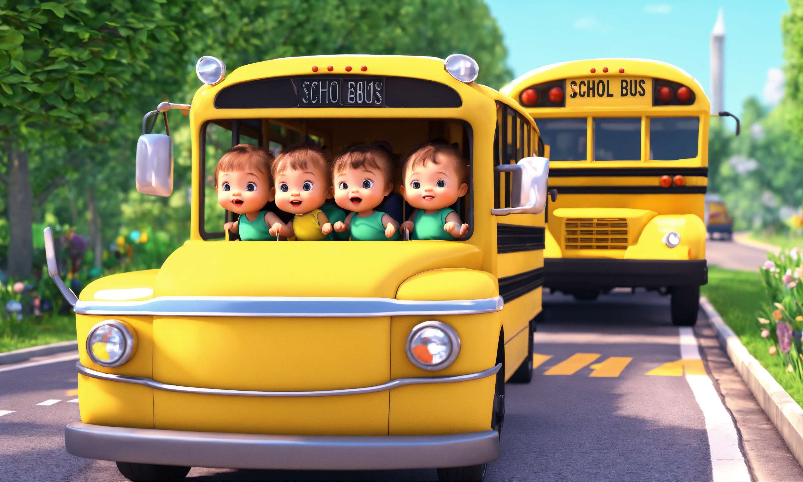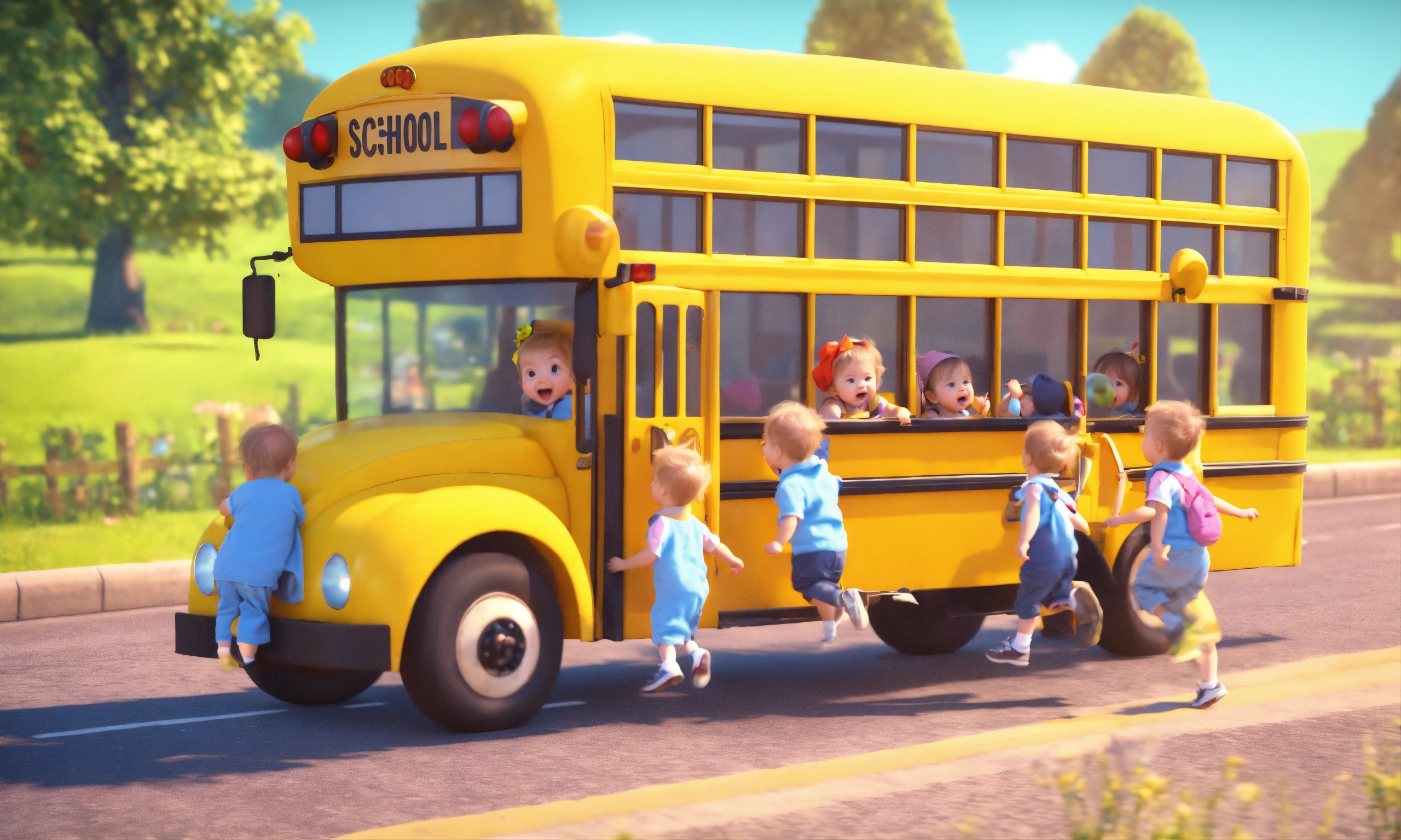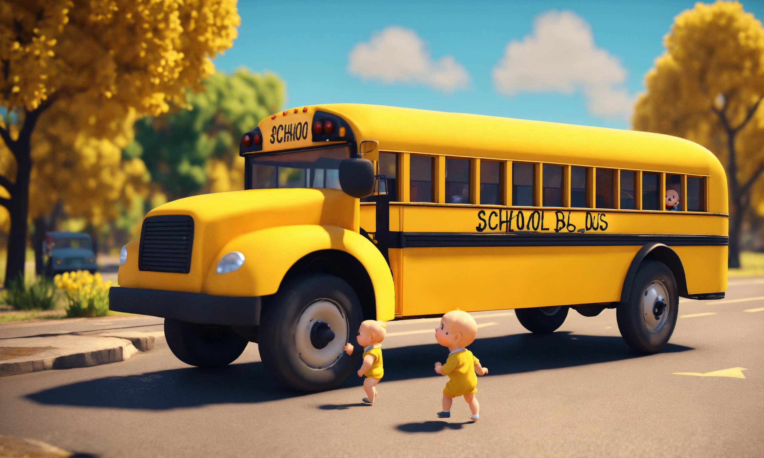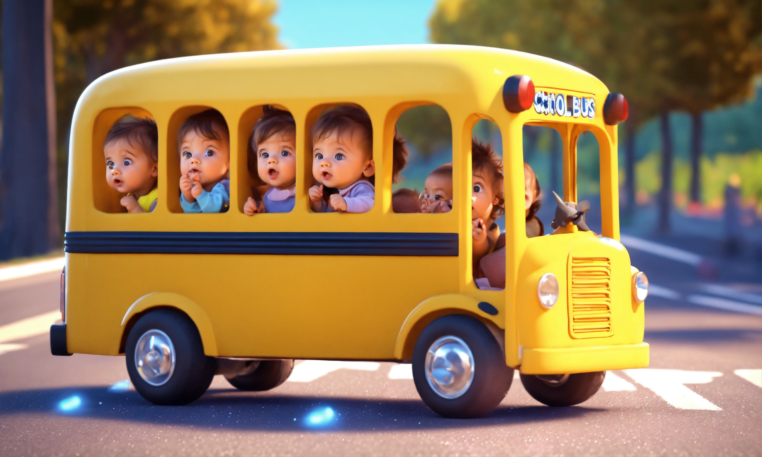 Yellow school bus with cute little babies bouncing on the road